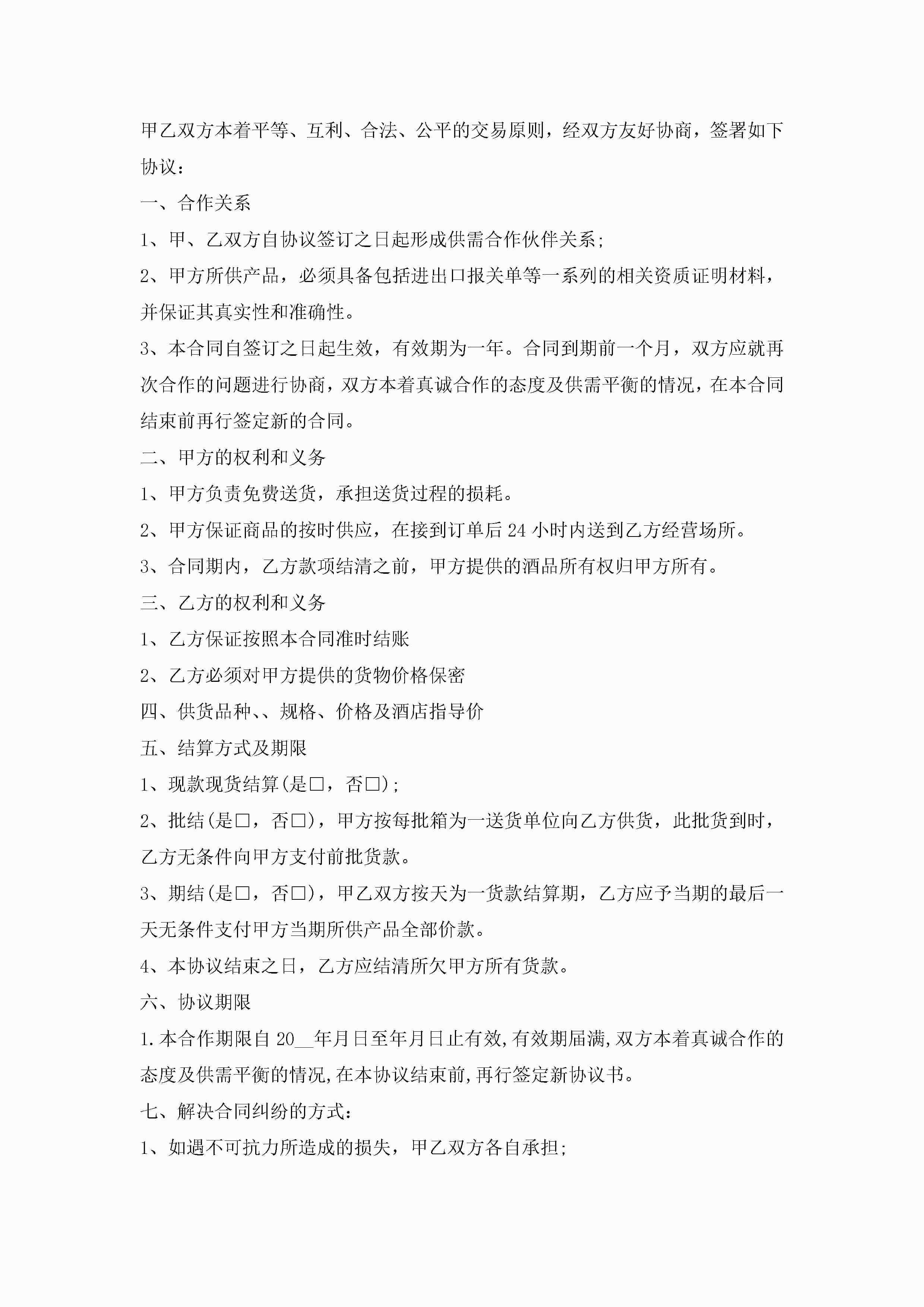 简易酒水类销售合同3篇模板jugei3月23日 01:39发布关注182 简易酒水类销售合同3篇模板此内容为付费资源,请付费后查看¥10.9 单篇文档限时特惠¥15个人会员开通企业会员开通立即下载无需登陆!可直接快捷下载单个模板付费资源© 版权声明THE ENDWord模板# 实用文档# 实用模板# 合同模板# 销售合同 如有问题,可点击最底部“联系我们”联系客服 分享QQ空间微博QQ好友海报分享复制链接收藏