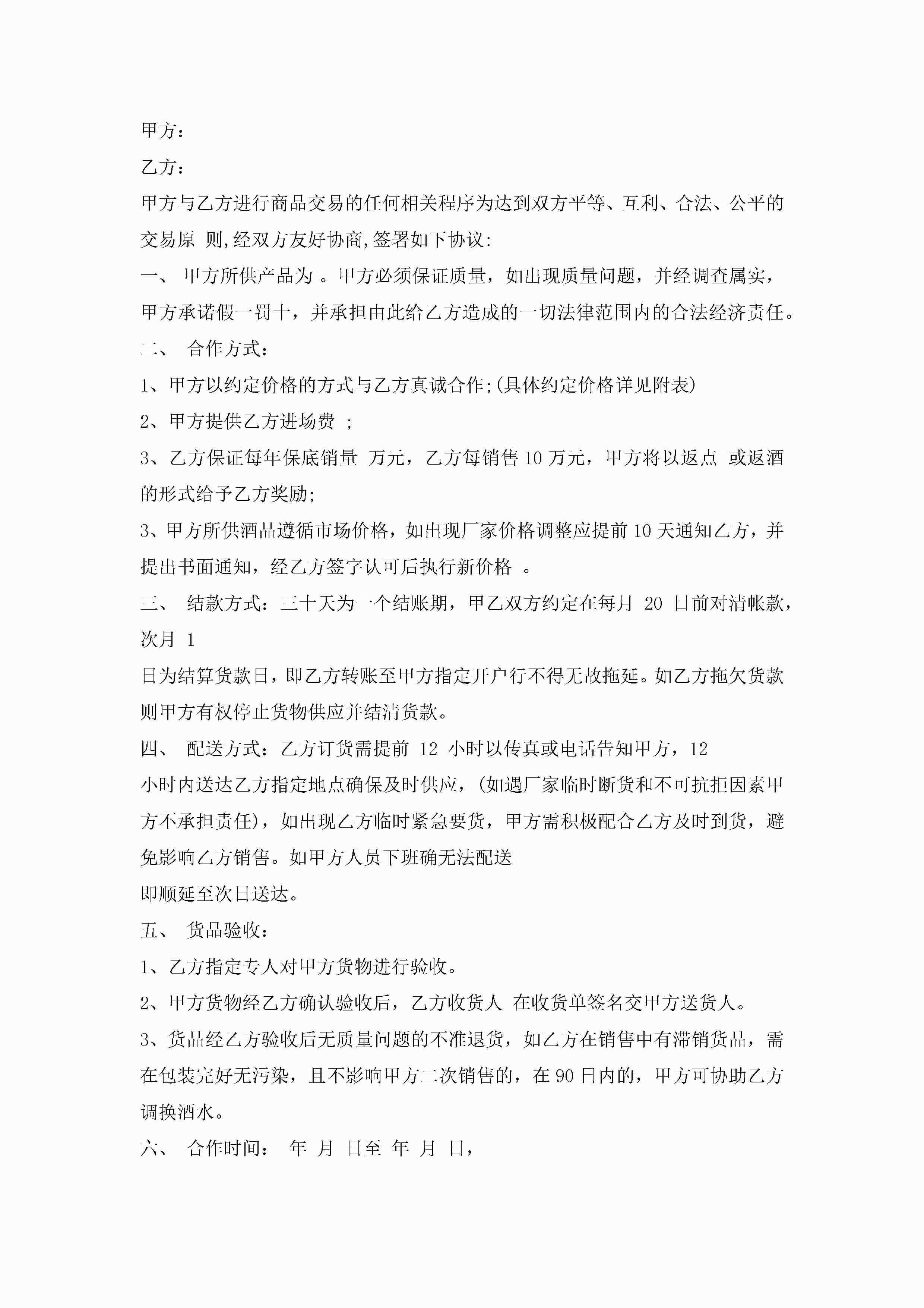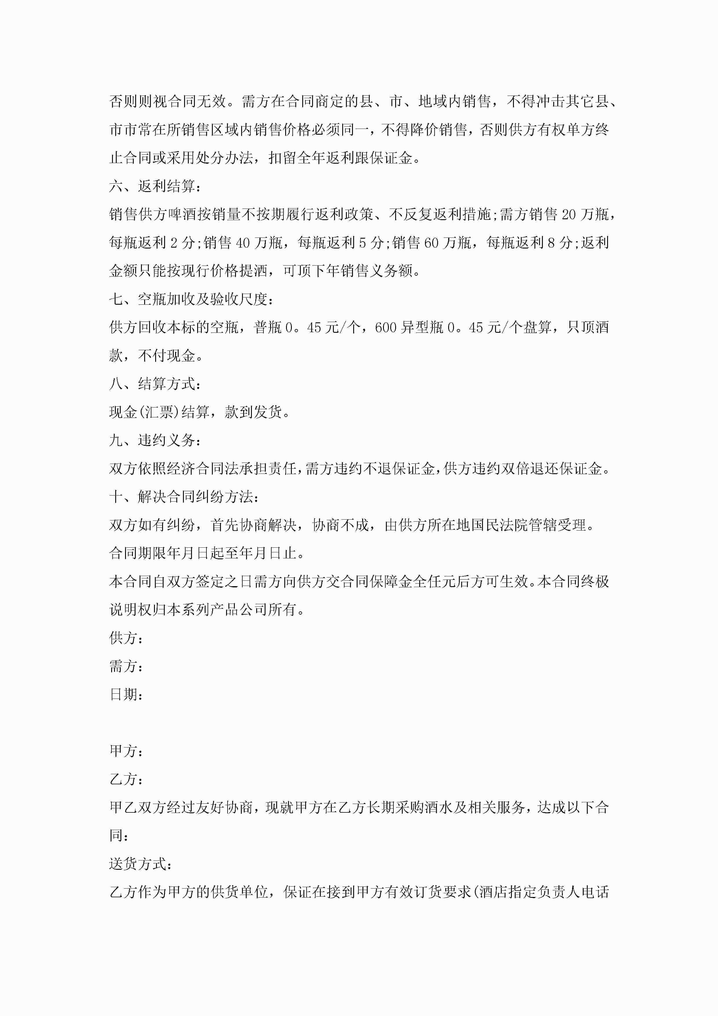 年酒类销售合同范文模板jugei3月23日 01:39发布关注185 年酒类销售合同范文模板此内容为付费资源,请付费后查看¥10.9 单篇文档限时特惠¥15个人会员开通企业会员开通立即下载无需登陆!可直接快捷下载单个模板付费资源© 版权声明THE ENDWord模板# 实用文档# 实用模板# 合同模板# 销售合同 如有问题,可点击最底部“联系我们”联系客服 分享QQ空间微博QQ好友海报分享复制链接收藏