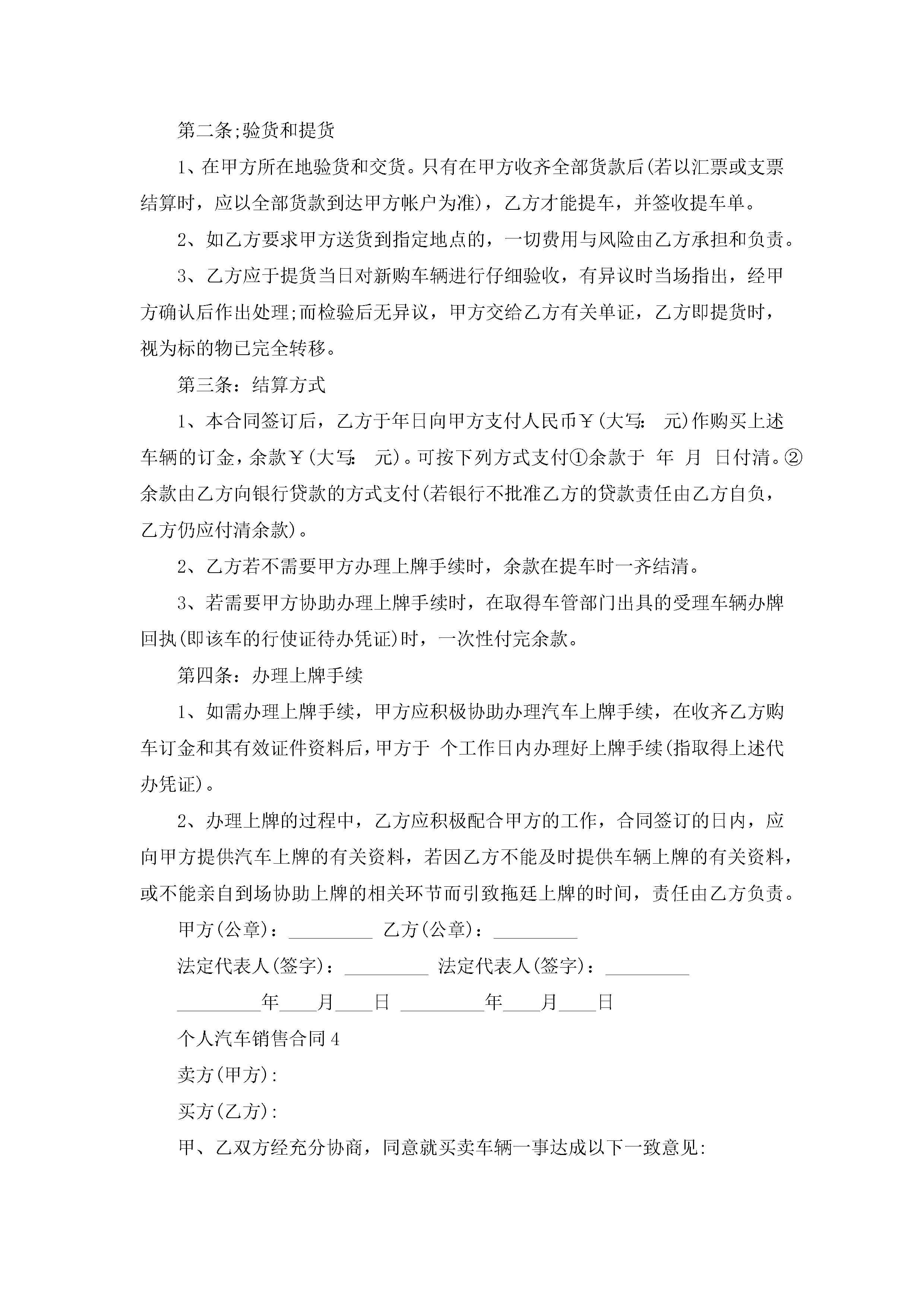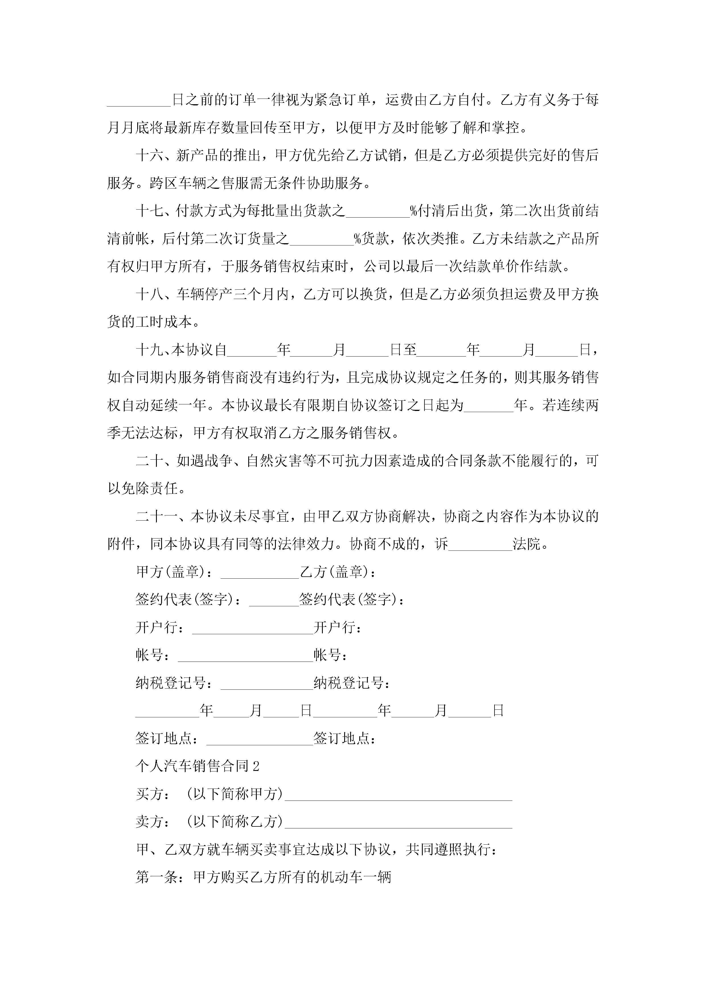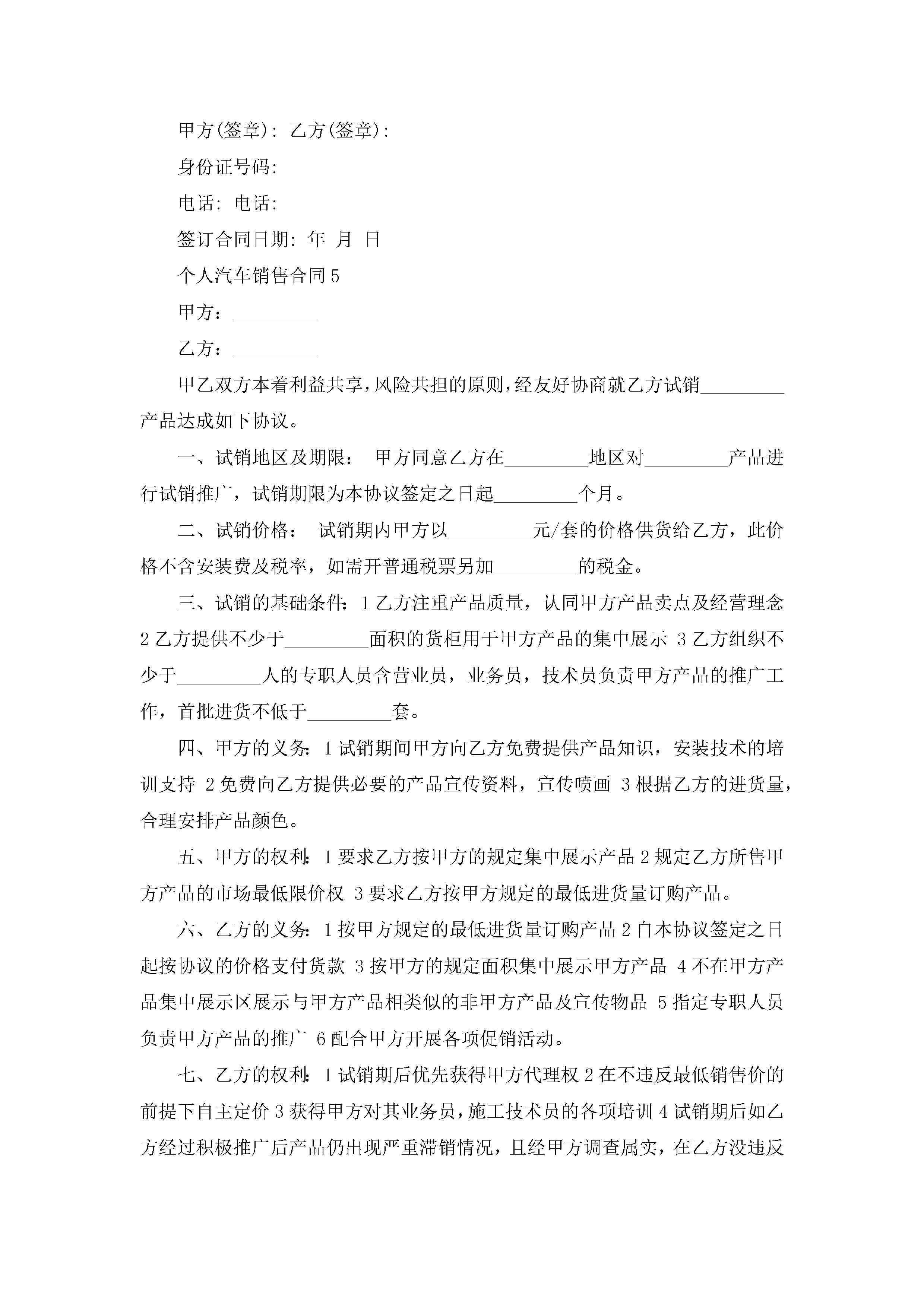 个人汽车销售合同5篇jugei3月23日 01:39发布关注193 个人汽车销售合同5篇此内容为付费资源,请付费后查看¥10.9 单篇文档限时特惠¥15个人会员开通企业会员开通立即下载无需登陆!可直接快捷下载单个模板付费资源© 版权声明THE ENDWord模板# 实用文档# 实用模板# 合同模板# 销售合同 如有问题,可点击最底部“联系我们”联系客服 分享QQ空间微博QQ好友海报分享复制链接收藏