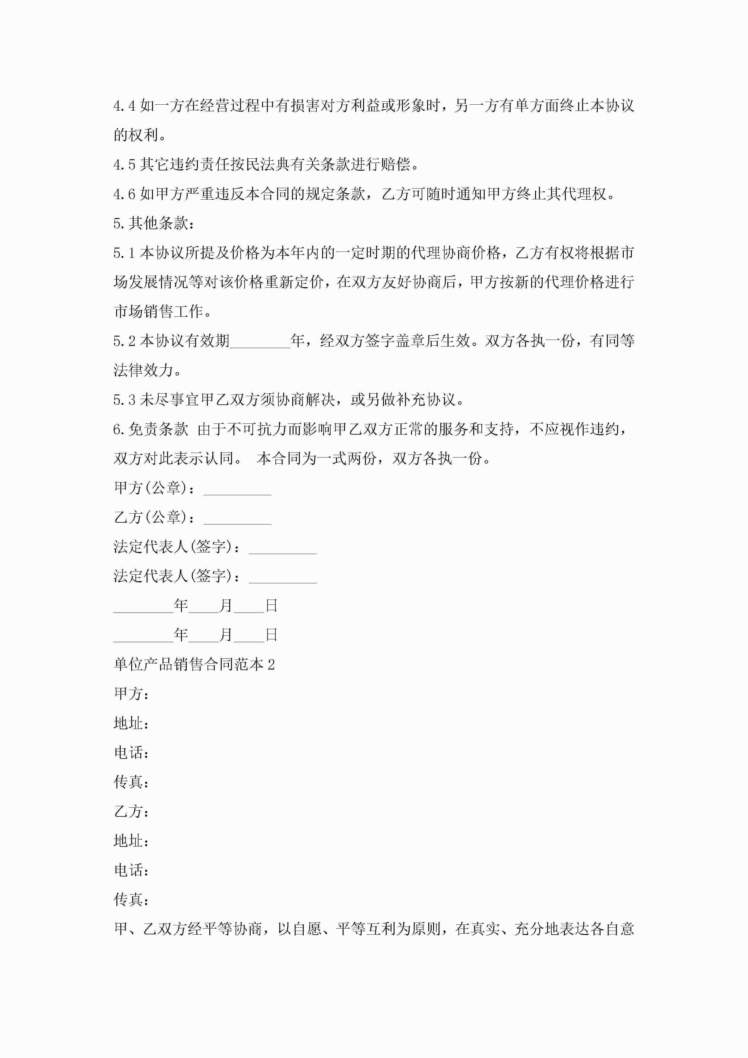 单位产品销售合同范本5篇jugei3月23日 01:39发布关注412 单位产品销售合同范本5篇此内容为付费资源,请付费后查看¥10.9 单篇文档限时特惠¥15个人会员开通企业会员开通立即下载无需登陆!可直接快捷下载单个模板付费资源© 版权声明THE ENDWord模板# 实用文档# 实用模板# 合同模板# 销售合同 如有问题,可点击最底部“联系我们”联系客服 分享QQ空间微博QQ好友海报分享复制链接收藏