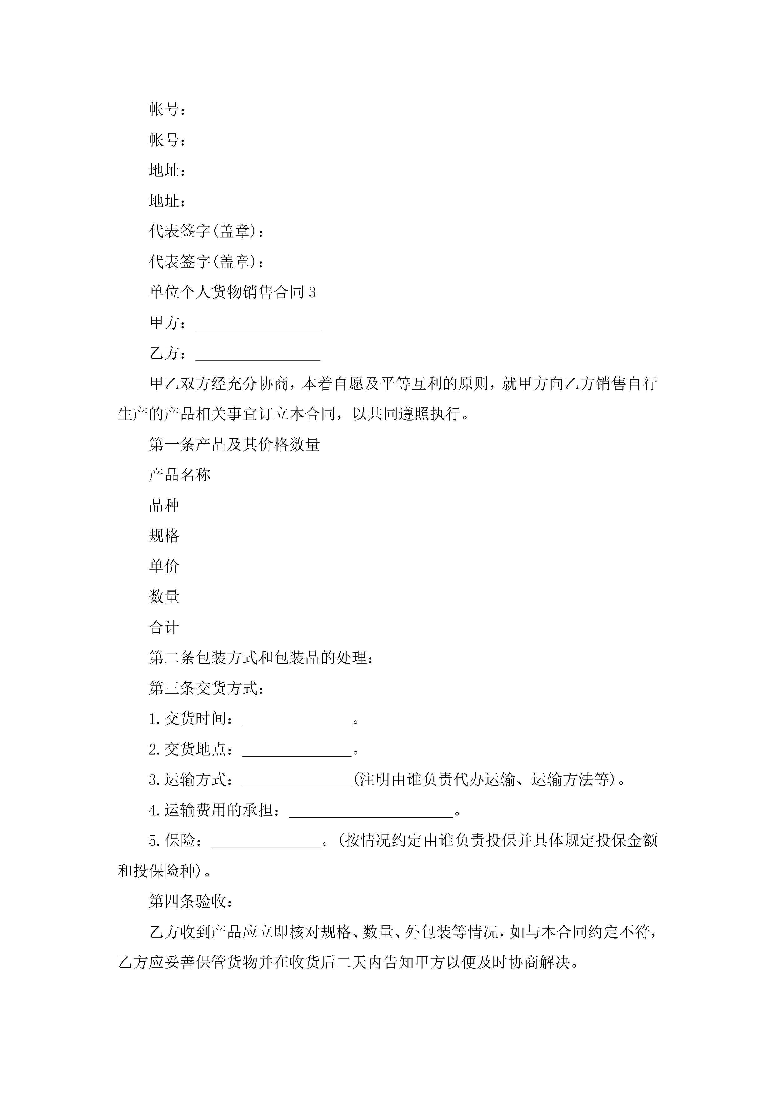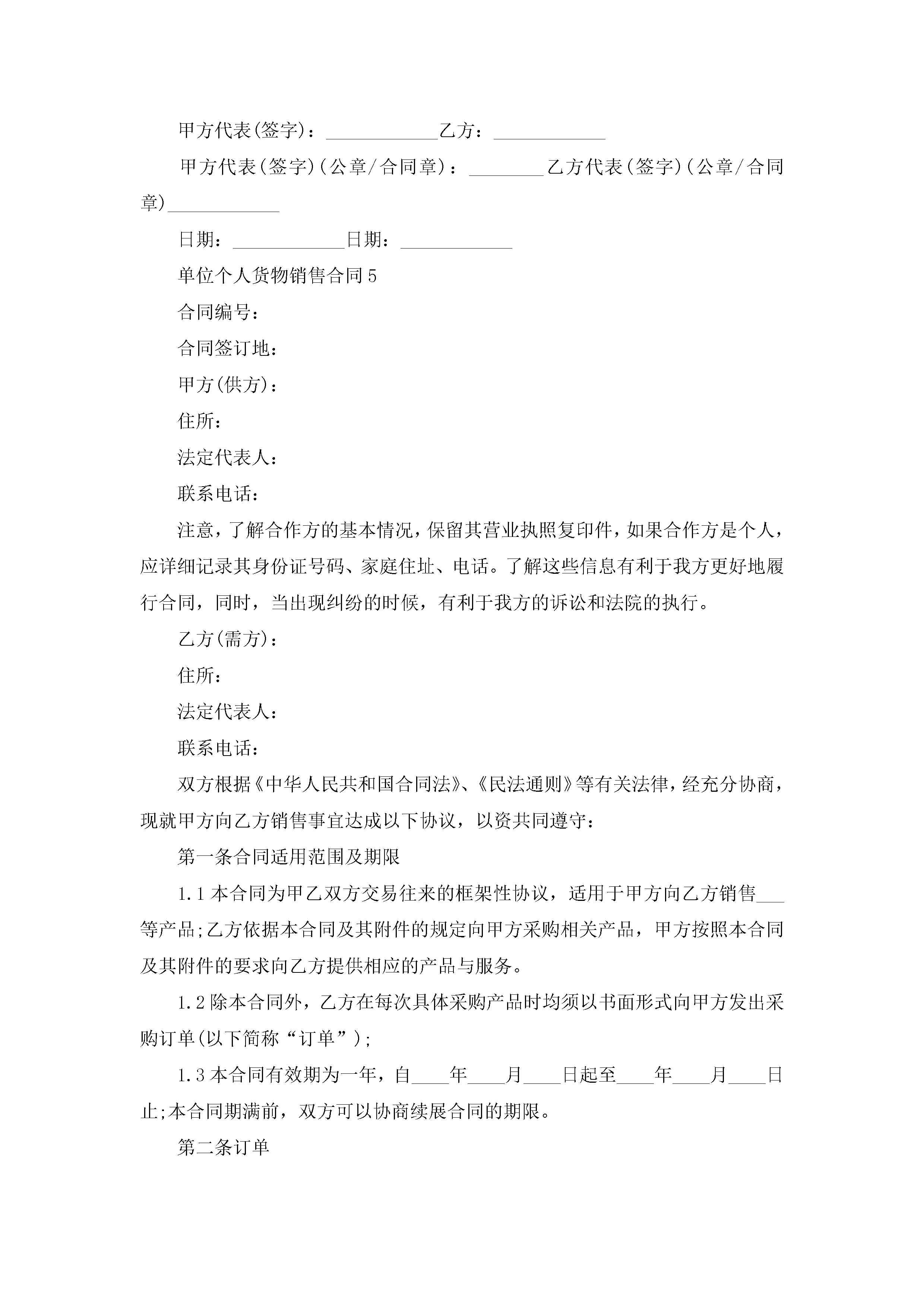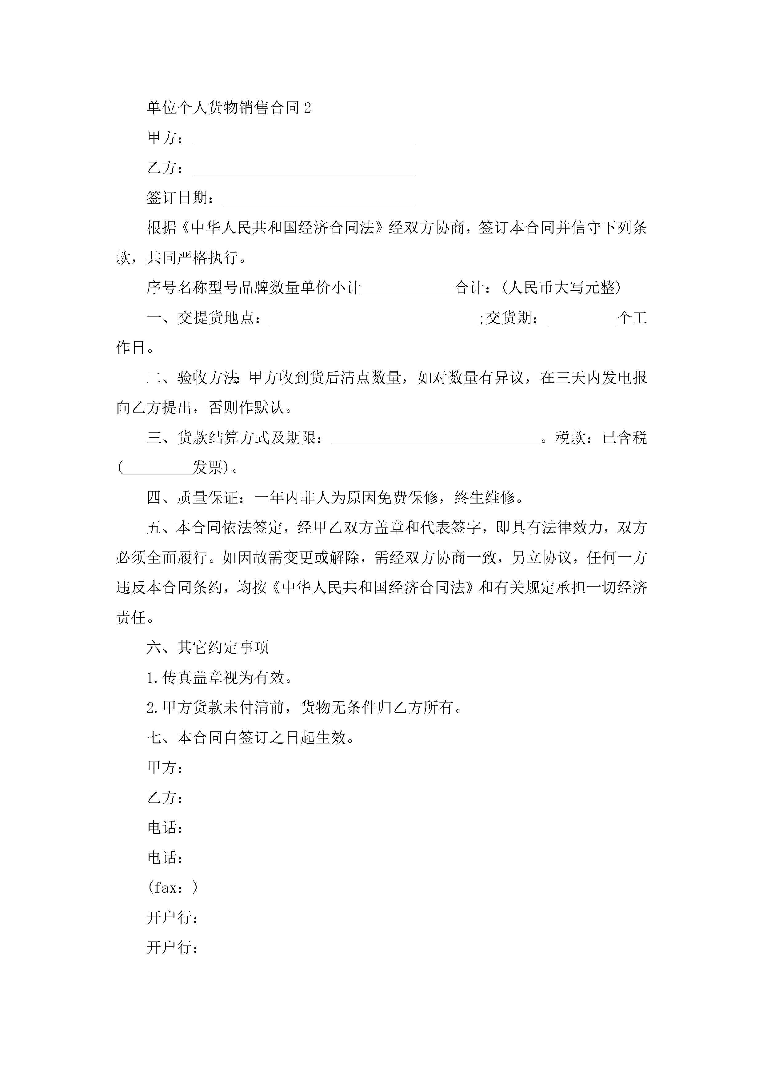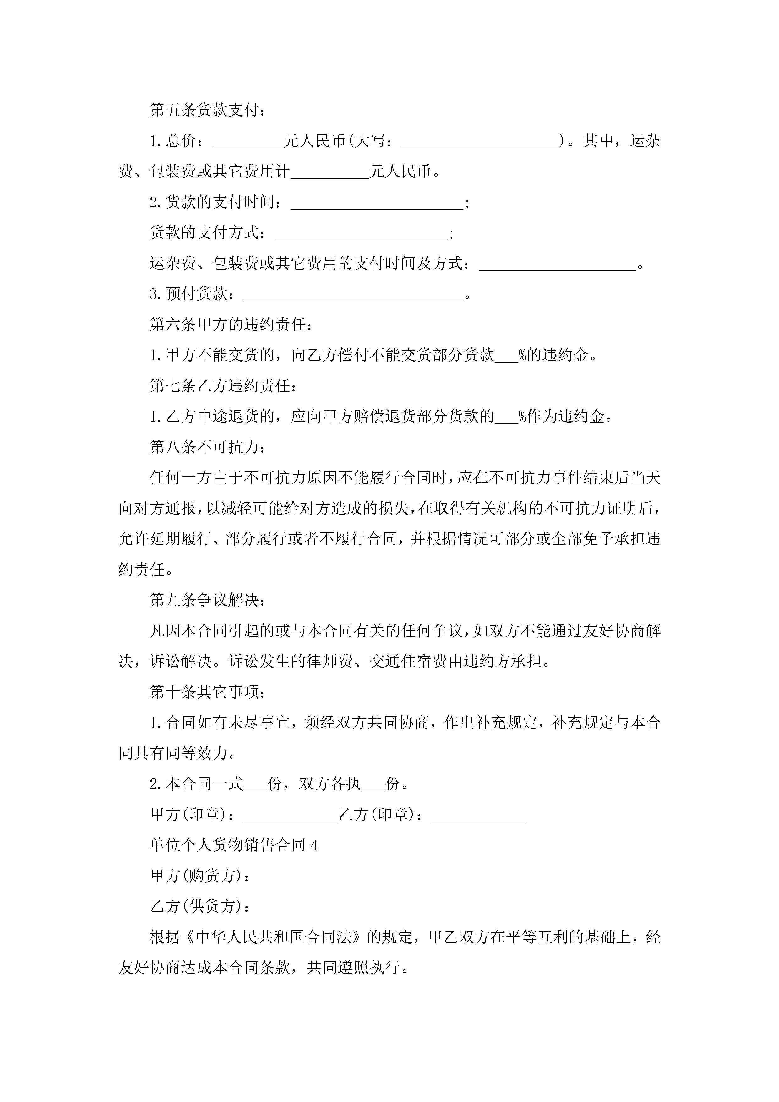 单位个人货物销售合同范文5篇jugei3月23日 01:39发布关注194 单位个人货物销售合同范文5篇此内容为付费资源,请付费后查看¥10.9 单篇文档限时特惠¥15个人会员开通企业会员开通立即下载无需登陆!可直接快捷下载单个模板付费资源© 版权声明THE ENDWord模板# 实用文档# 实用模板# 合同模板# 销售合同 如有问题,可点击最底部“联系我们”联系客服 分享QQ空间微博QQ好友海报分享复制链接收藏