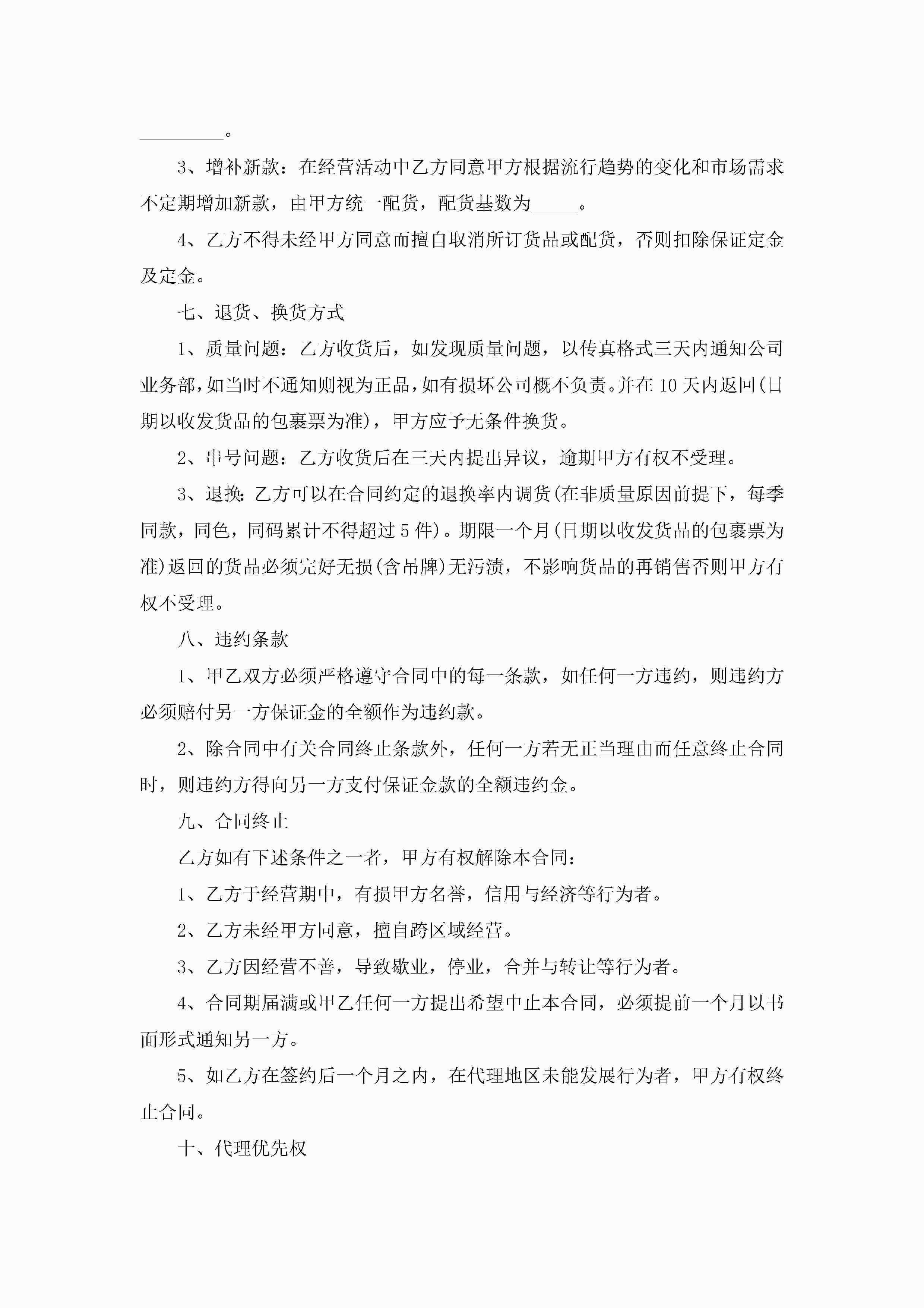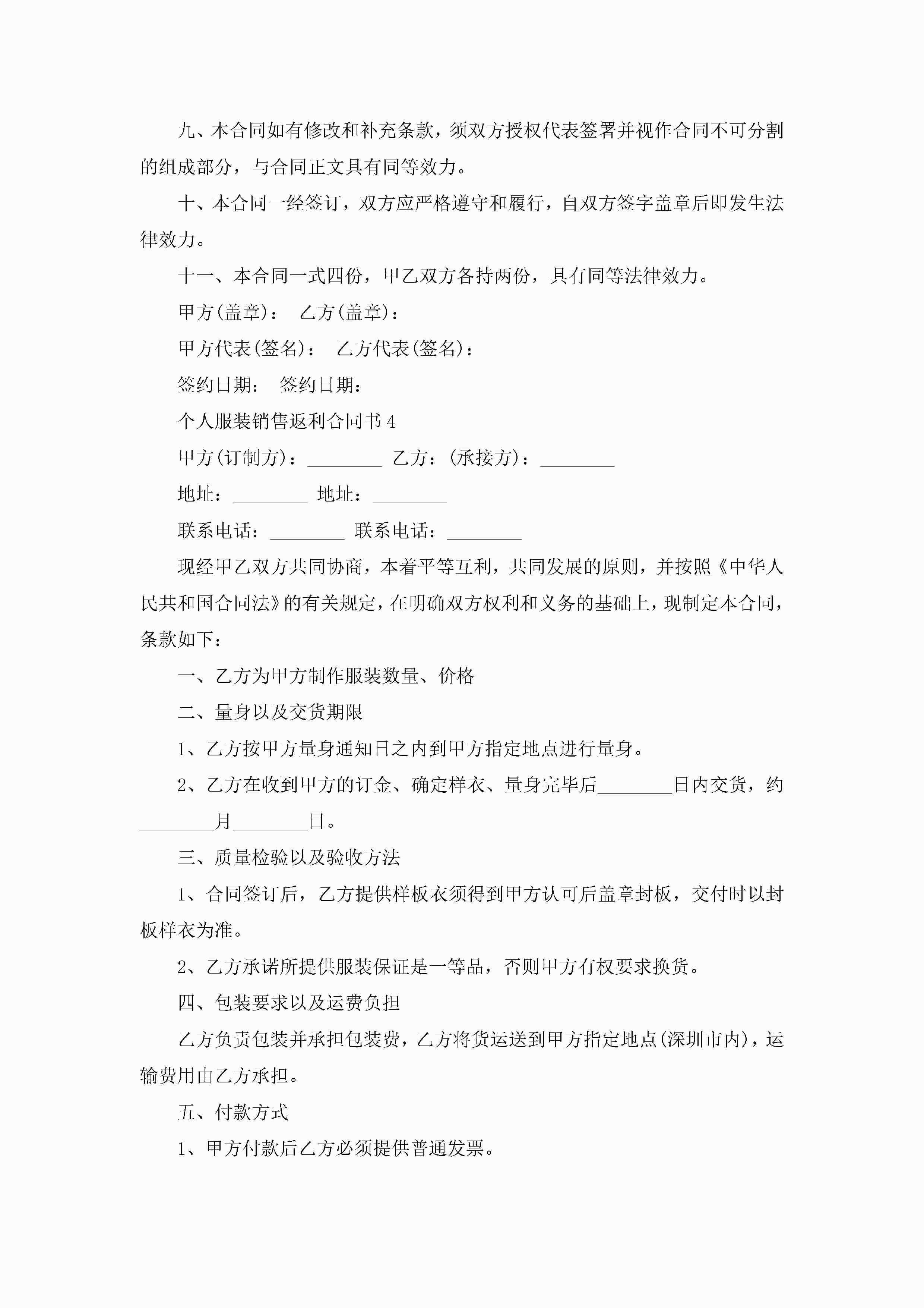 关于个人服装销售返利合同书5篇jugei3月23日 01:39发布关注188 关于个人服装销售返利合同书5篇此内容为付费资源,请付费后查看¥10.9 单篇文档限时特惠¥15个人会员开通企业会员开通立即下载无需登陆!可直接快捷下载单个模板付费资源© 版权声明THE ENDWord模板# 实用文档# 实用模板# 合同模板# 销售合同 如有问题,可点击最底部“联系我们”联系客服 分享QQ空间微博QQ好友海报分享复制链接收藏
