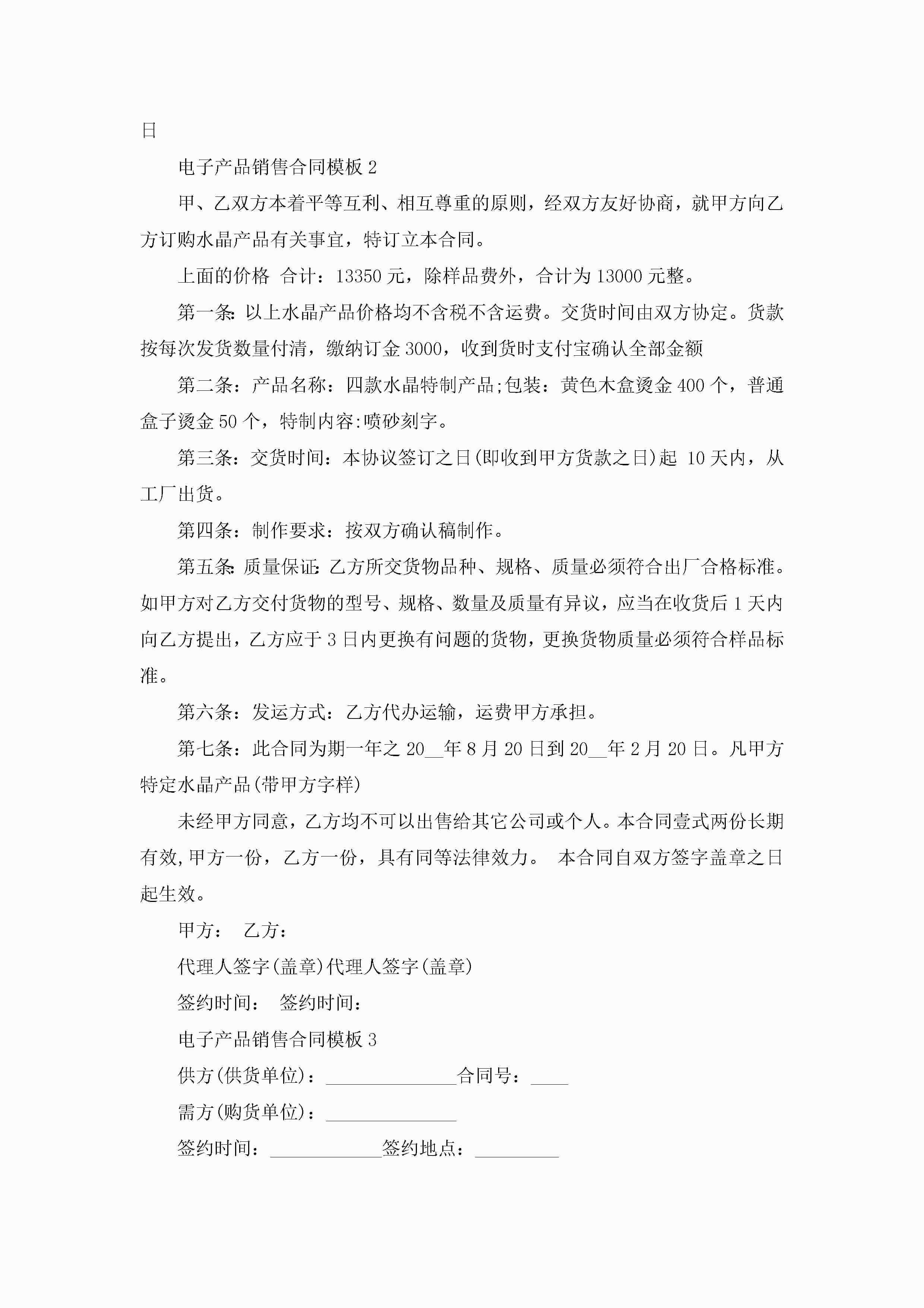 关于电子产品销售合同模板5篇jugei3月23日 01:39发布关注187 关于电子产品销售合同模板5篇此内容为付费资源,请付费后查看¥10.9 单篇文档限时特惠¥15个人会员开通企业会员开通立即下载无需登陆!可直接快捷下载单个模板付费资源© 版权声明THE ENDWord模板# 实用文档# 实用模板# 合同模板# 销售合同 如有问题,可点击最底部“联系我们”联系客服 分享QQ空间微博QQ好友海报分享复制链接收藏