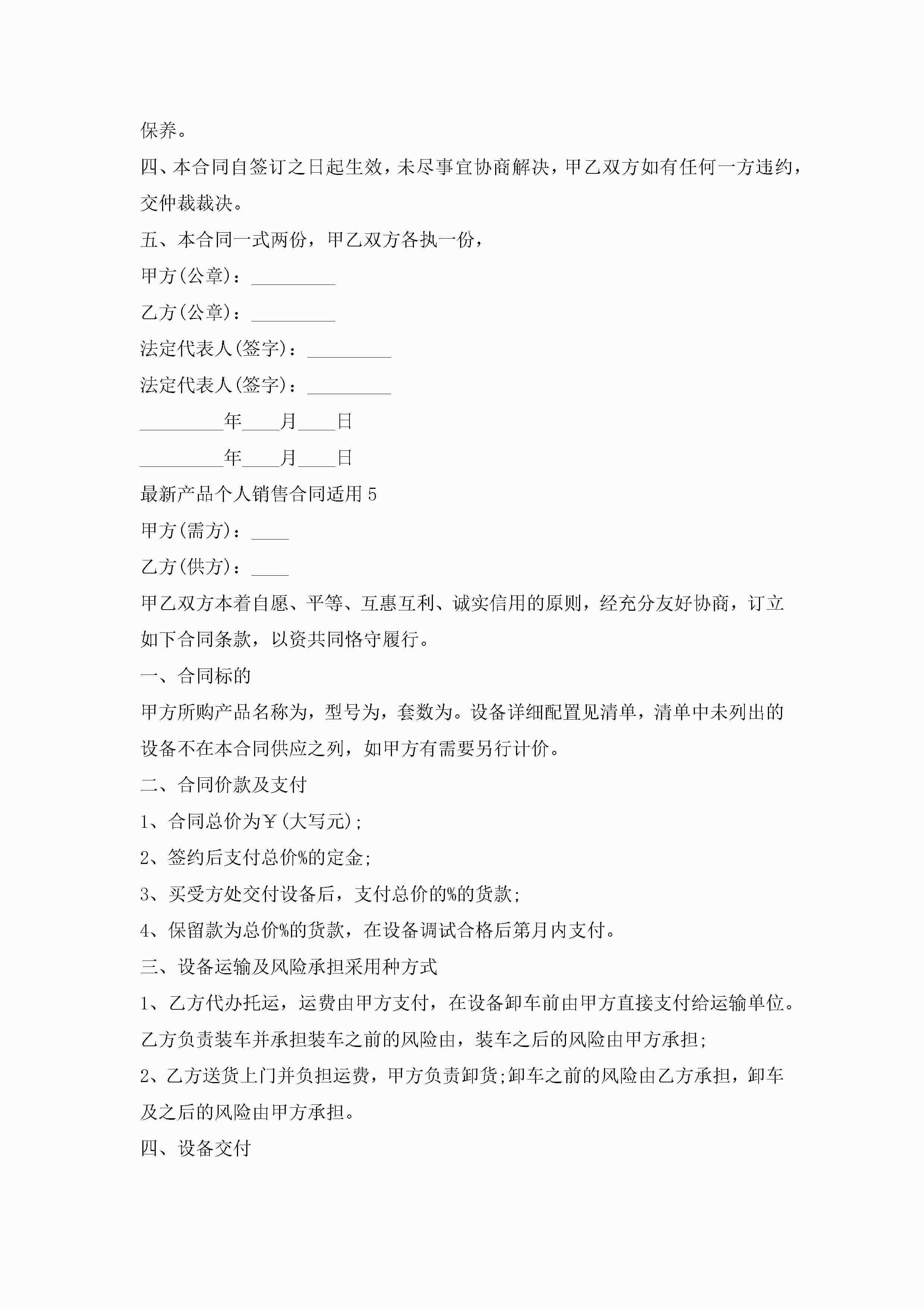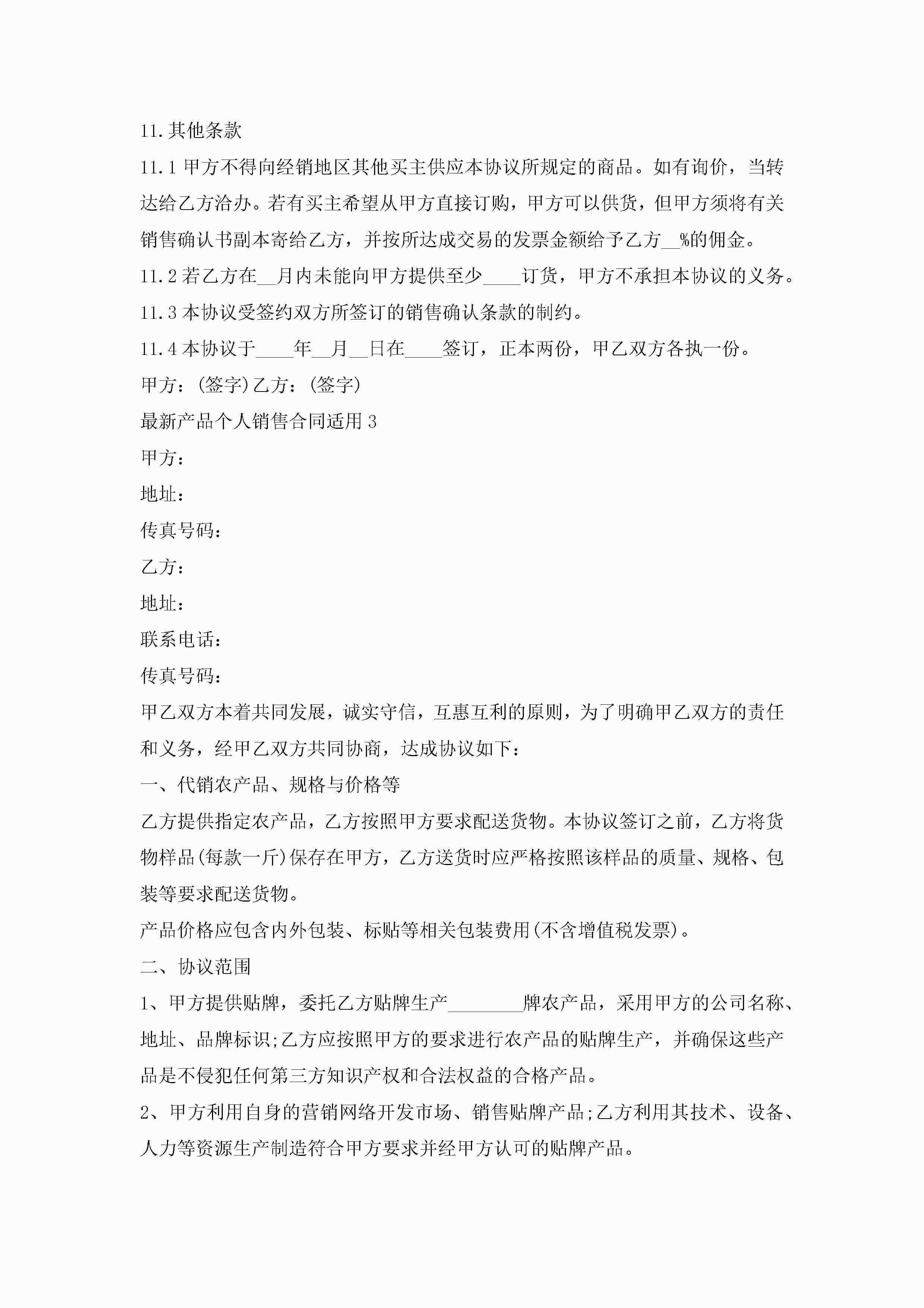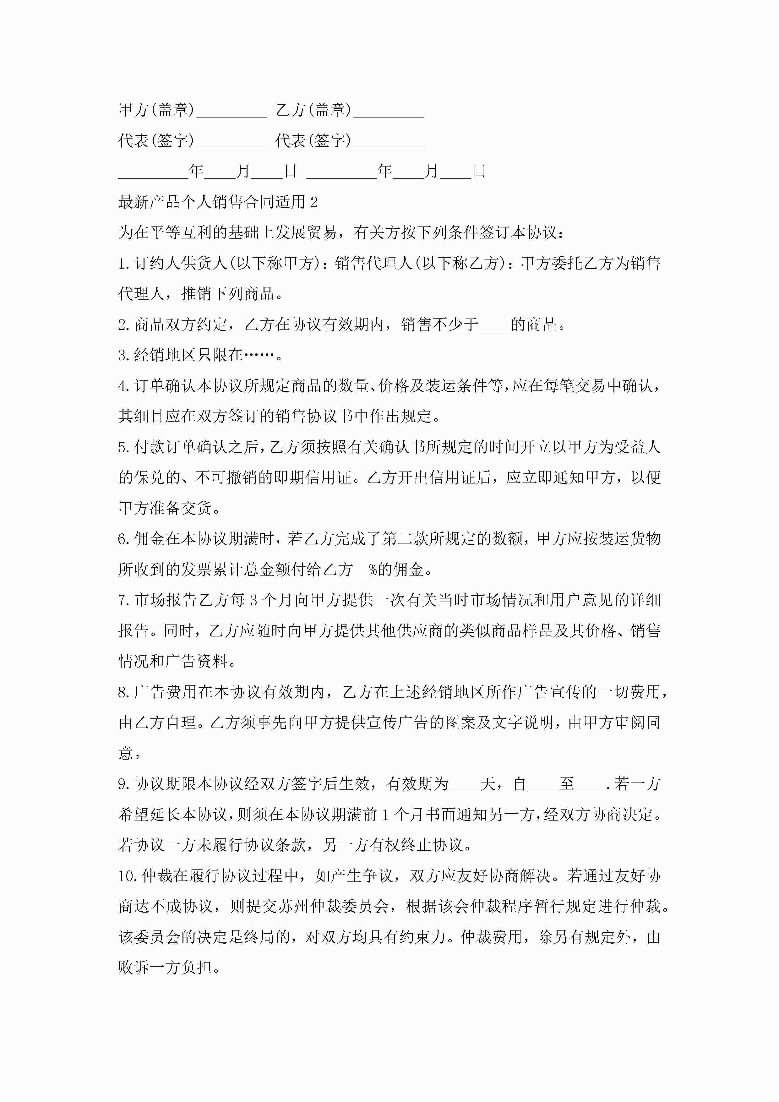 最新产品个人销售合同适用5篇jugei3月23日 01:39发布关注199 最新产品个人销售合同适用5篇此内容为付费资源,请付费后查看¥10.9 单篇文档限时特惠¥15个人会员开通企业会员开通立即下载无需登陆!可直接快捷下载单个模板付费资源© 版权声明THE ENDWord模板# 实用文档# 实用模板# 合同模板# 销售合同 如有问题,可点击最底部“联系我们”联系客服 分享QQ空间微博QQ好友海报分享复制链接收藏