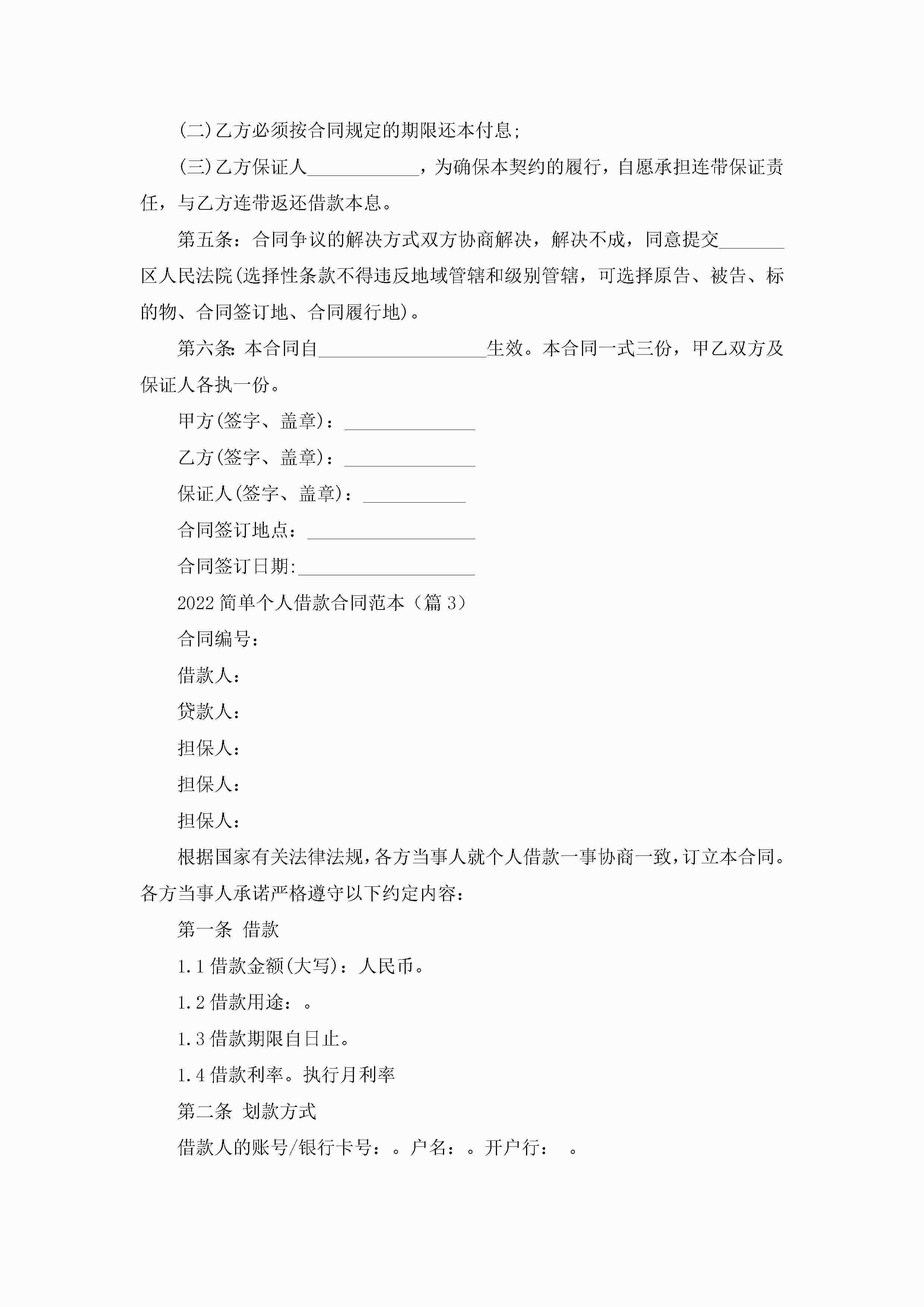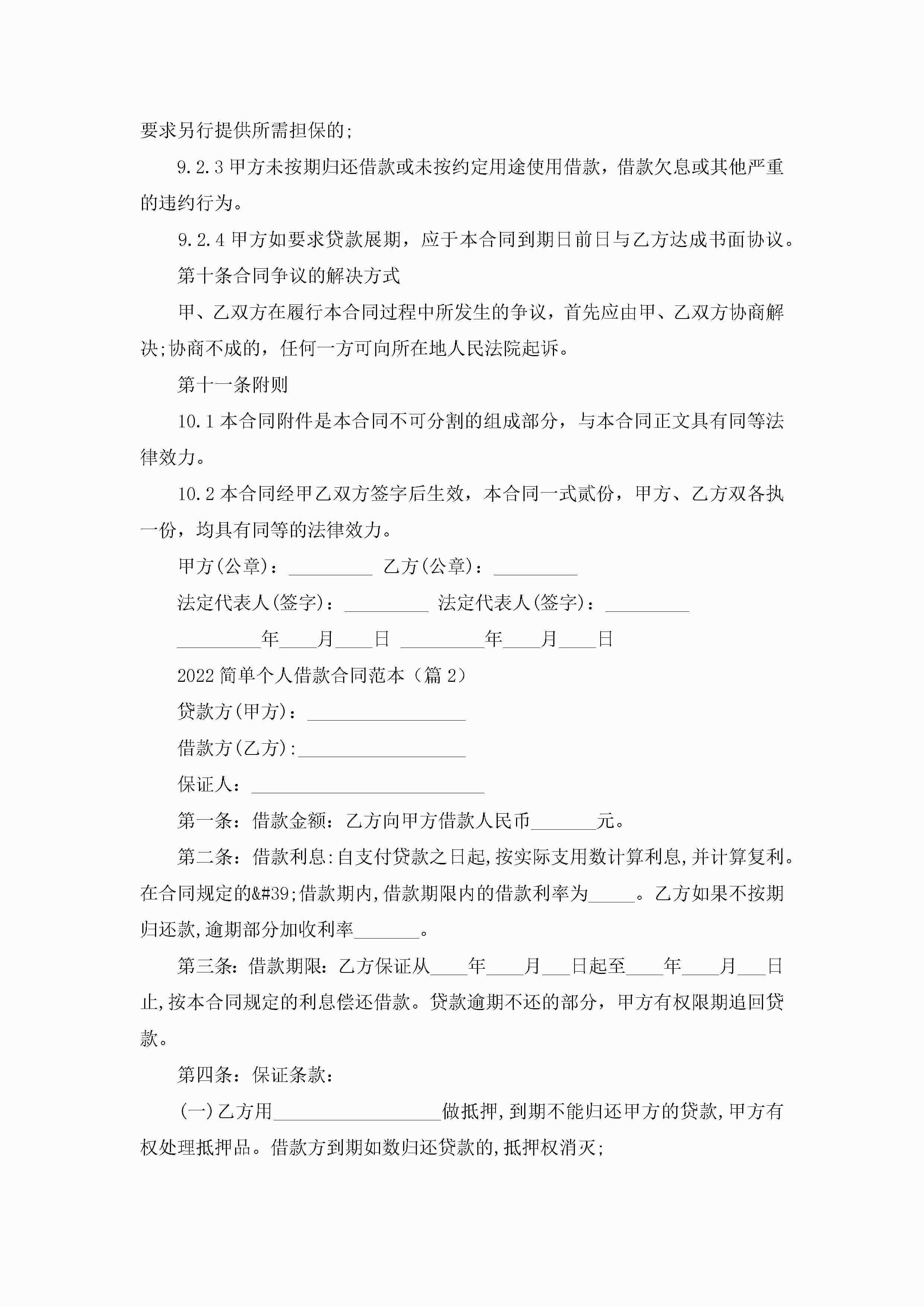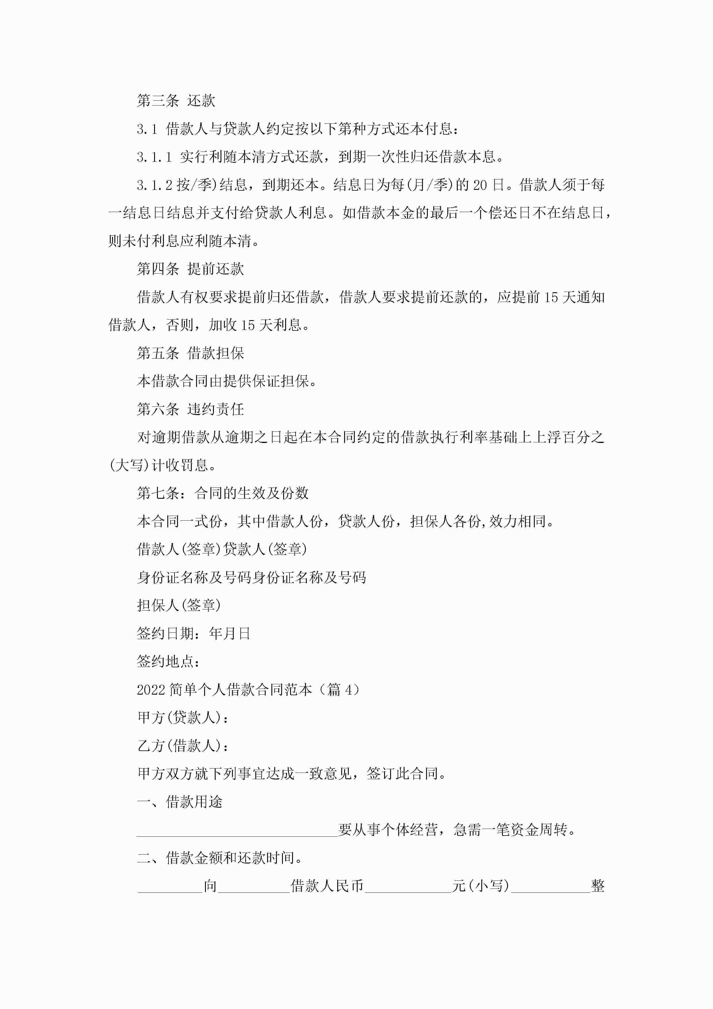 2022简单个人借款合同范本八篇jugei3月23日 01:40发布关注350 2022简单个人借款合同范本八篇此内容为付费资源,请付费后查看¥10.9 单篇文档限时特惠¥15个人会员开通企业会员开通立即下载无需登陆!可直接快捷下载单个模板付费资源© 版权声明THE ENDWord模板# 实用文档# 实用模板# 合同模板# 借款合同 如有问题,可点击最底部“联系我们”联系客服 分享QQ空间微博QQ好友海报分享复制链接收藏
