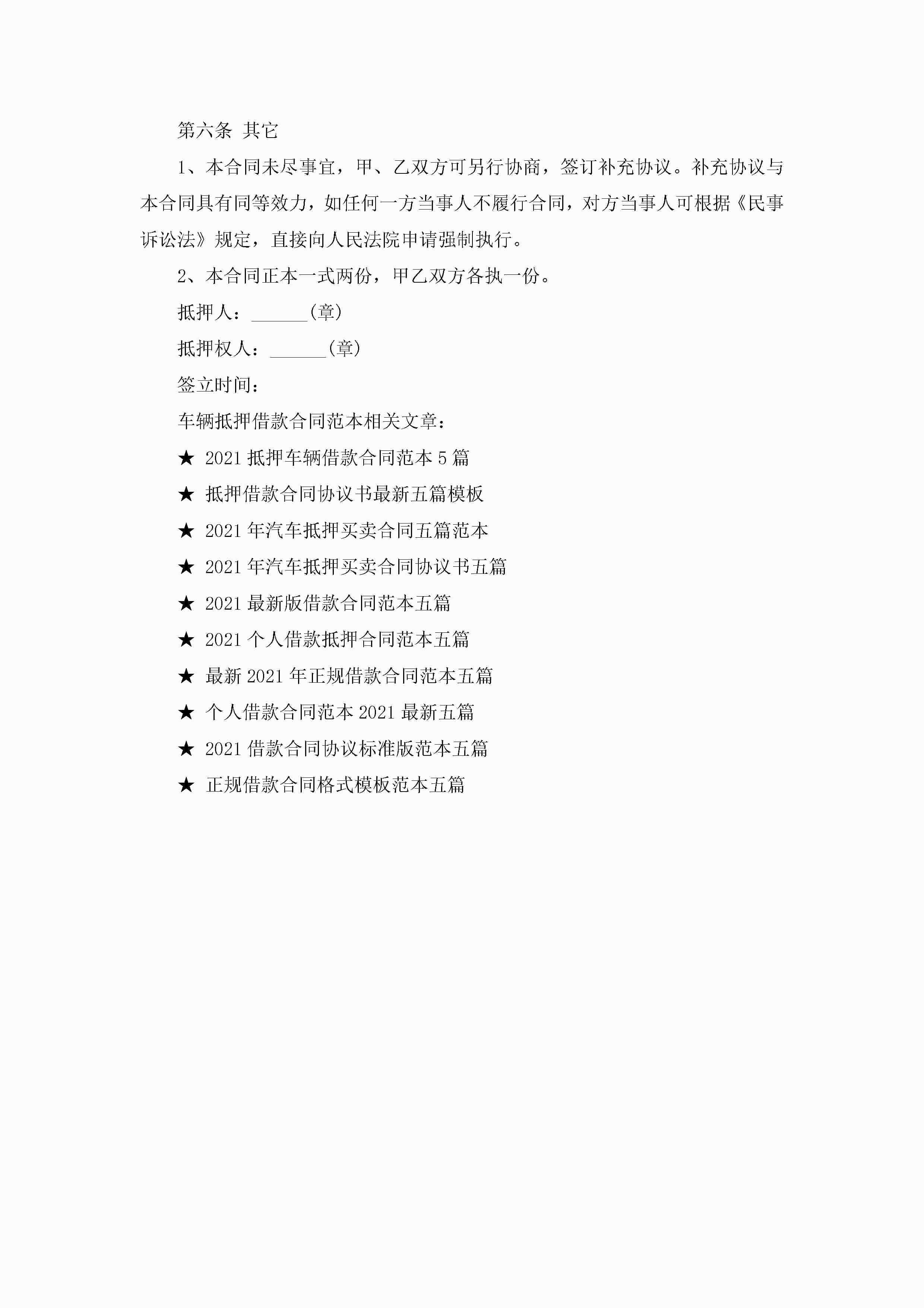 车辆抵押借款合同范本5篇jugei3月23日 01:40发布关注266 车辆抵押借款合同范本5篇此内容为付费资源,请付费后查看¥10.9 单篇文档限时特惠¥15个人会员开通企业会员开通立即下载无需登陆!可直接快捷下载单个模板付费资源© 版权声明THE ENDWord模板# 实用文档# 实用模板# 合同模板# 借款合同 如有问题,可点击最底部“联系我们”联系客服 分享QQ空间微博QQ好友海报分享复制链接收藏