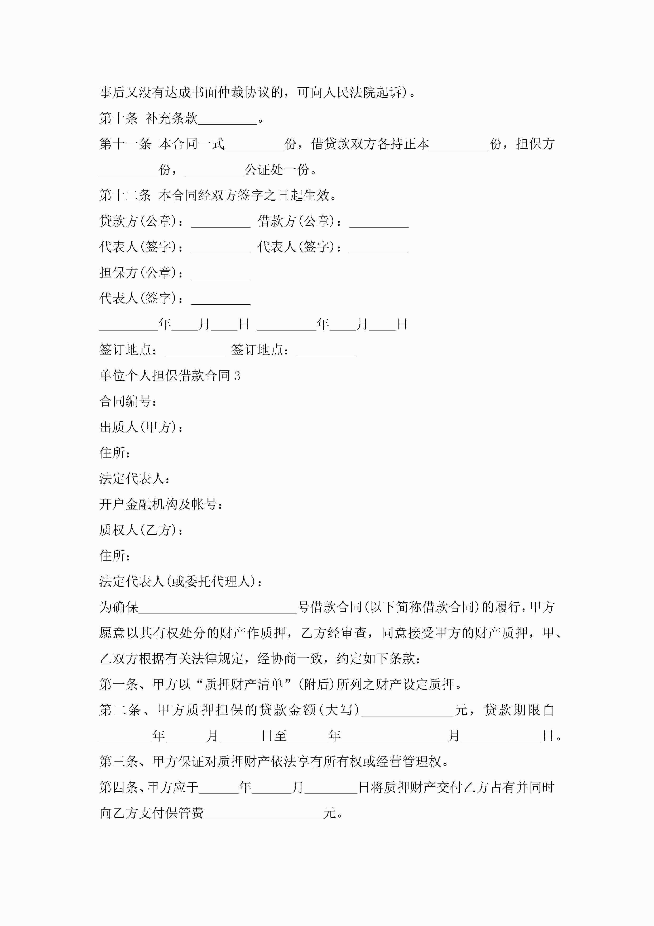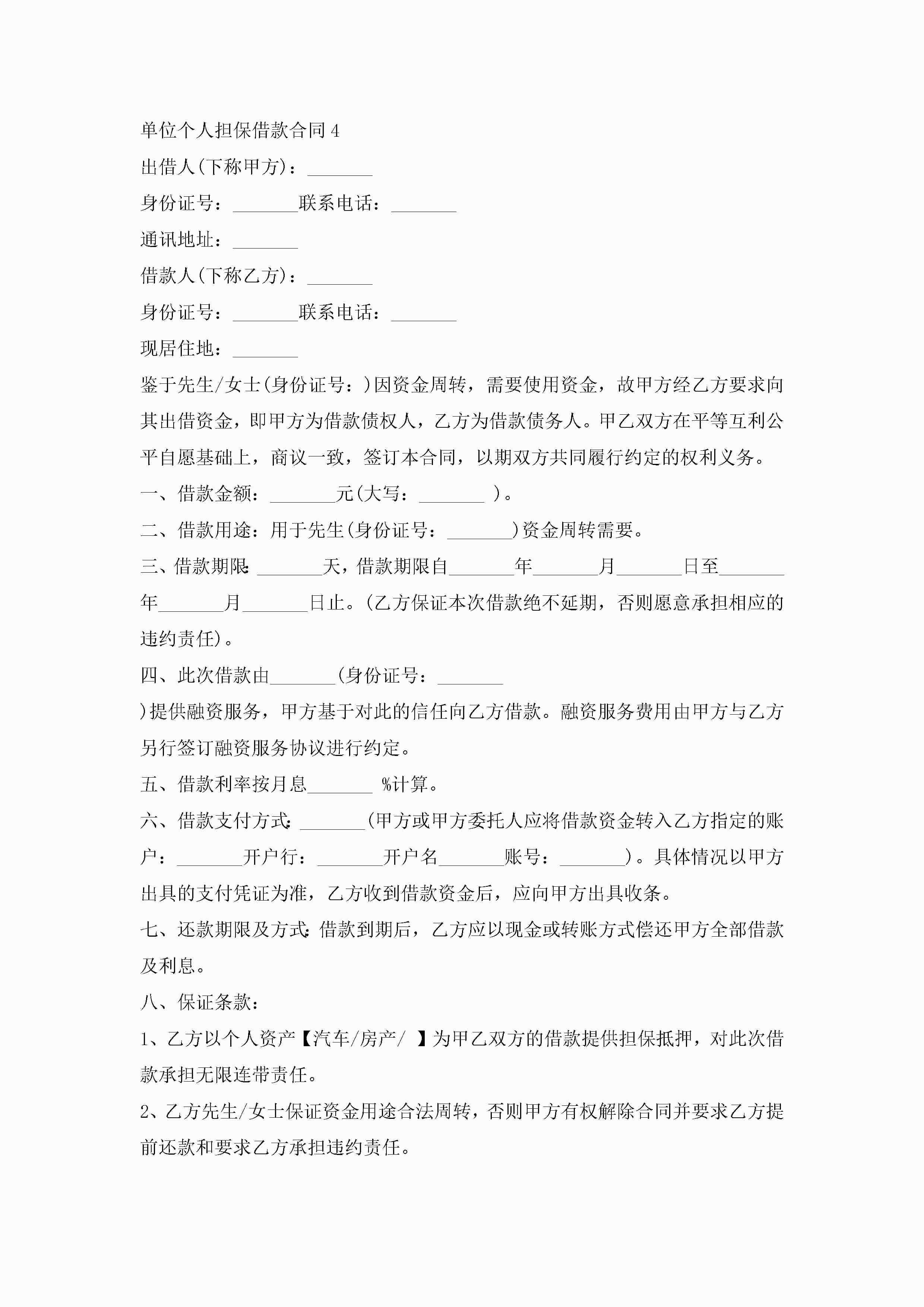 最新单位个人担保借款合同5篇jugei3月23日 01:40发布关注281 最新单位个人担保借款合同5篇此内容为付费资源,请付费后查看¥10.9 单篇文档限时特惠¥15个人会员开通企业会员开通立即下载无需登陆!可直接快捷下载单个模板付费资源© 版权声明THE ENDWord模板# 实用文档# 实用模板# 合同模板# 借款合同 如有问题,可点击最底部“联系我们”联系客服 分享QQ空间微博QQ好友海报分享复制链接收藏