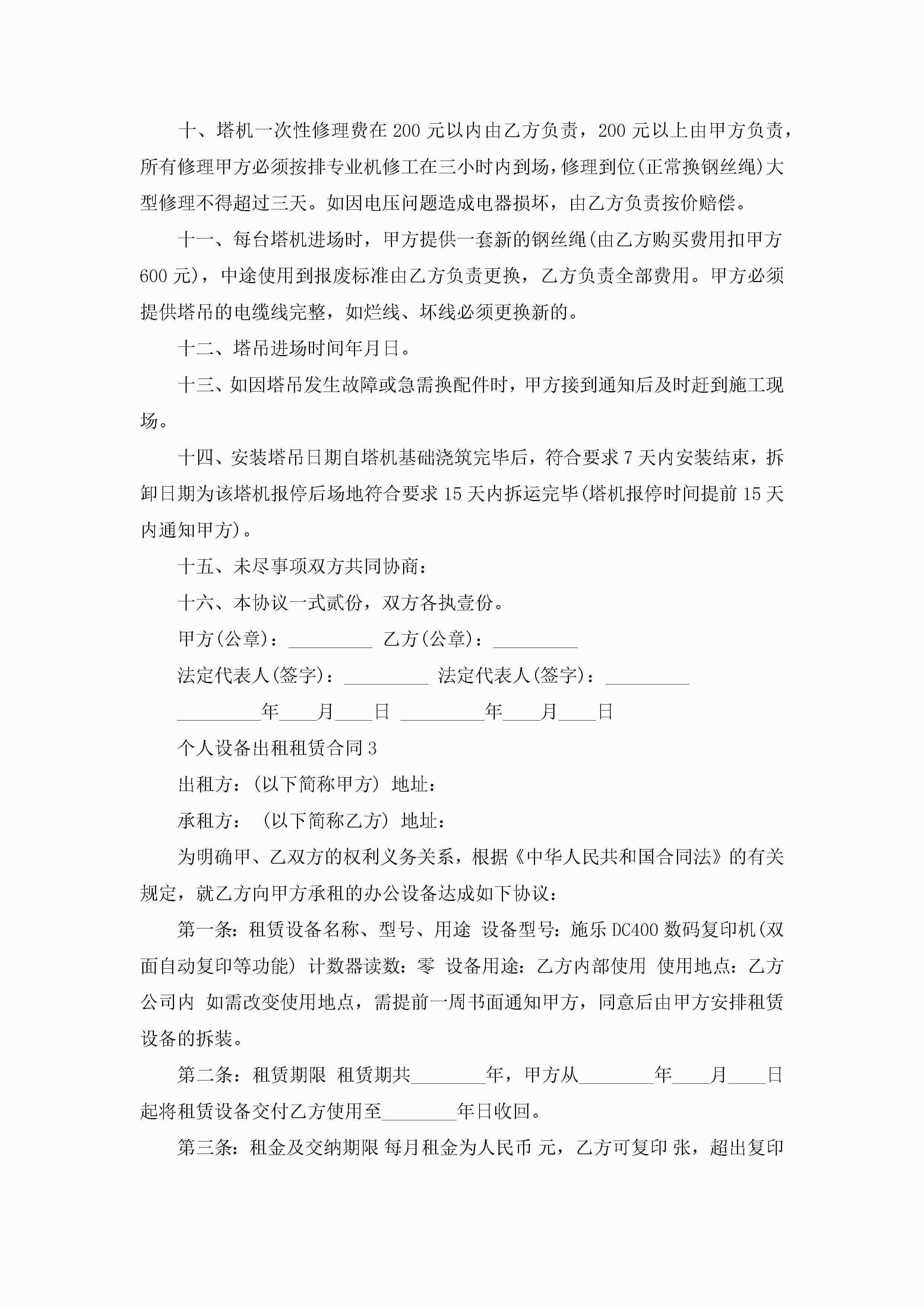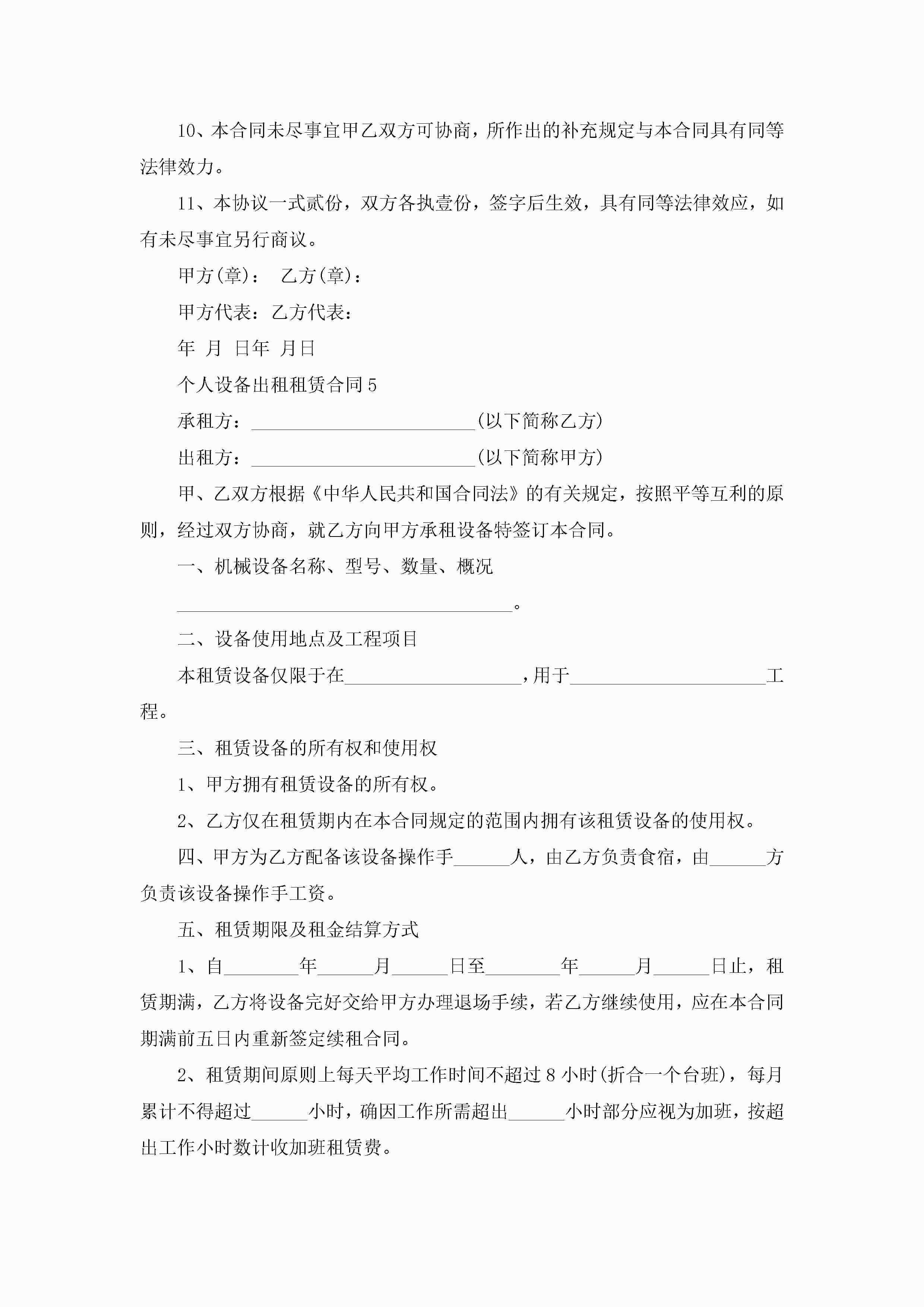 关于个人设备出租租赁合同5篇jugei3月23日 01:41发布关注190 关于个人设备出租租赁合同5篇此内容为付费资源,请付费后查看¥10.9 单篇文档限时特惠¥15个人会员开通企业会员开通立即下载无需登陆!可直接快捷下载单个模板付费资源© 版权声明THE ENDWord模板# 实用文档# 实用模板# 合同模板# 租赁合同 如有问题,可点击最底部“联系我们”联系客服 分享QQ空间微博QQ好友海报分享复制链接收藏