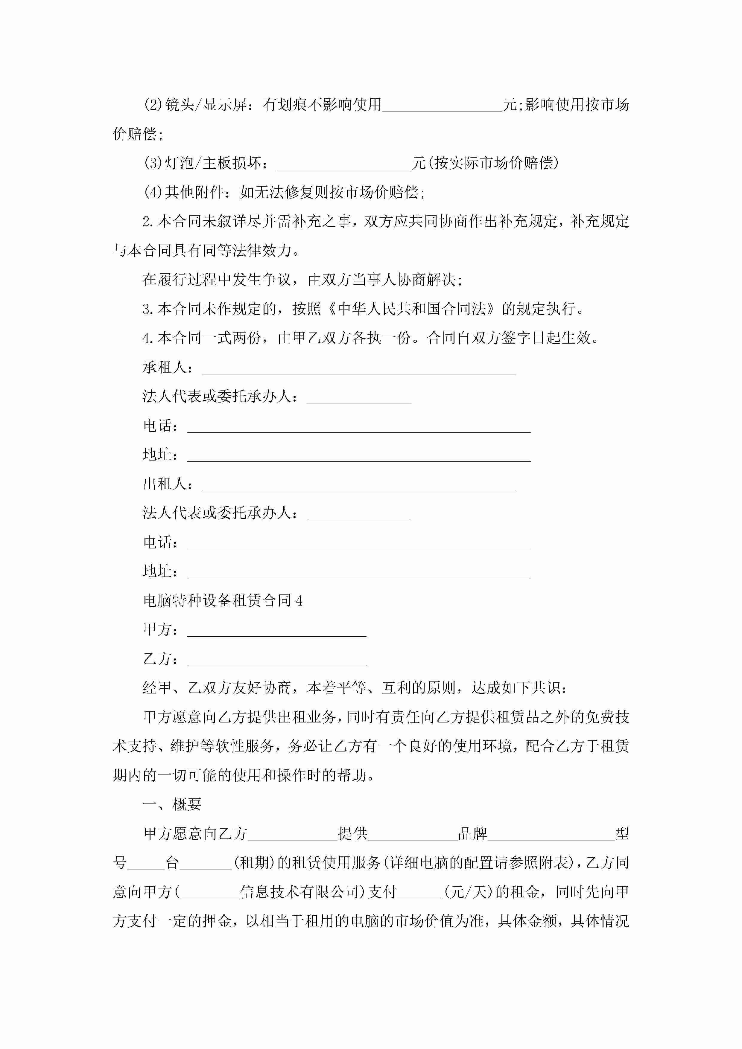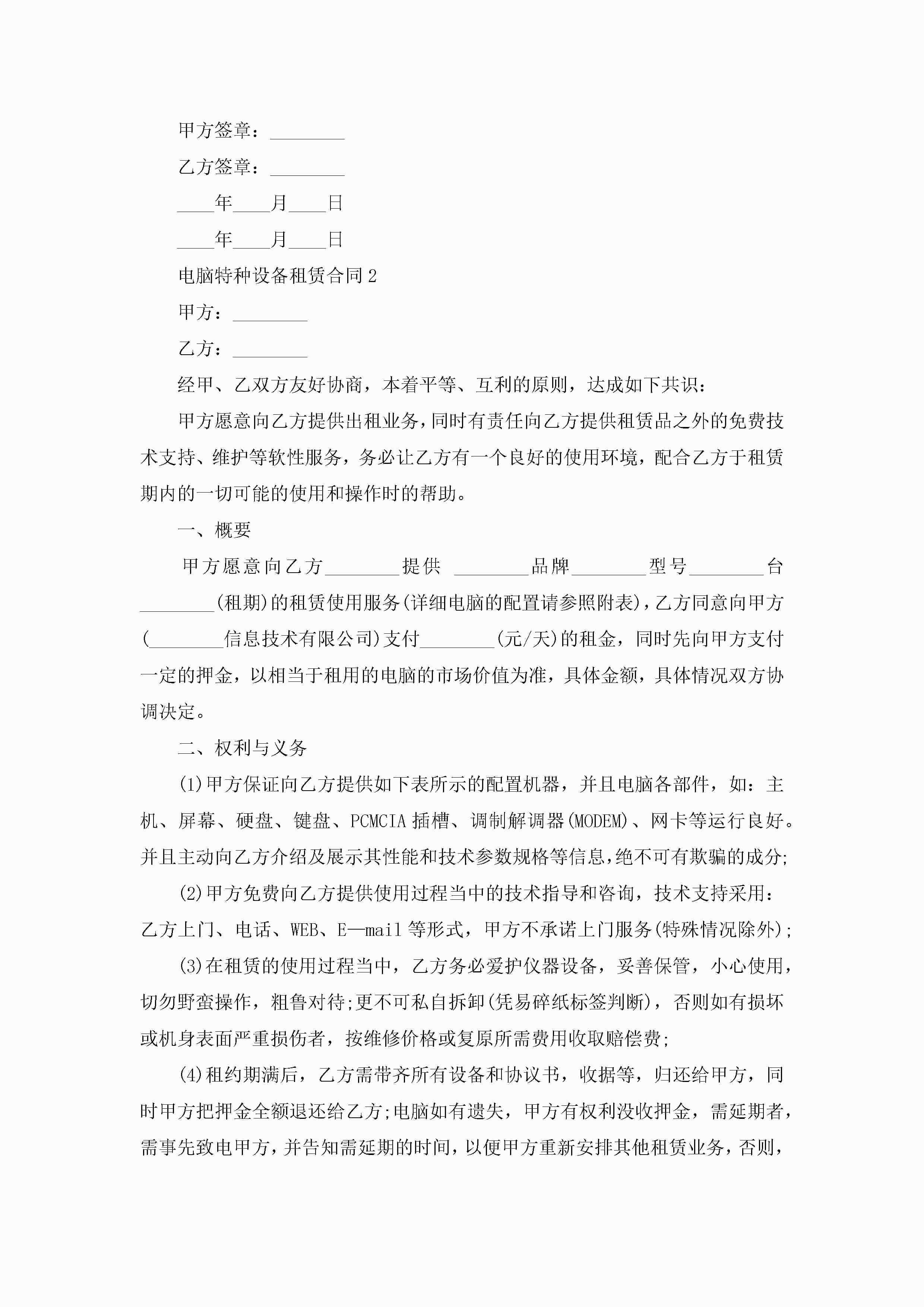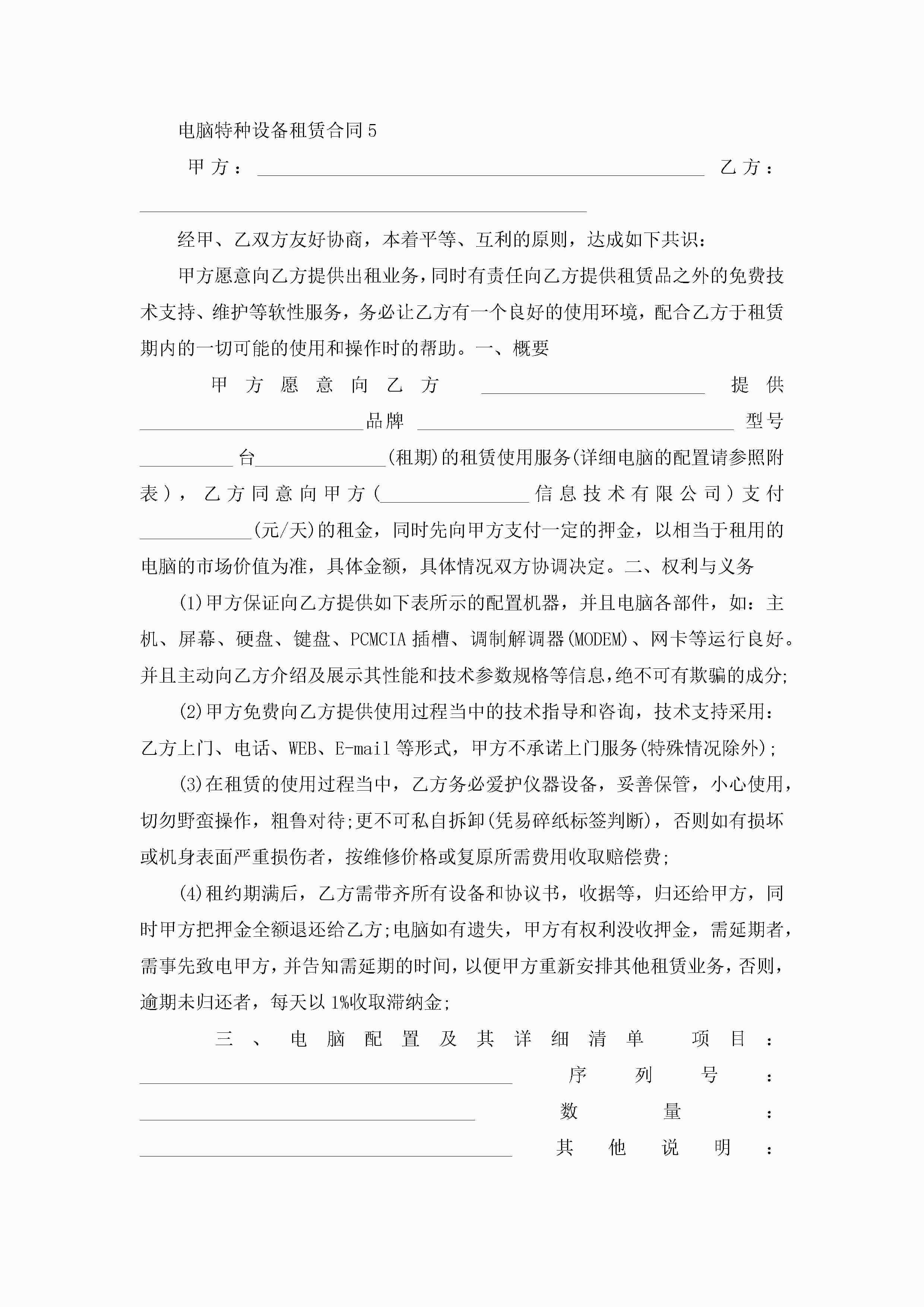 电脑特种设备租赁合同5篇jugei3月23日 01:41发布关注208 电脑特种设备租赁合同5篇此内容为付费资源,请付费后查看¥10.9 单篇文档限时特惠¥15个人会员开通企业会员开通立即下载无需登陆!可直接快捷下载单个模板付费资源© 版权声明THE ENDWord模板# 实用文档# 实用模板# 合同模板# 租赁合同 如有问题,可点击最底部“联系我们”联系客服 分享QQ空间微博QQ好友海报分享复制链接收藏