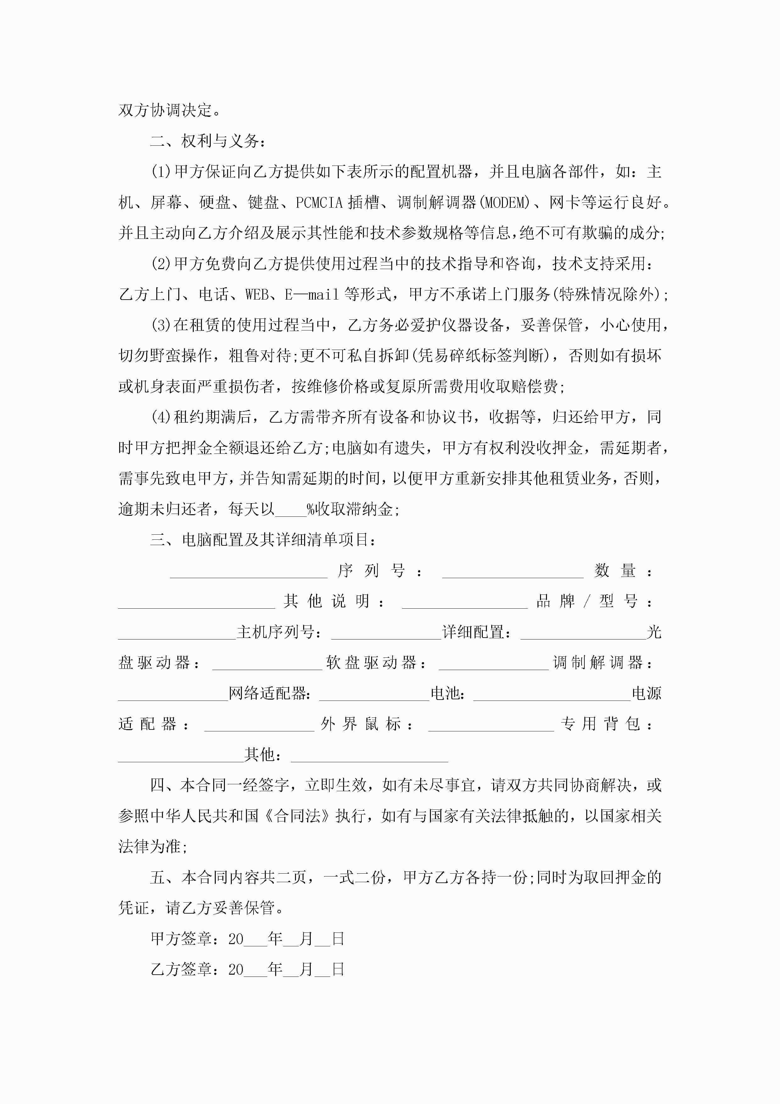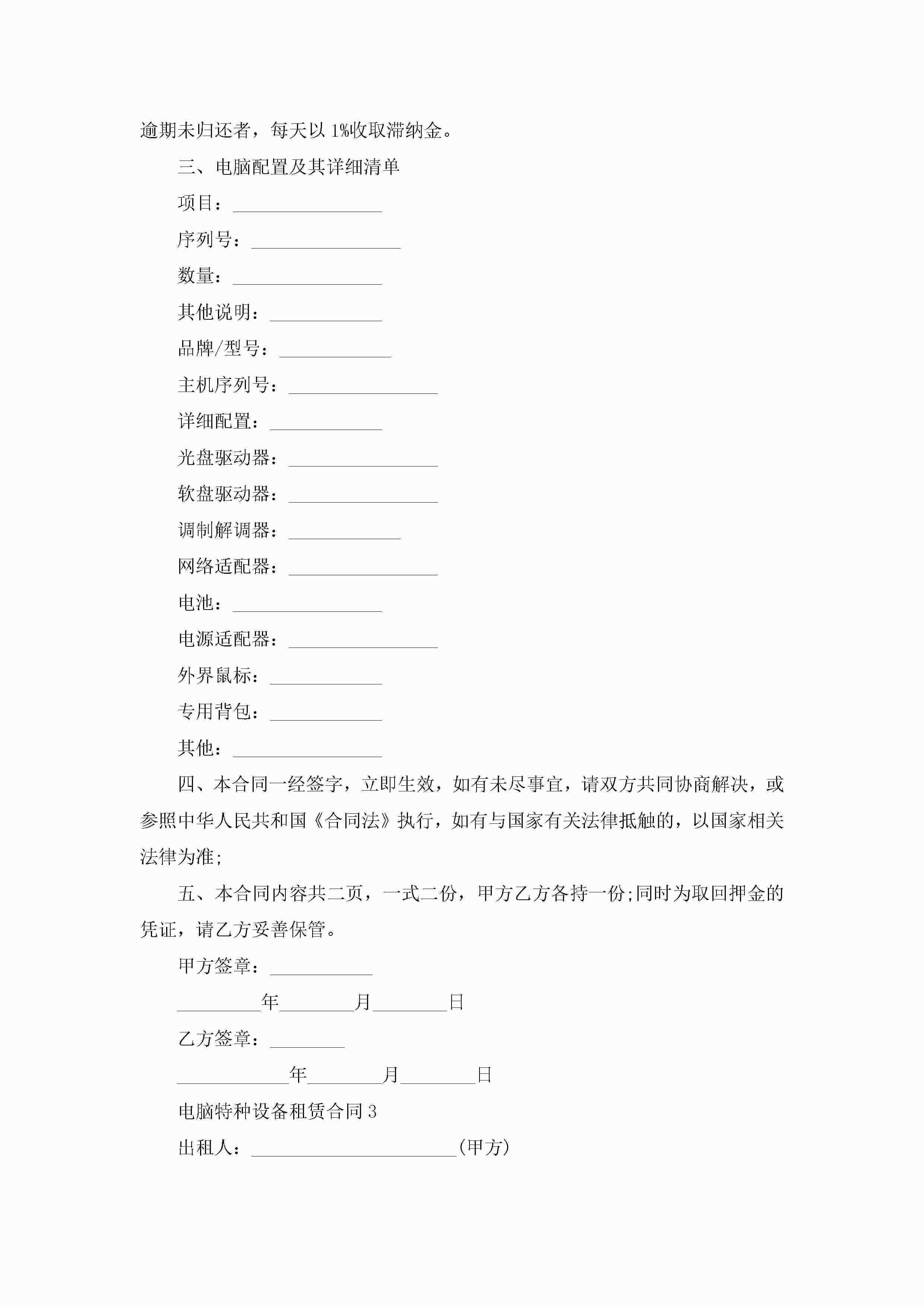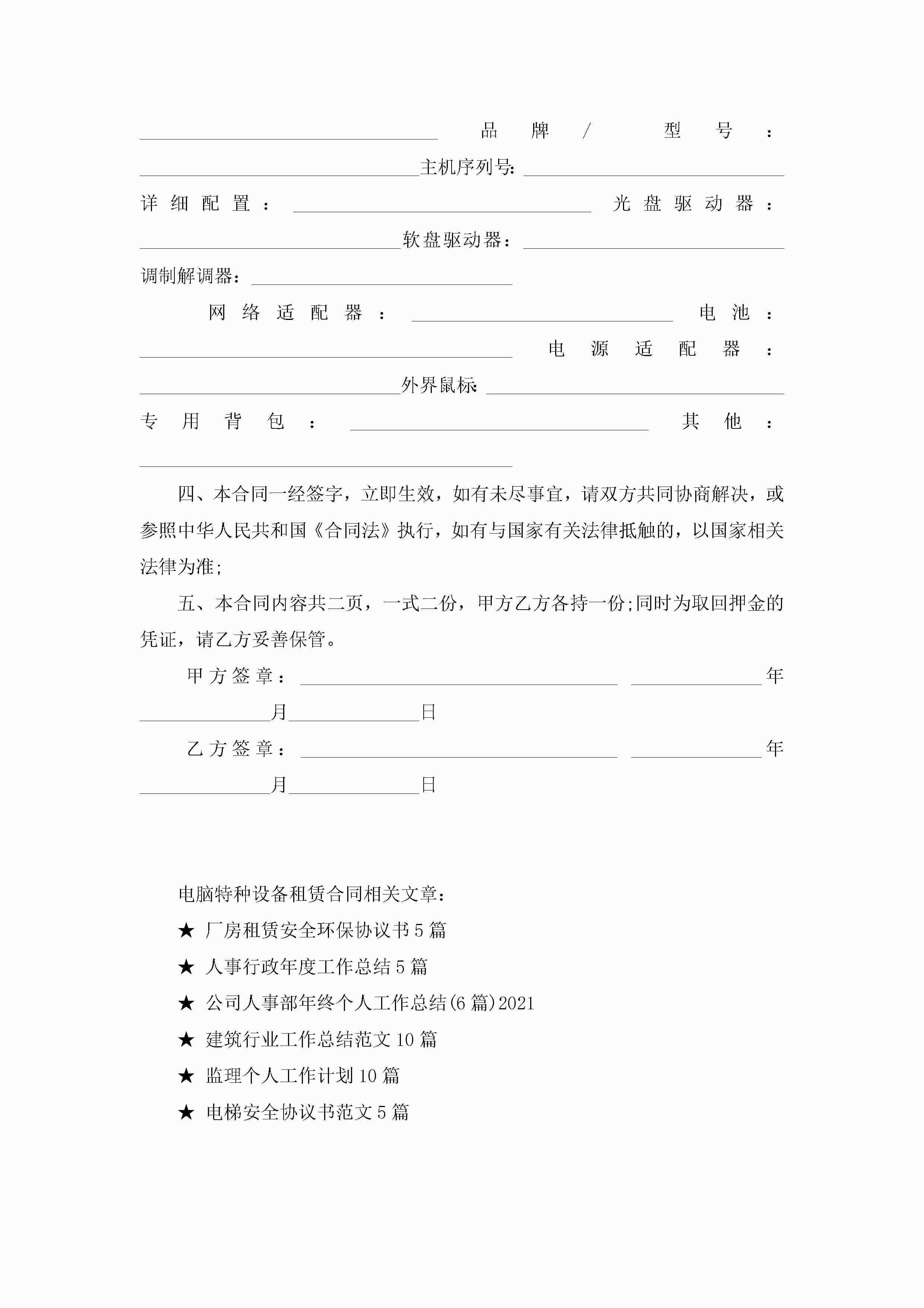电脑特种设备租赁合同5篇jugei3月23日 01:41发布关注208 电脑特种设备租赁合同5篇此内容为付费资源,请付费后查看¥10.9 单篇文档限时特惠¥15个人会员开通企业会员开通立即下载无需登陆!可直接快捷下载单个模板付费资源© 版权声明THE ENDWord模板# 实用文档# 实用模板# 合同模板# 租赁合同 如有问题,可点击最底部“联系我们”联系客服 分享QQ空间微博QQ好友海报分享复制链接收藏
