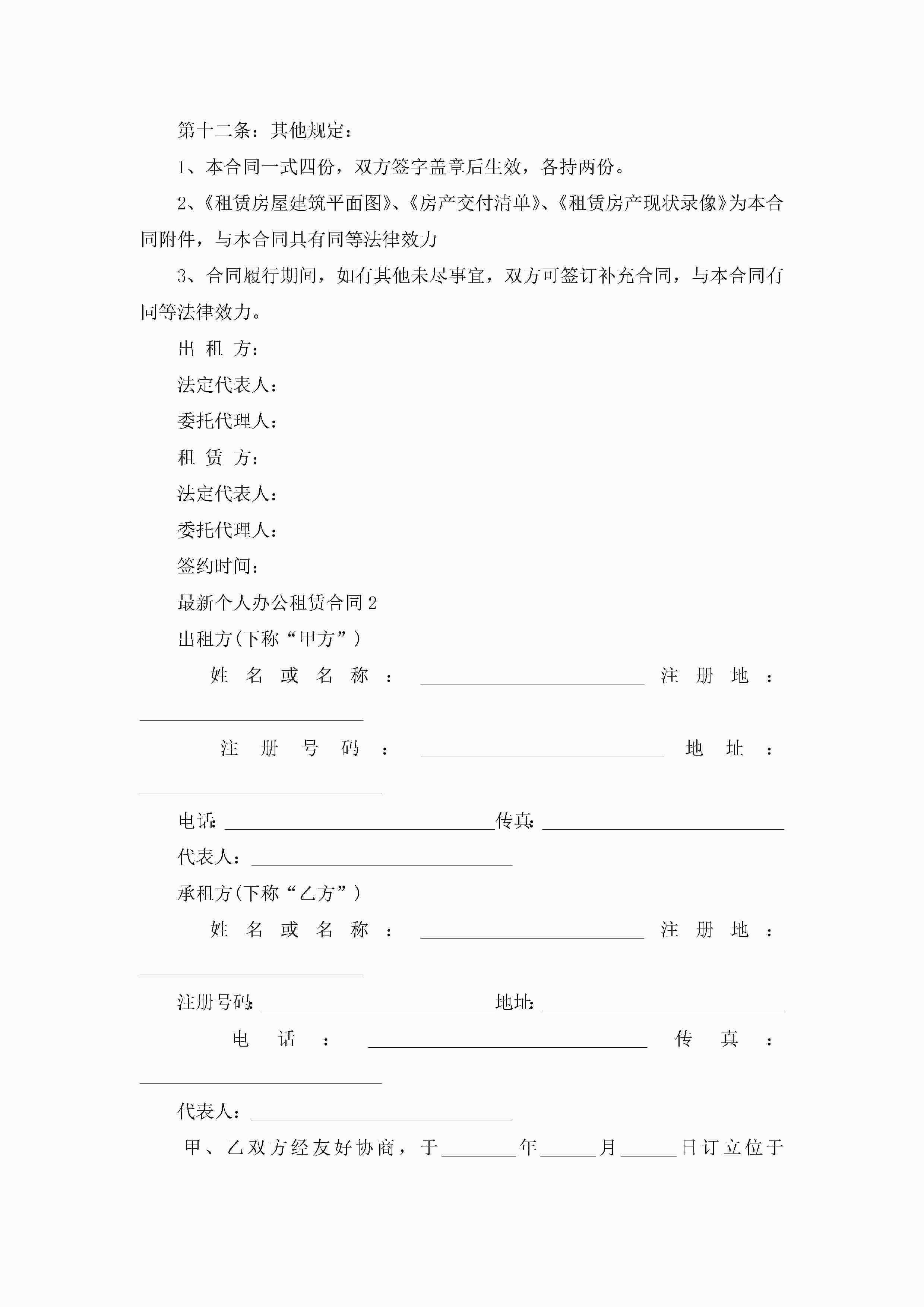 最新个人办公租赁合同5篇jugei3月23日 01:41发布关注189 最新个人办公租赁合同5篇此内容为付费资源,请付费后查看¥10.9 单篇文档限时特惠¥15个人会员开通企业会员开通立即下载无需登陆!可直接快捷下载单个模板付费资源© 版权声明THE ENDWord模板# 实用文档# 实用模板# 合同模板# 租赁合同 如有问题,可点击最底部“联系我们”联系客服 分享QQ空间微博QQ好友海报分享复制链接收藏