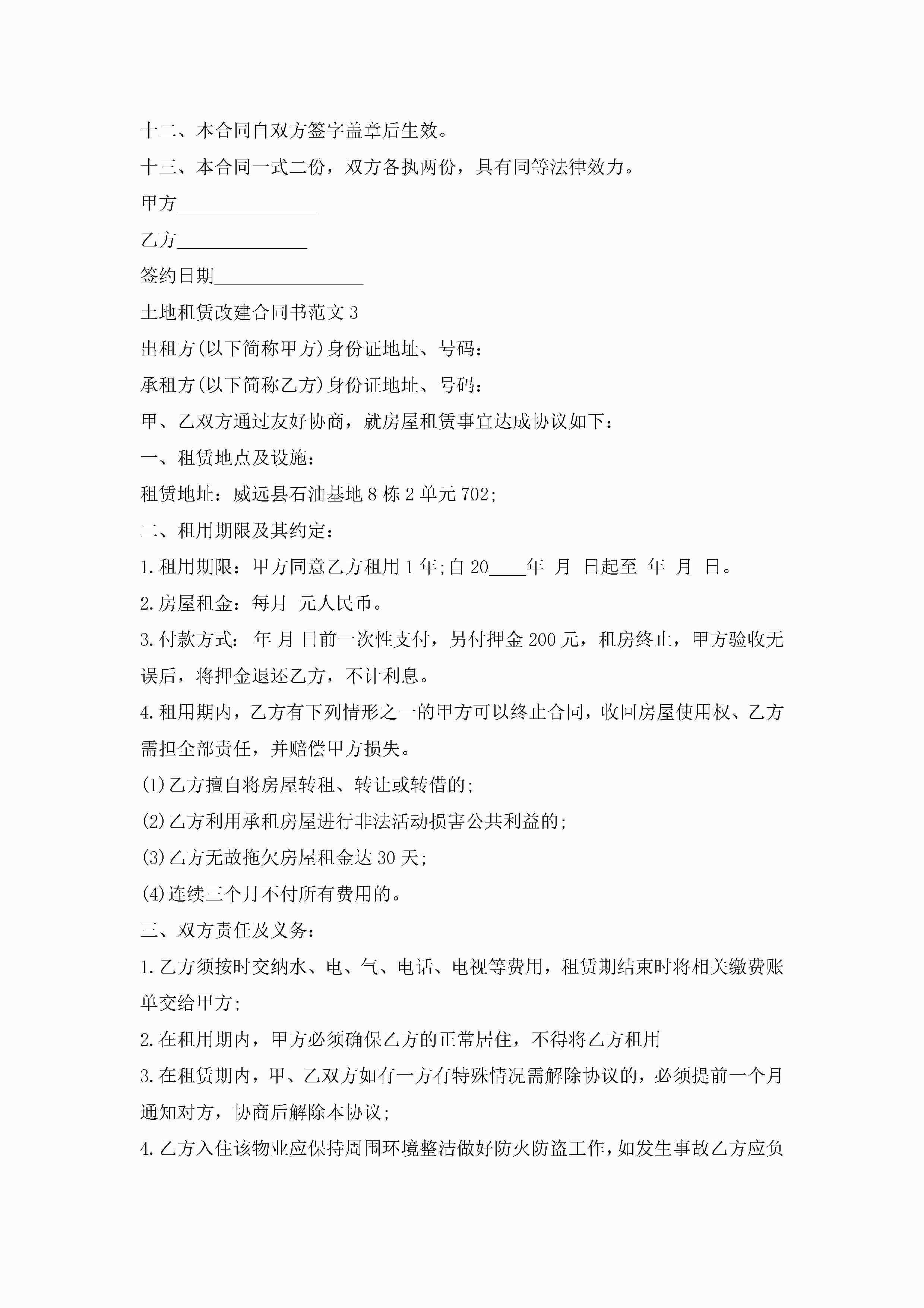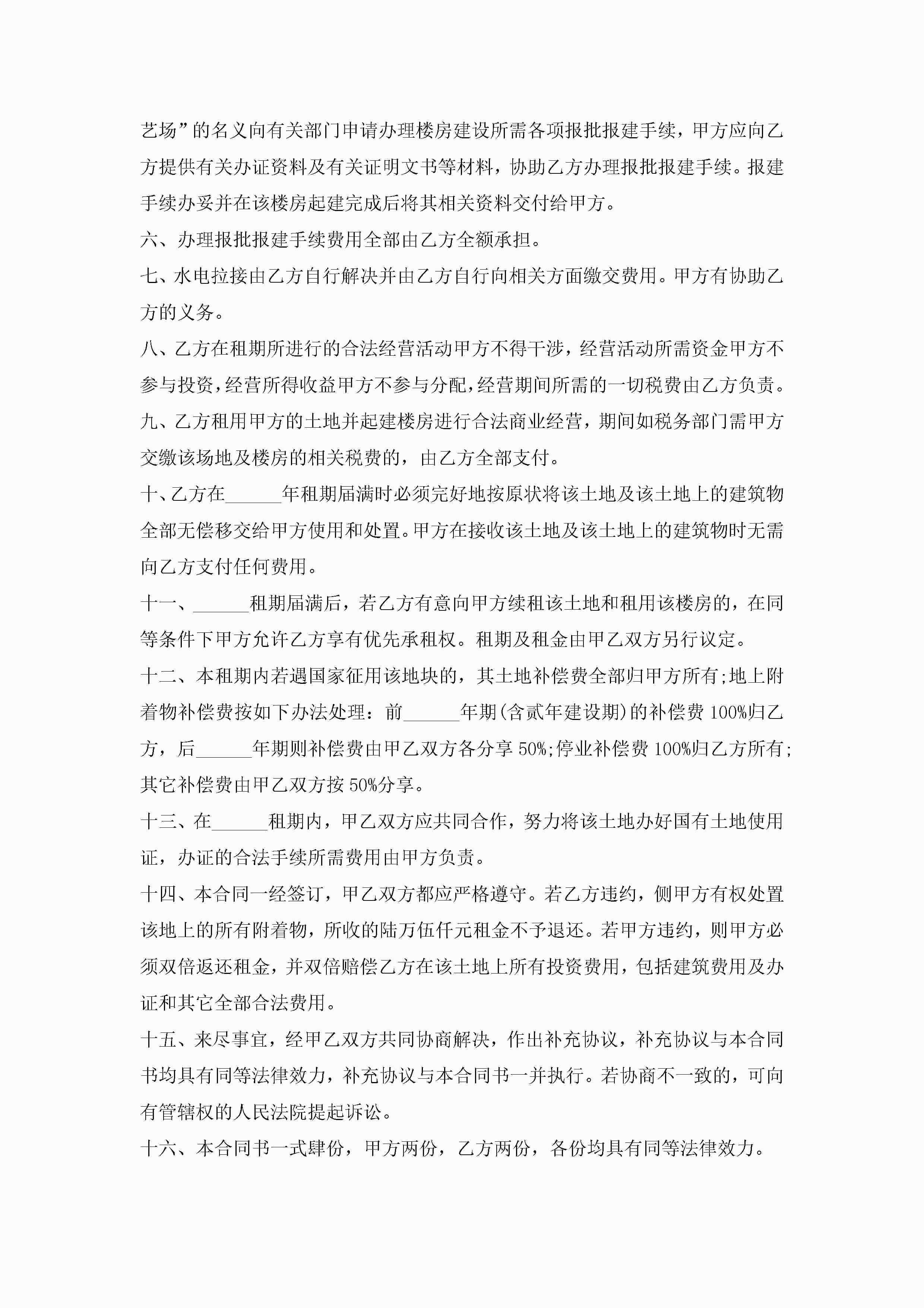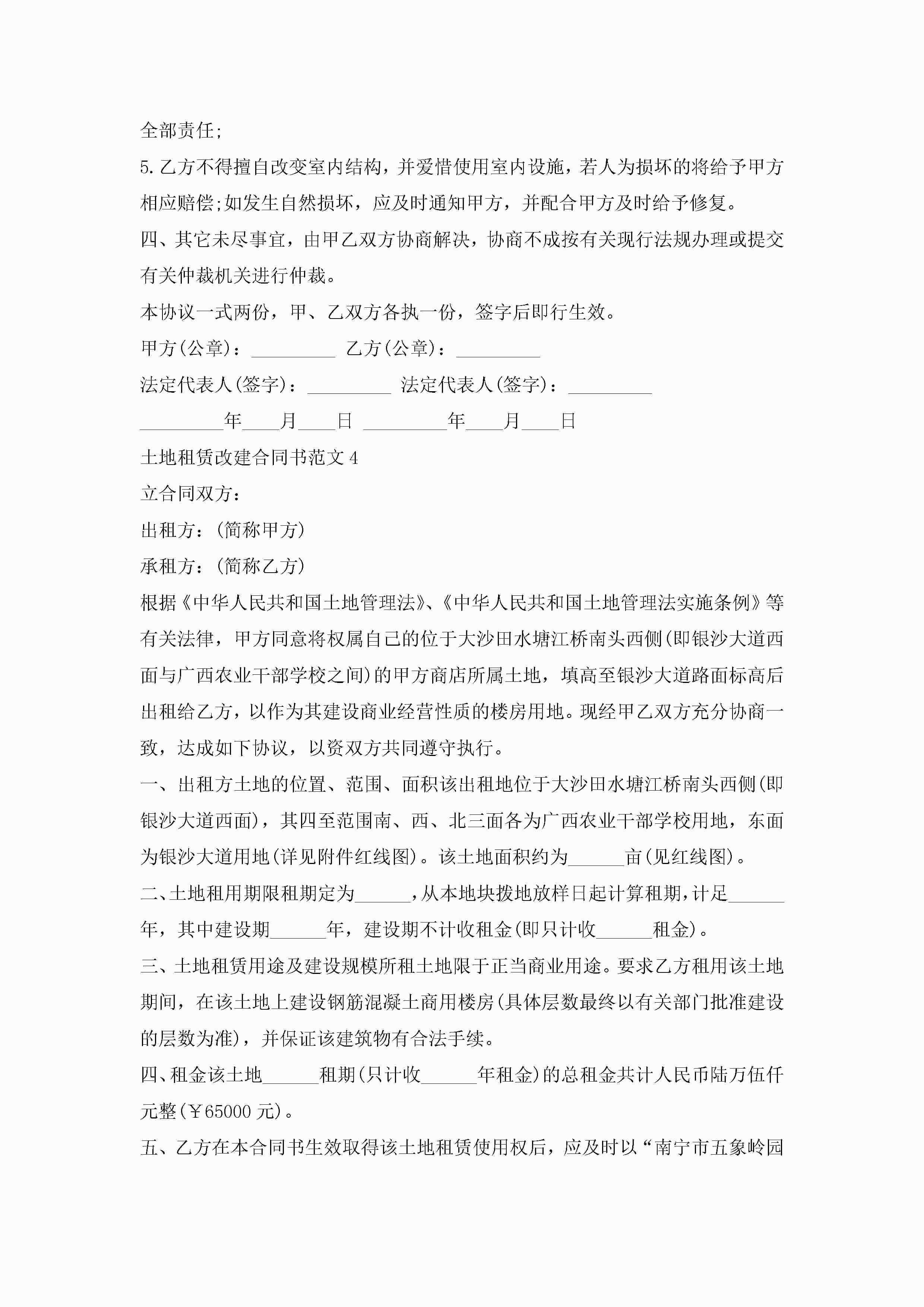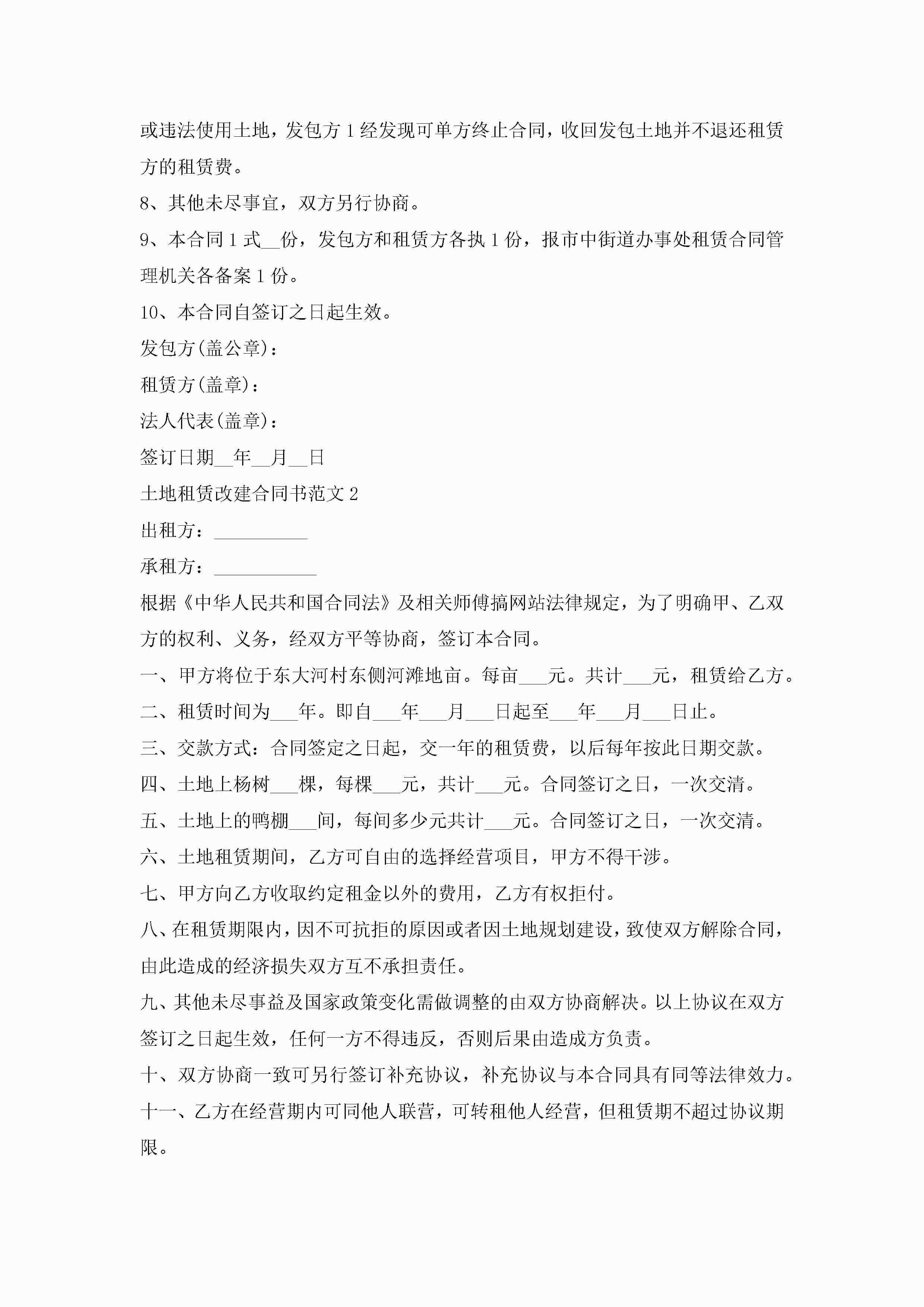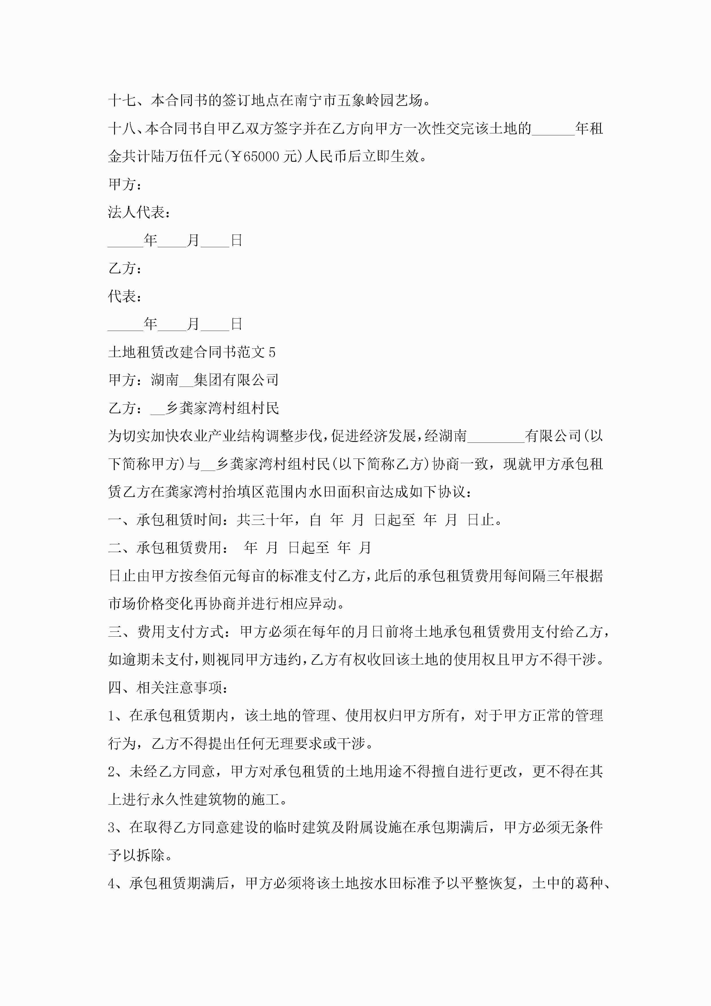 土地租赁改建合同书范文5篇jugei3月23日 01:41发布关注251 土地租赁改建合同书范文5篇此内容为付费资源,请付费后查看¥10.9 单篇文档限时特惠¥15个人会员开通企业会员开通立即下载无需登陆!可直接快捷下载单个模板付费资源© 版权声明THE ENDWord模板# 实用文档# 实用模板# 合同模板# 租赁合同 如有问题,可点击最底部“联系我们”联系客服 分享QQ空间微博QQ好友海报分享复制链接收藏