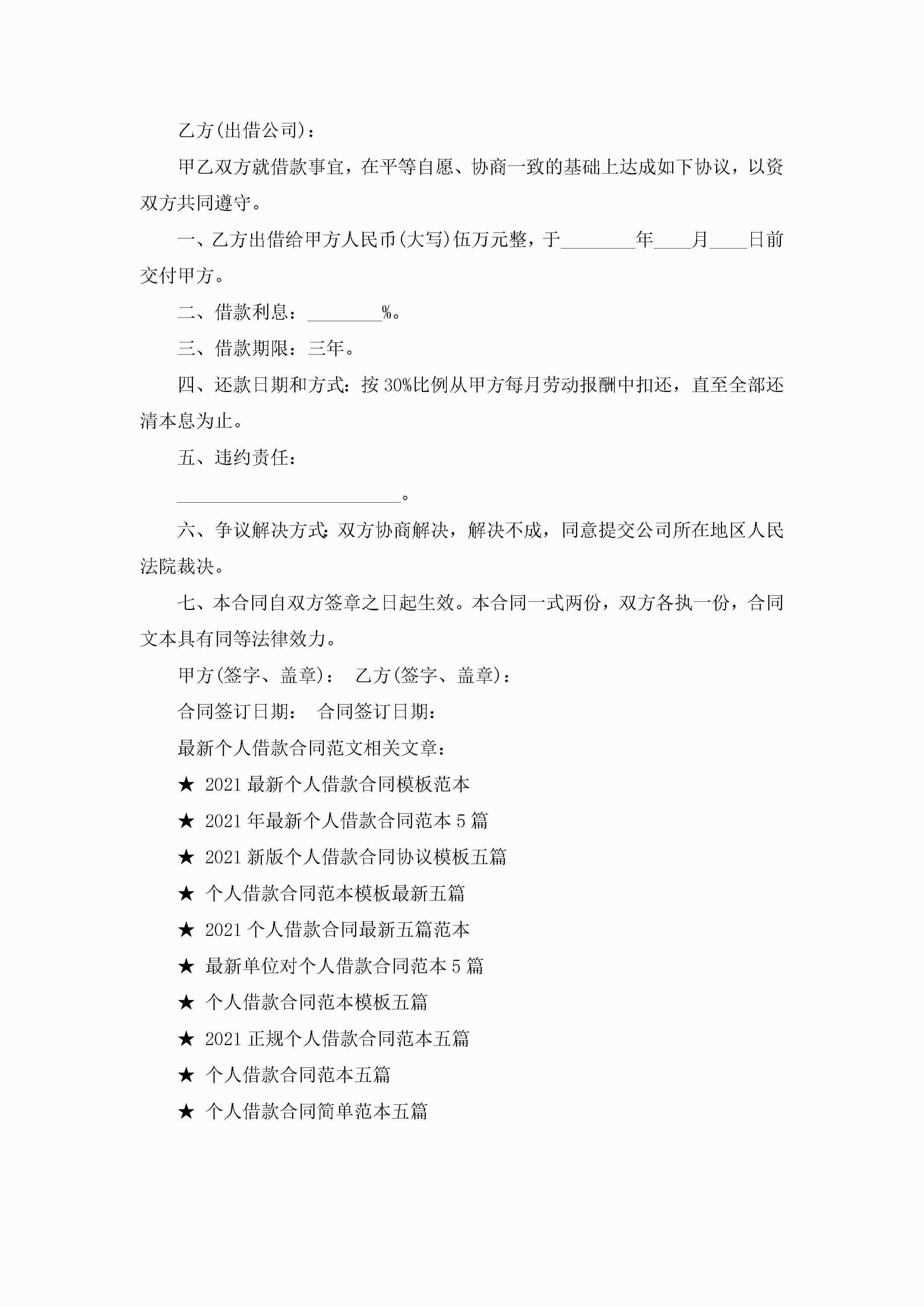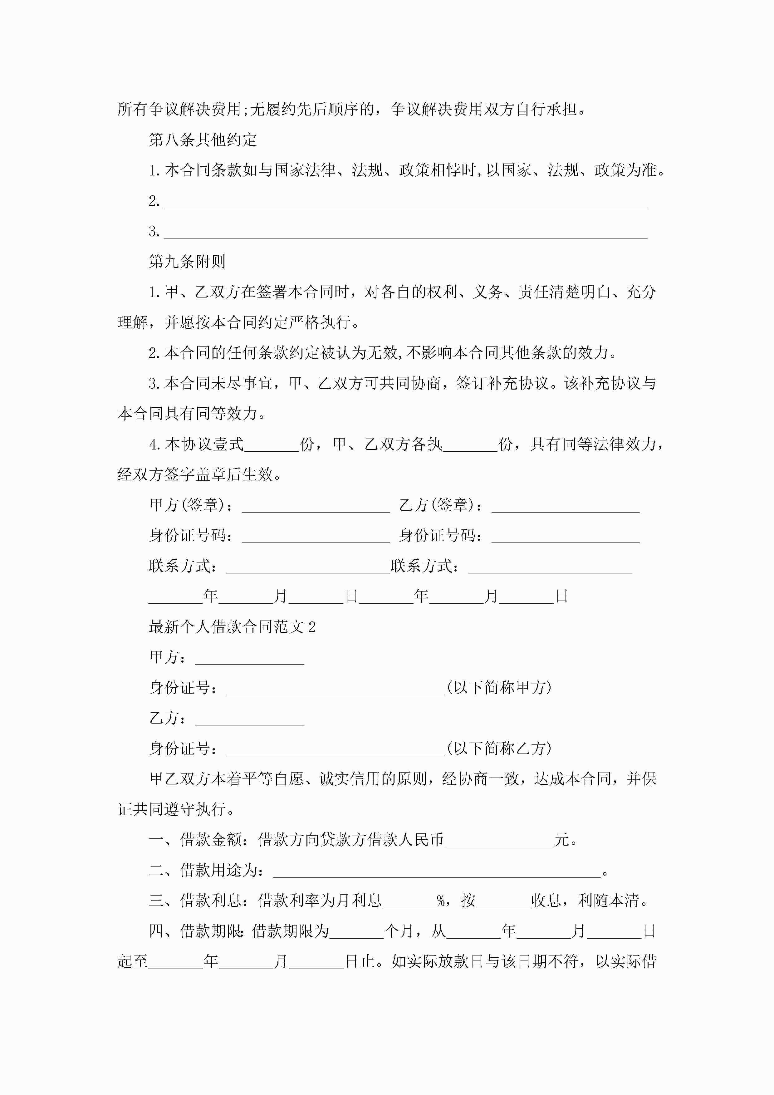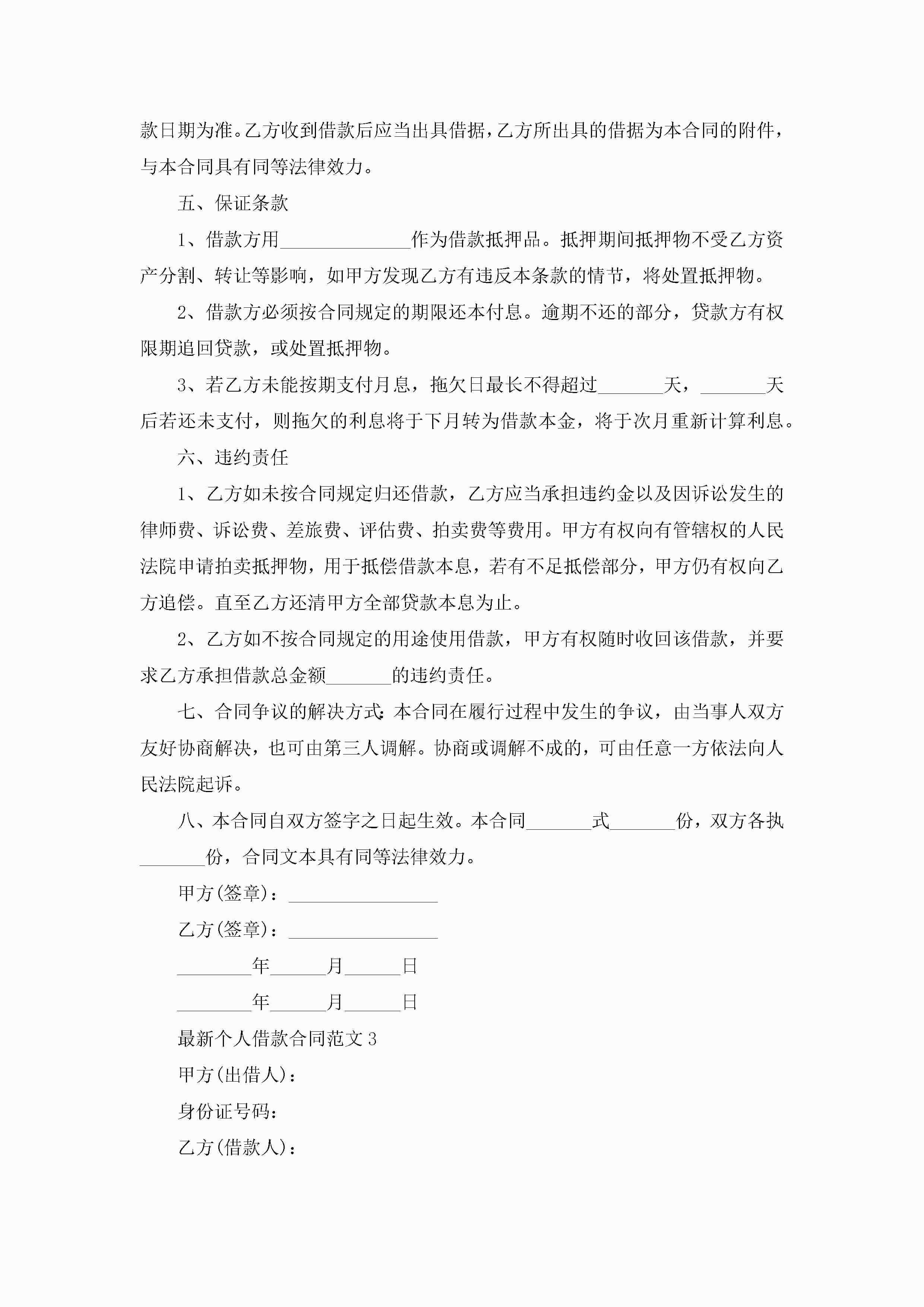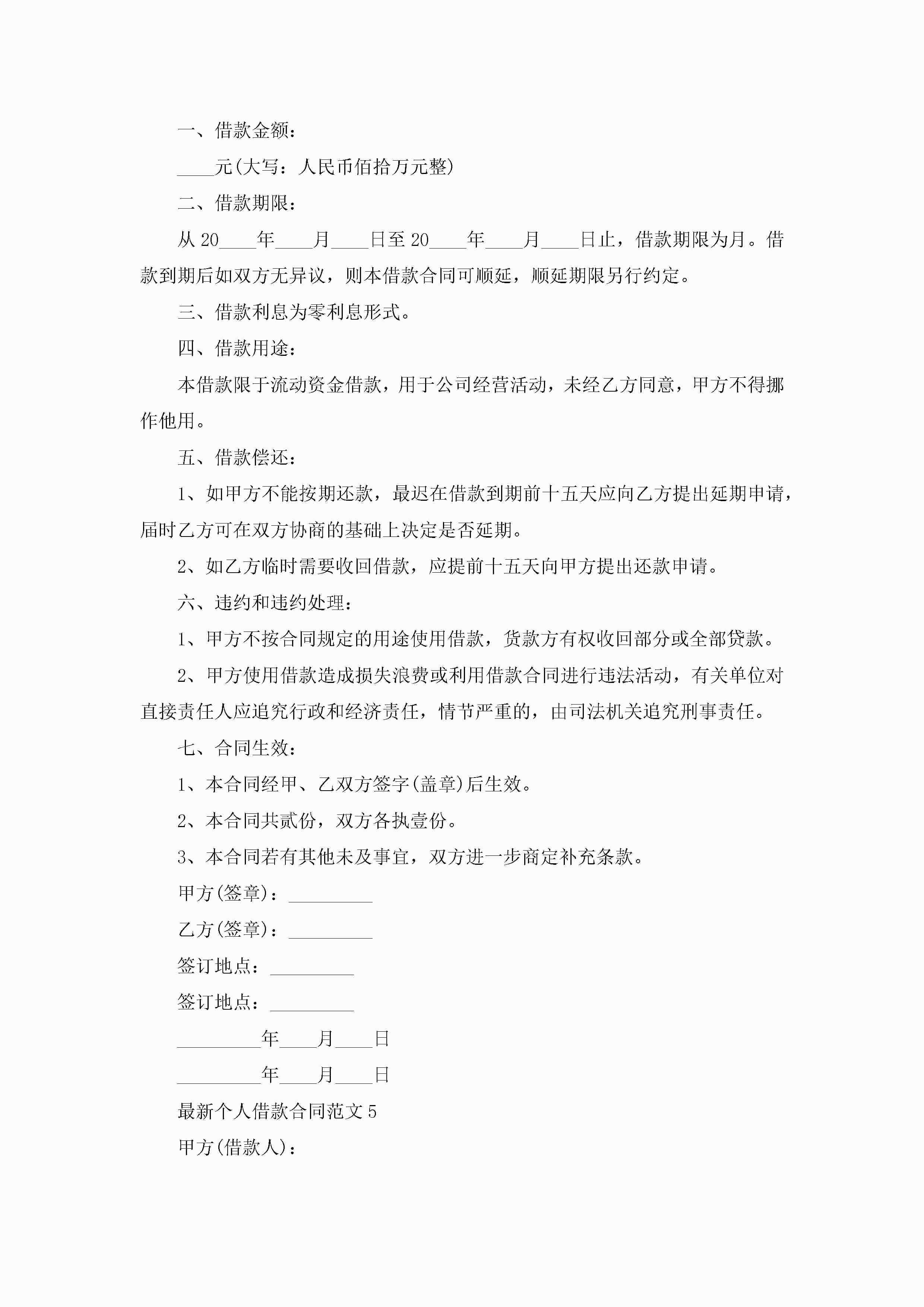 最新个人借款合同范文5篇jugei3月23日 01:41发布关注197 最新个人借款合同范文5篇此内容为付费资源,请付费后查看¥10.9 单篇文档限时特惠¥15个人会员开通企业会员开通立即下载无需登陆!可直接快捷下载单个模板付费资源© 版权声明THE ENDWord模板# 实用文档# 实用模板# 合同模板# 借款合同 如有问题,可点击最底部“联系我们”联系客服 分享QQ空间微博QQ好友海报分享复制链接收藏