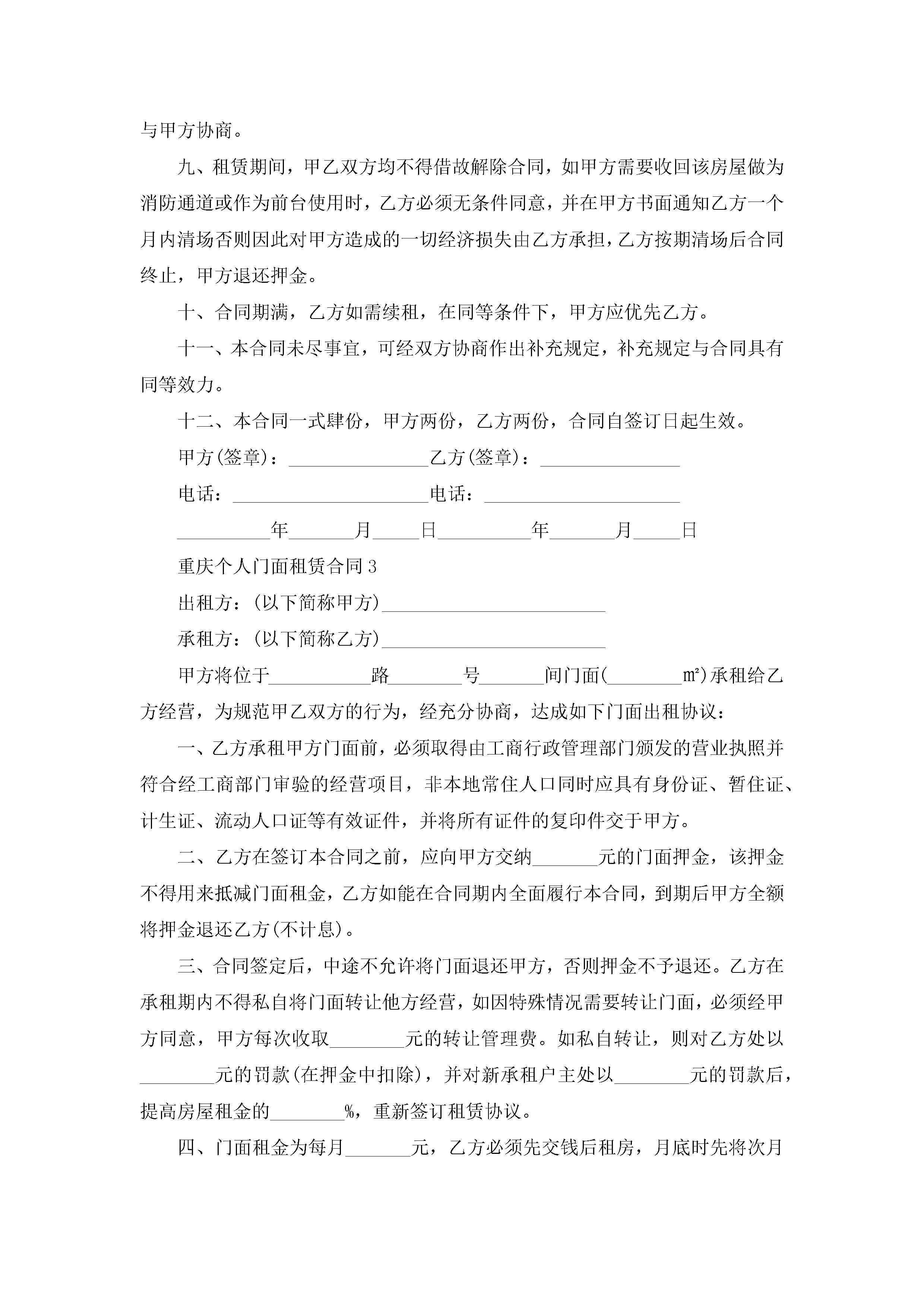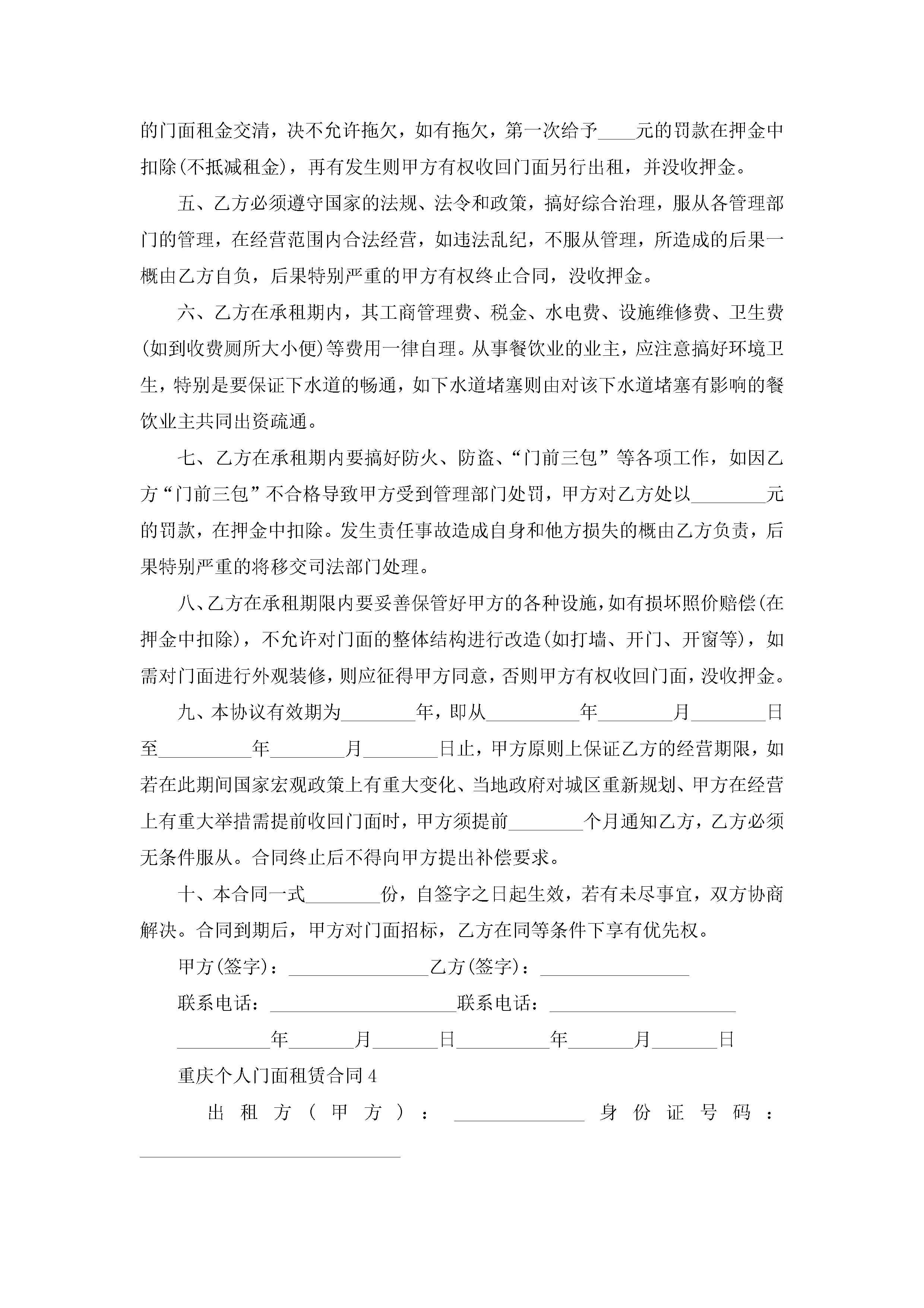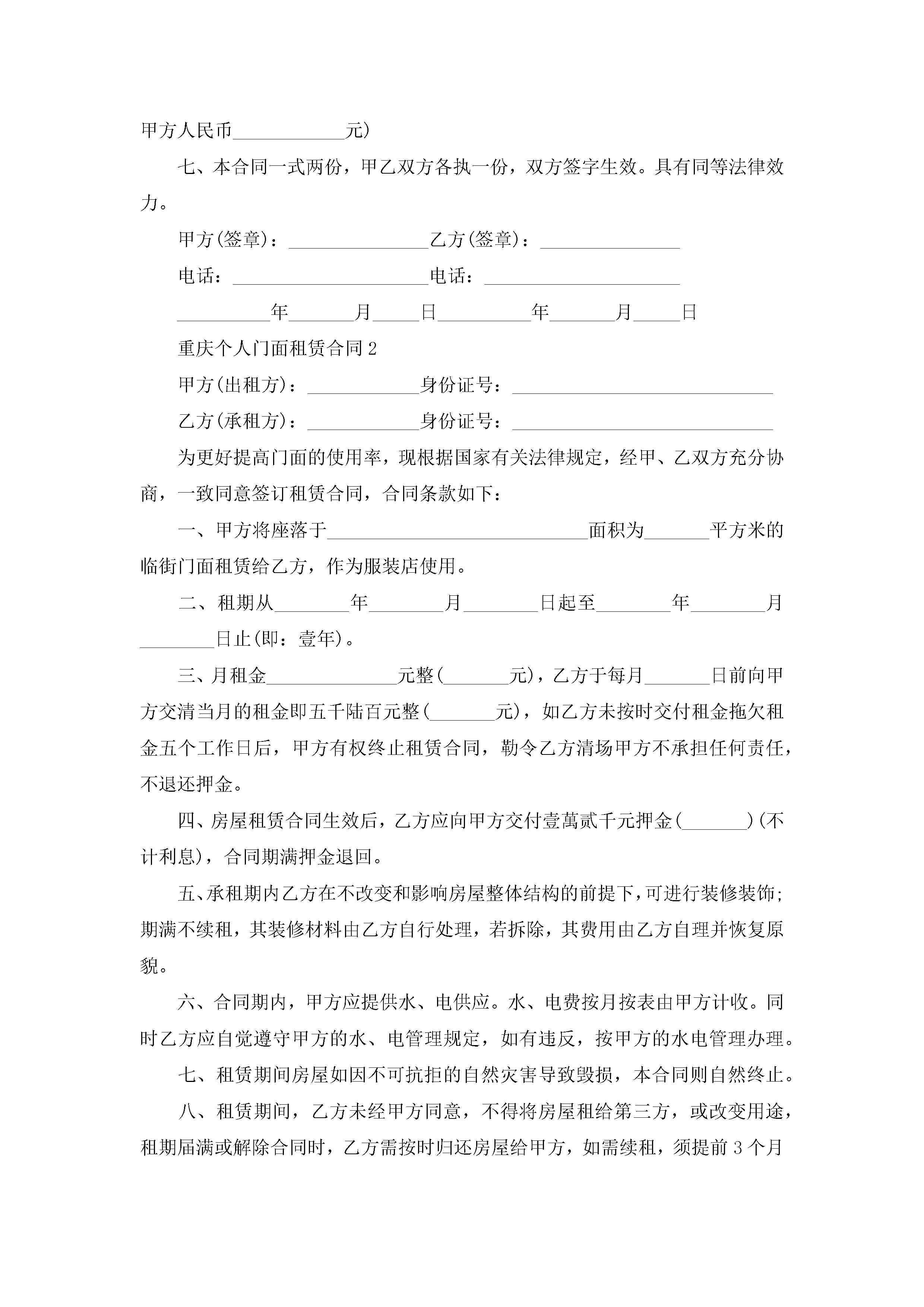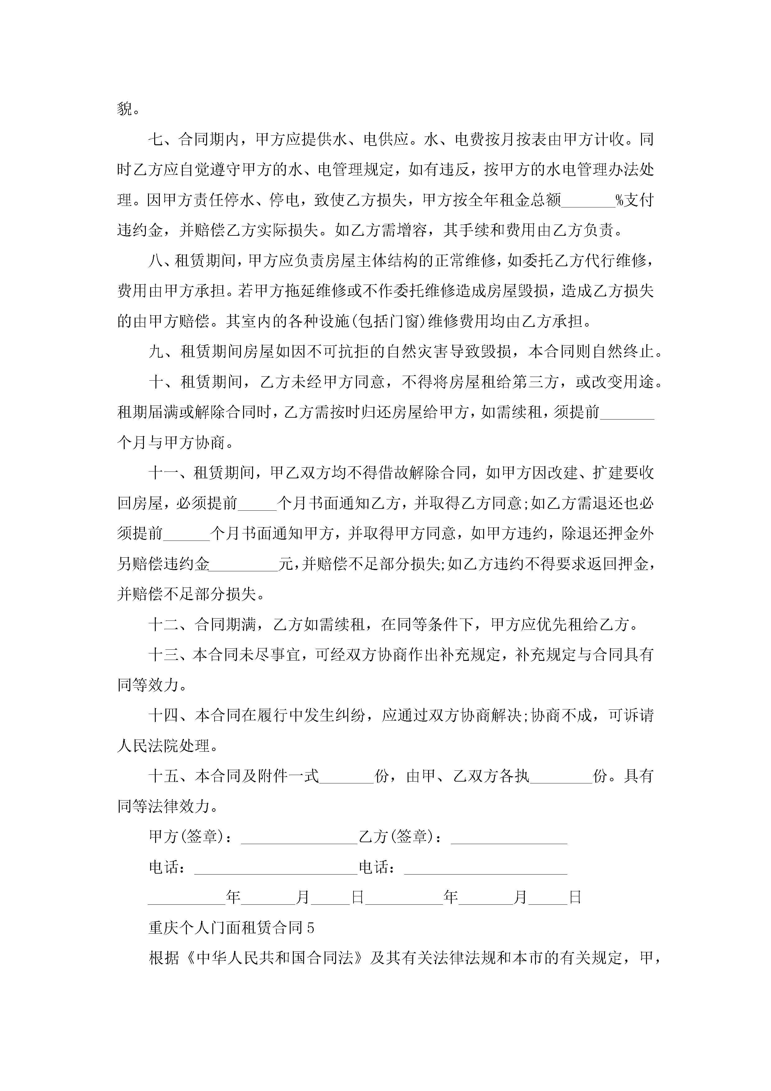重庆个人门面租赁合同5篇jugei3月23日 01:41发布关注250 重庆个人门面租赁合同5篇此内容为付费资源,请付费后查看¥10.9 单篇文档限时特惠¥15个人会员开通企业会员开通立即下载无需登陆!可直接快捷下载单个模板付费资源© 版权声明THE ENDWord模板# 实用文档# 实用模板# 合同模板# 租赁合同 如有问题,可点击最底部“联系我们”联系客服 分享QQ空间微博QQ好友海报分享复制链接收藏