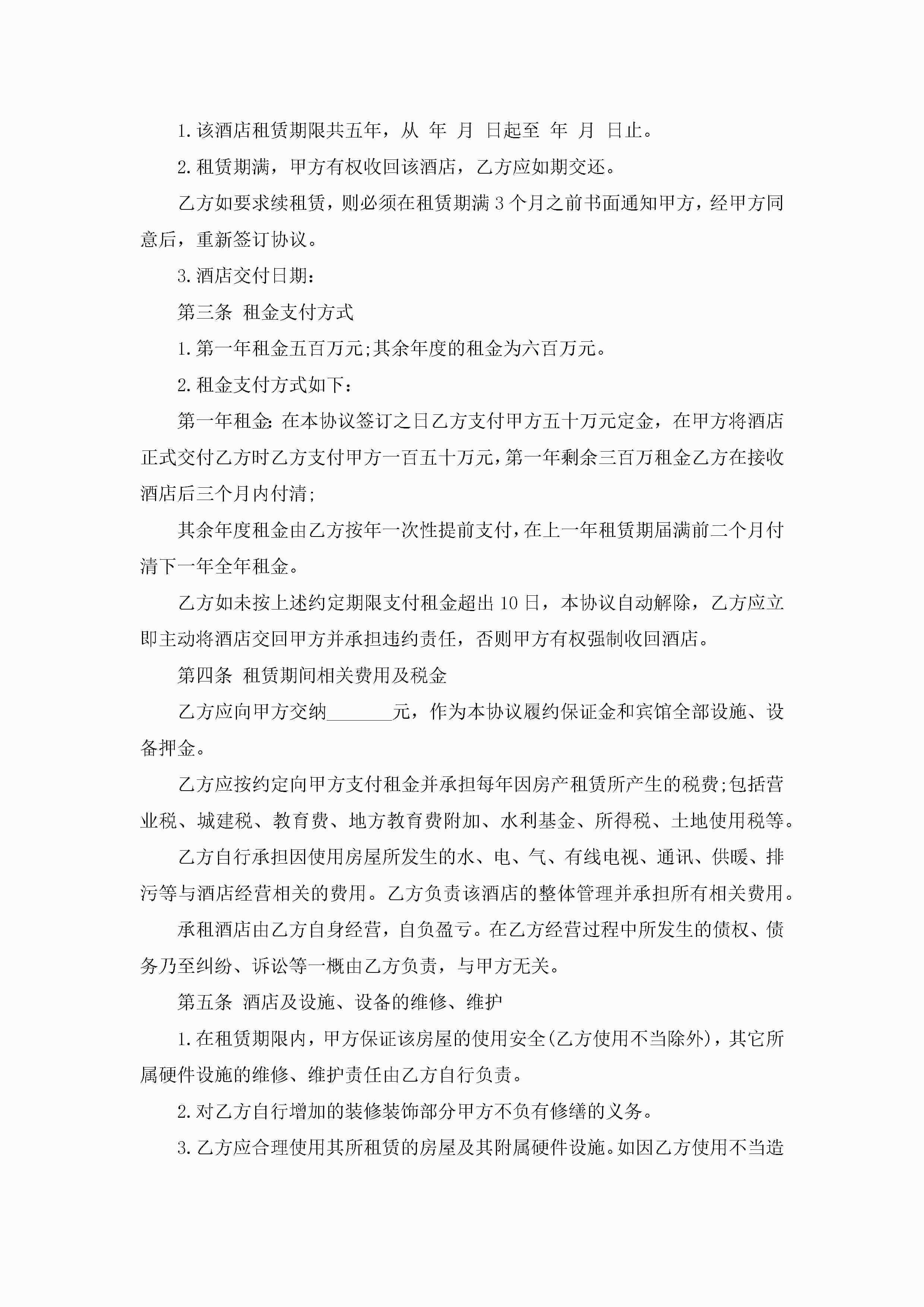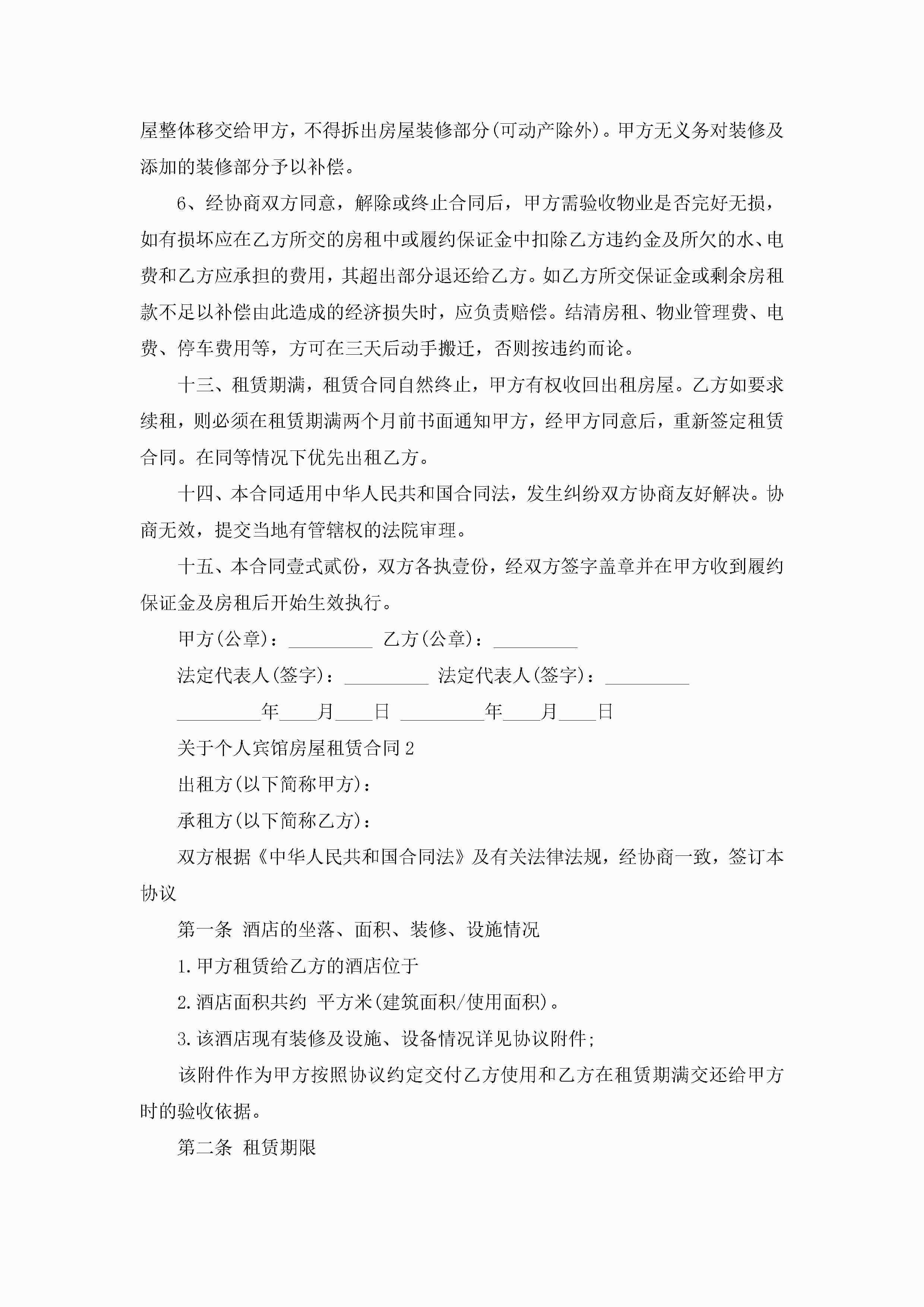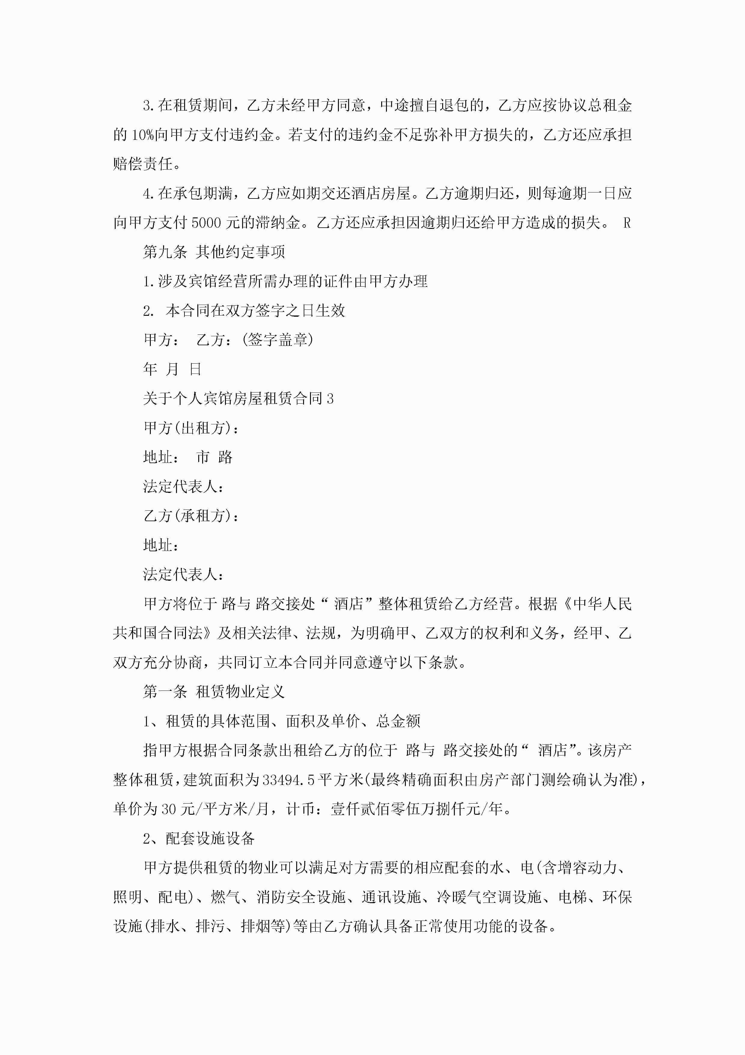 关于个人宾馆房屋租赁合同5篇jugei3月23日 01:41发布关注184 关于个人宾馆房屋租赁合同5篇此内容为付费资源,请付费后查看¥10.9 单篇文档限时特惠¥15个人会员开通企业会员开通立即下载无需登陆!可直接快捷下载单个模板付费资源© 版权声明THE ENDWord模板# 实用文档# 实用模板# 合同模板# 租赁合同 如有问题,可点击最底部“联系我们”联系客服 分享QQ空间微博QQ好友海报分享复制链接收藏
