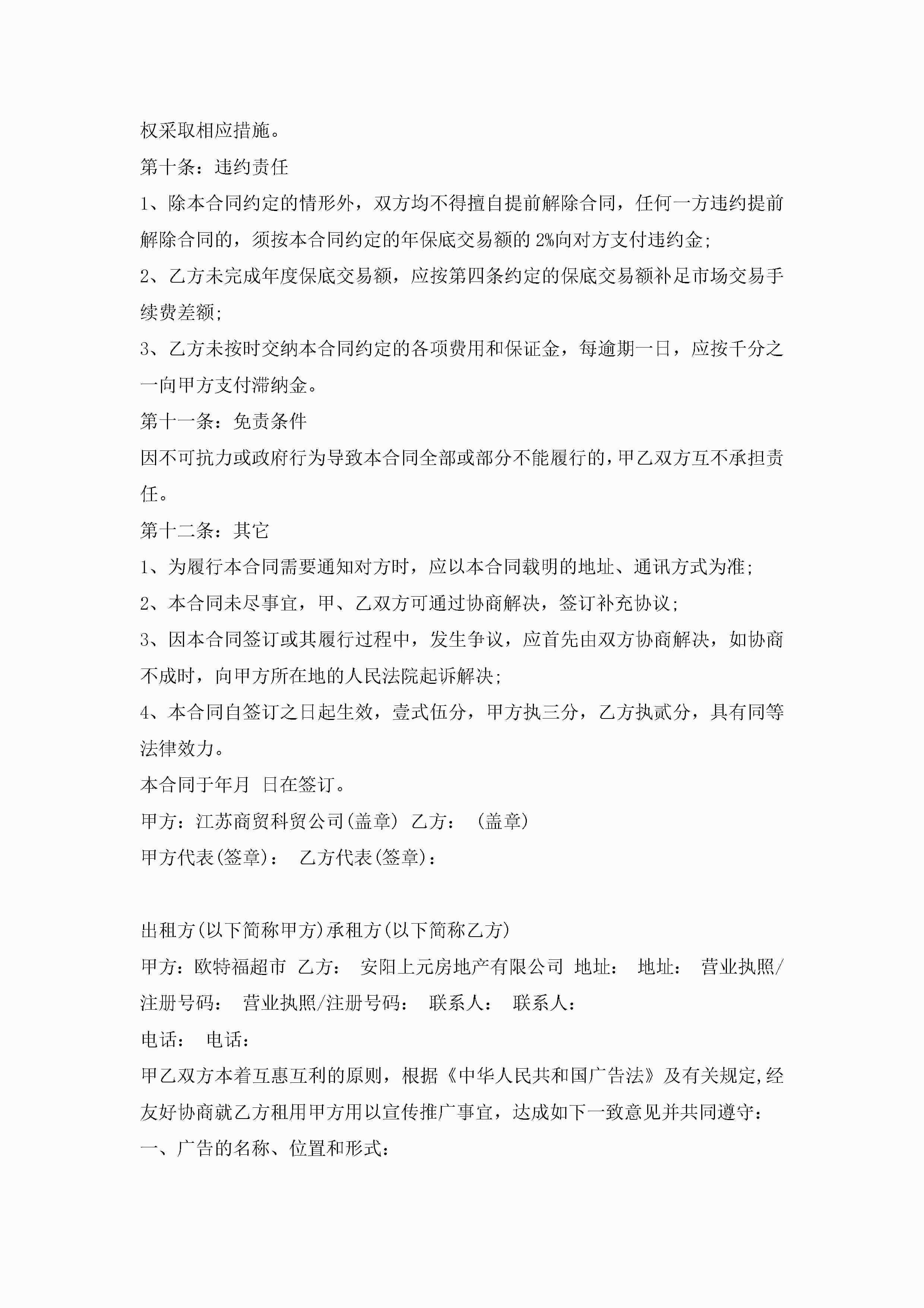 超市店铺租赁合同范文5篇jugei3月23日 01:41发布关注188 超市店铺租赁合同范文5篇此内容为付费资源,请付费后查看¥10.9 单篇文档限时特惠¥15个人会员开通企业会员开通立即下载无需登陆!可直接快捷下载单个模板付费资源© 版权声明THE ENDWord模板# 实用文档# 实用模板# 合同模板# 租赁合同 如有问题,可点击最底部“联系我们”联系客服 分享QQ空间微博QQ好友海报分享复制链接收藏