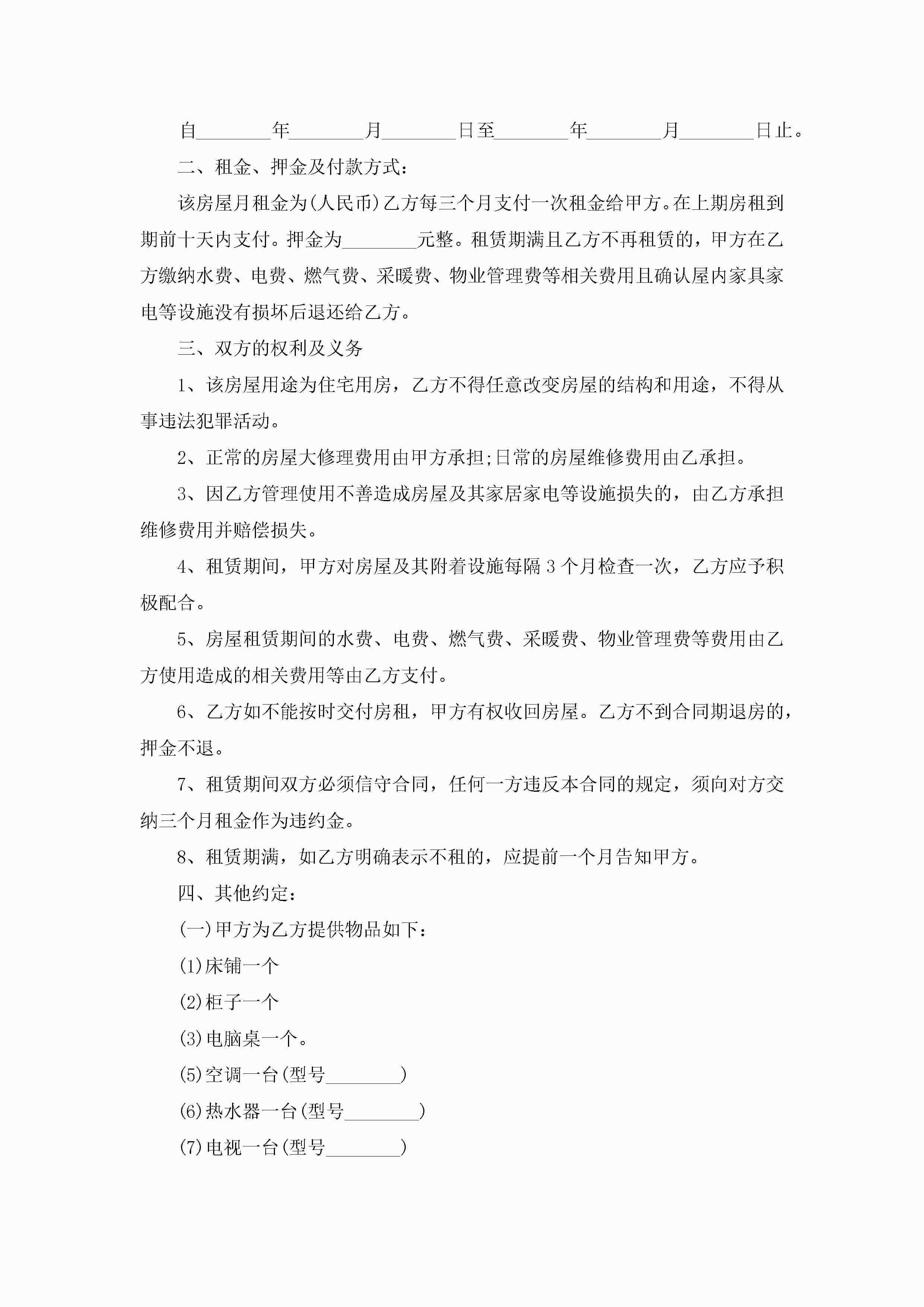 2022年房屋租赁合同范本通用jugei3月23日 01:41发布关注230 2022年房屋租赁合同范本通用此内容为付费资源,请付费后查看¥10.9 单篇文档限时特惠¥15个人会员开通企业会员开通立即下载无需登陆!可直接快捷下载单个模板付费资源© 版权声明THE ENDWord模板# 实用文档# 实用模板# 合同模板# 租赁合同 如有问题,可点击最底部“联系我们”联系客服 分享QQ空间微博QQ好友海报分享复制链接收藏
