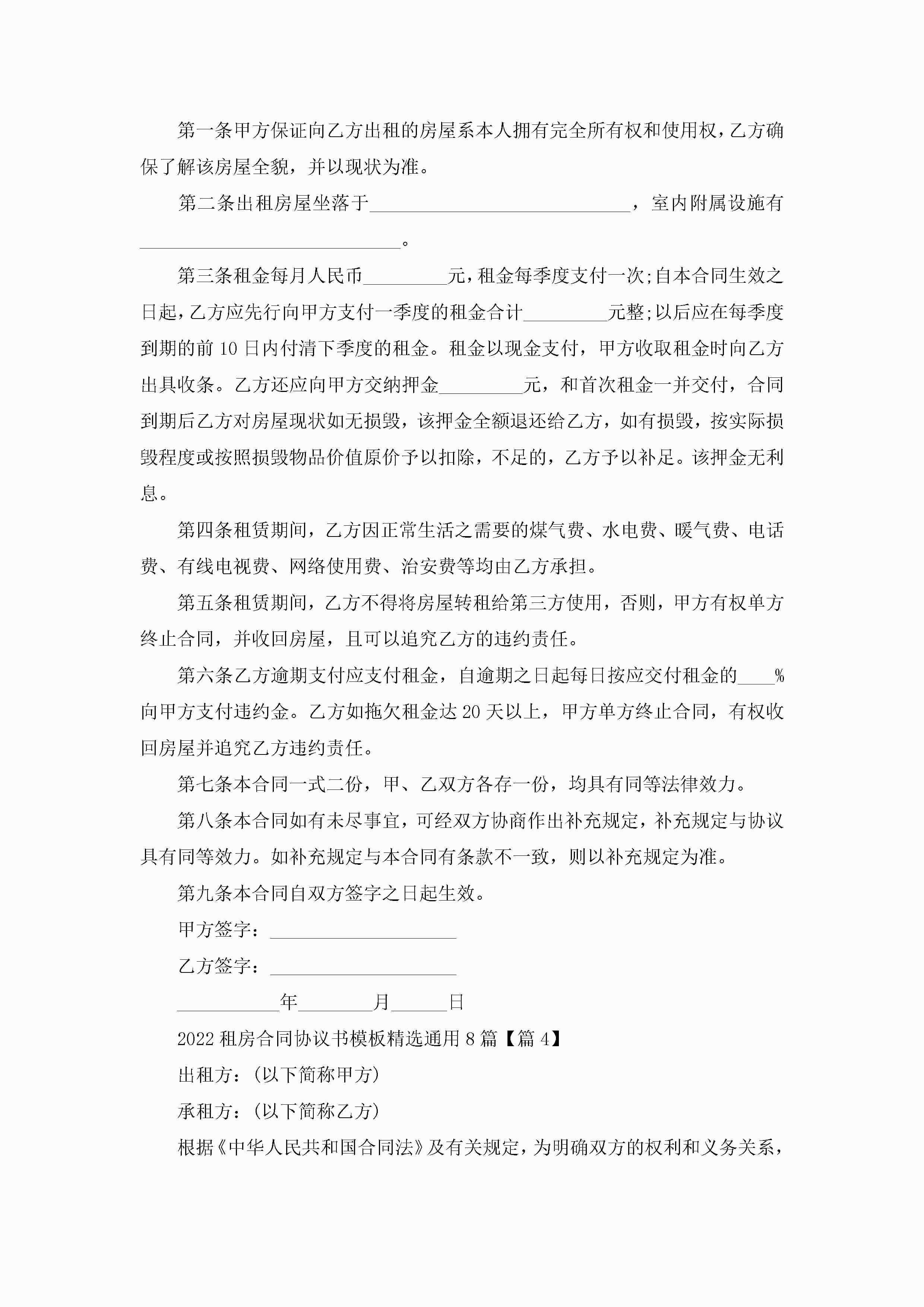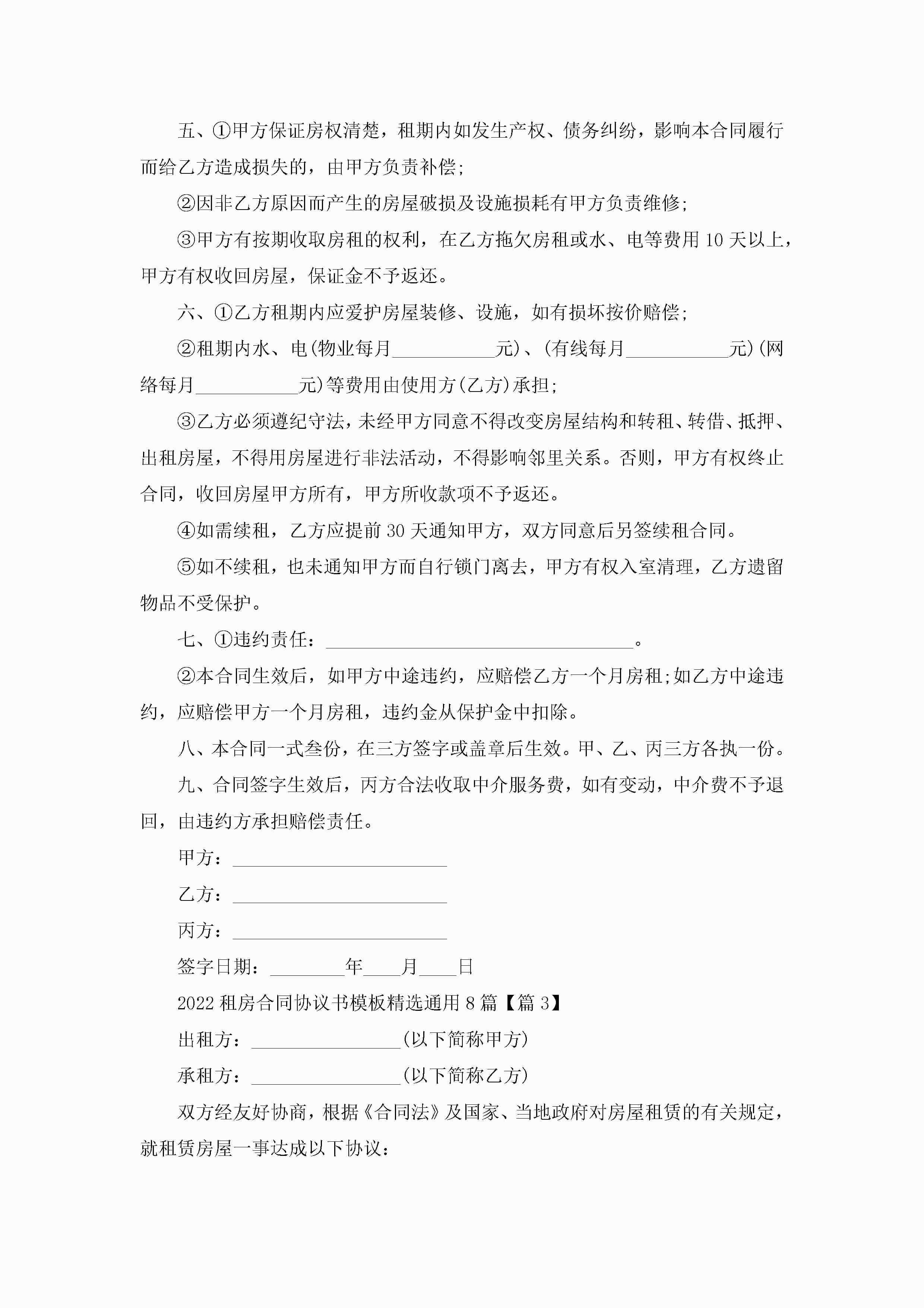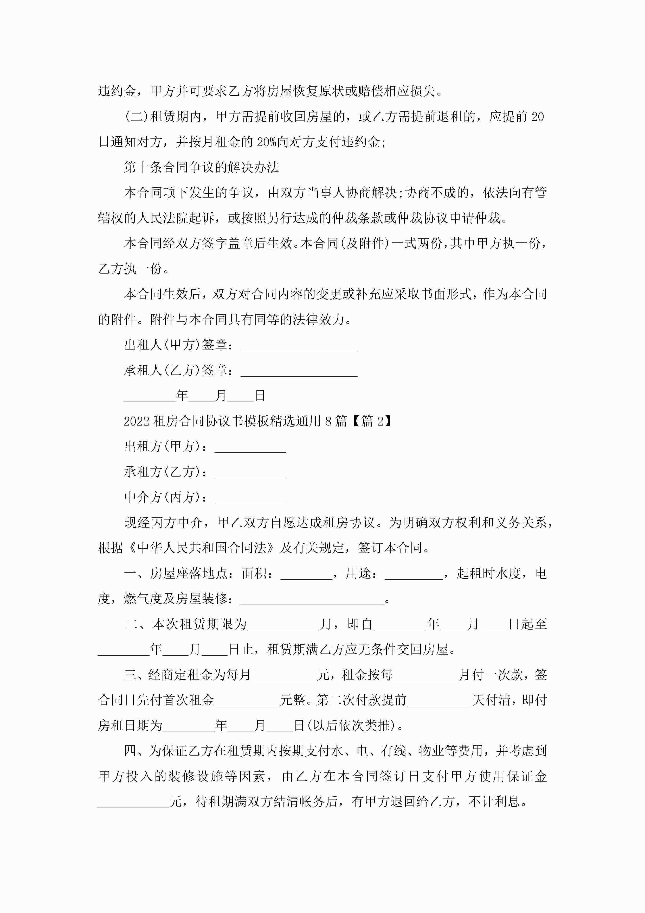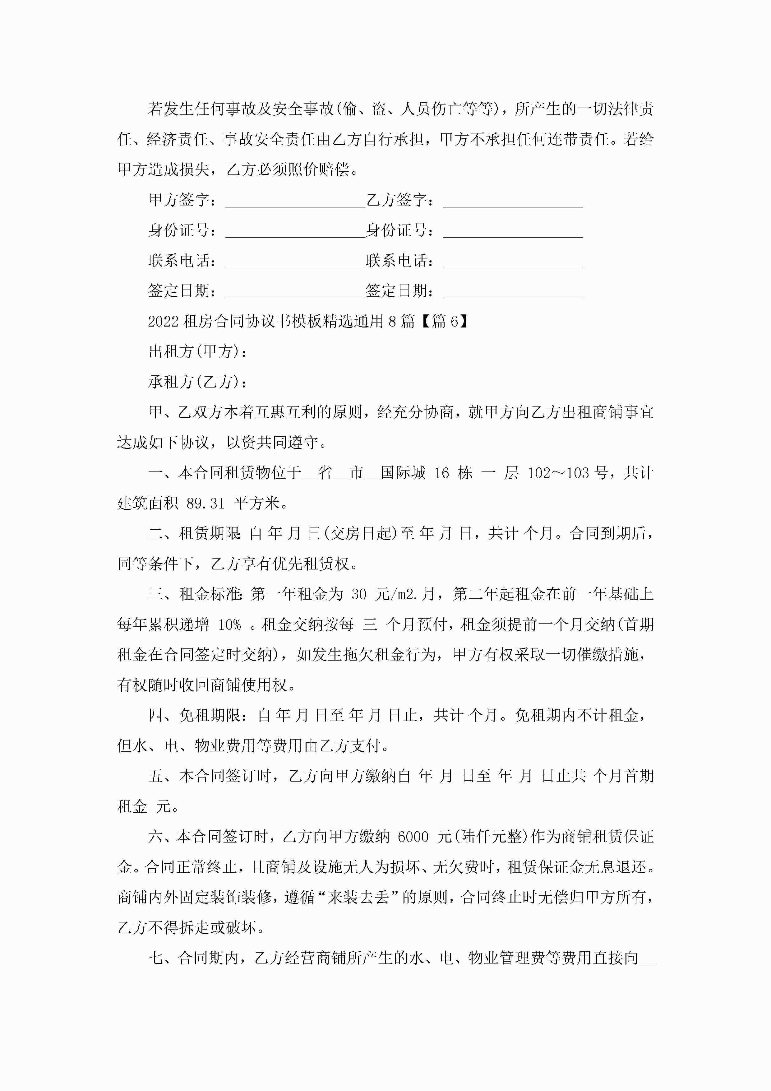 2022租房合同协议书模板精选通用8篇jugei3月23日 01:41发布关注189 2022租房合同协议书模板精选通用8篇此内容为付费资源,请付费后查看¥10.9 单篇文档限时特惠¥15个人会员开通企业会员开通立即下载无需登陆!可直接快捷下载单个模板付费资源© 版权声明THE ENDWord模板# 实用文档# 实用模板# 合同模板# 租赁合同 如有问题,可点击最底部“联系我们”联系客服 分享QQ空间微博QQ好友海报分享复制链接收藏