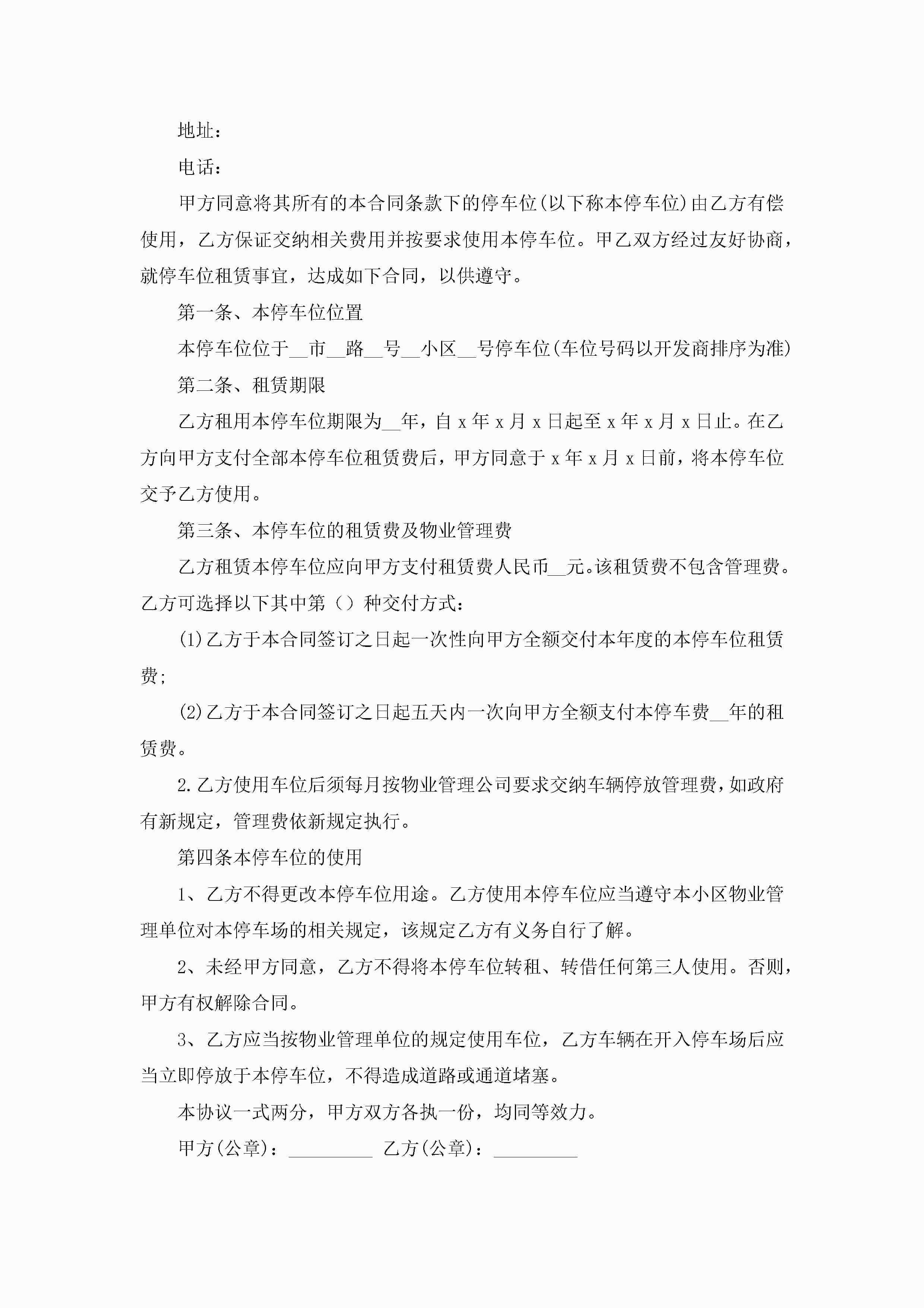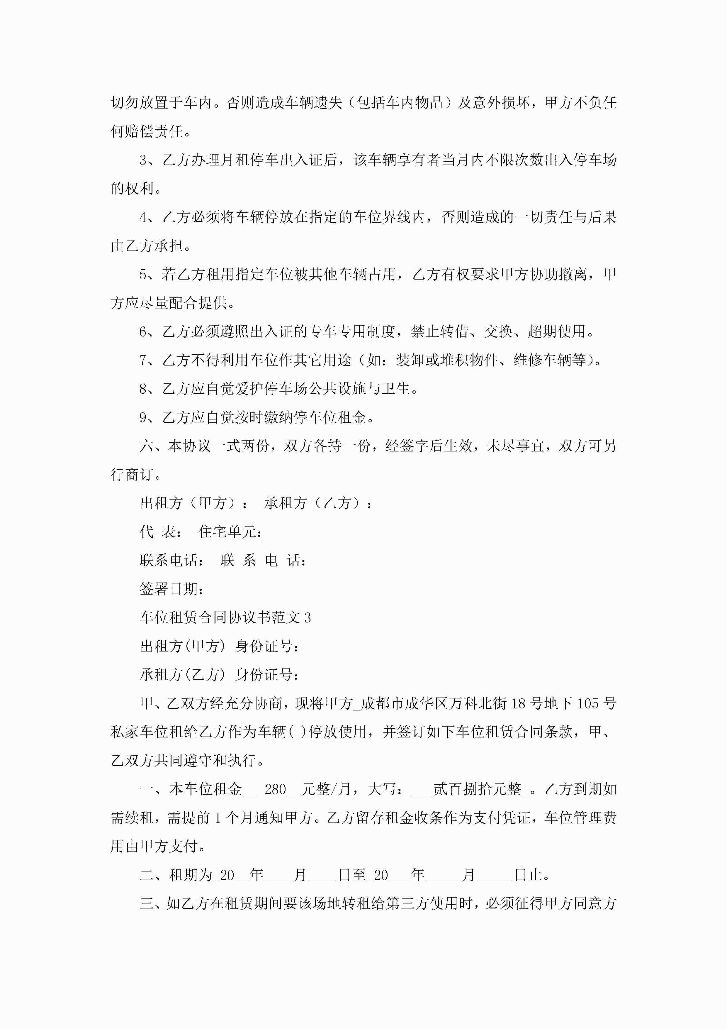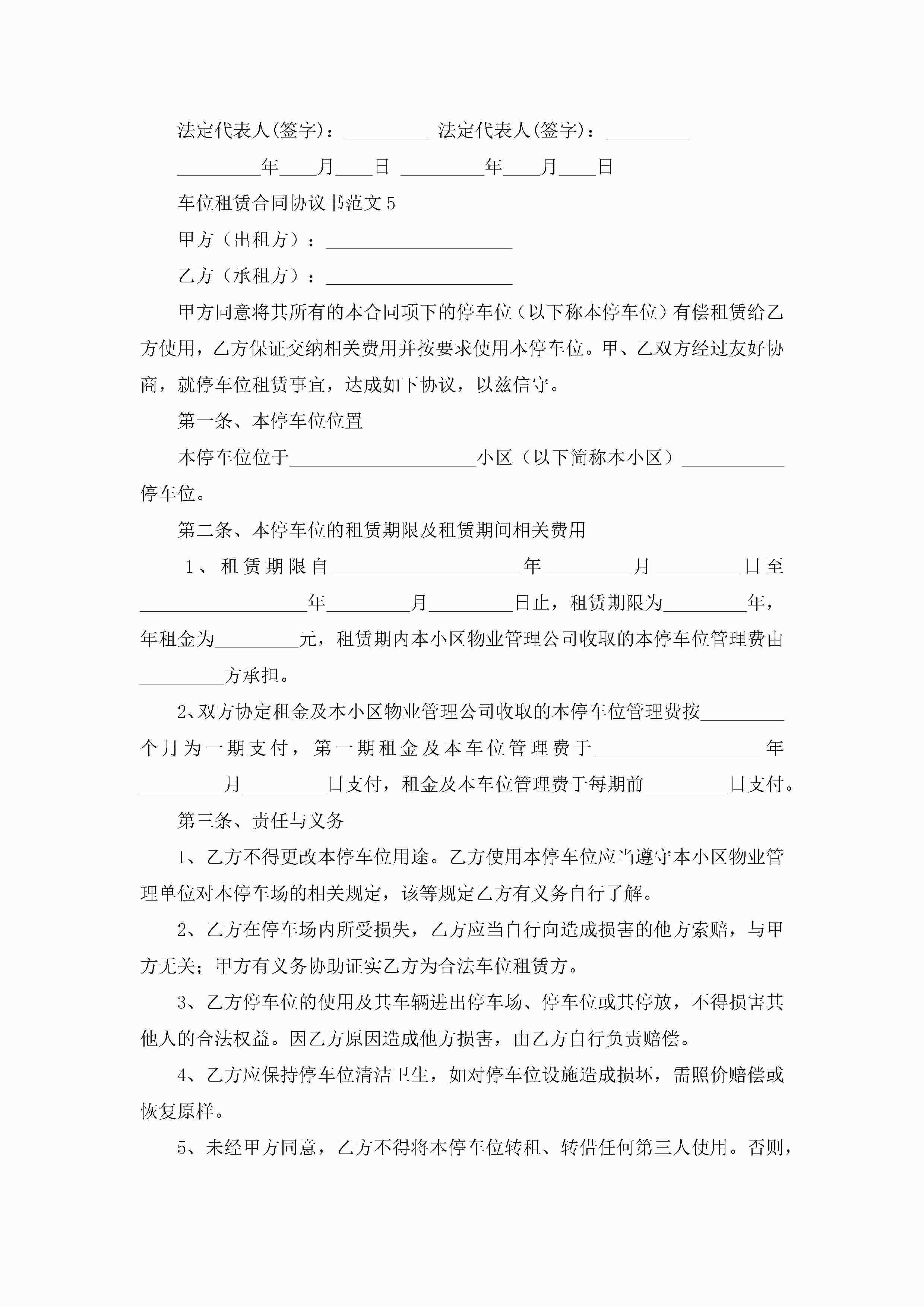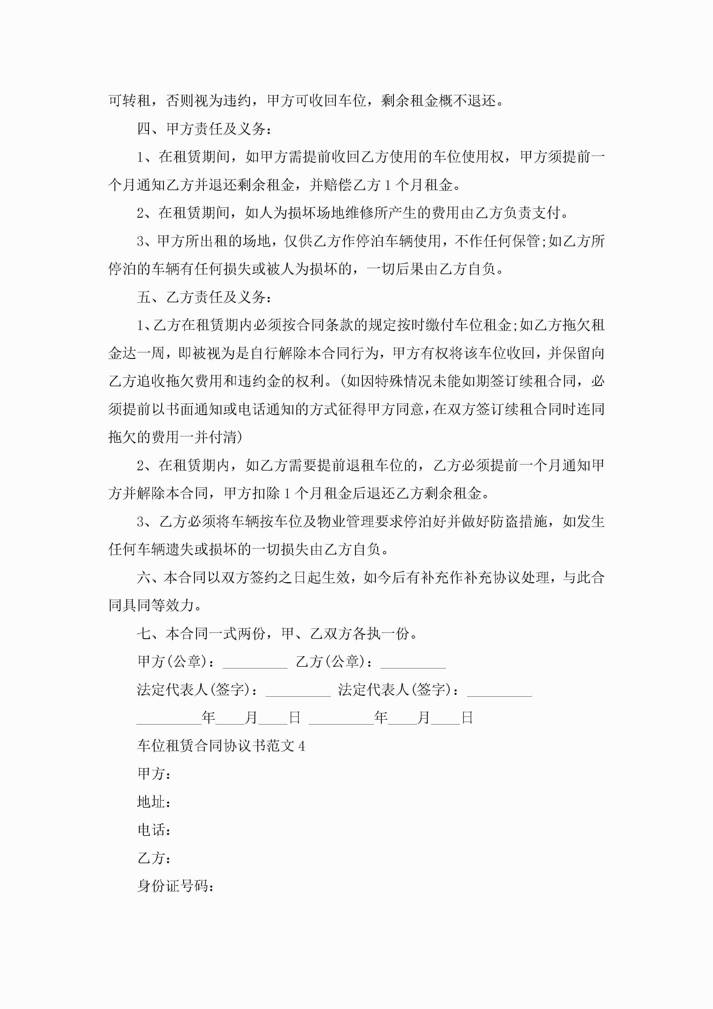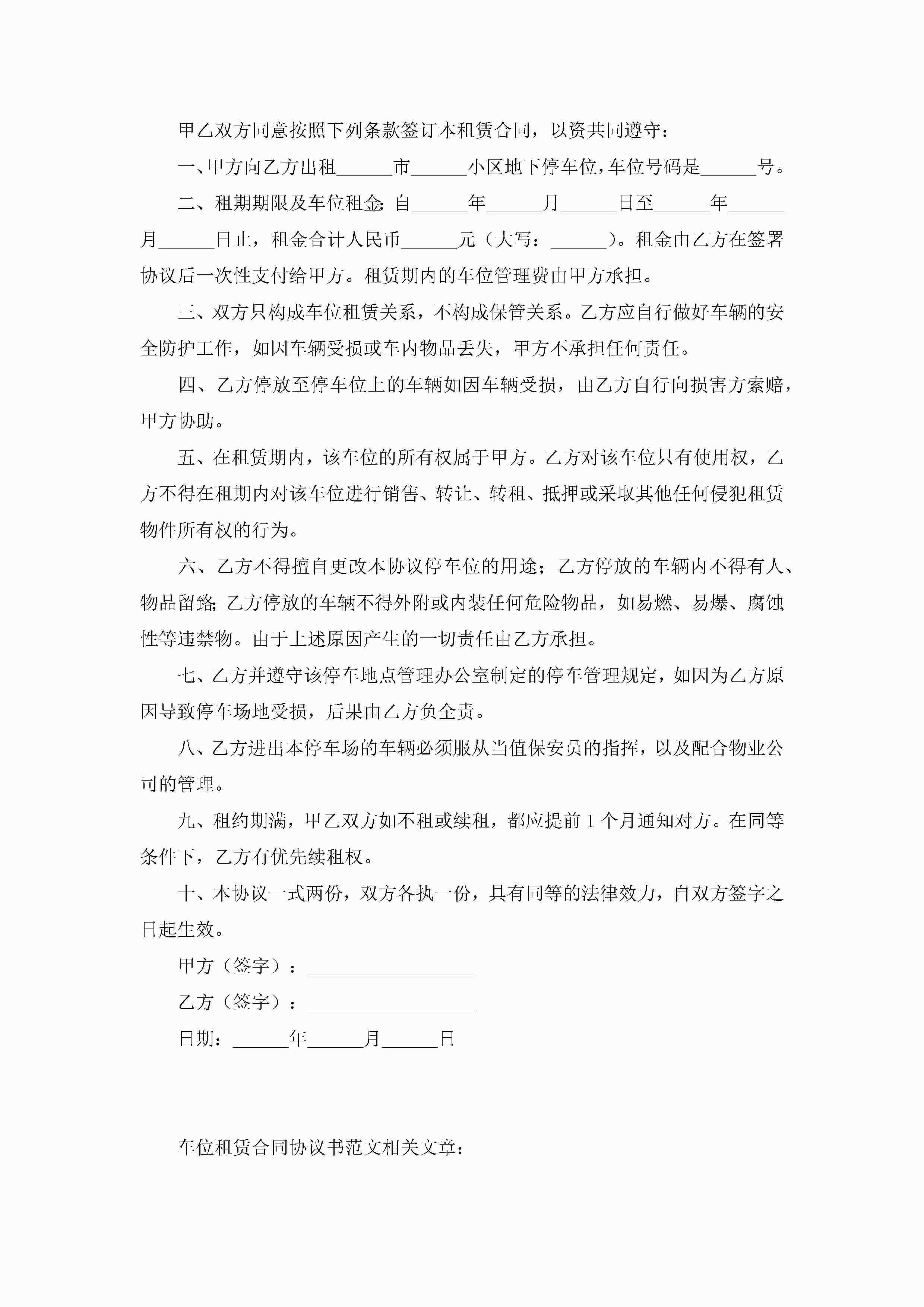 车位租赁合同协议书范文6篇jugei3月23日 01:41发布关注188 车位租赁合同协议书范文6篇此内容为付费资源,请付费后查看¥10.9 单篇文档限时特惠¥15个人会员开通企业会员开通立即下载无需登陆!可直接快捷下载单个模板付费资源© 版权声明THE ENDWord模板# 实用文档# 实用模板# 合同模板# 租赁合同 如有问题,可点击最底部“联系我们”联系客服 分享QQ空间微博QQ好友海报分享复制链接收藏