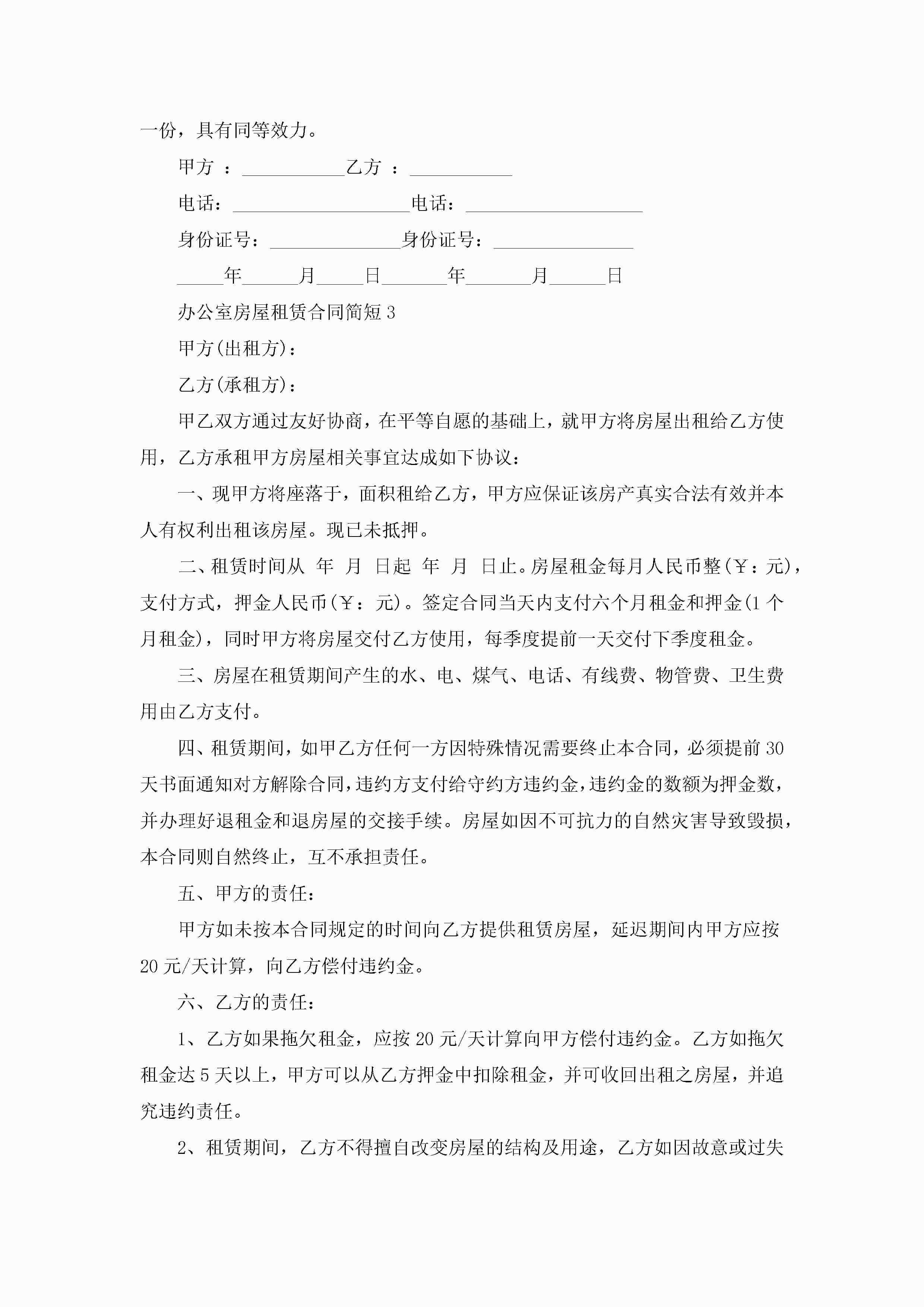 办公室房屋租赁合同简短模板jugei3月23日 01:41发布关注337 办公室房屋租赁合同简短模板此内容为付费资源,请付费后查看¥10.9 单篇文档限时特惠¥15个人会员开通企业会员开通立即下载无需登陆!可直接快捷下载单个模板付费资源© 版权声明THE ENDWord模板# 实用文档# 实用模板# 合同模板# 租赁合同 如有问题,可点击最底部“联系我们”联系客服 分享QQ空间微博QQ好友海报分享复制链接收藏