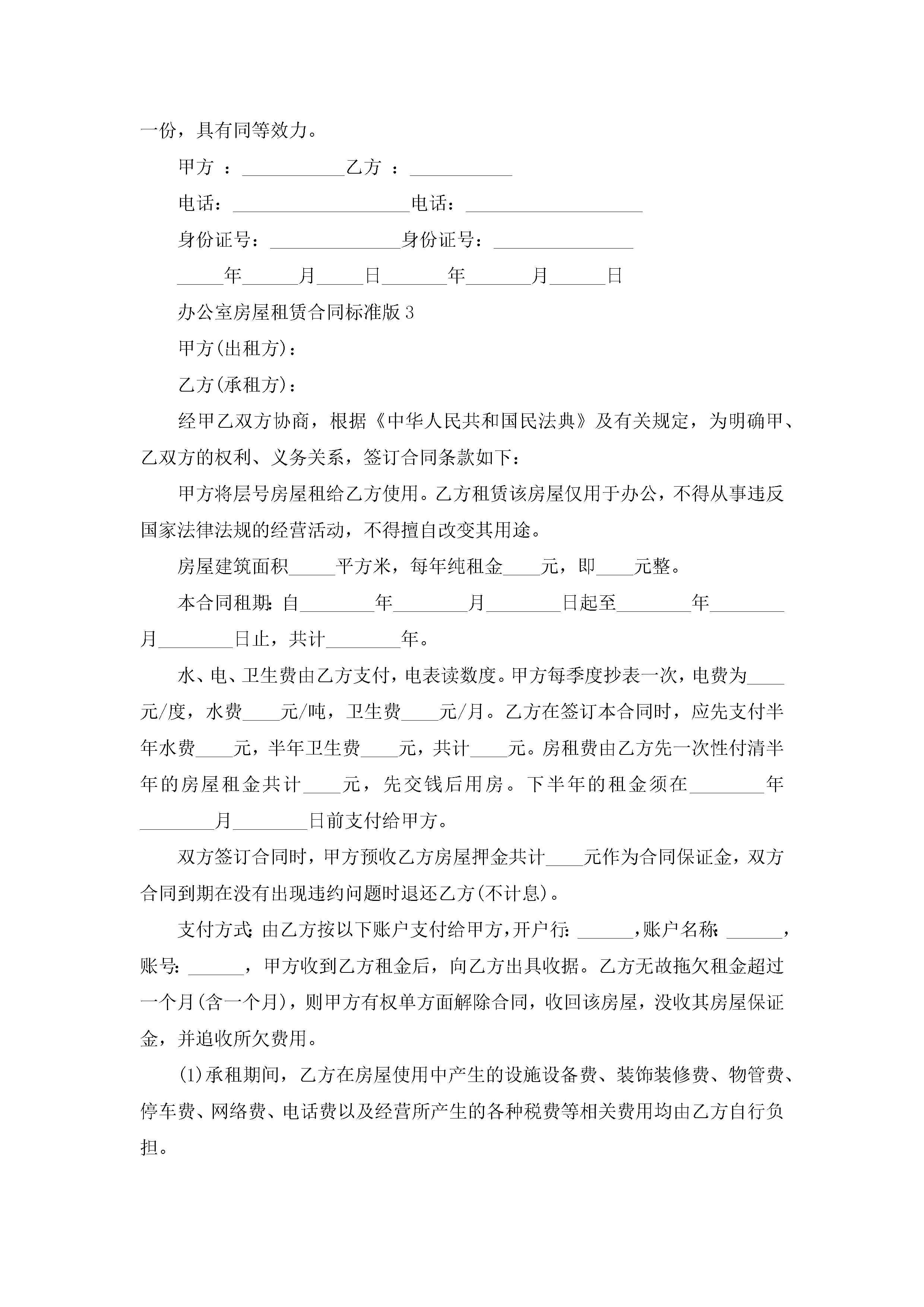 关于办公室房屋租赁合同标准版5篇jugei3月23日 01:41发布关注192 关于办公室房屋租赁合同标准版5篇此内容为付费资源,请付费后查看¥10.9 单篇文档限时特惠¥15个人会员开通企业会员开通立即下载无需登陆!可直接快捷下载单个模板付费资源© 版权声明THE ENDWord模板# 实用文档# 实用模板# 合同模板# 租赁合同 如有问题,可点击最底部“联系我们”联系客服 分享QQ空间微博QQ好友海报分享复制链接收藏