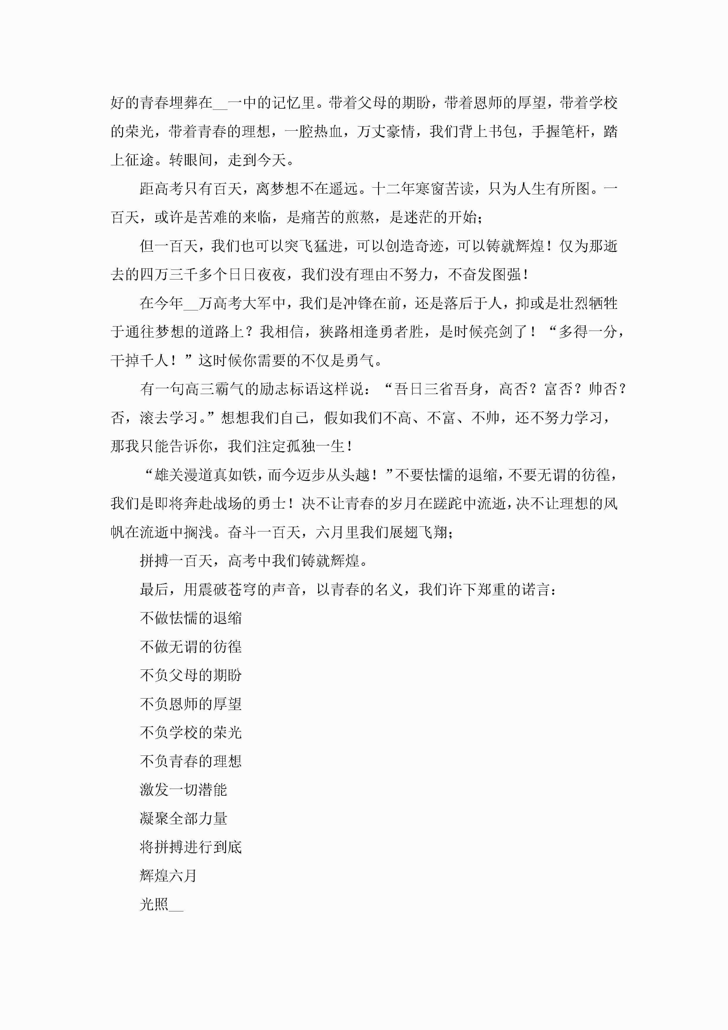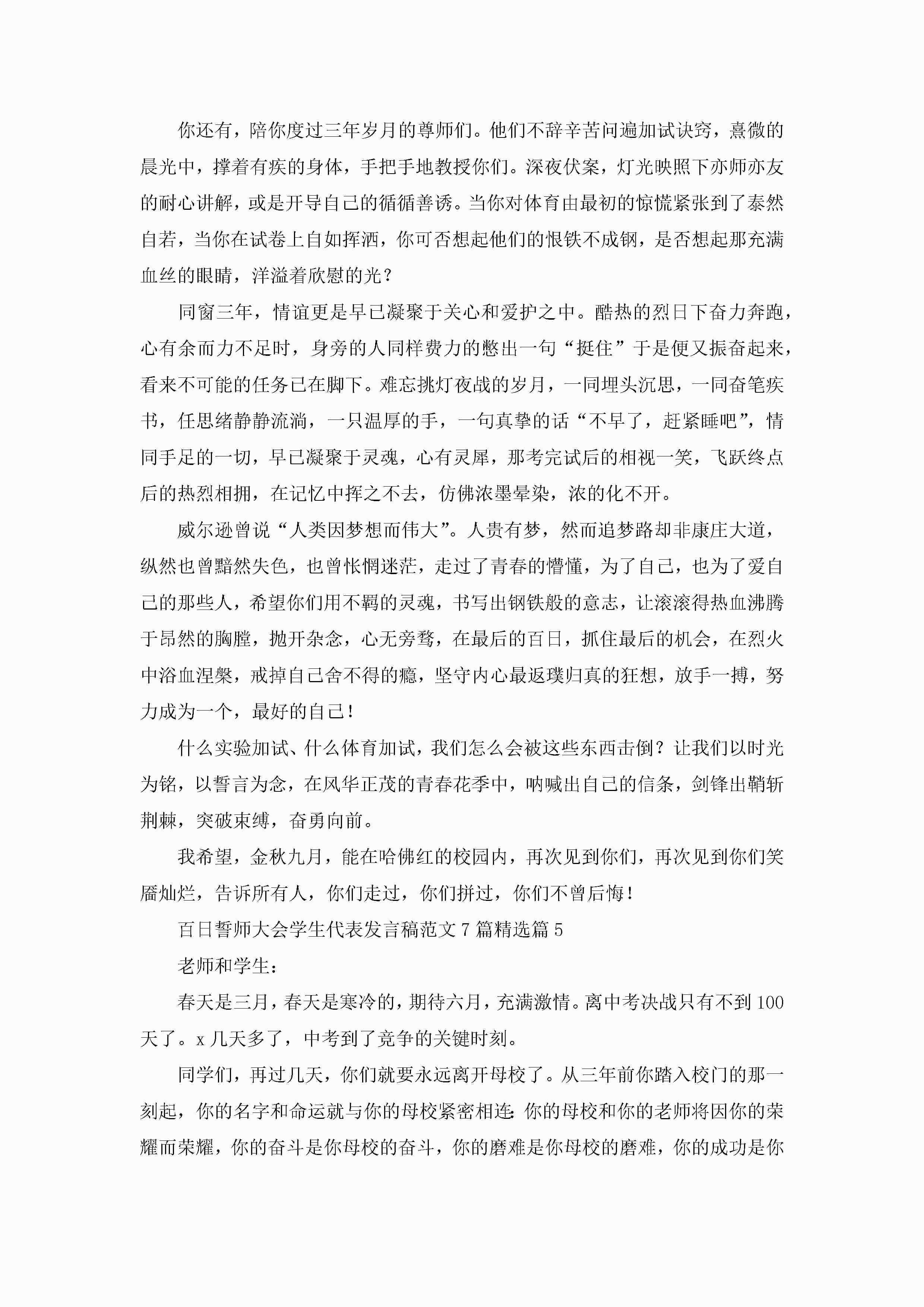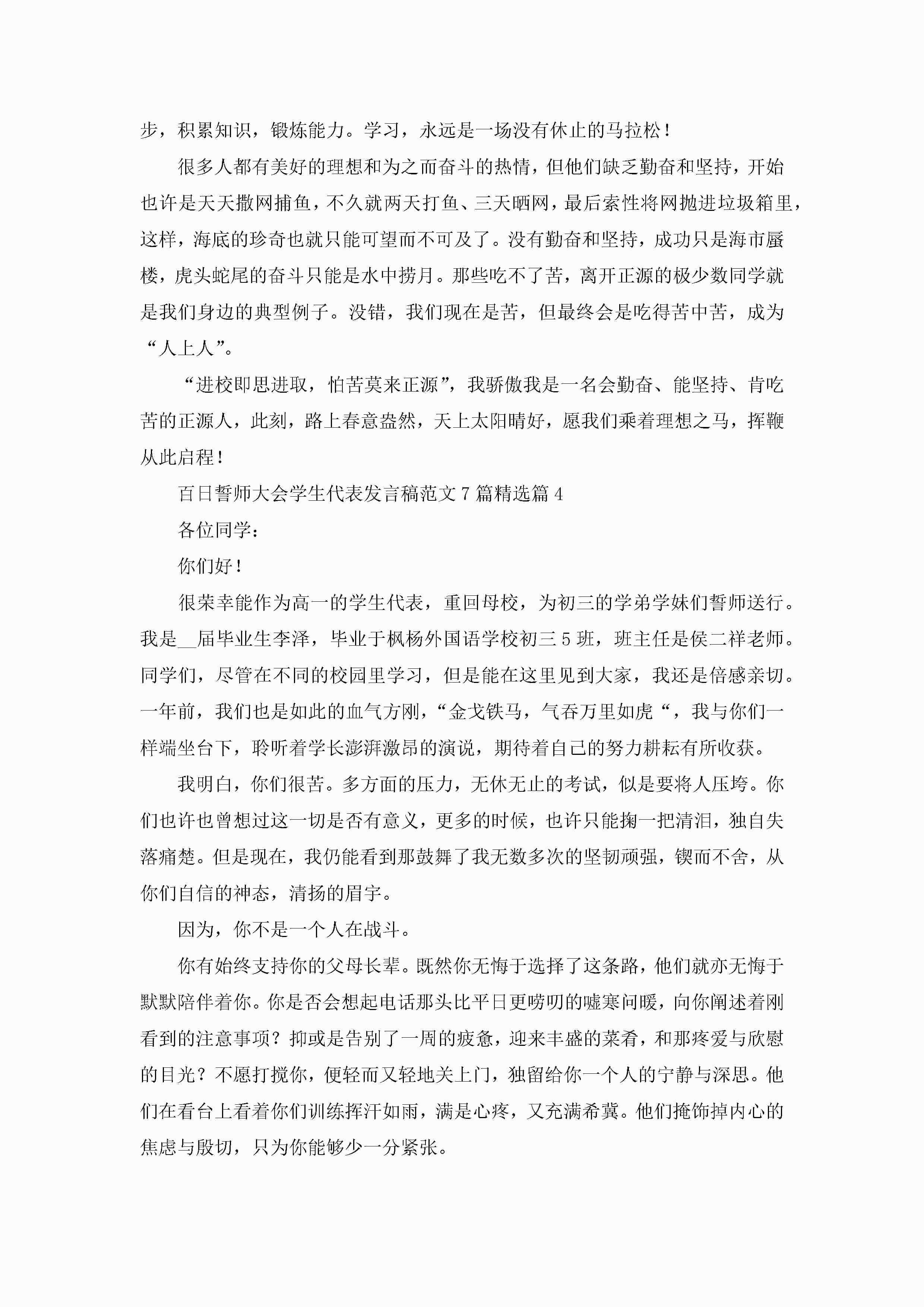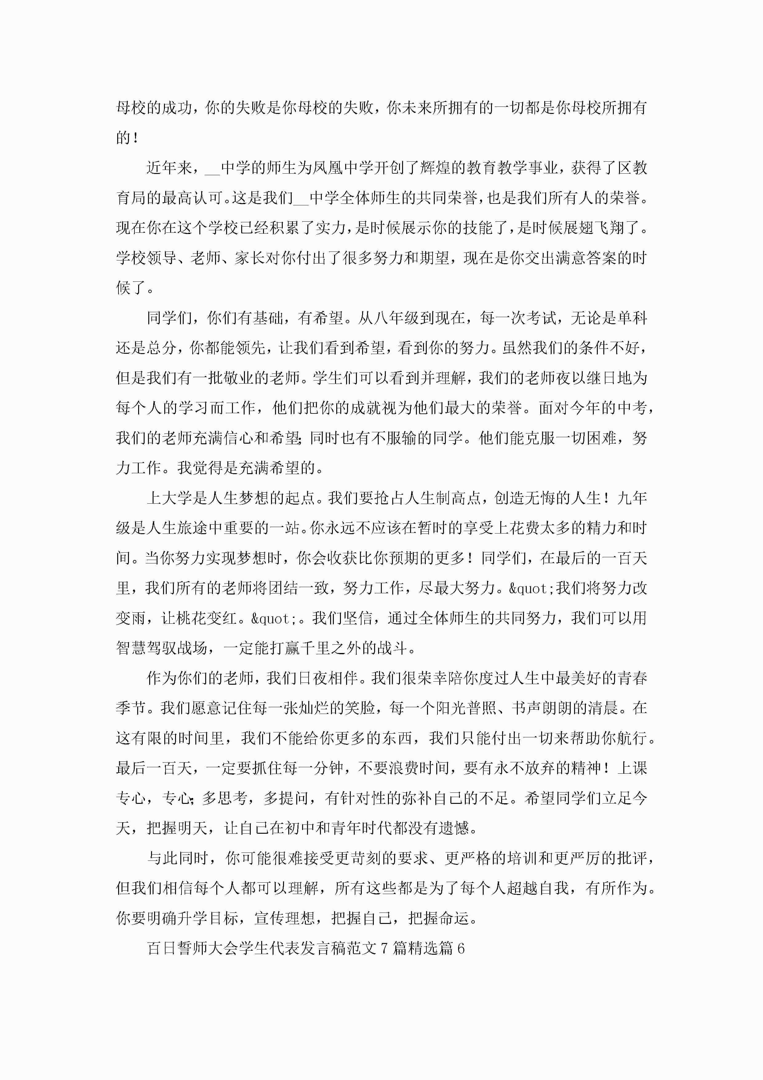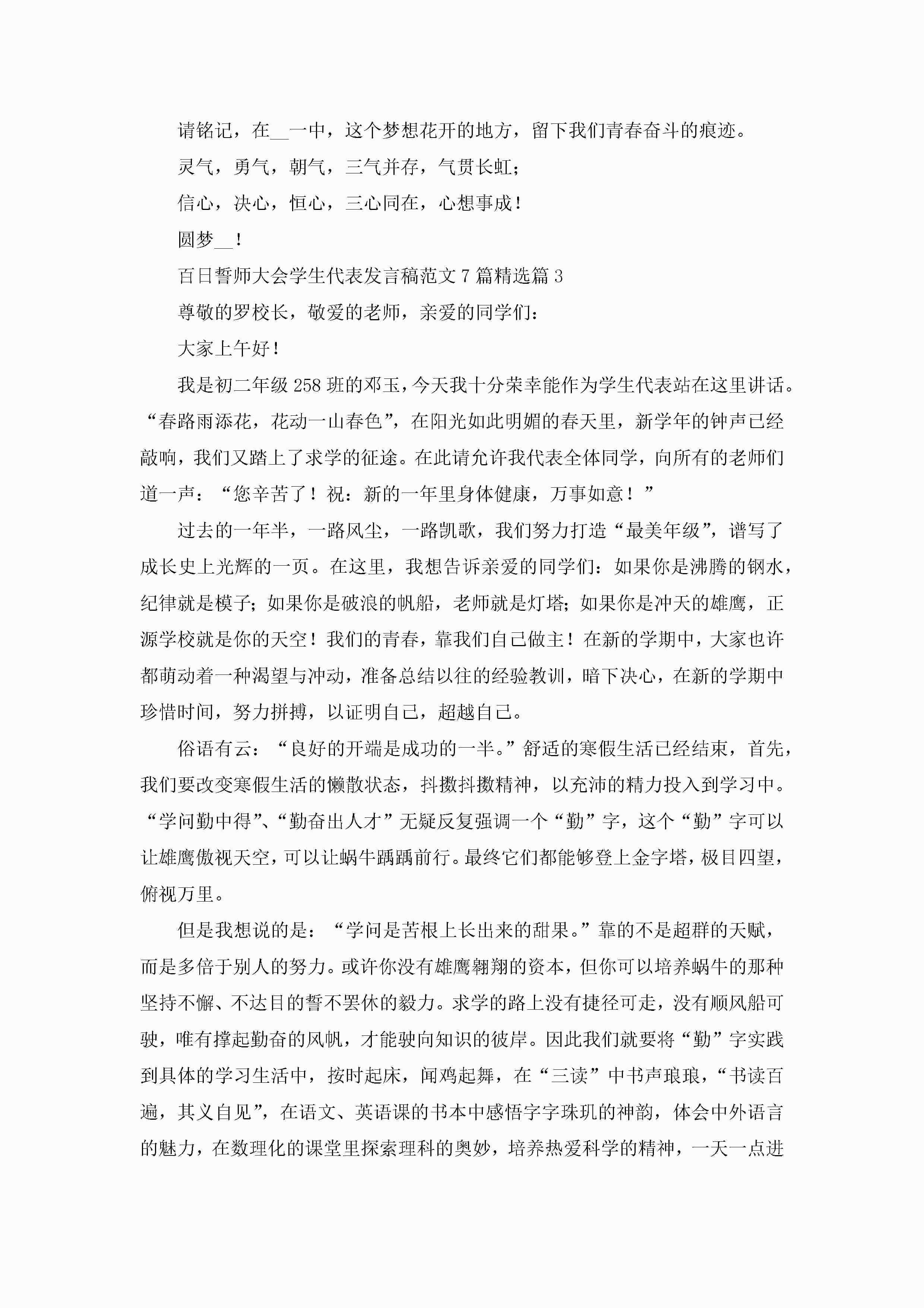 百日誓师大会学生代表发言稿范文(7篇)jugei3月23日 01:42发布关注225 百日誓师大会学生代表发言稿范文(7篇)此内容为付费资源,请付费后查看¥10.9 单篇文档限时特惠¥15个人会员开通企业会员开通立即下载无需登陆!可直接快捷下载单个模板付费资源© 版权声明THE ENDWord模板# 实用文档# 演讲稿# 经典演讲稿# 百日誓师大会学生代表发言稿范文7篇 如有问题,可点击最底部“联系我们”联系客服 分享QQ空间微博QQ好友海报分享复制链接收藏