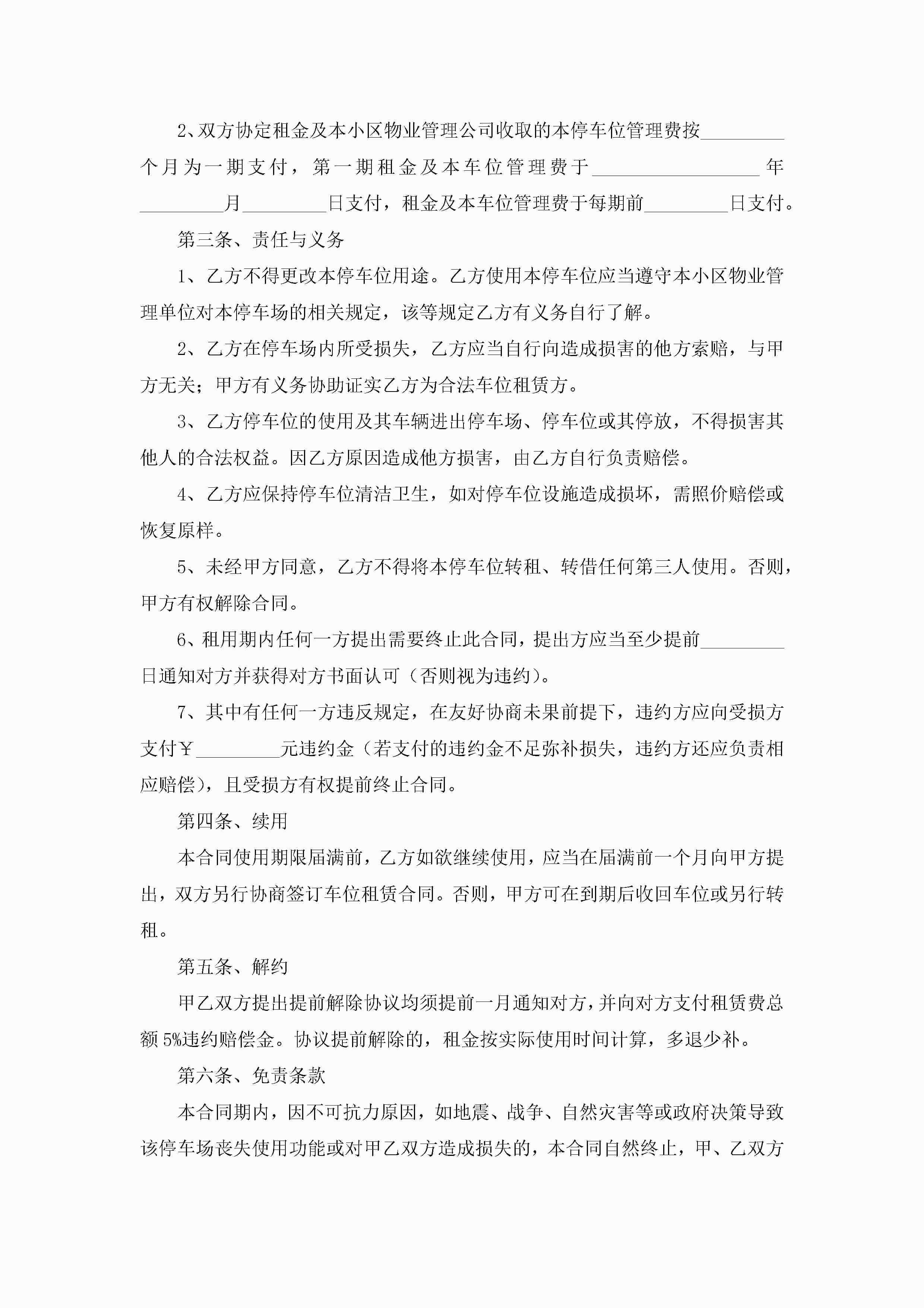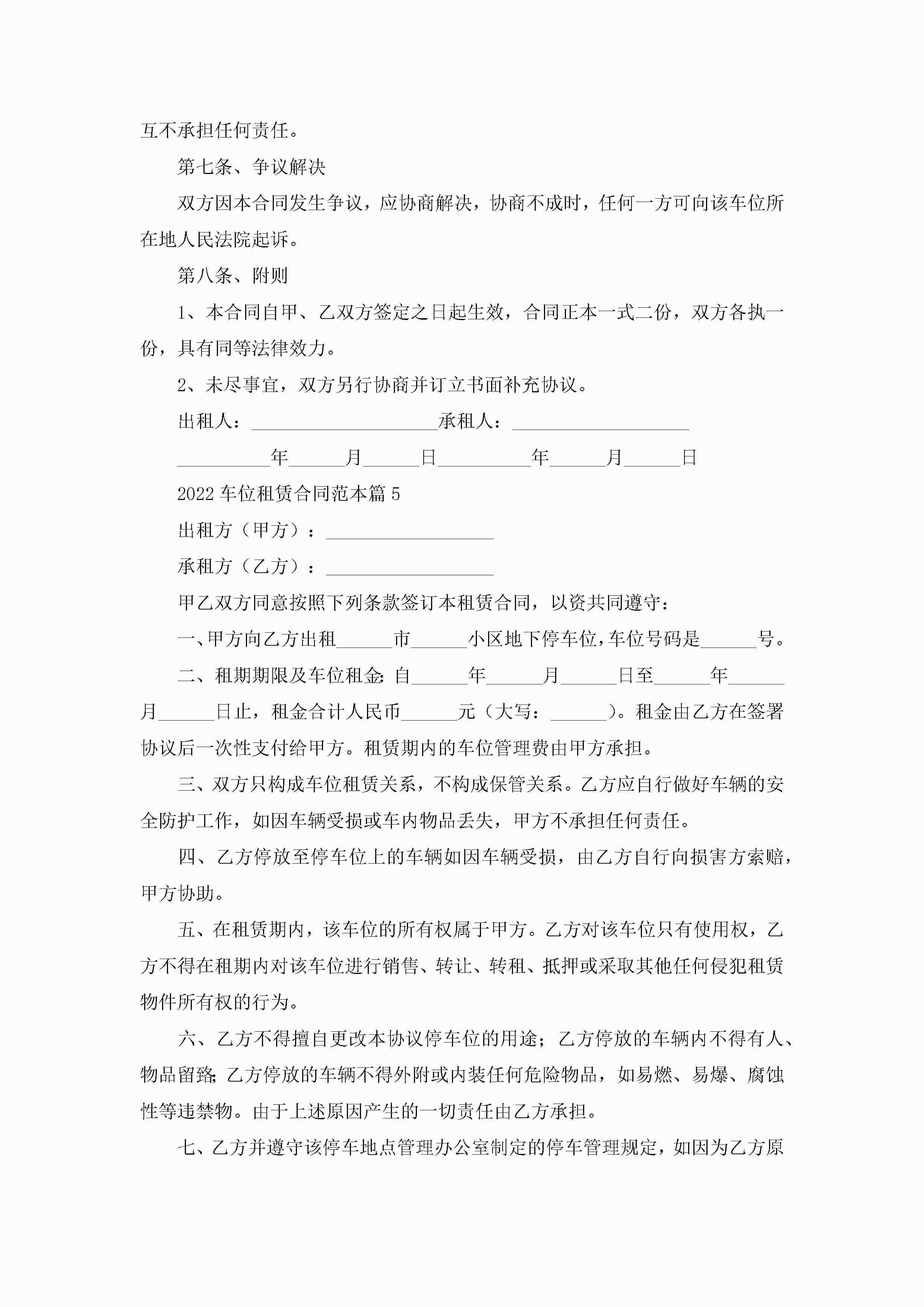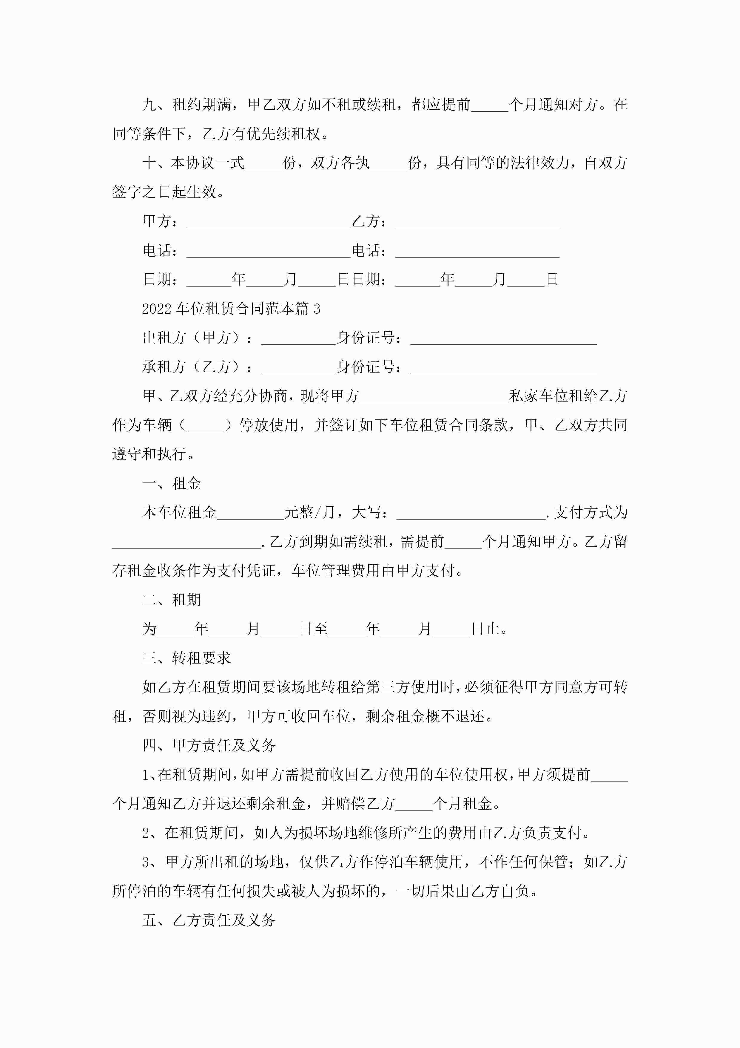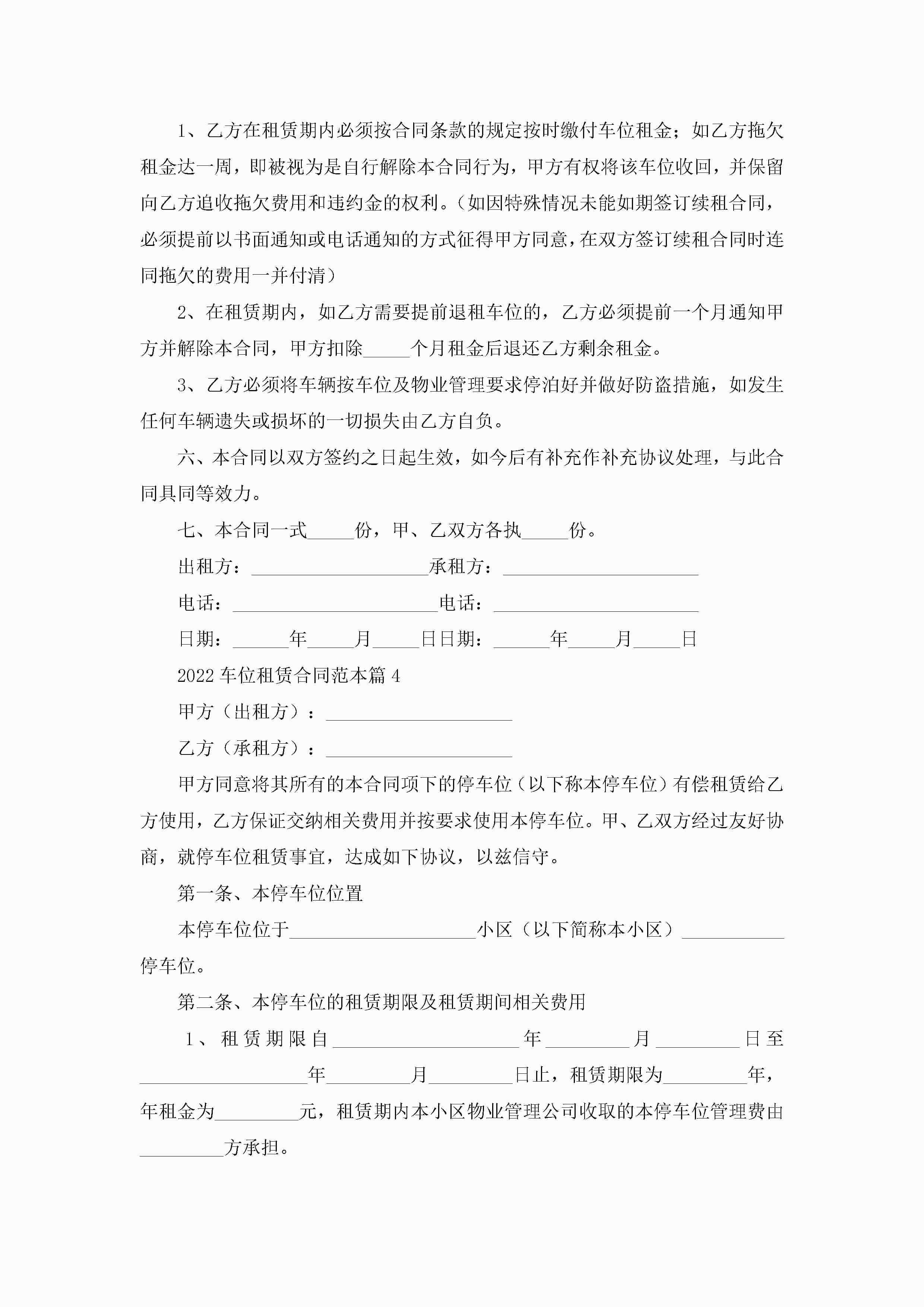 2022车位租赁合同范本5篇(精选)jugei3月23日 01:42发布关注186 2022车位租赁合同范本5篇(精选)此内容为付费资源,请付费后查看¥10.9 单篇文档限时特惠¥15个人会员开通企业会员开通立即下载无需登陆!可直接快捷下载单个模板付费资源© 版权声明THE ENDWord模板# 实用文档# 实用模板# 合同模板# 租赁合同 如有问题,可点击最底部“联系我们”联系客服 分享QQ空间微博QQ好友海报分享复制链接收藏
