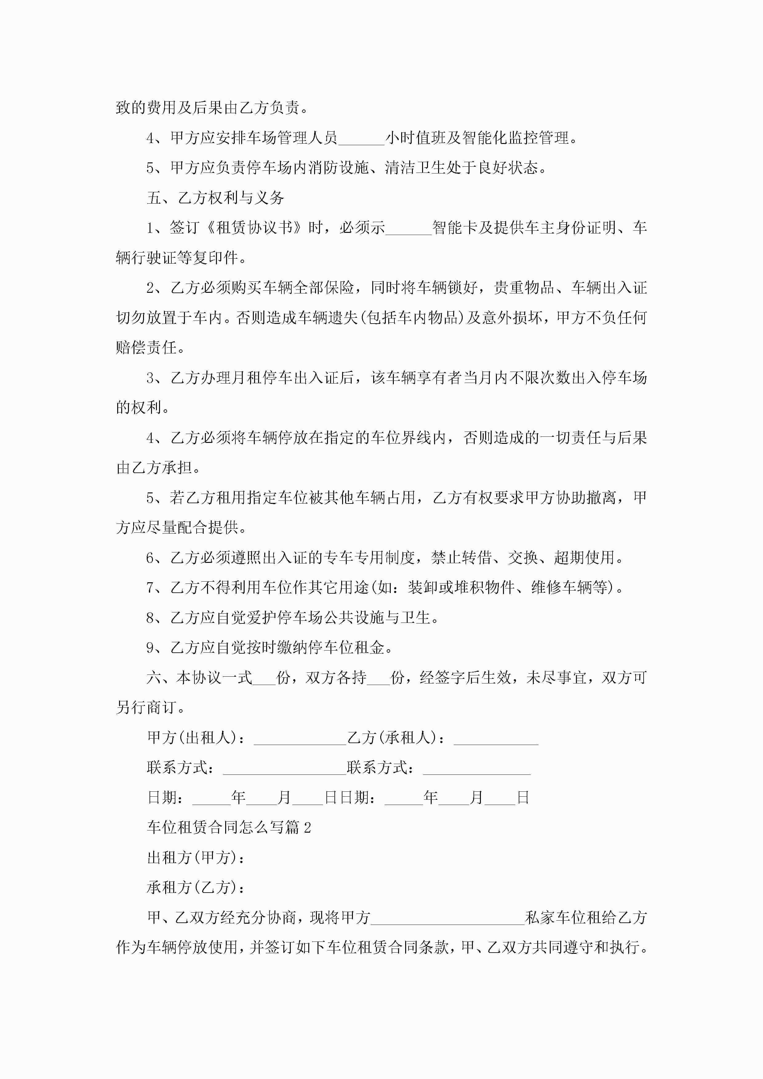 车位租赁合同怎么写5篇(精选)jugei3月23日 01:42发布关注256 车位租赁合同怎么写5篇(精选)此内容为付费资源,请付费后查看¥10.9 单篇文档限时特惠¥15个人会员开通企业会员开通立即下载无需登陆!可直接快捷下载单个模板付费资源© 版权声明THE ENDWord模板# 实用文档# 实用模板# 合同模板# 租赁合同 如有问题,可点击最底部“联系我们”联系客服 分享QQ空间微博QQ好友海报分享复制链接收藏