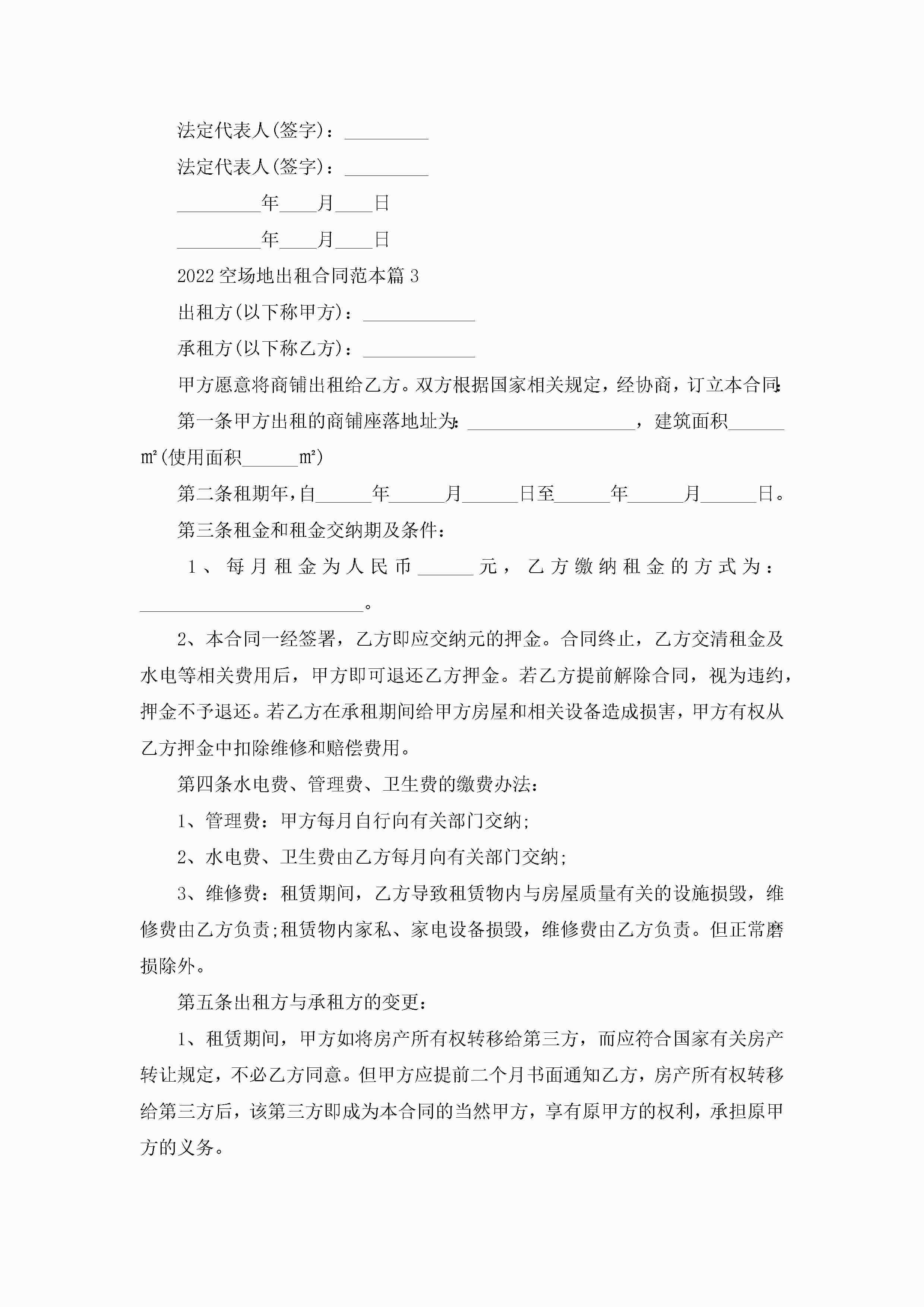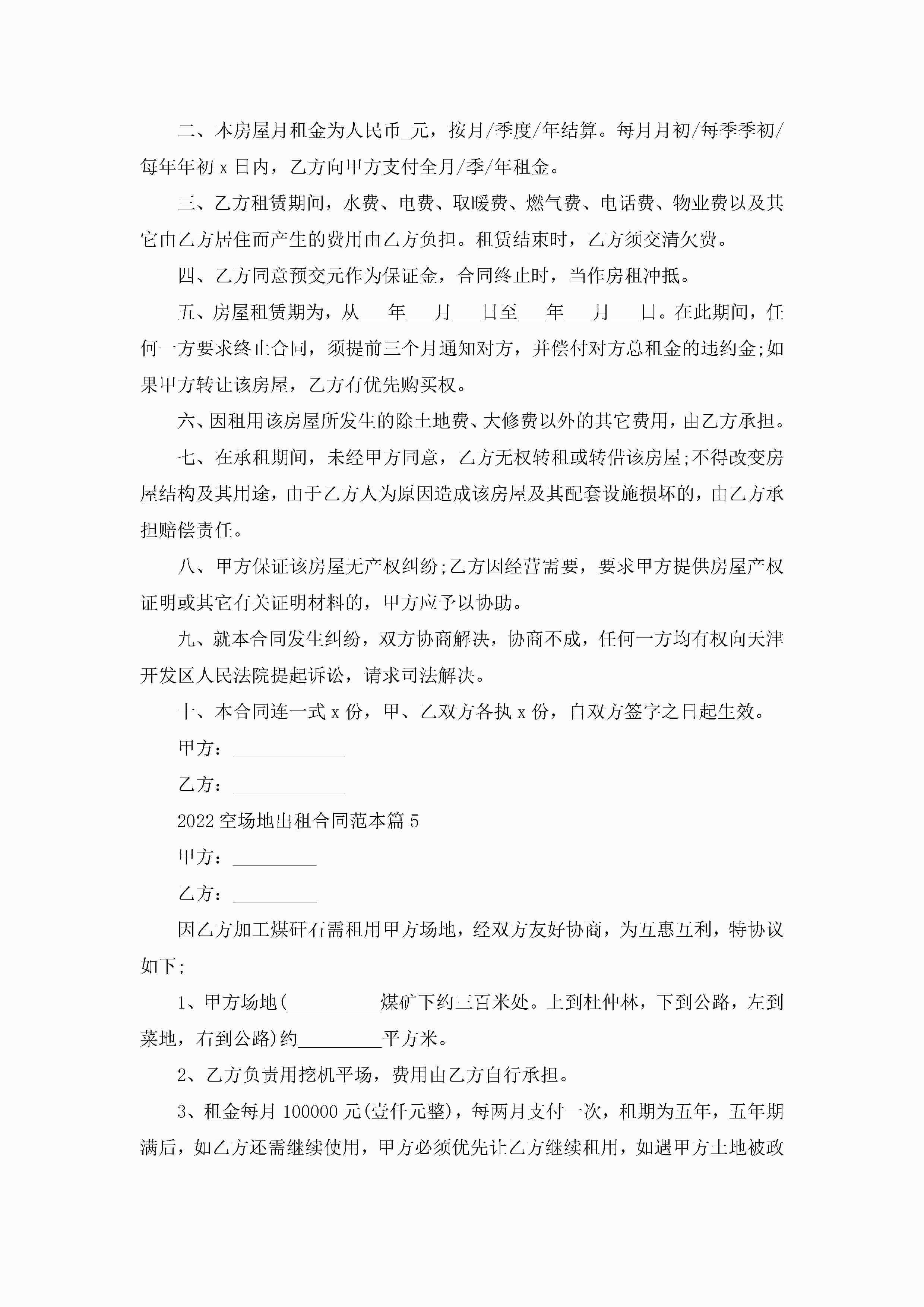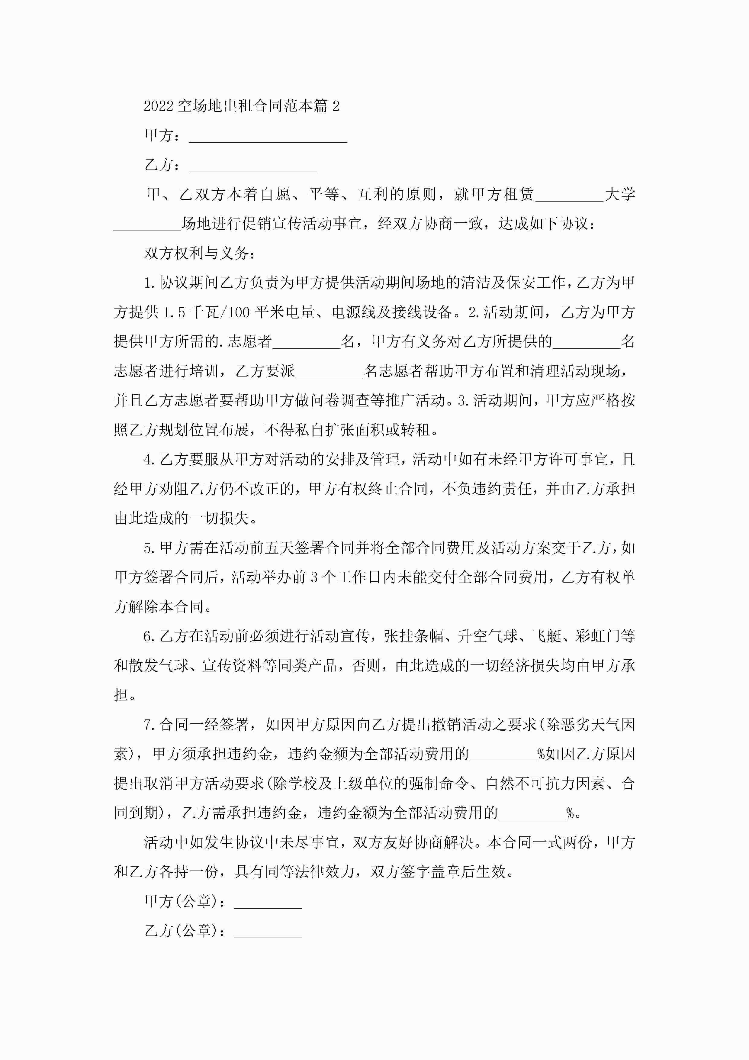 2022空场地出租合同范本(5篇)jugei3月23日 01:42发布关注345 2022空场地出租合同范本(5篇)此内容为付费资源,请付费后查看¥10.9 单篇文档限时特惠¥15个人会员开通企业会员开通立即下载无需登陆!可直接快捷下载单个模板付费资源© 版权声明THE ENDWord模板# 实用文档# 实用模板# 合同模板# 租赁合同 如有问题,可点击最底部“联系我们”联系客服 分享QQ空间微博QQ好友海报分享复制链接收藏