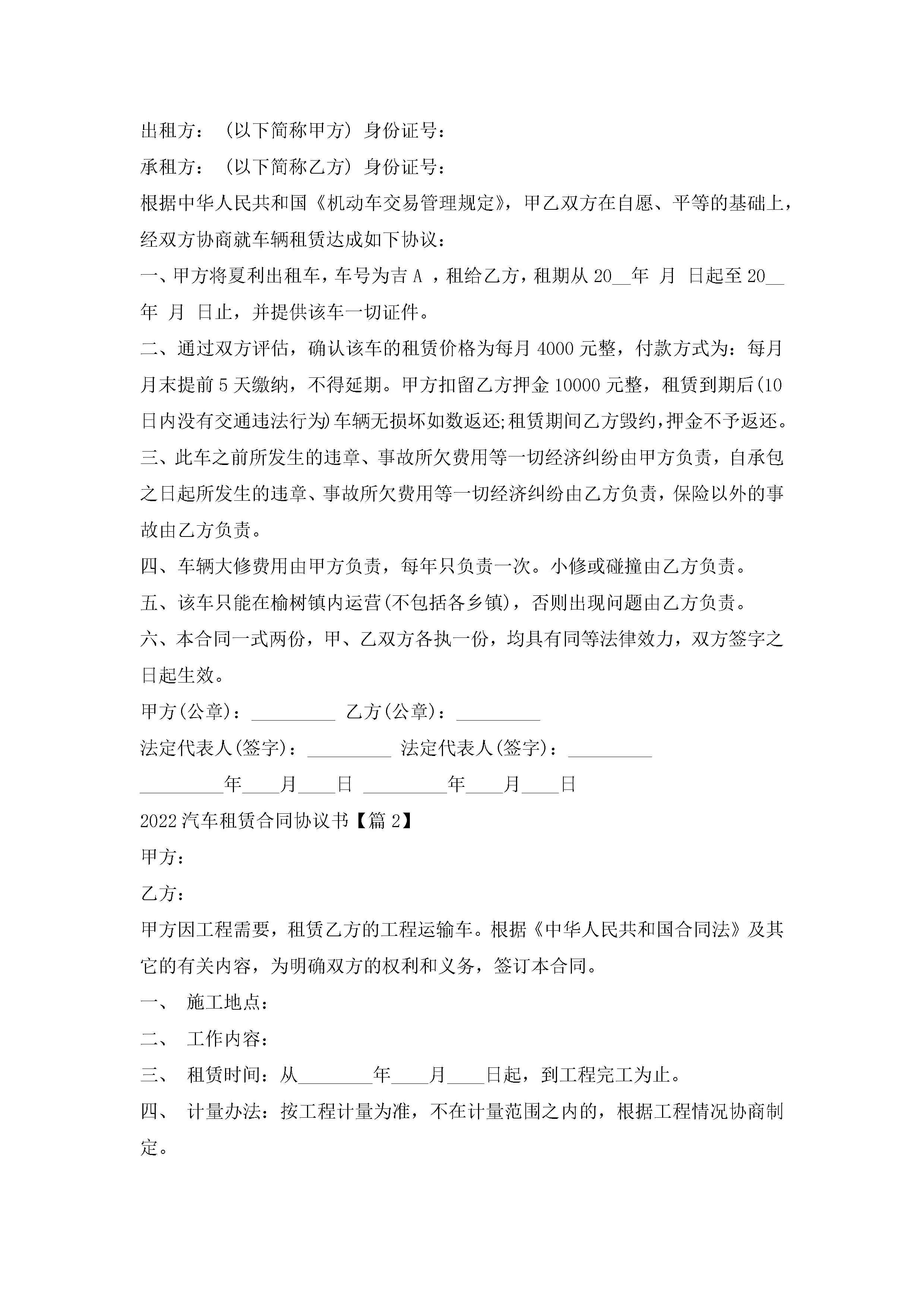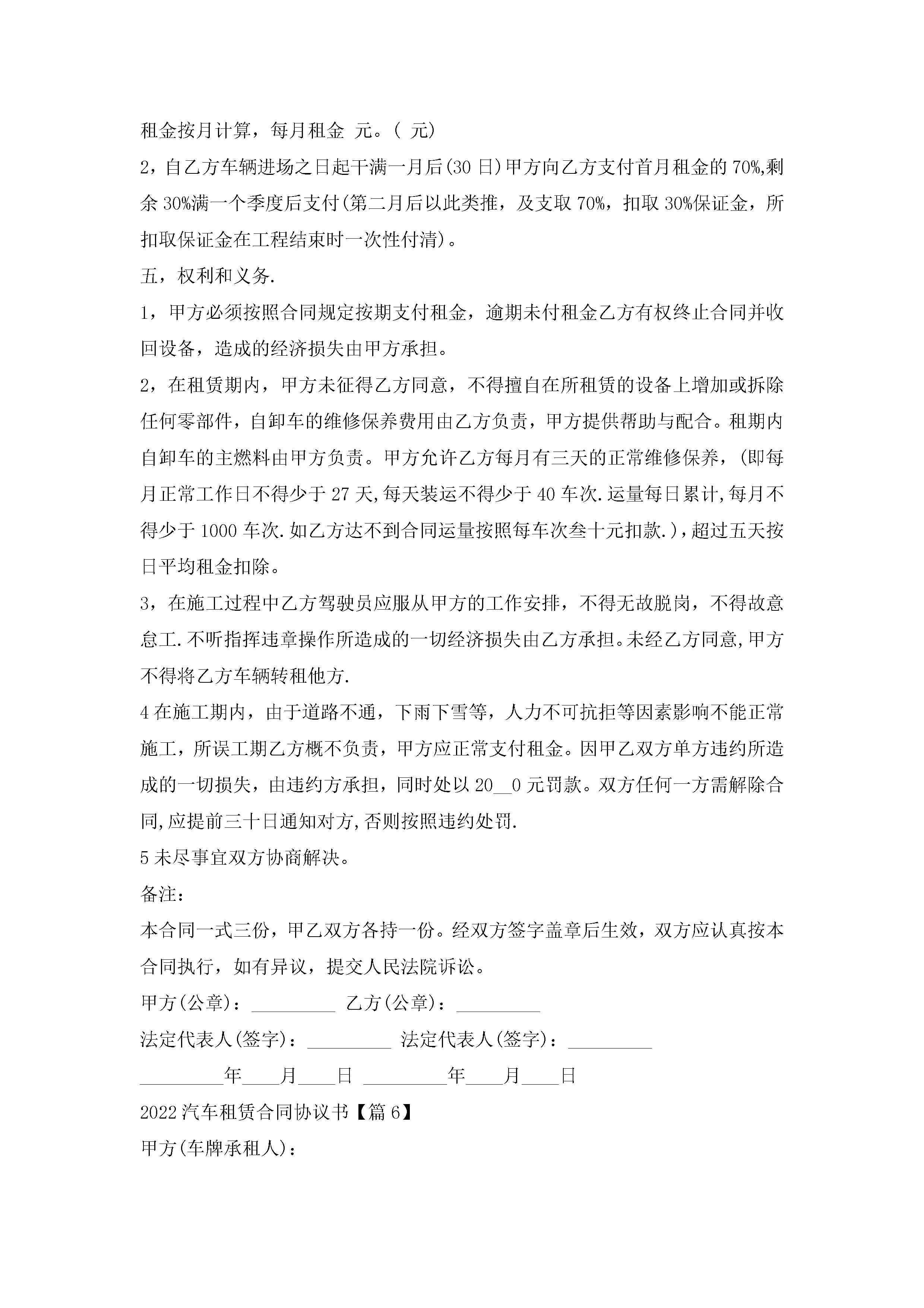 2022汽车租赁合同协议书热门6篇jugei3月23日 01:42发布关注184 2022汽车租赁合同协议书热门6篇此内容为付费资源,请付费后查看¥10.9 单篇文档限时特惠¥15个人会员开通企业会员开通立即下载无需登陆!可直接快捷下载单个模板付费资源© 版权声明THE ENDWord模板# 实用文档# 实用模板# 合同模板# 租赁合同 如有问题,可点击最底部“联系我们”联系客服 分享QQ空间微博QQ好友海报分享复制链接收藏