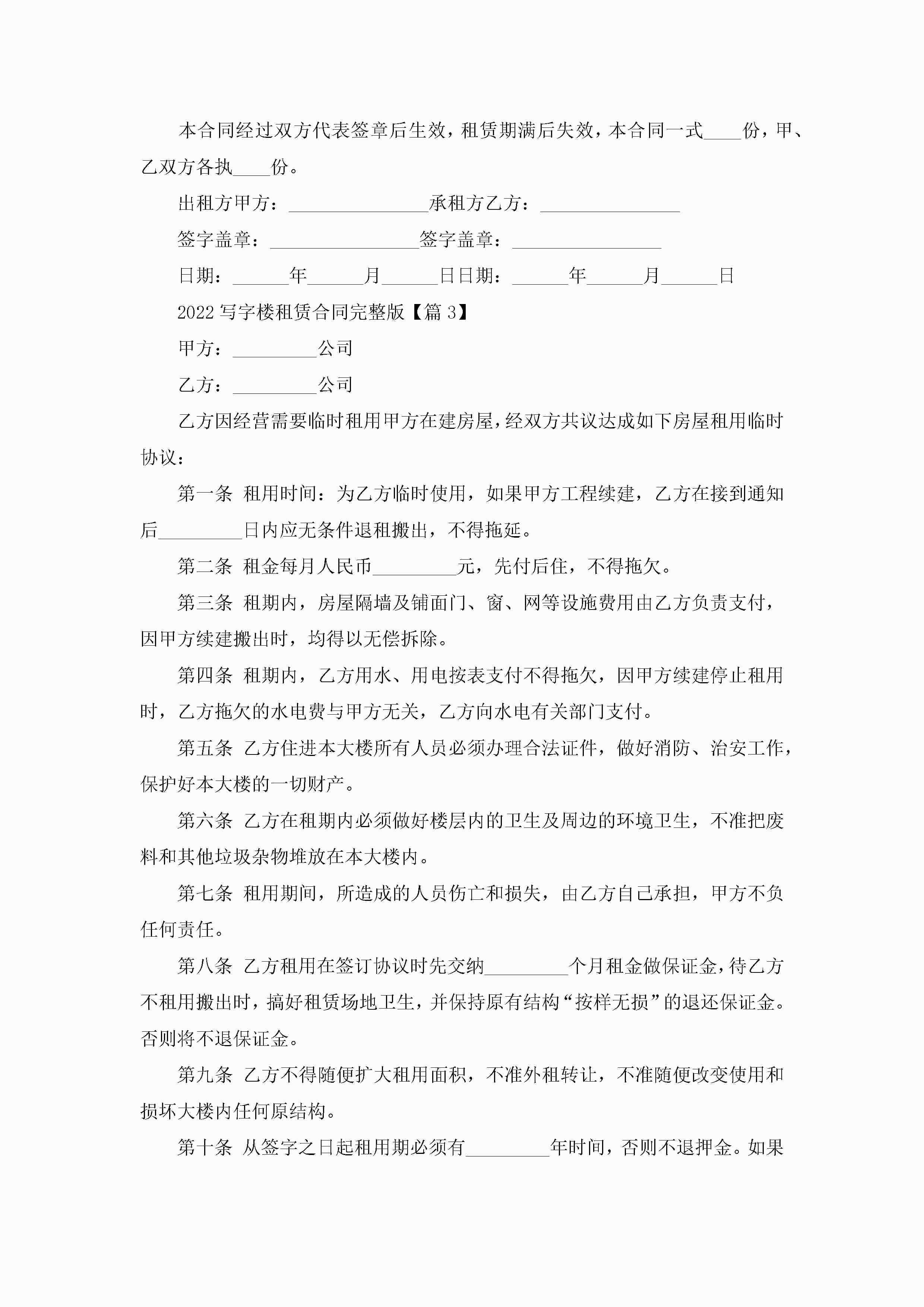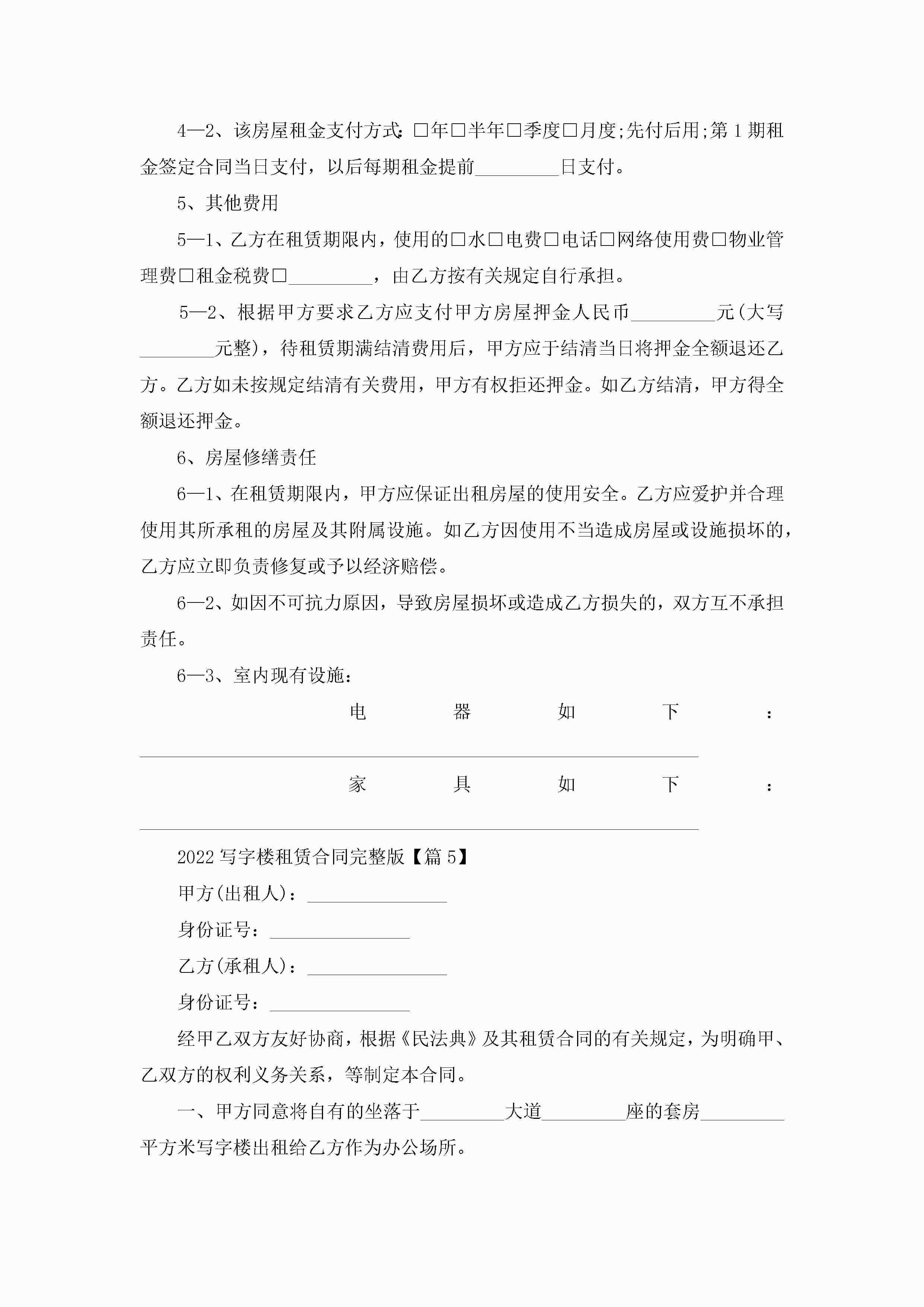2022写字楼租赁合同完整版6篇jugei3月23日 01:42发布关注213 2022写字楼租赁合同完整版6篇此内容为付费资源,请付费后查看¥10.9 单篇文档限时特惠¥15个人会员开通企业会员开通立即下载无需登陆!可直接快捷下载单个模板付费资源© 版权声明THE ENDWord模板# 实用文档# 实用模板# 合同模板# 租赁合同 如有问题,可点击最底部“联系我们”联系客服 分享QQ空间微博QQ好友海报分享复制链接收藏