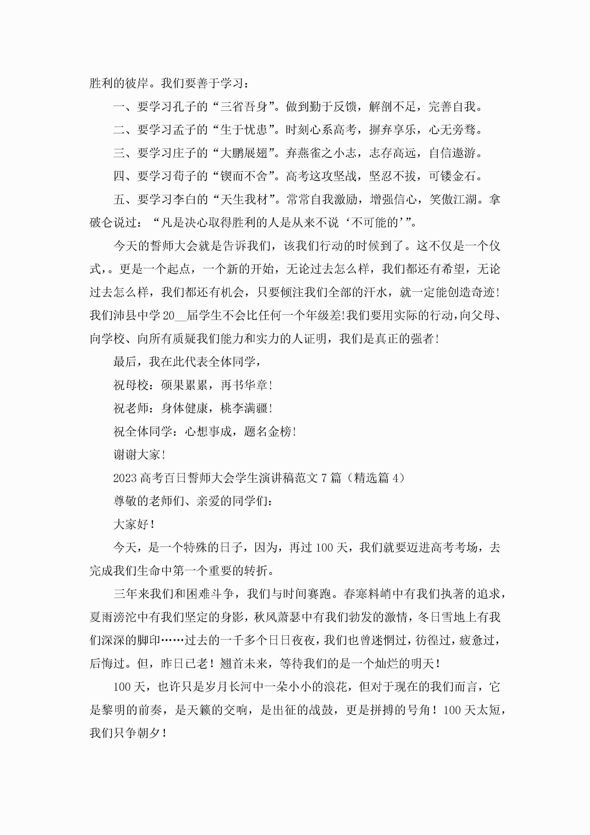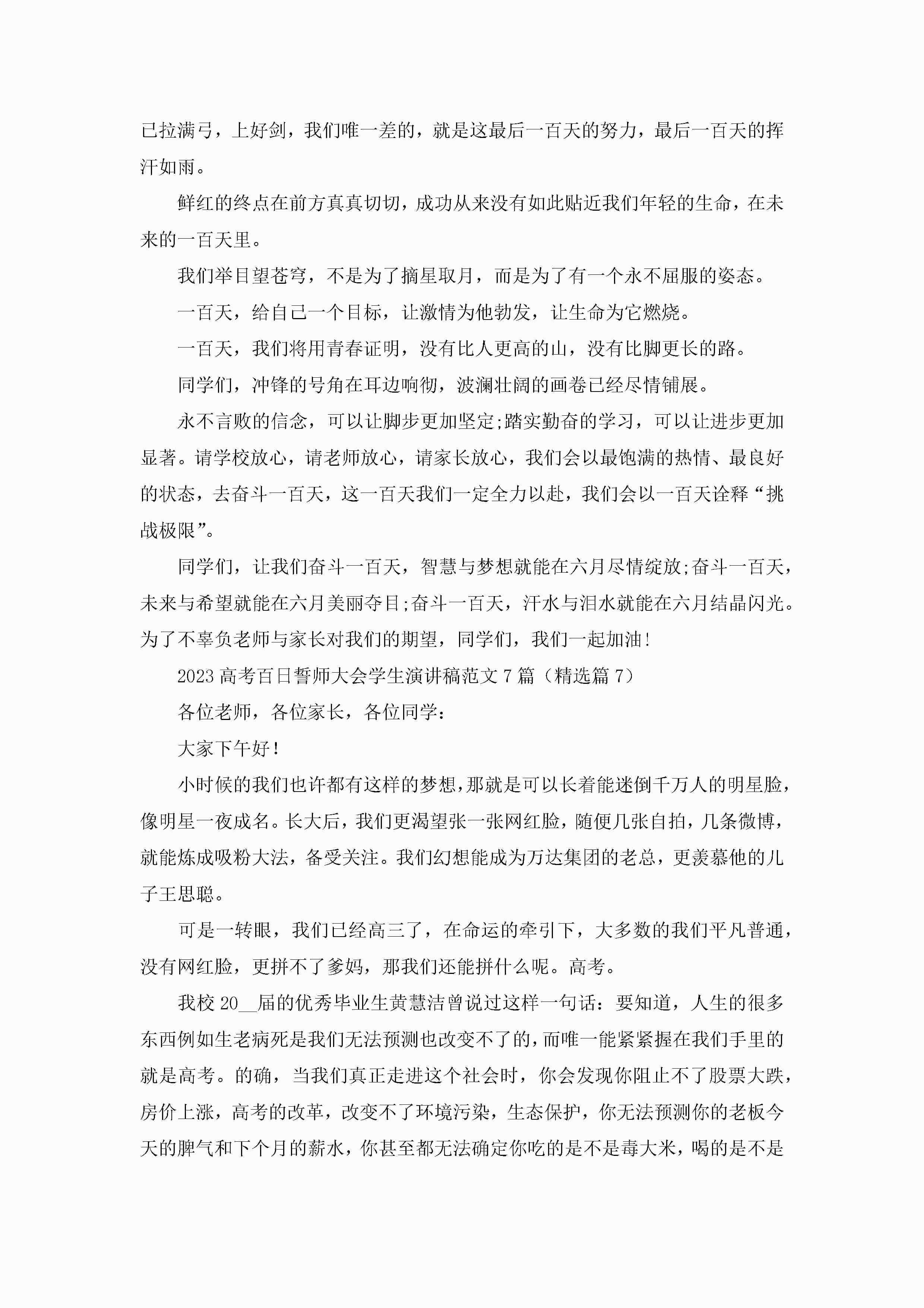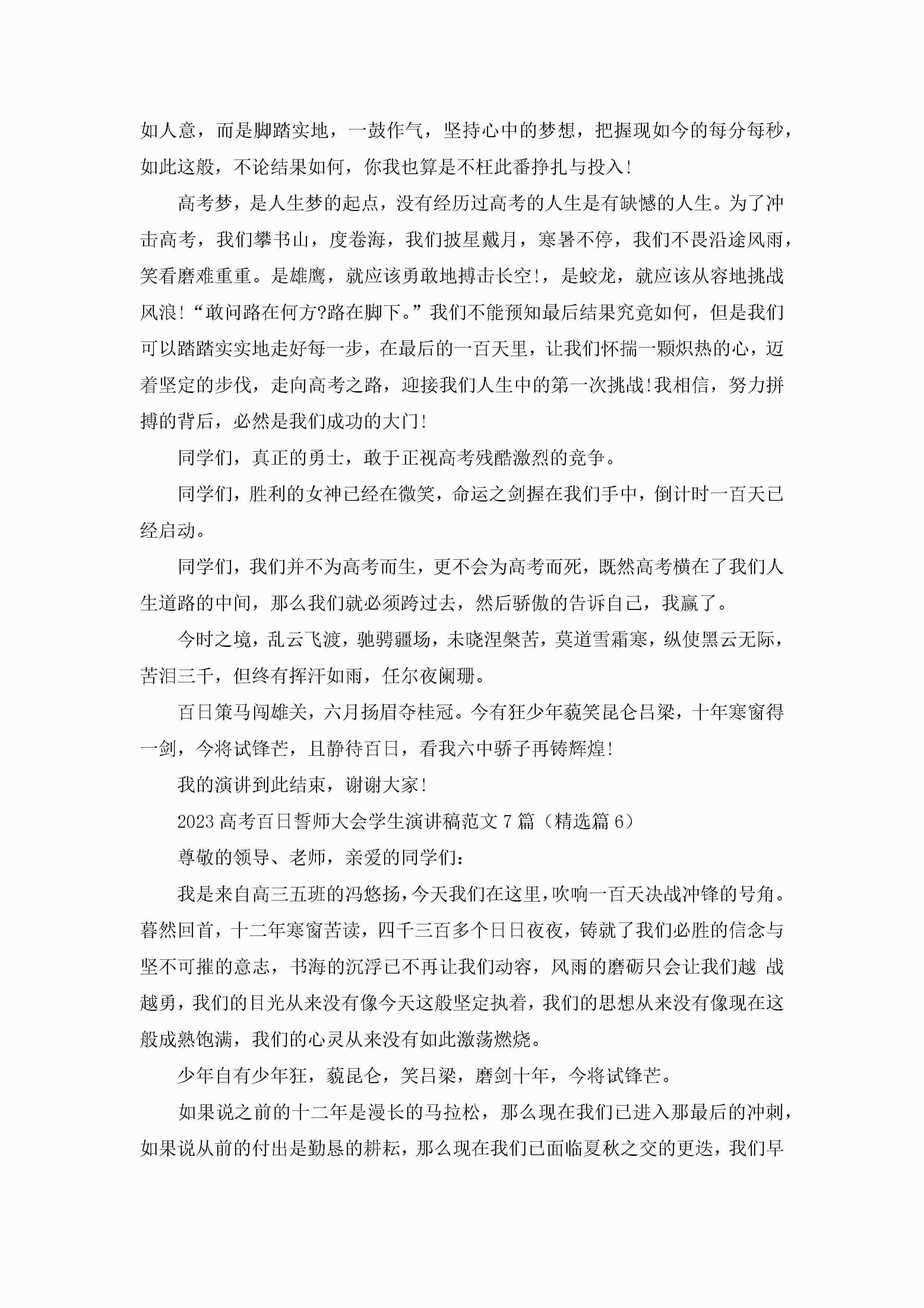 2023高考百日誓师大会学生演讲稿范文(7篇)jugei3月23日 01:42发布关注211 2023高考百日誓师大会学生演讲稿范文(7篇)此内容为付费资源,请付费后查看¥10.9 单篇文档限时特惠¥15个人会员开通企业会员开通立即下载无需登陆!可直接快捷下载单个模板付费资源© 版权声明THE ENDWord模板# 实用文档# 演讲稿# 经典演讲稿# 2023高考百日誓师大会学生演讲稿范文7篇 如有问题,可点击最底部“联系我们”联系客服 分享QQ空间微博QQ好友海报分享复制链接收藏