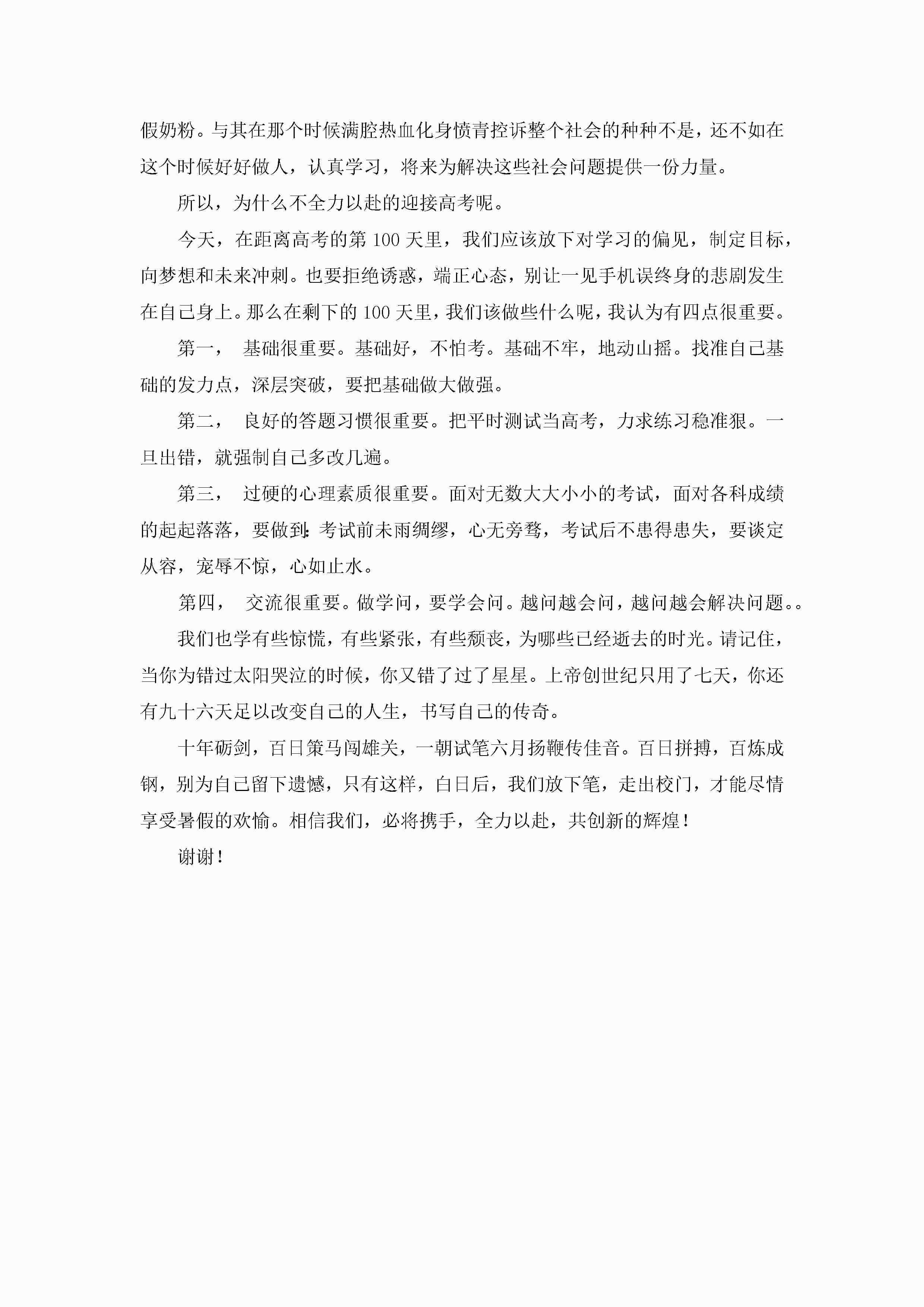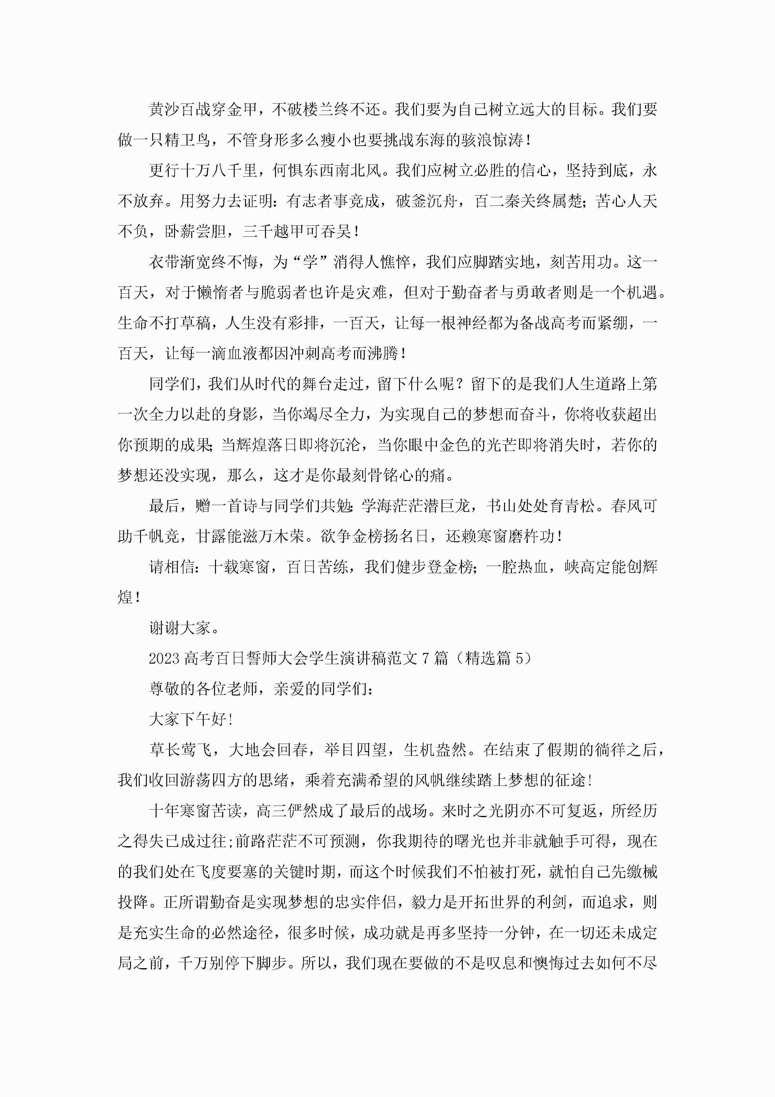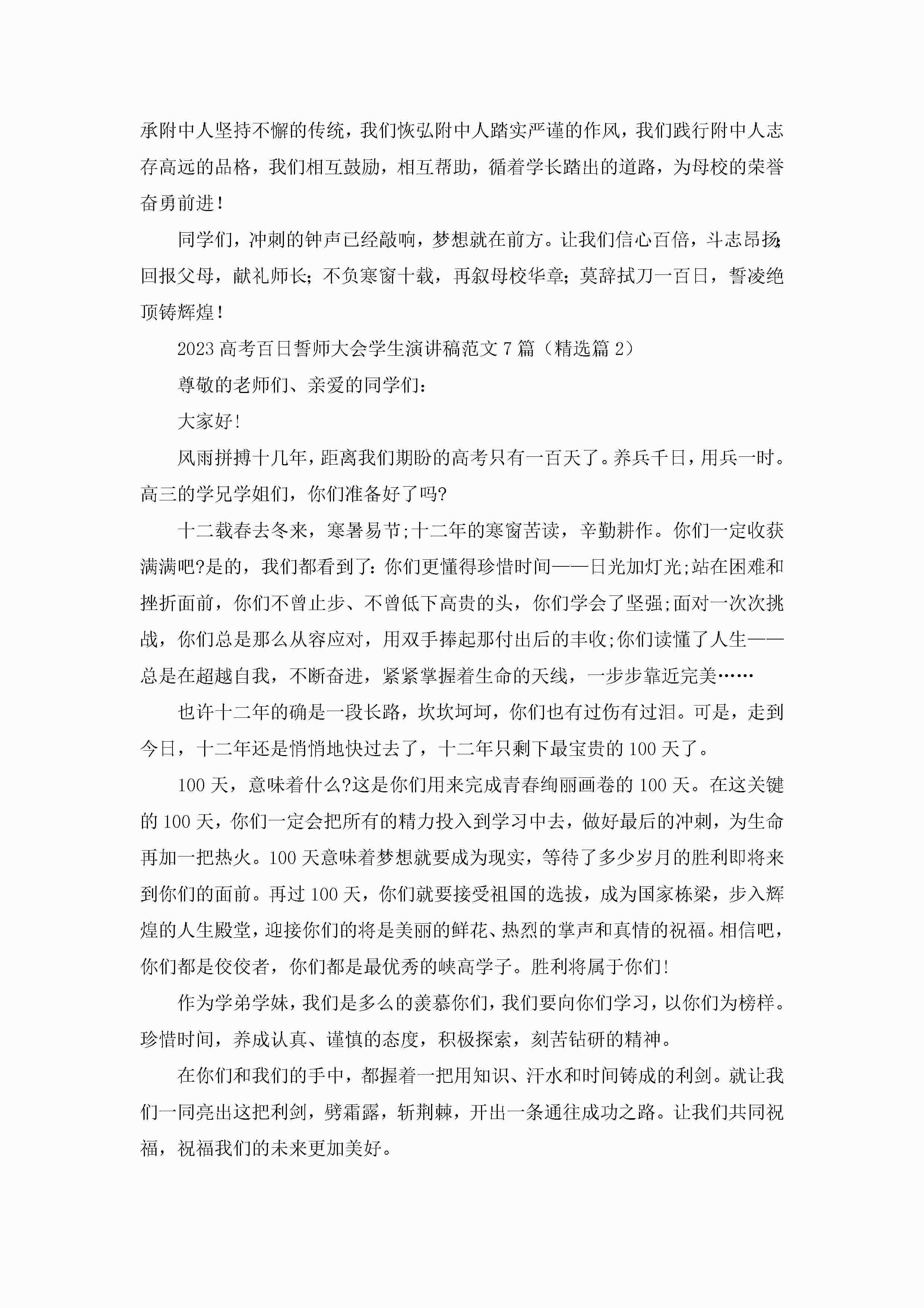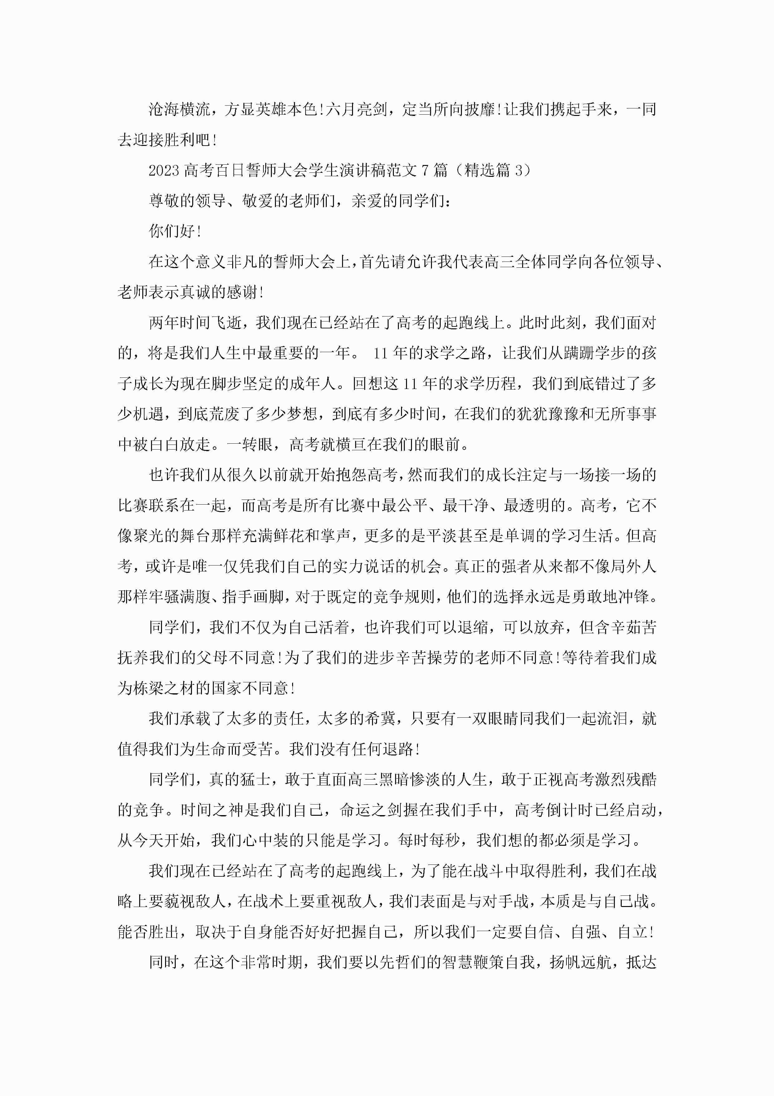 2023高考百日誓师大会学生演讲稿范文(7篇)jugei3月23日 01:42发布关注211 2023高考百日誓师大会学生演讲稿范文(7篇)此内容为付费资源,请付费后查看¥10.9 单篇文档限时特惠¥15个人会员开通企业会员开通立即下载无需登陆!可直接快捷下载单个模板付费资源© 版权声明THE ENDWord模板# 实用文档# 演讲稿# 经典演讲稿# 2023高考百日誓师大会学生演讲稿范文7篇 如有问题,可点击最底部“联系我们”联系客服 分享QQ空间微博QQ好友海报分享复制链接收藏