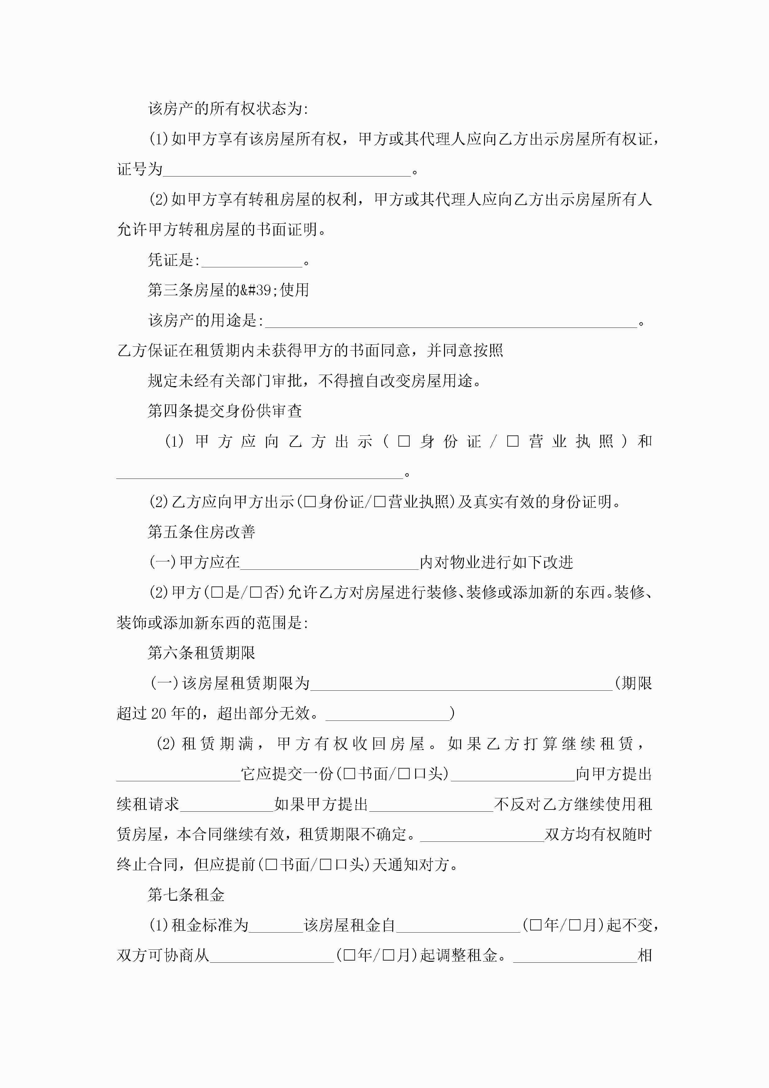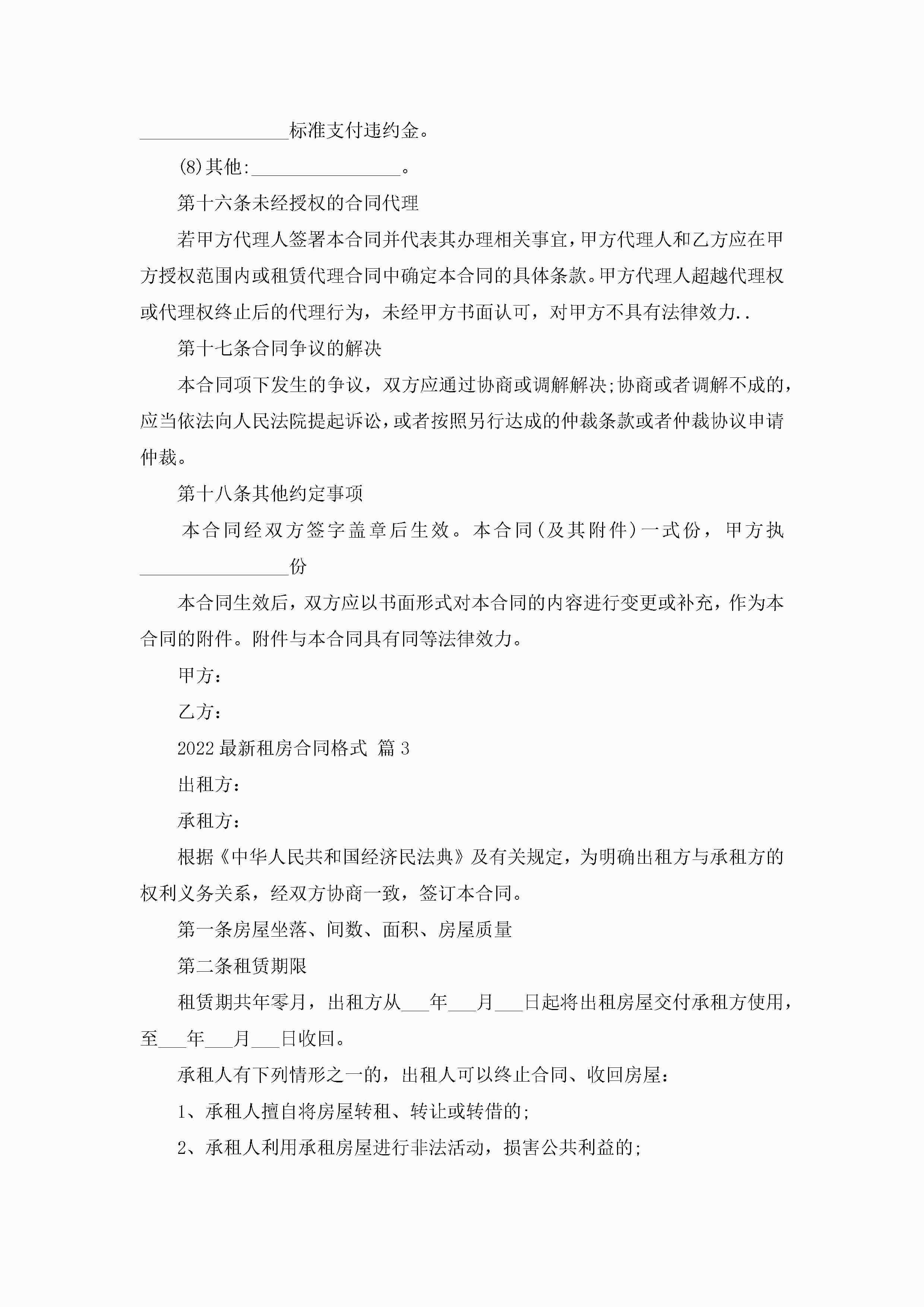 2022最新租房合同格式(10篇)jugei3月23日 01:42发布关注355 2022最新租房合同格式(10篇)此内容为付费资源,请付费后查看¥10.9 单篇文档限时特惠¥15个人会员开通企业会员开通立即下载无需登陆!可直接快捷下载单个模板付费资源© 版权声明THE ENDWord模板# 实用文档# 实用模板# 合同模板# 租赁合同 如有问题,可点击最底部“联系我们”联系客服 分享QQ空间微博QQ好友海报分享复制链接收藏
