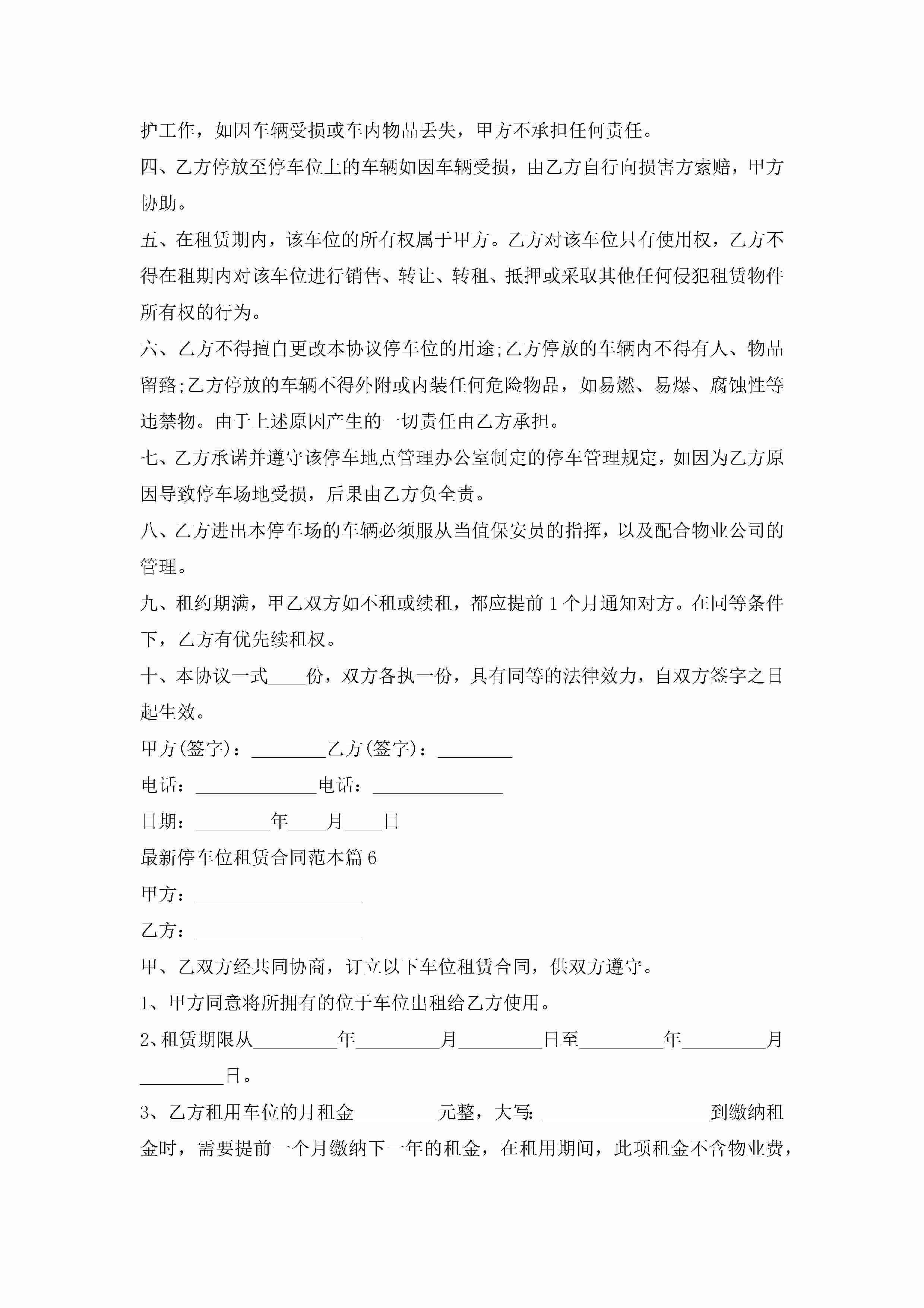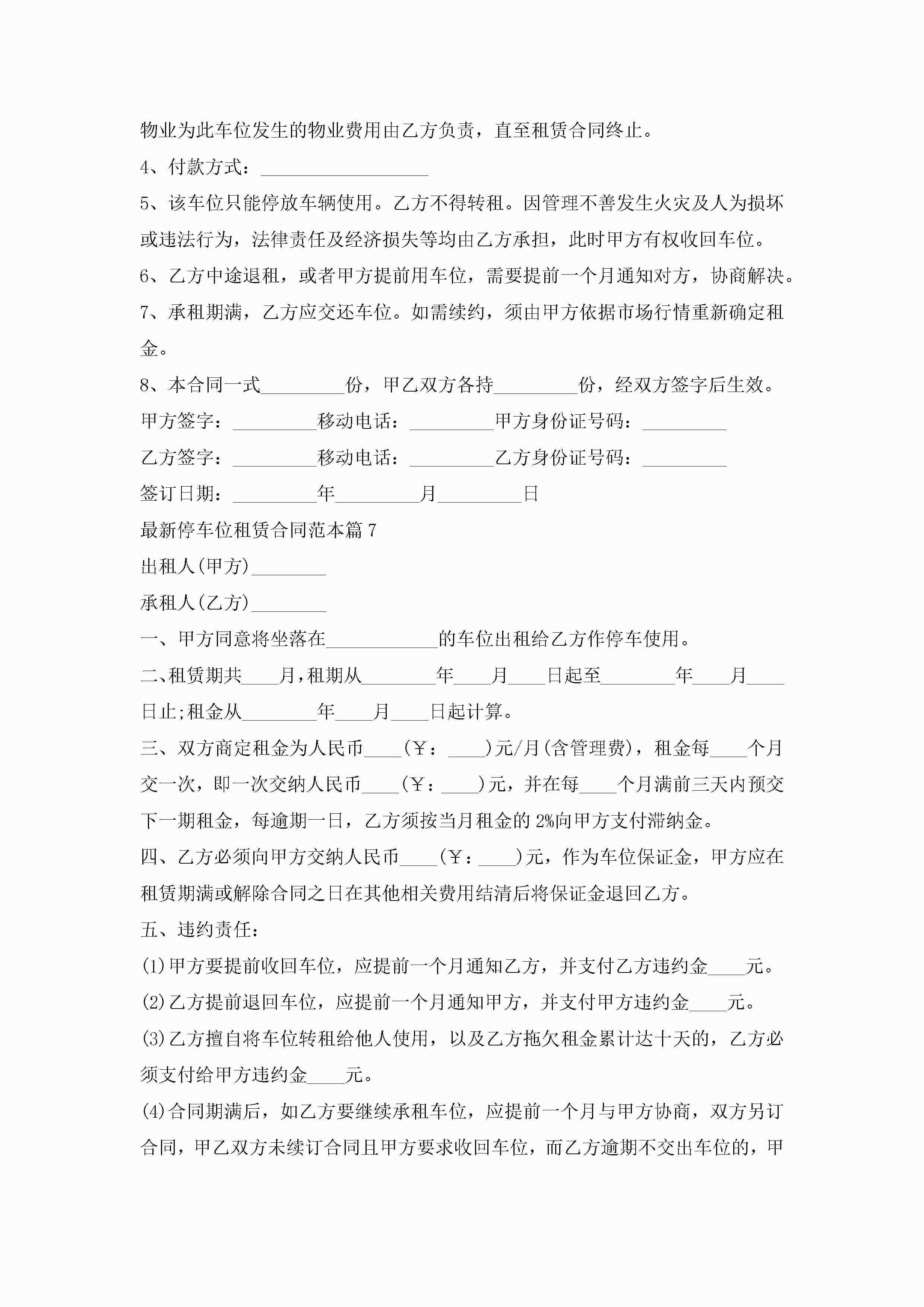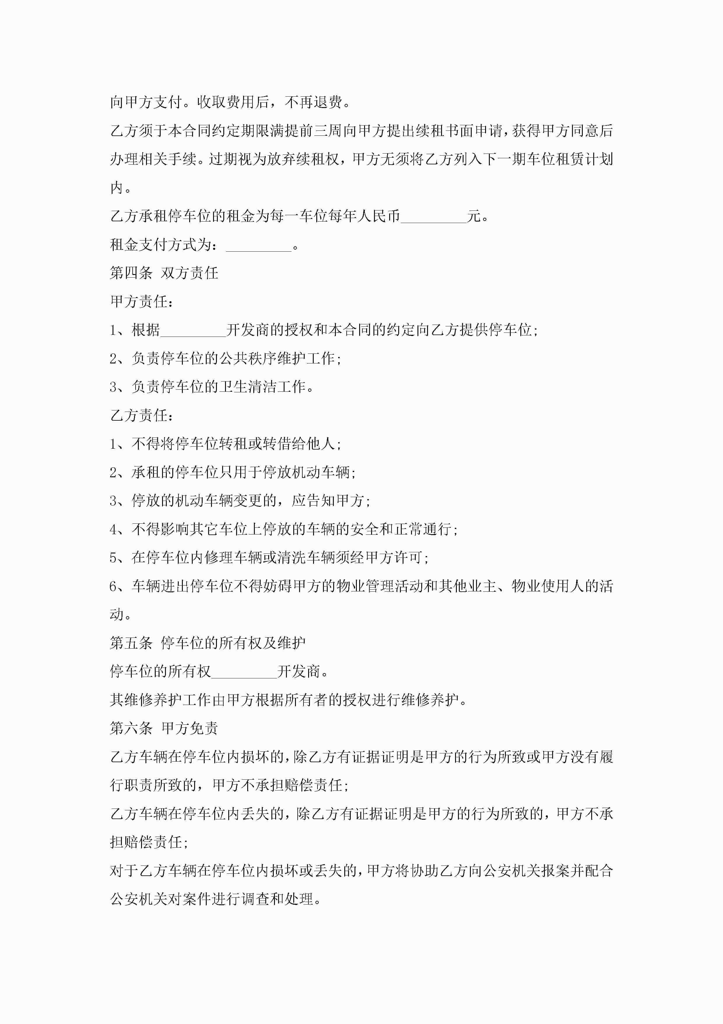 最新停车位租赁合同范本7篇jugei3月23日 01:42发布关注354 最新停车位租赁合同范本7篇此内容为付费资源,请付费后查看¥10.9 单篇文档限时特惠¥15个人会员开通企业会员开通立即下载无需登陆!可直接快捷下载单个模板付费资源© 版权声明THE ENDWord模板# 实用文档# 实用模板# 合同模板# 租赁合同 如有问题,可点击最底部“联系我们”联系客服 分享QQ空间微博QQ好友海报分享复制链接收藏