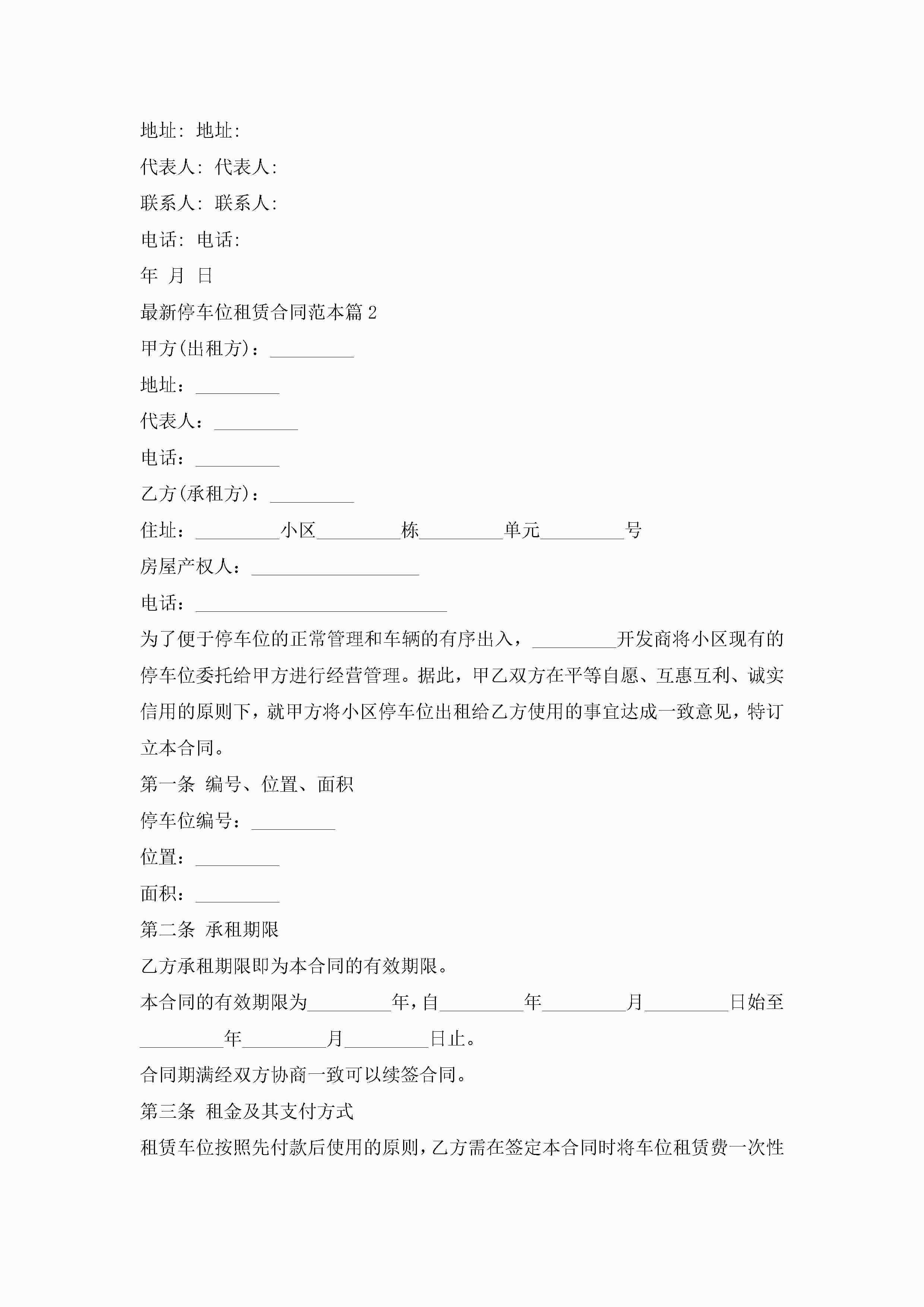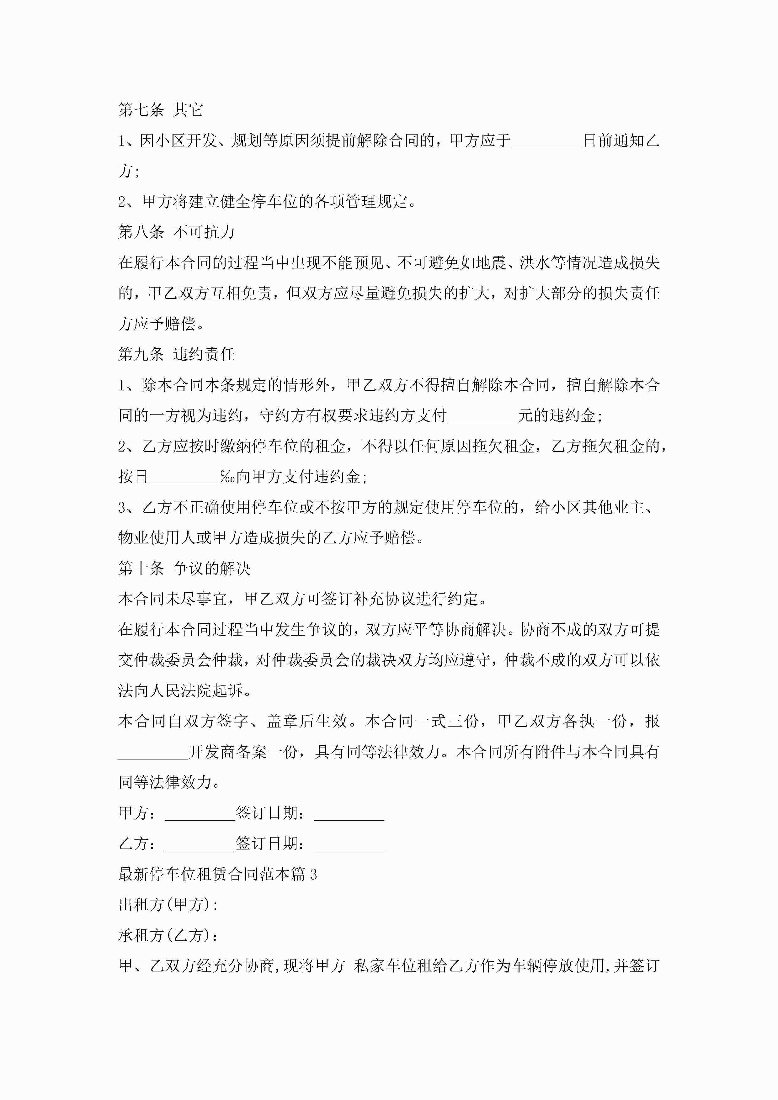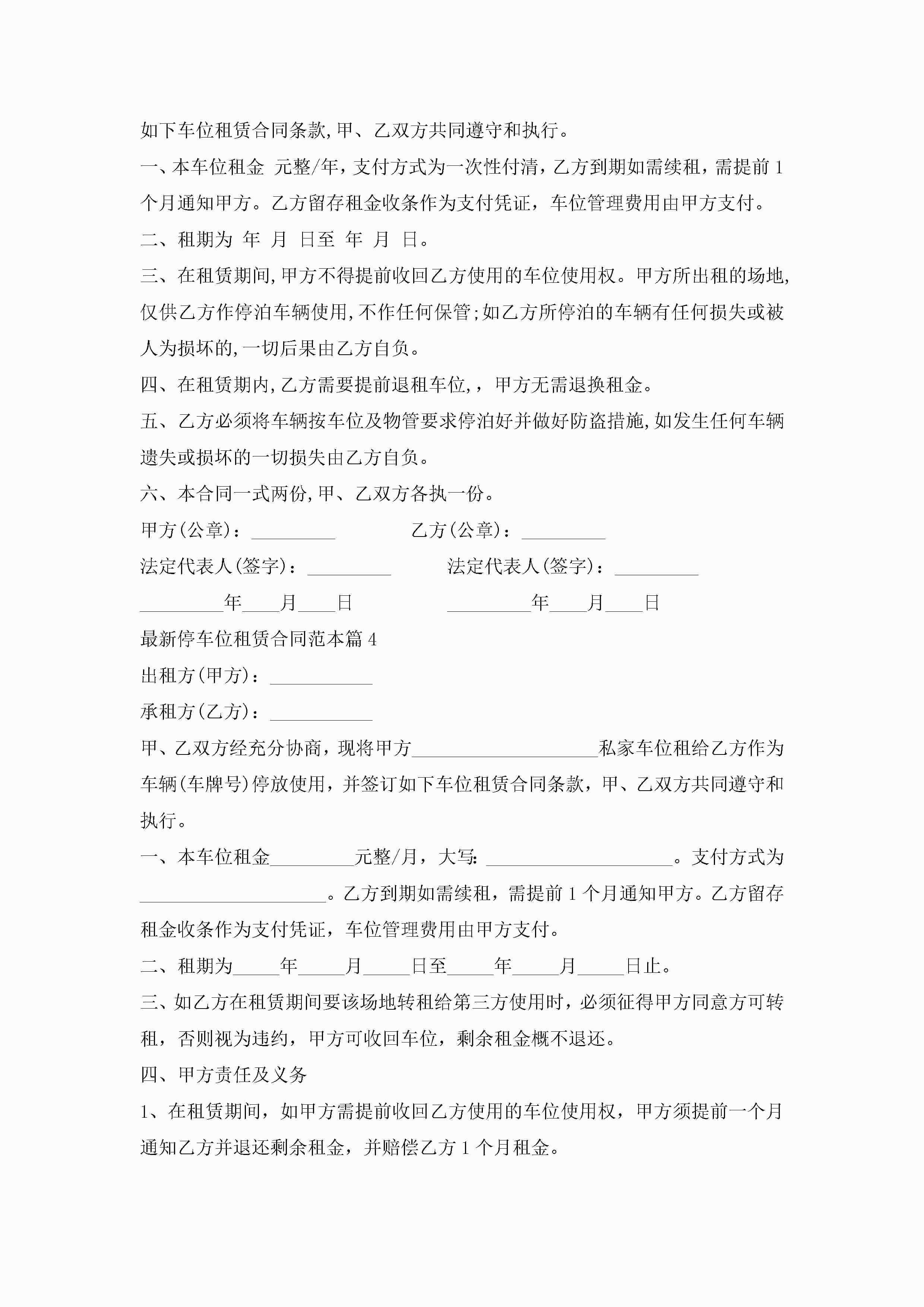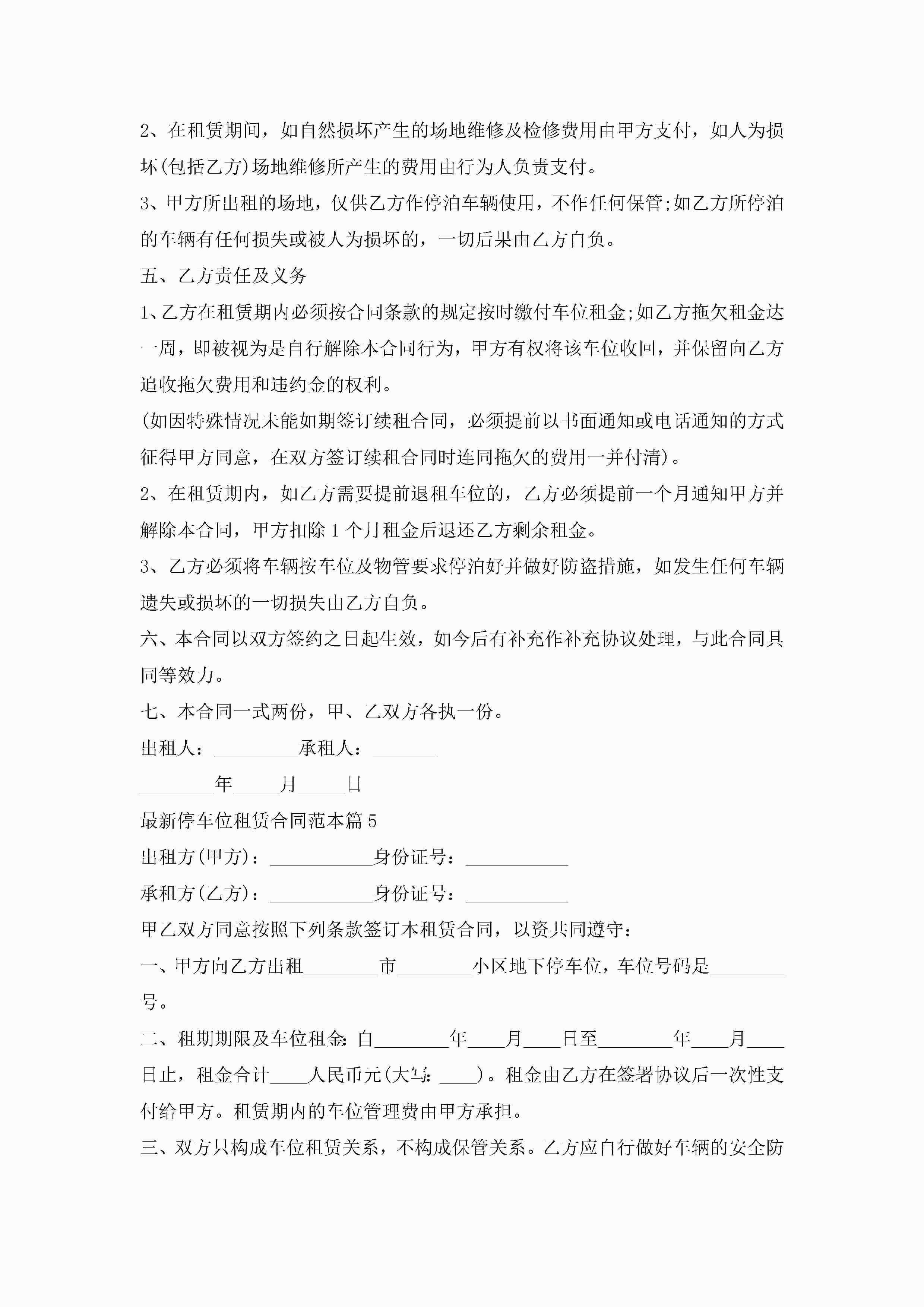 最新停车位租赁合同范本7篇jugei3月23日 01:42发布关注354 最新停车位租赁合同范本7篇此内容为付费资源,请付费后查看¥10.9 单篇文档限时特惠¥15个人会员开通企业会员开通立即下载无需登陆!可直接快捷下载单个模板付费资源© 版权声明THE ENDWord模板# 实用文档# 实用模板# 合同模板# 租赁合同 如有问题,可点击最底部“联系我们”联系客服 分享QQ空间微博QQ好友海报分享复制链接收藏
