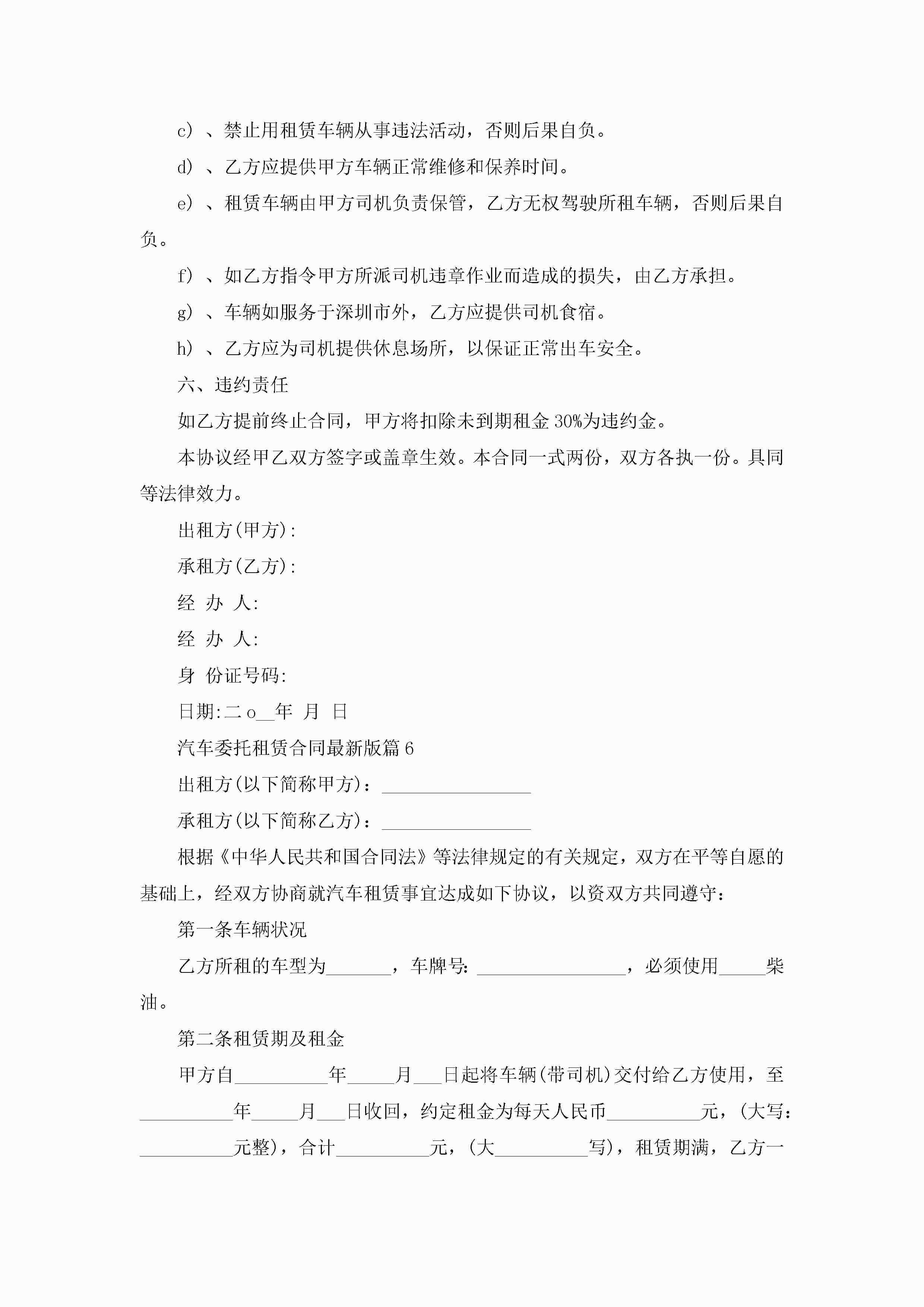 汽车委托租赁合同最新版8篇jugei3月23日 01:42发布关注421 汽车委托租赁合同最新版8篇此内容为付费资源,请付费后查看¥10.9 单篇文档限时特惠¥15个人会员开通企业会员开通立即下载无需登陆!可直接快捷下载单个模板付费资源© 版权声明THE ENDWord模板# 实用文档# 实用模板# 合同模板# 租赁合同 如有问题,可点击最底部“联系我们”联系客服 分享QQ空间微博QQ好友海报分享复制链接收藏
