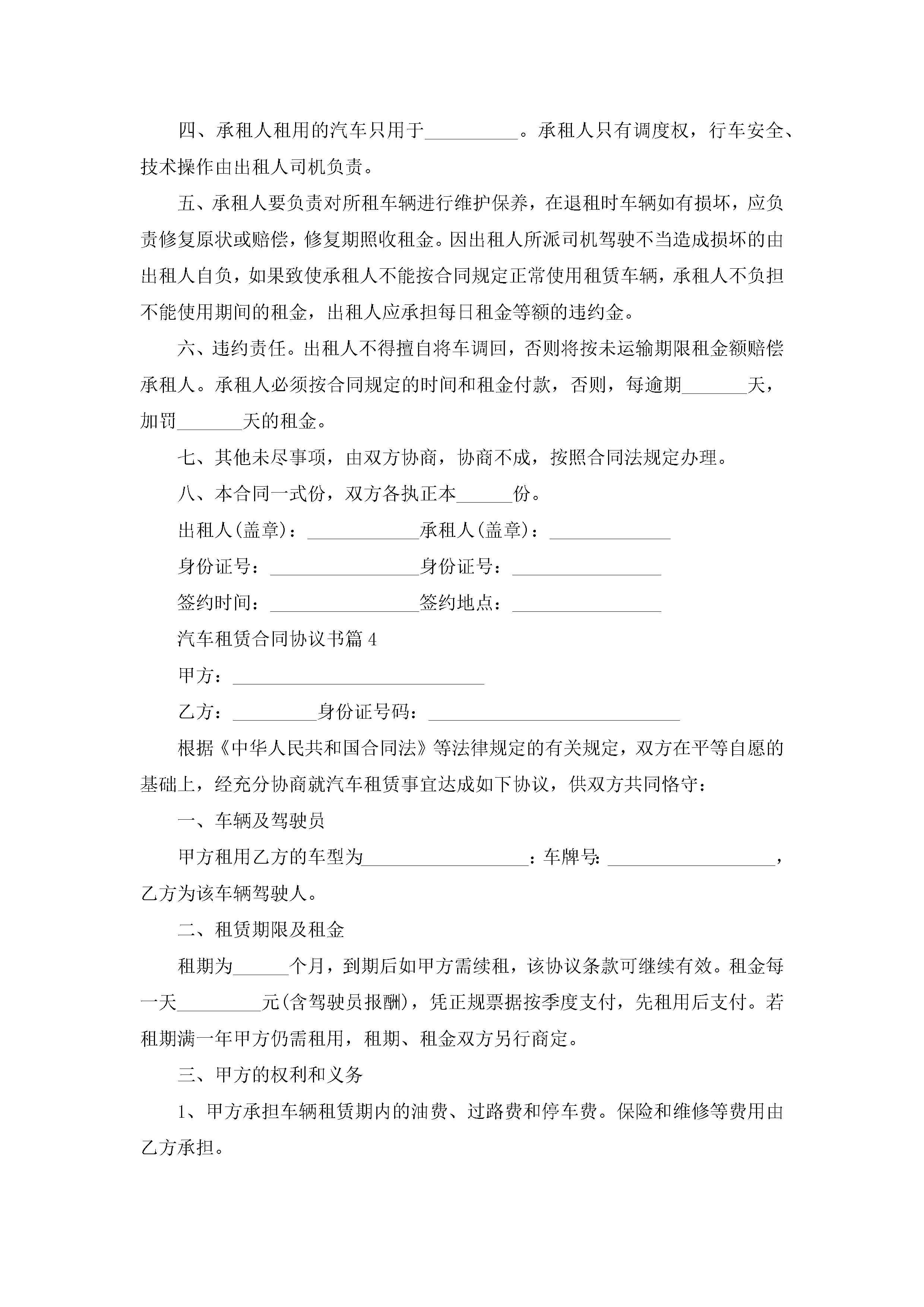汽车租赁合同协议书范文jugei3月23日 01:42发布关注198 汽车租赁合同协议书范文此内容为付费资源,请付费后查看¥10.9 单篇文档限时特惠¥15个人会员开通企业会员开通立即下载无需登陆!可直接快捷下载单个模板付费资源© 版权声明THE ENDWord模板# 实用文档# 实用模板# 合同模板# 租赁合同 如有问题,可点击最底部“联系我们”联系客服 分享QQ空间微博QQ好友海报分享复制链接收藏
