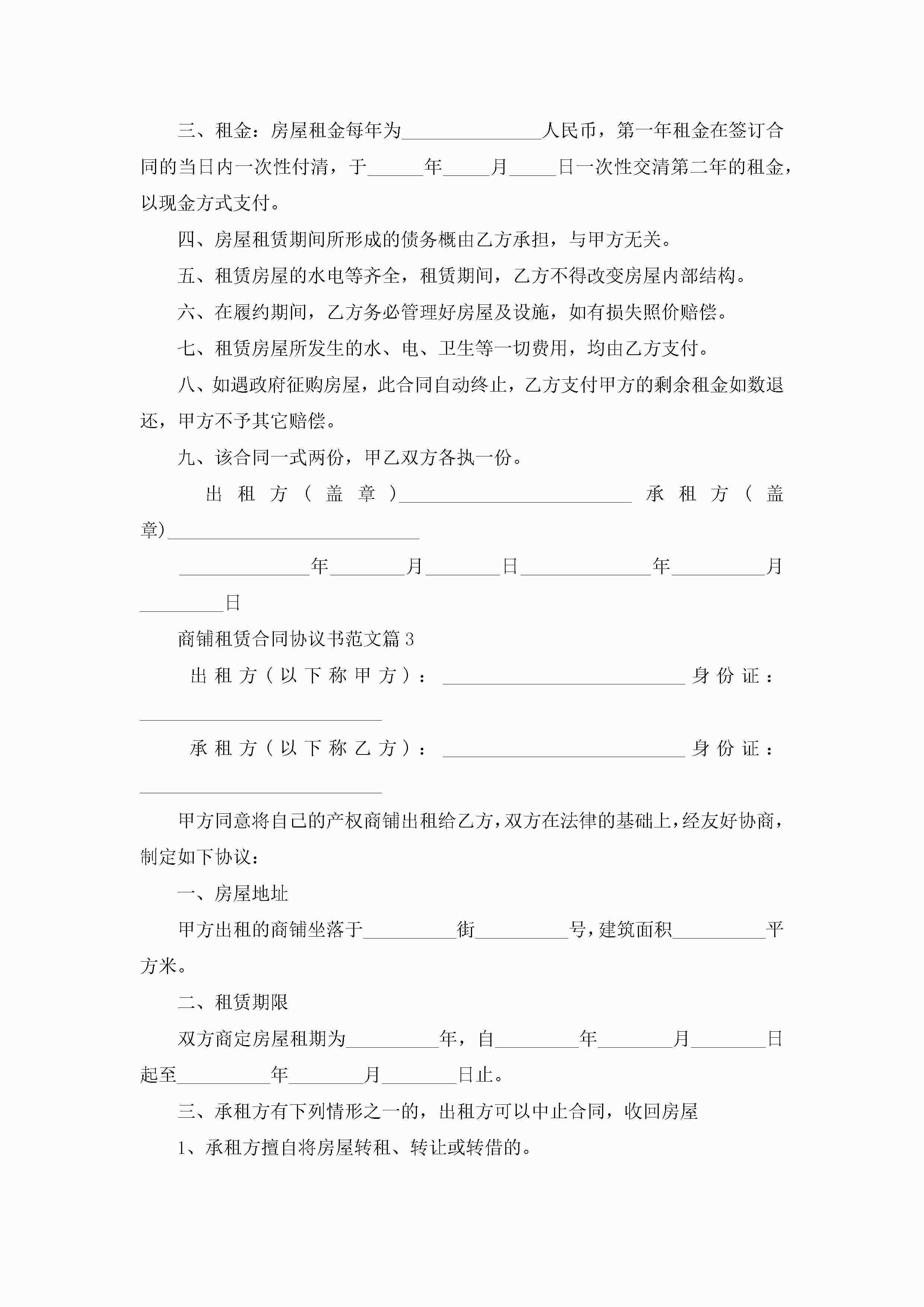 商铺租赁合同协议书最新范文jugei3月23日 01:42发布关注190 商铺租赁合同协议书最新范文此内容为付费资源,请付费后查看¥10.9 单篇文档限时特惠¥15个人会员开通企业会员开通立即下载无需登陆!可直接快捷下载单个模板付费资源© 版权声明THE ENDWord模板# 实用文档# 实用模板# 合同模板# 租赁合同 如有问题,可点击最底部“联系我们”联系客服 分享QQ空间微博QQ好友海报分享复制链接收藏