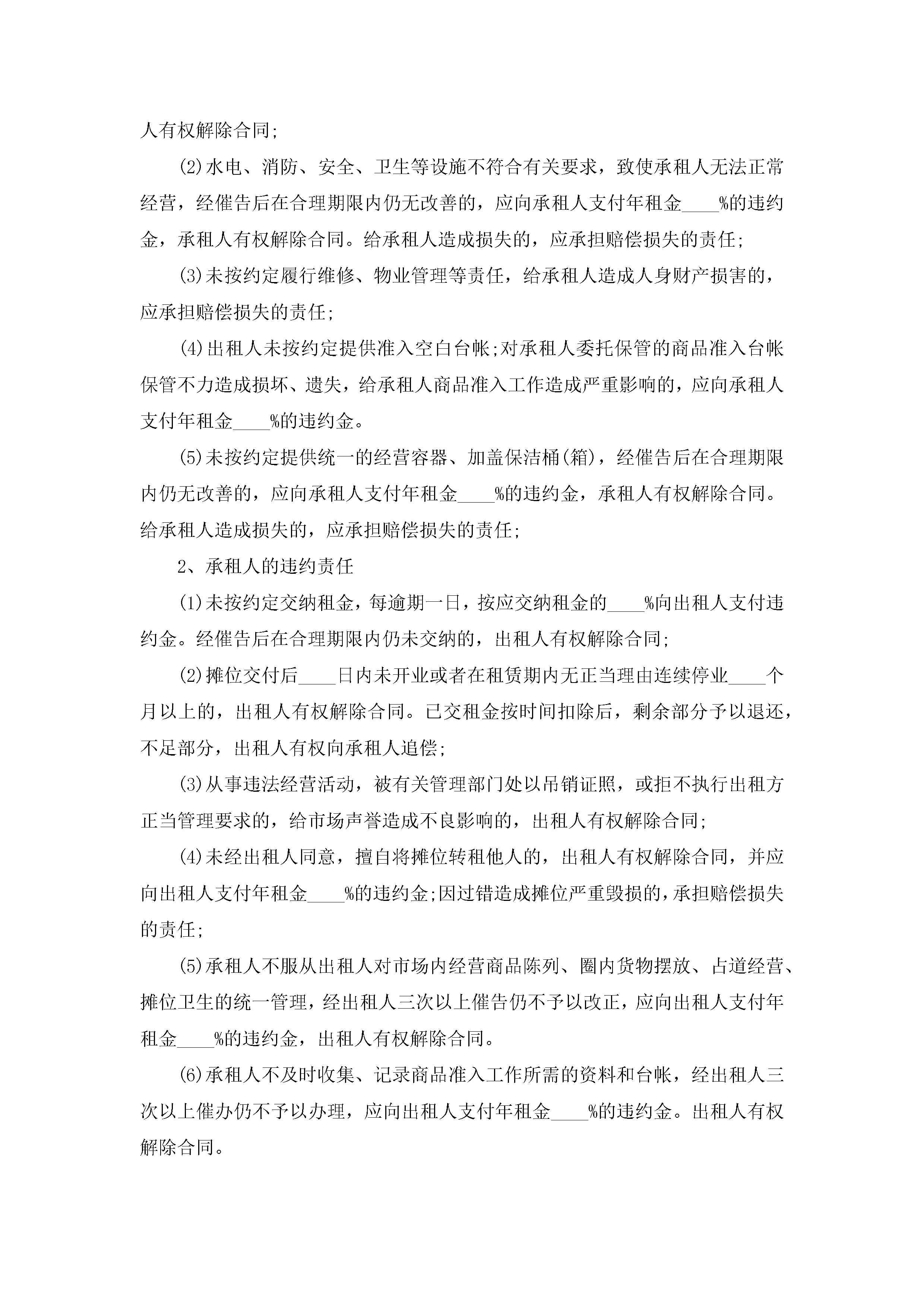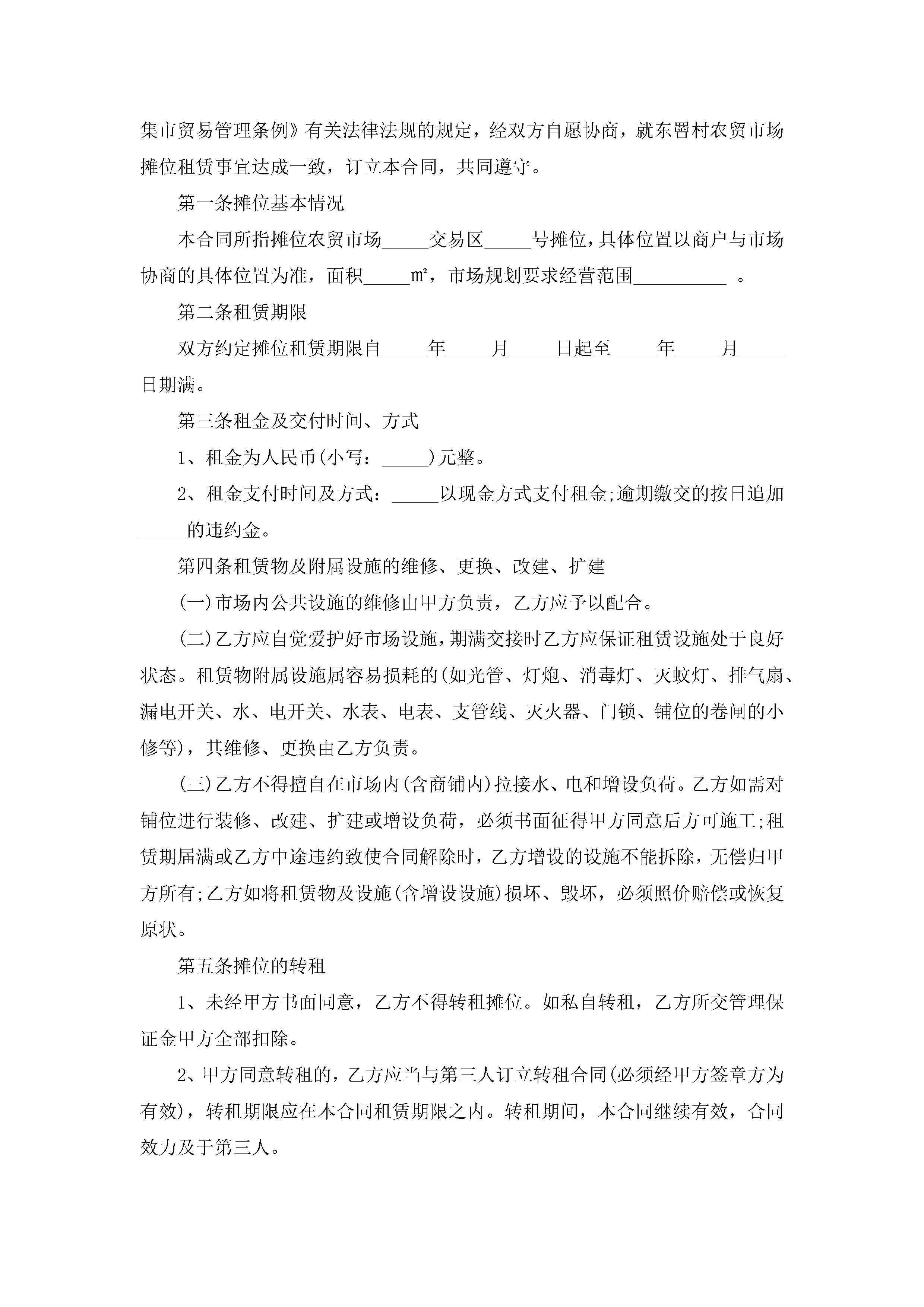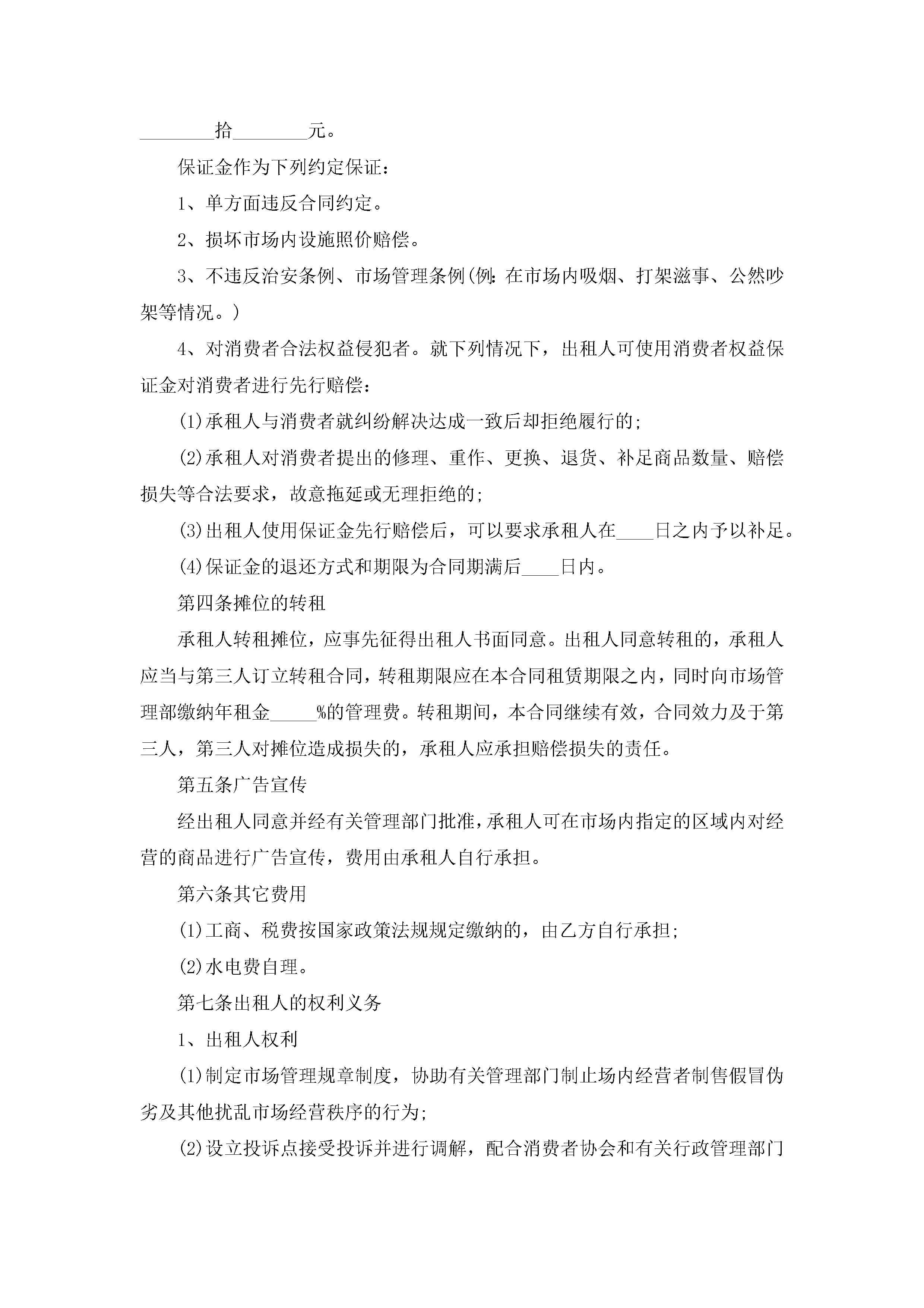 市场摊位租赁合同最新范文jugei3月23日 01:42发布关注186 市场摊位租赁合同最新范文此内容为付费资源,请付费后查看¥10.9 单篇文档限时特惠¥15个人会员开通企业会员开通立即下载无需登陆!可直接快捷下载单个模板付费资源© 版权声明THE ENDWord模板# 实用文档# 实用模板# 合同模板# 租赁合同 如有问题,可点击最底部“联系我们”联系客服 分享QQ空间微博QQ好友海报分享复制链接收藏