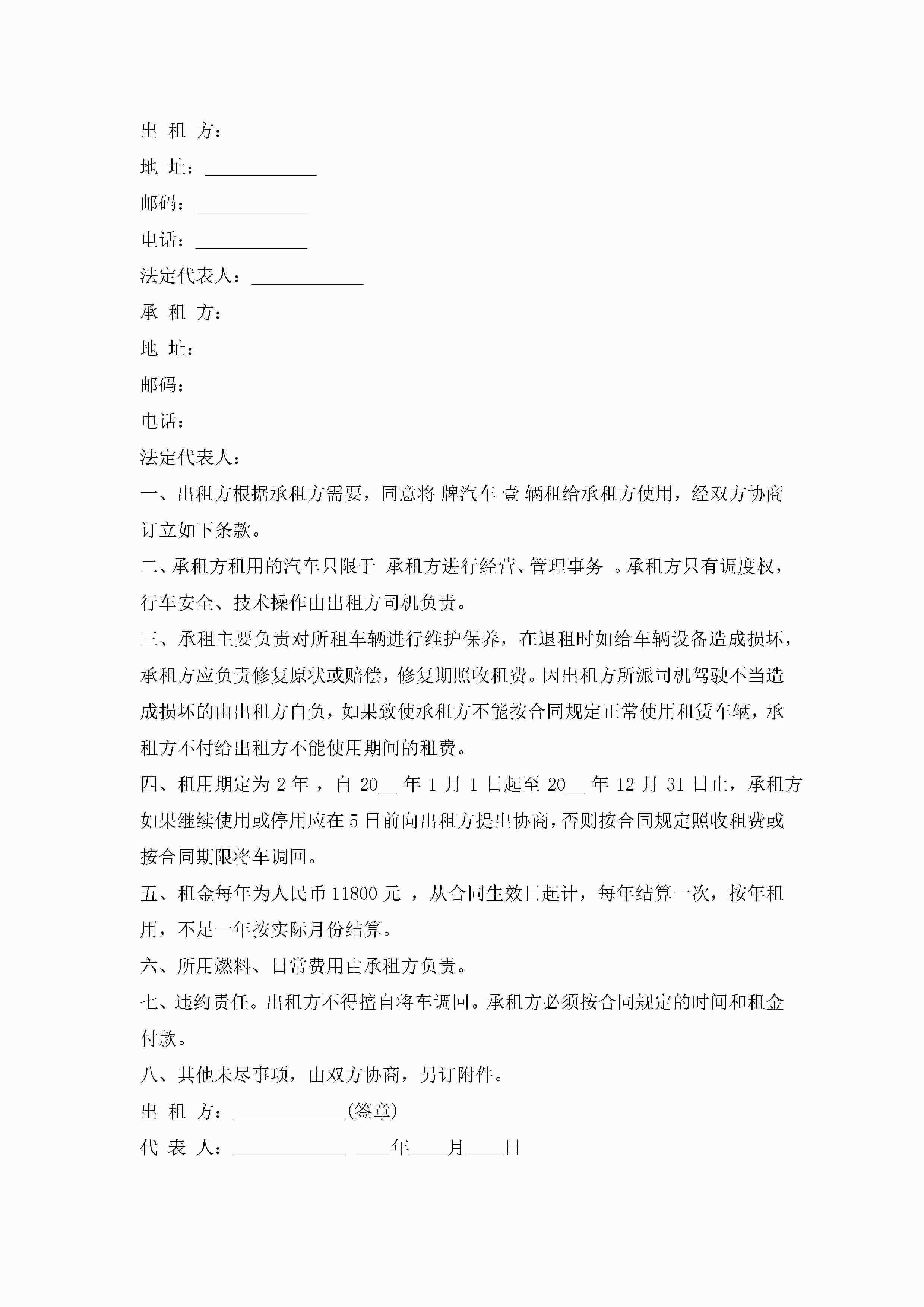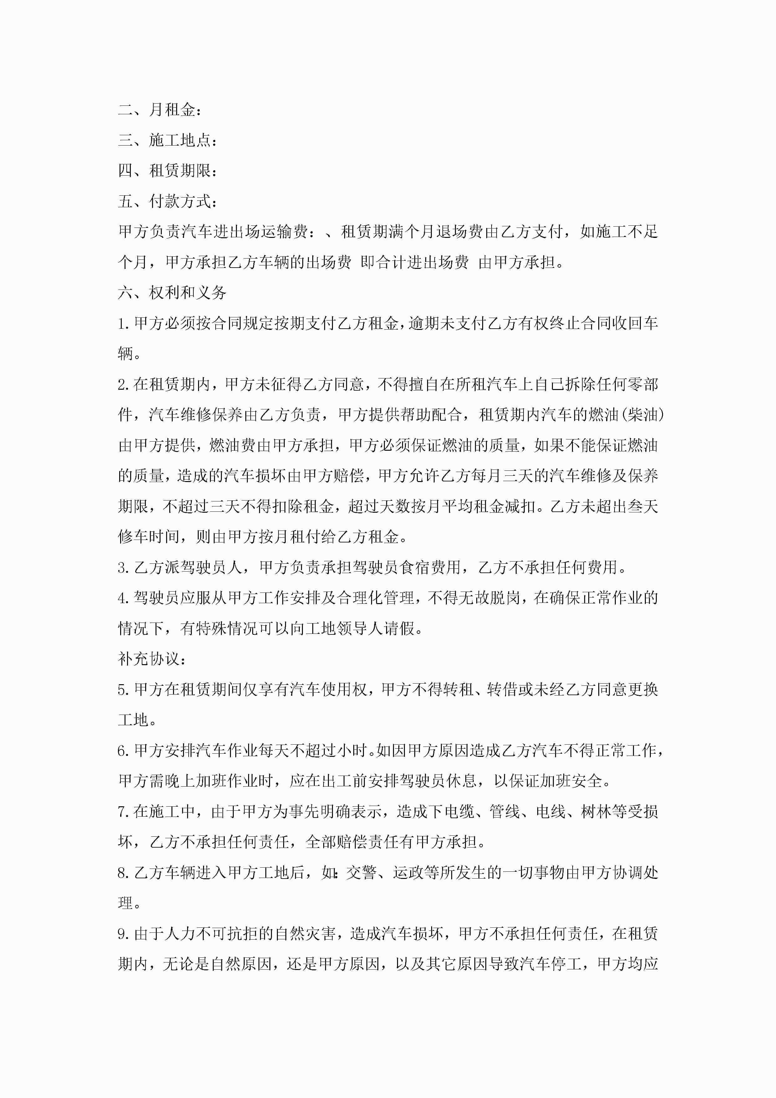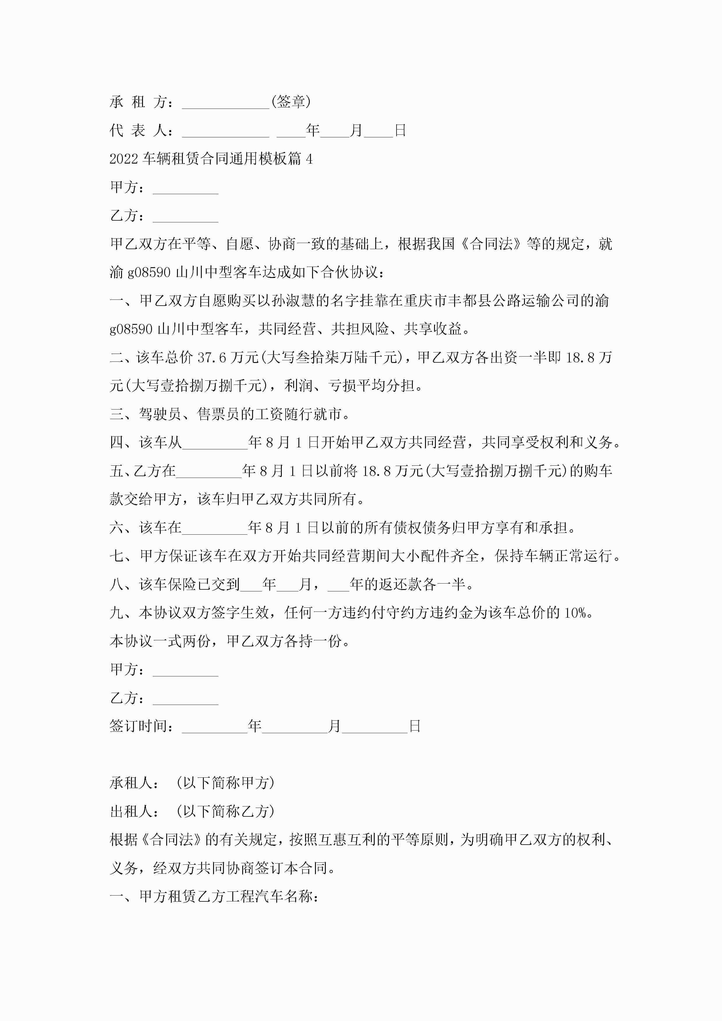 2022车辆租赁合同通用范文模板jugei3月23日 01:43发布关注232 2022车辆租赁合同通用范文模板此内容为付费资源,请付费后查看¥10.9 单篇文档限时特惠¥15个人会员开通企业会员开通立即下载无需登陆!可直接快捷下载单个模板付费资源© 版权声明THE ENDWord模板# 实用文档# 实用模板# 合同模板# 租赁合同 如有问题,可点击最底部“联系我们”联系客服 分享QQ空间微博QQ好友海报分享复制链接收藏