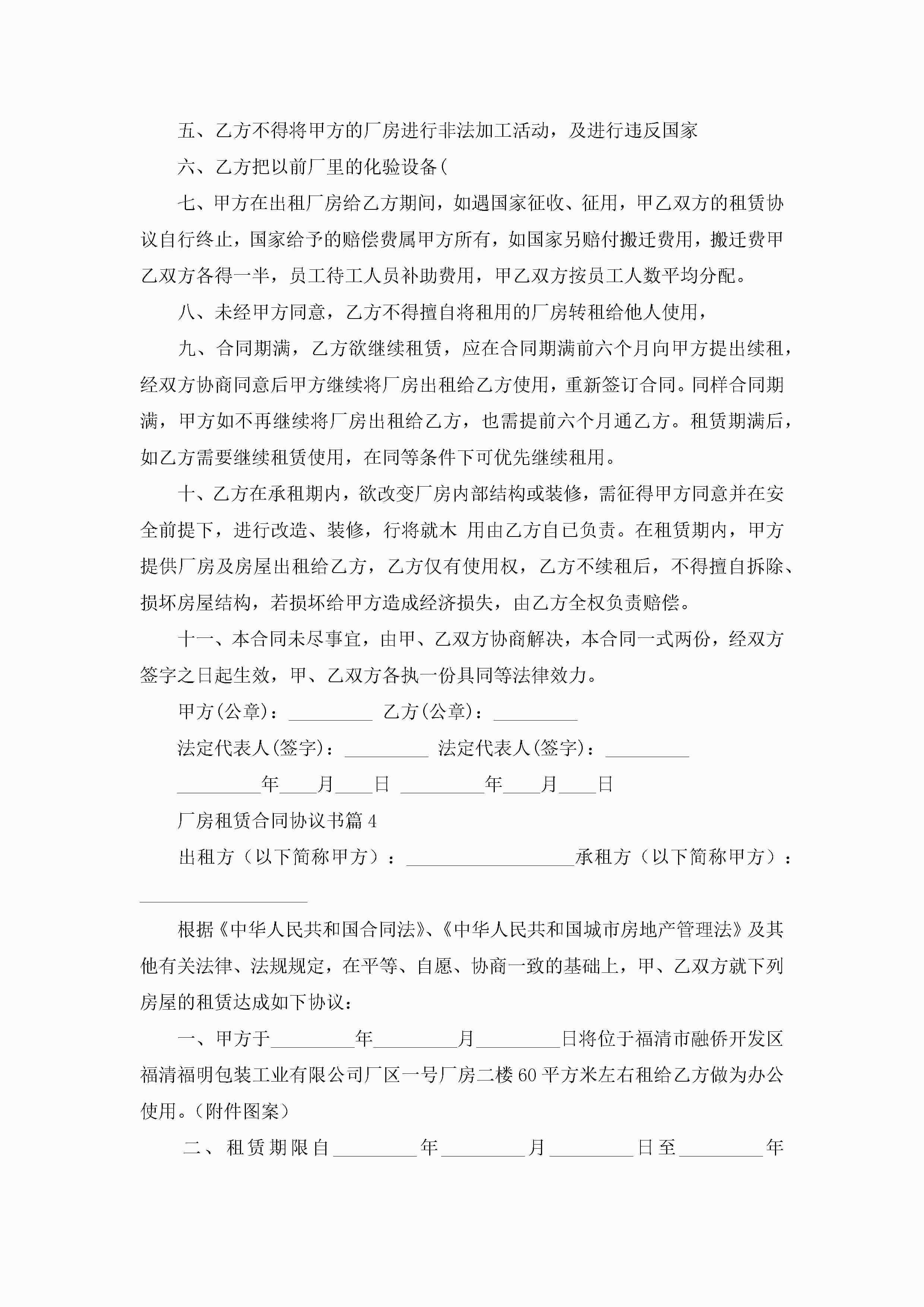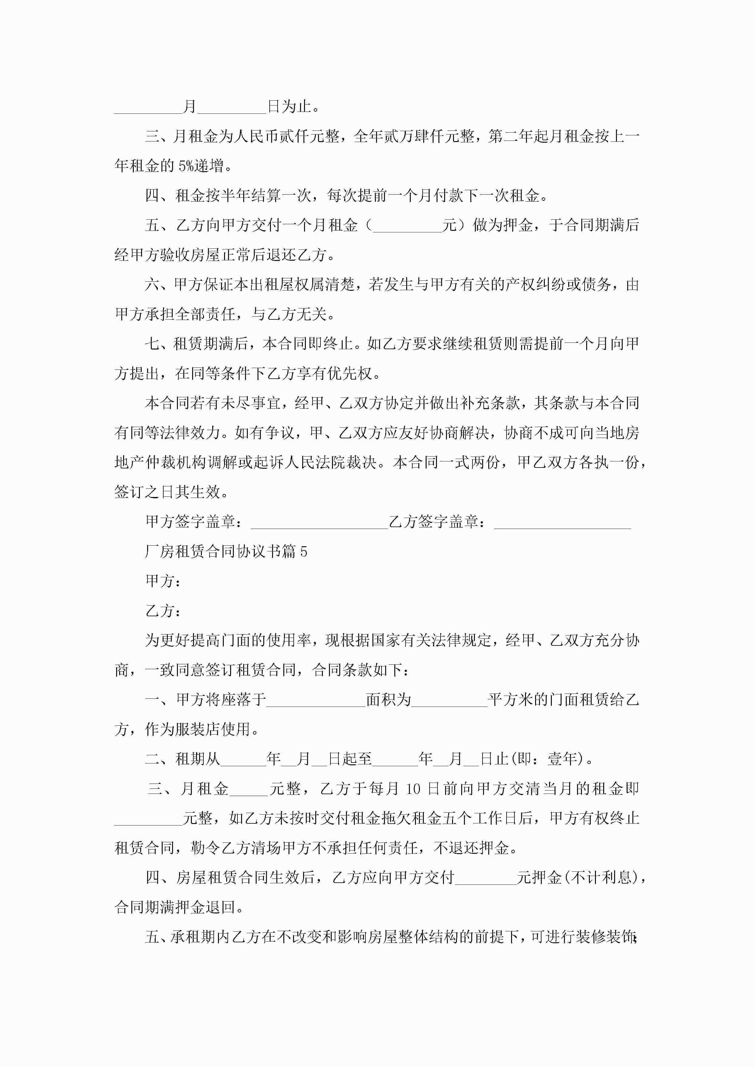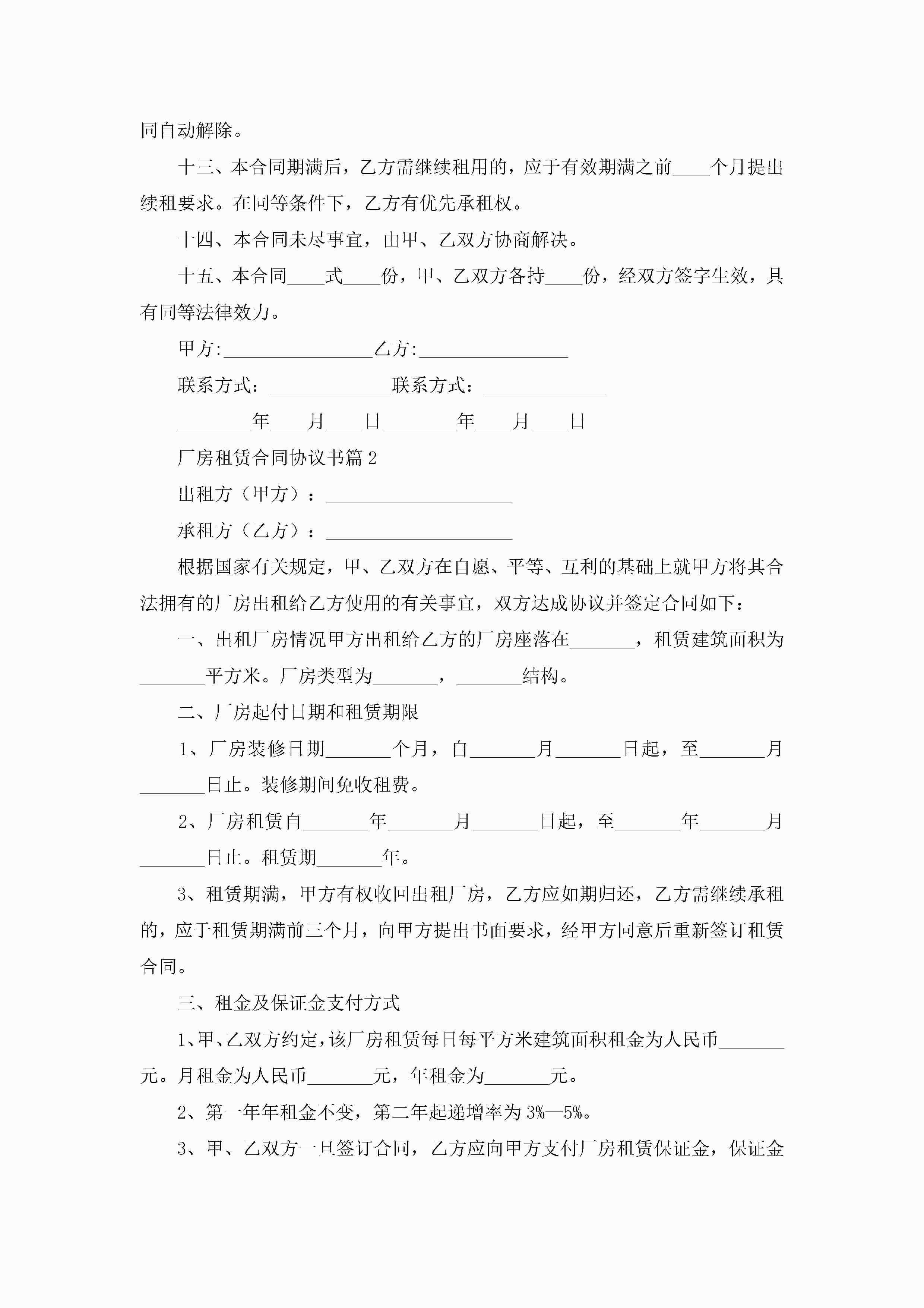 厂房租赁合同协议书【7篇】jugei3月23日 01:43发布关注240 厂房租赁合同协议书【7篇】此内容为付费资源,请付费后查看¥10.9 单篇文档限时特惠¥15个人会员开通企业会员开通立即下载无需登陆!可直接快捷下载单个模板付费资源© 版权声明THE ENDWord模板# 实用文档# 实用模板# 合同模板# 租赁合同 如有问题,可点击最底部“联系我们”联系客服 分享QQ空间微博QQ好友海报分享复制链接收藏