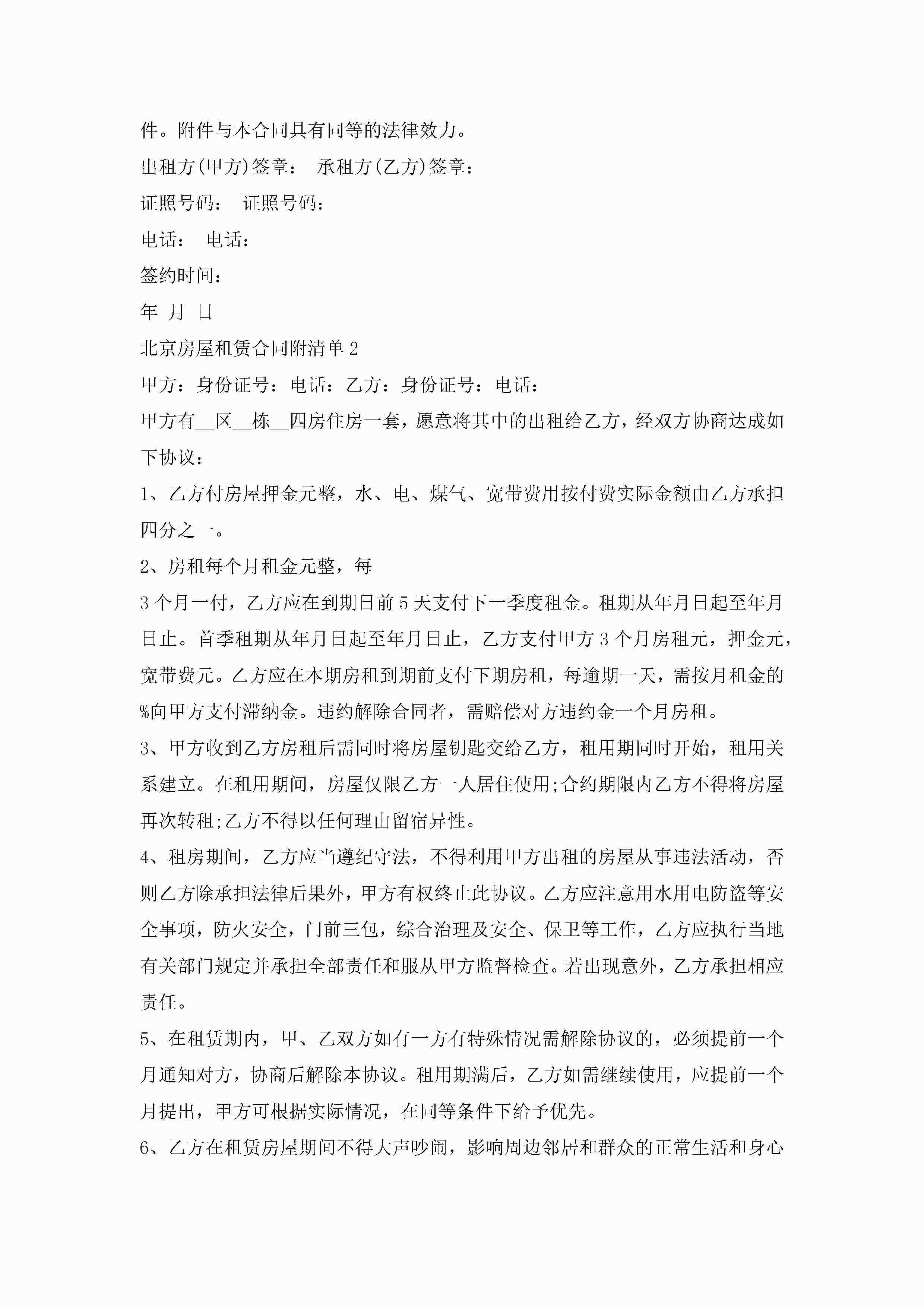 北京房屋租赁合同附清单5篇jugei3月23日 01:43发布关注185 北京房屋租赁合同附清单5篇此内容为付费资源,请付费后查看¥10.9 单篇文档限时特惠¥15个人会员开通企业会员开通立即下载无需登陆!可直接快捷下载单个模板付费资源© 版权声明THE ENDWord模板# 实用文档# 实用模板# 合同模板# 租赁合同 如有问题,可点击最底部“联系我们”联系客服 分享QQ空间微博QQ好友海报分享复制链接收藏