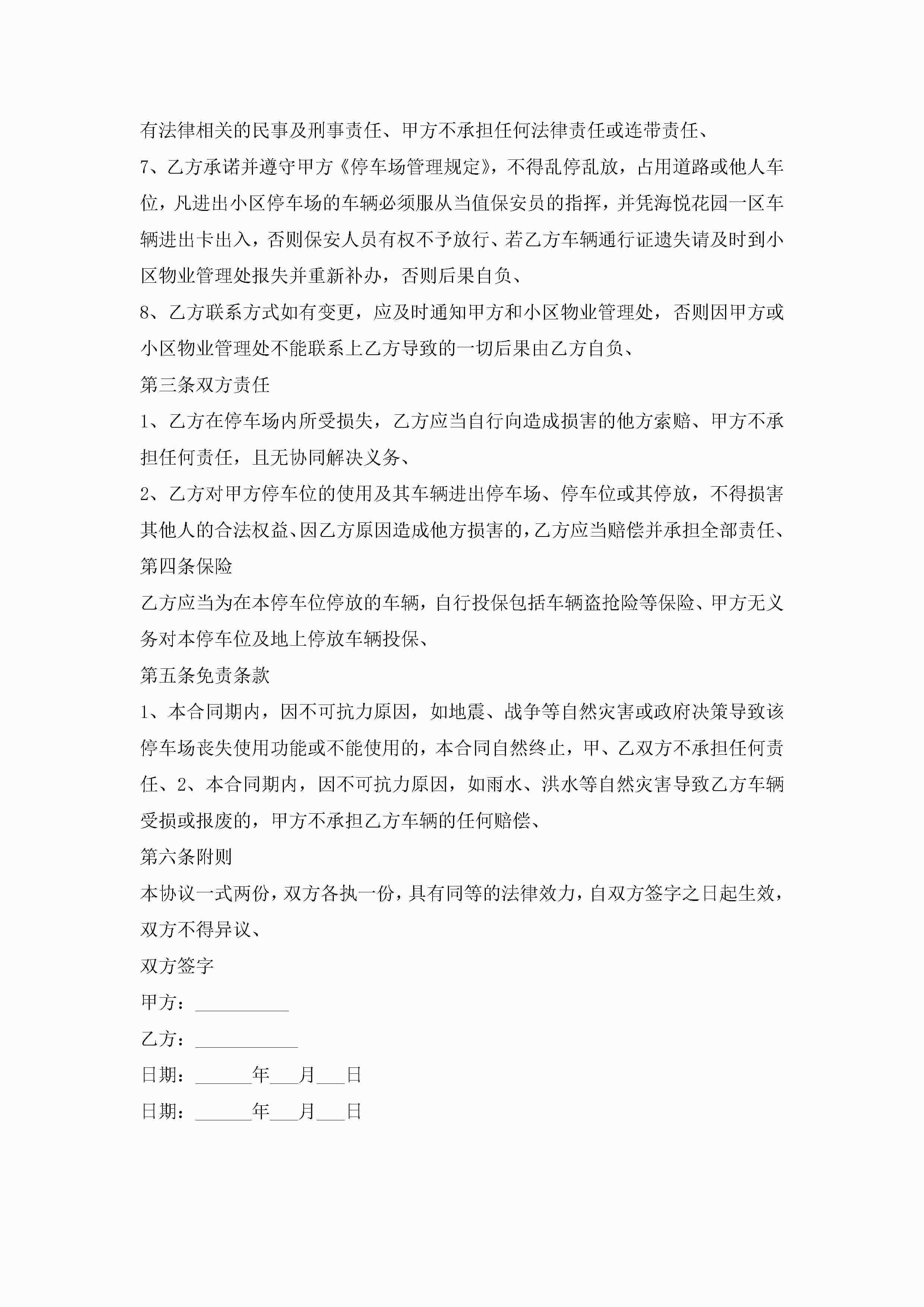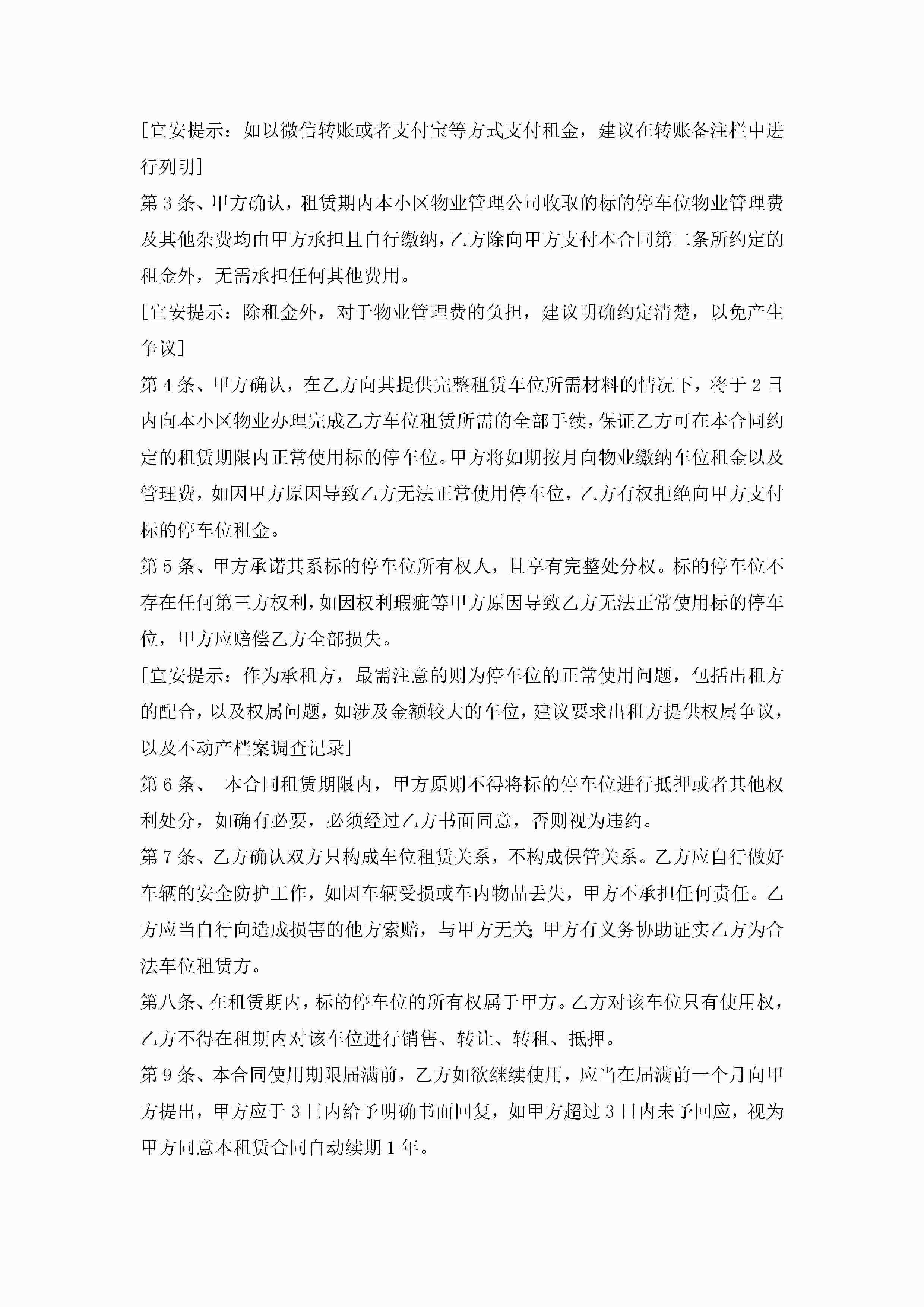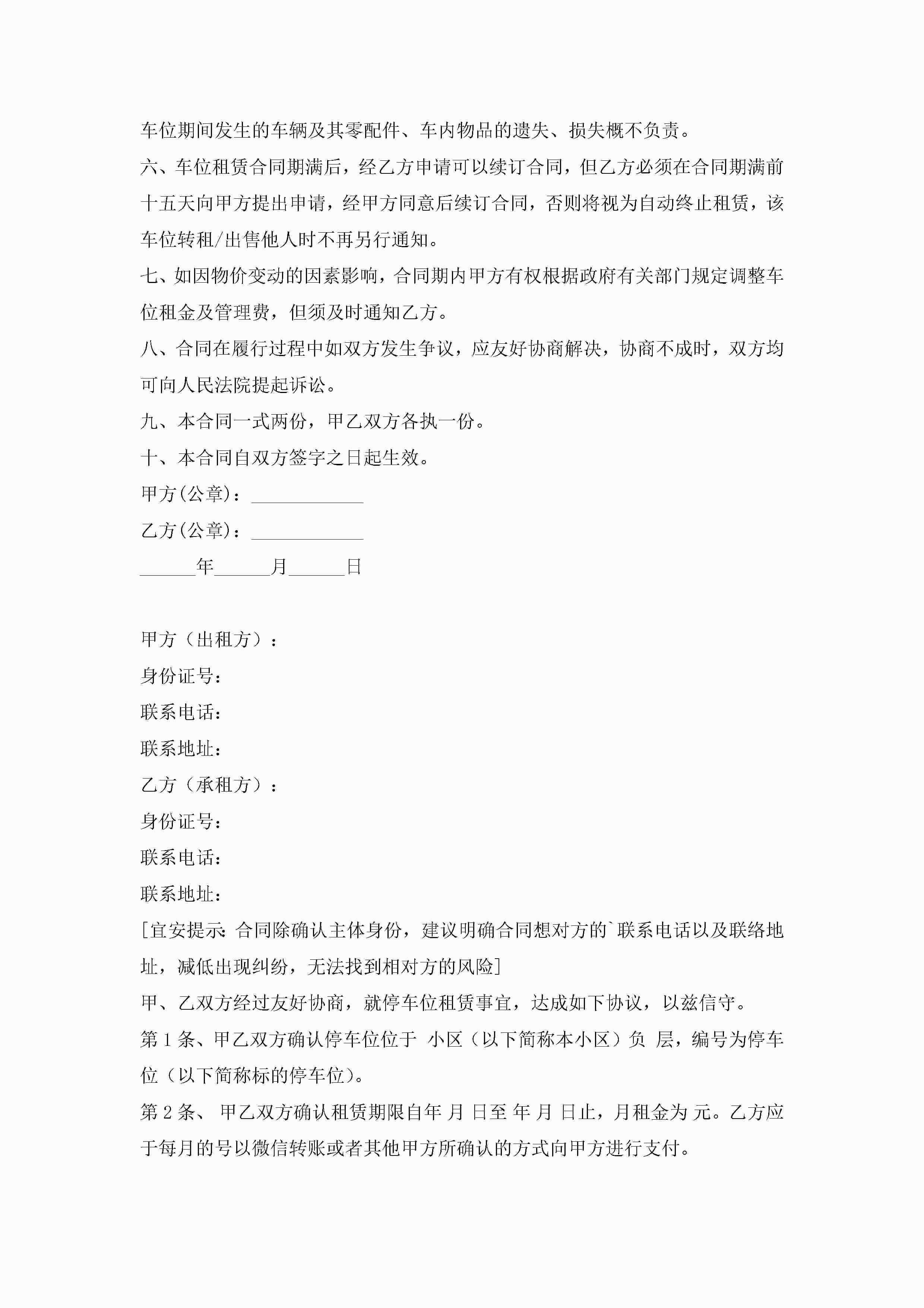 私人车位租赁合同范本7篇jugei3月23日 01:43发布关注256 私人车位租赁合同范本7篇此内容为付费资源,请付费后查看¥10.9 单篇文档限时特惠¥15个人会员开通企业会员开通立即下载无需登陆!可直接快捷下载单个模板付费资源© 版权声明THE ENDWord模板# 实用文档# 实用模板# 合同模板# 租赁合同 如有问题,可点击最底部“联系我们”联系客服 分享QQ空间微博QQ好友海报分享复制链接收藏