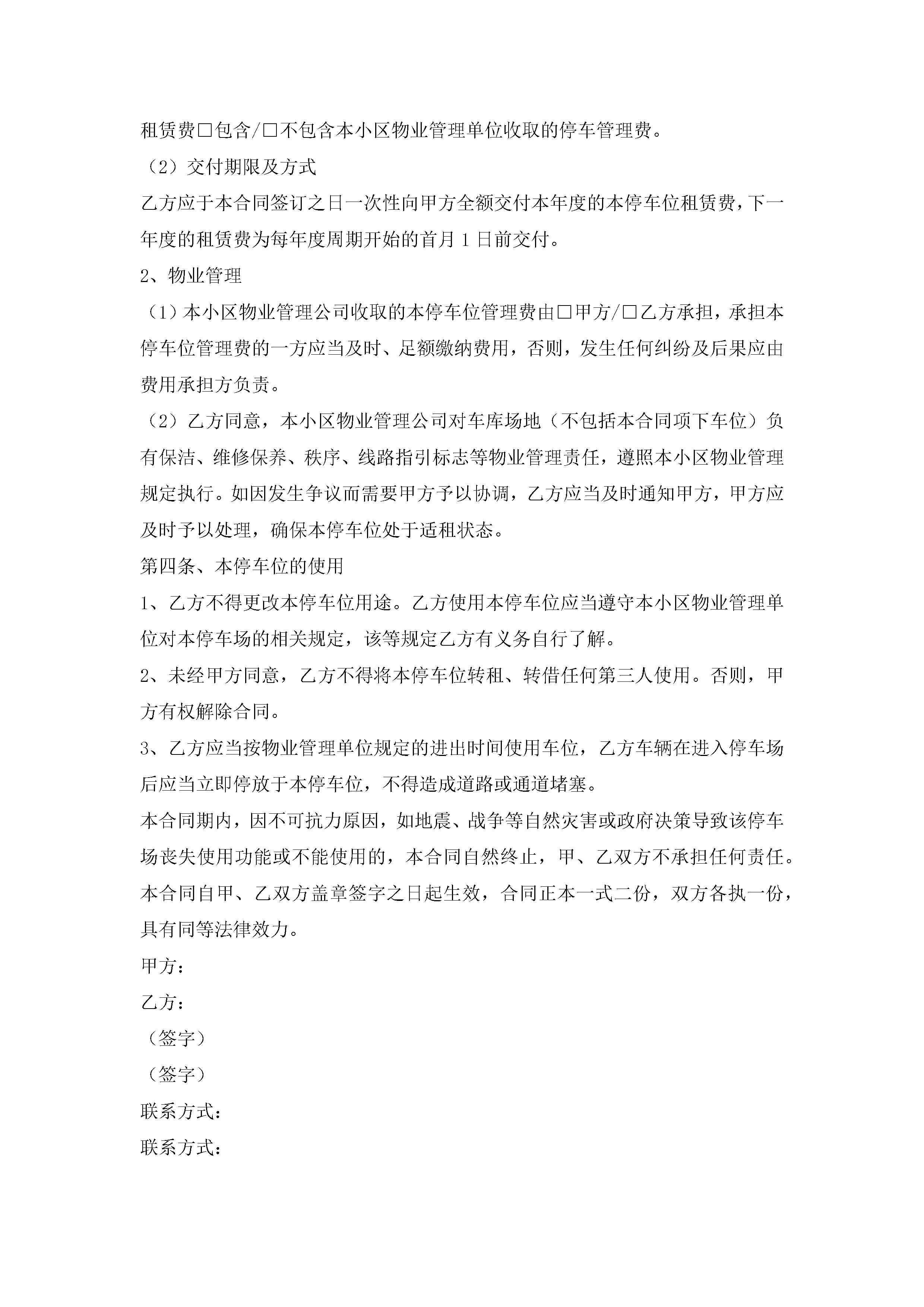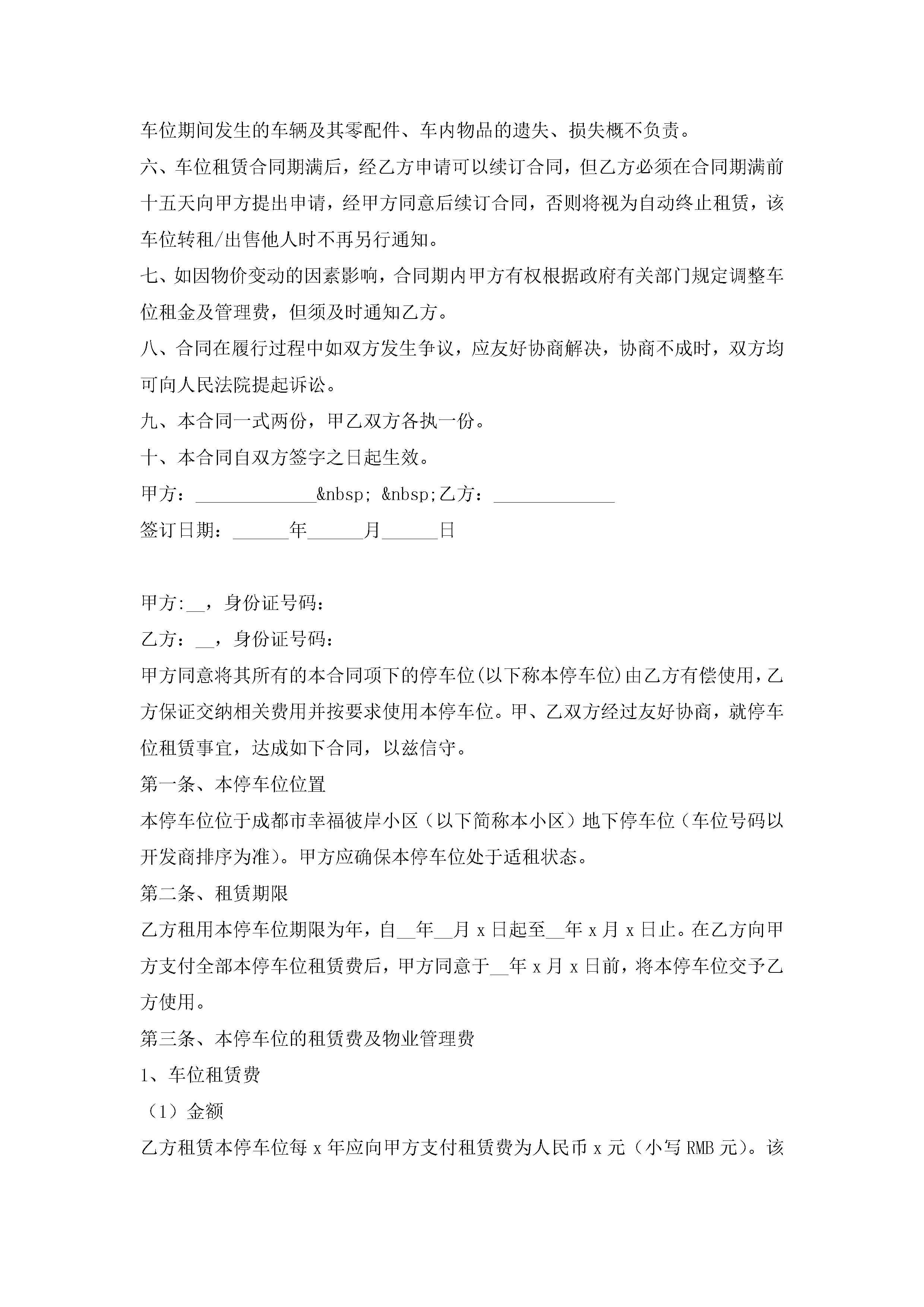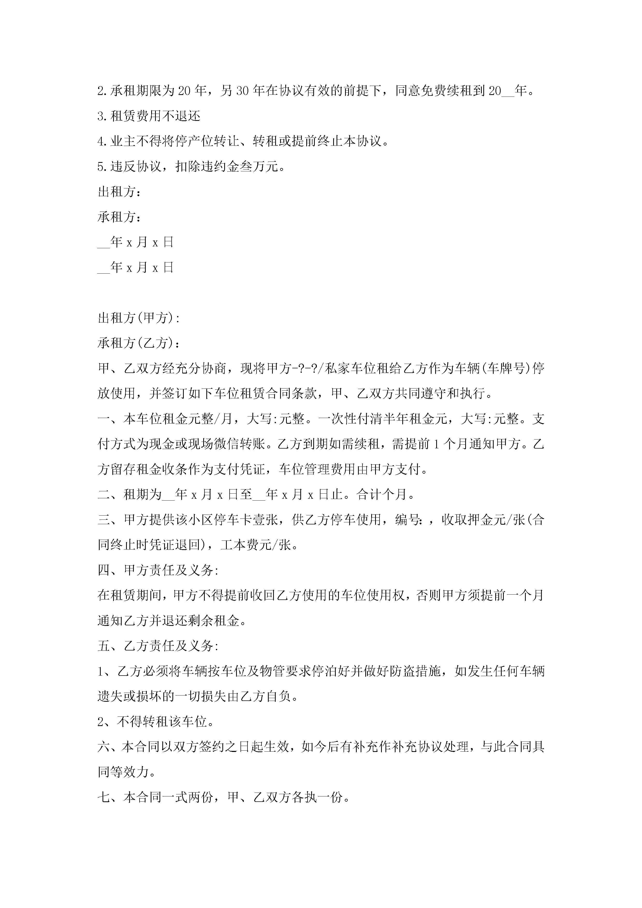 停车位租赁合同协议书7篇jugei3月23日 01:43发布关注187 停车位租赁合同协议书7篇此内容为付费资源,请付费后查看¥10.9 单篇文档限时特惠¥15个人会员开通企业会员开通立即下载无需登陆!可直接快捷下载单个模板付费资源© 版权声明THE ENDWord模板# 实用文档# 实用模板# 合同模板# 租赁合同 如有问题,可点击最底部“联系我们”联系客服 分享QQ空间微博QQ好友海报分享复制链接收藏