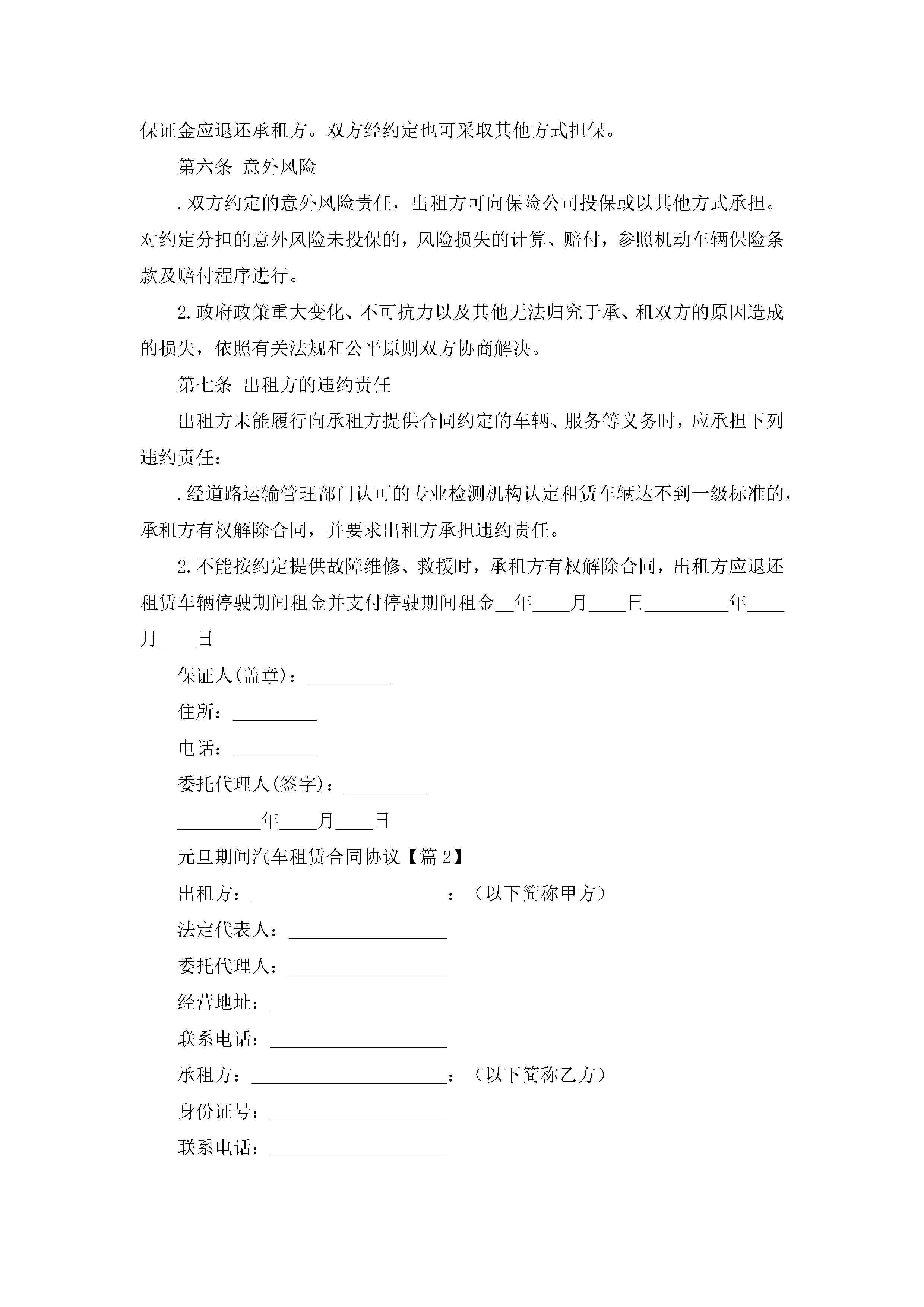 元旦期间汽车租赁合同协议(精选7篇)jugei3月23日 01:43发布关注212 元旦期间汽车租赁合同协议(精选7篇)此内容为付费资源,请付费后查看¥10.9 单篇文档限时特惠¥15个人会员开通企业会员开通立即下载无需登陆!可直接快捷下载单个模板付费资源© 版权声明THE ENDWord模板# 实用文档# 实用模板# 合同模板# 租赁合同 如有问题,可点击最底部“联系我们”联系客服 分享QQ空间微博QQ好友海报分享复制链接收藏