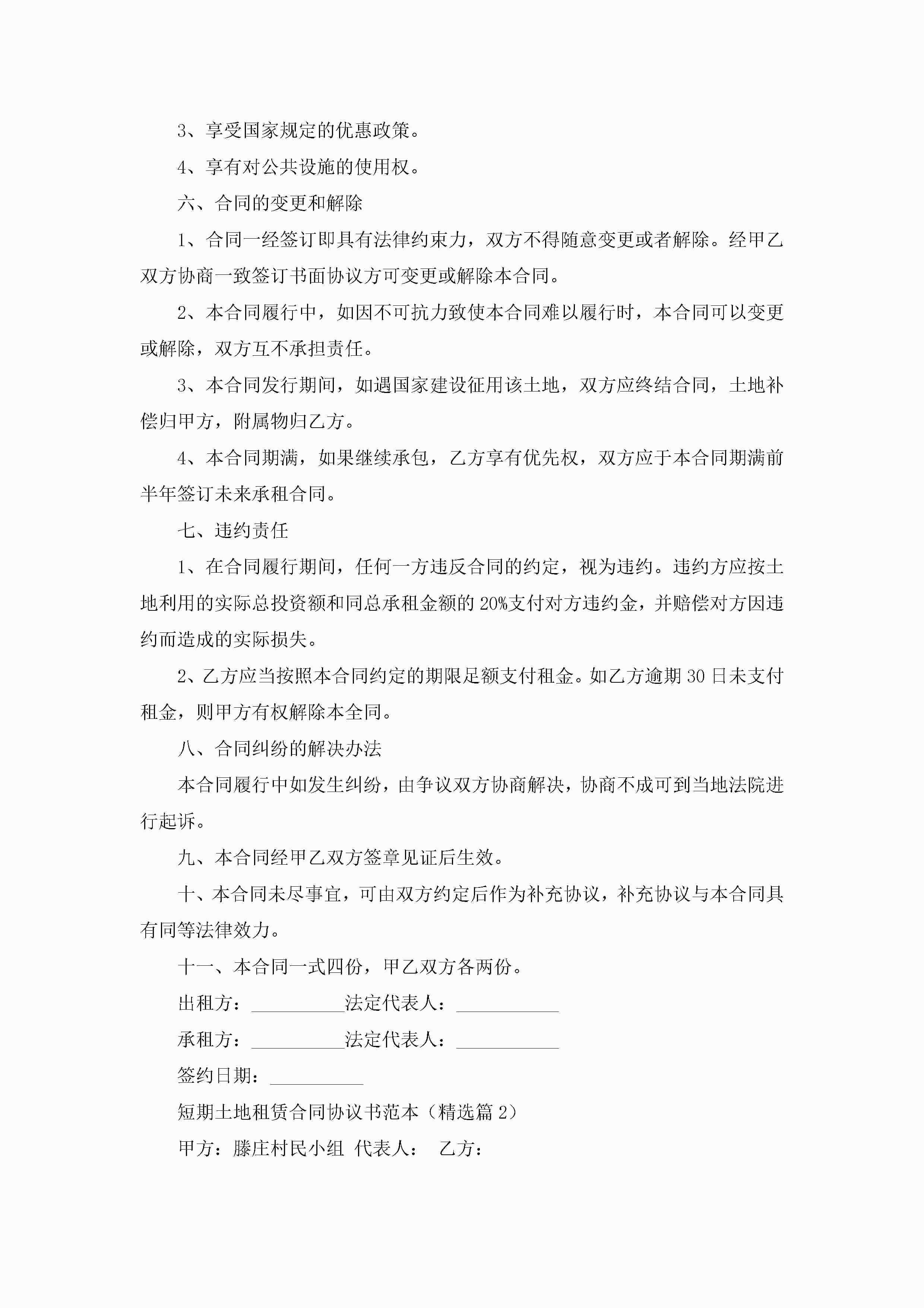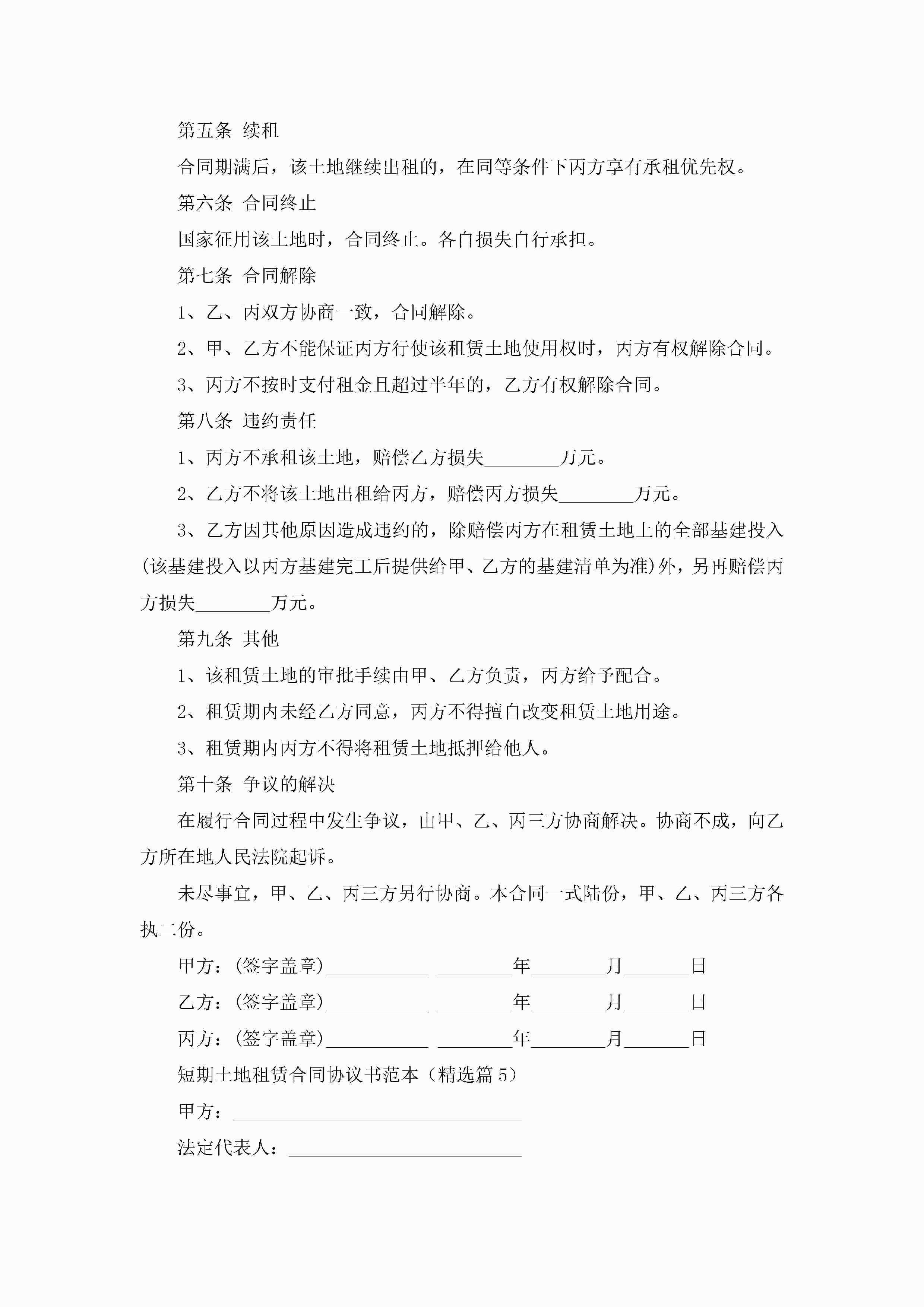 短期土地租赁合同协议书范本(精选7篇)jugei3月23日 01:43发布关注187 短期土地租赁合同协议书范本(精选7篇)此内容为付费资源,请付费后查看¥10.9 单篇文档限时特惠¥15个人会员开通企业会员开通立即下载无需登陆!可直接快捷下载单个模板付费资源© 版权声明THE ENDWord模板# 实用文档# 实用模板# 合同模板# 租赁合同 如有问题,可点击最底部“联系我们”联系客服 分享QQ空间微博QQ好友海报分享复制链接收藏