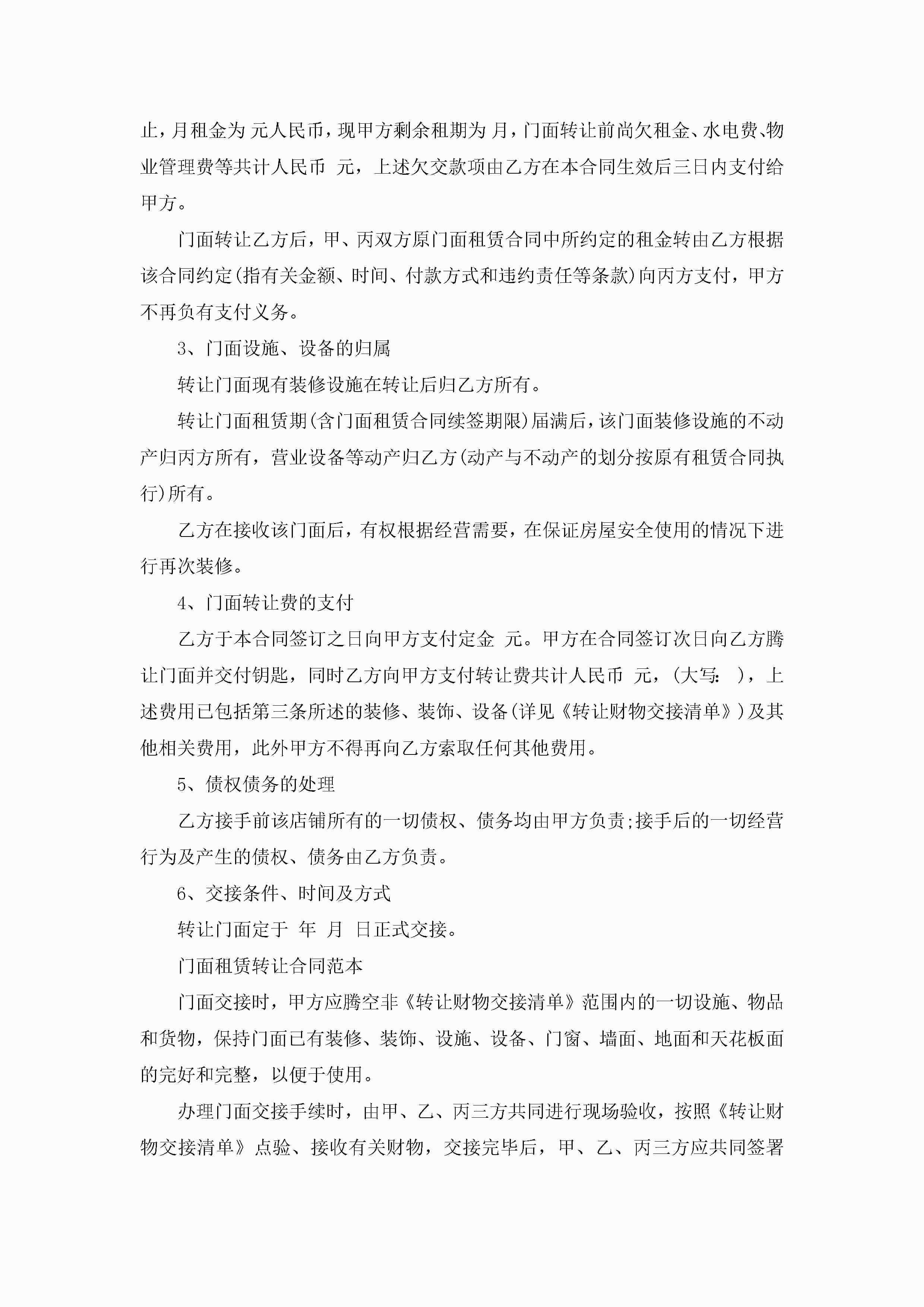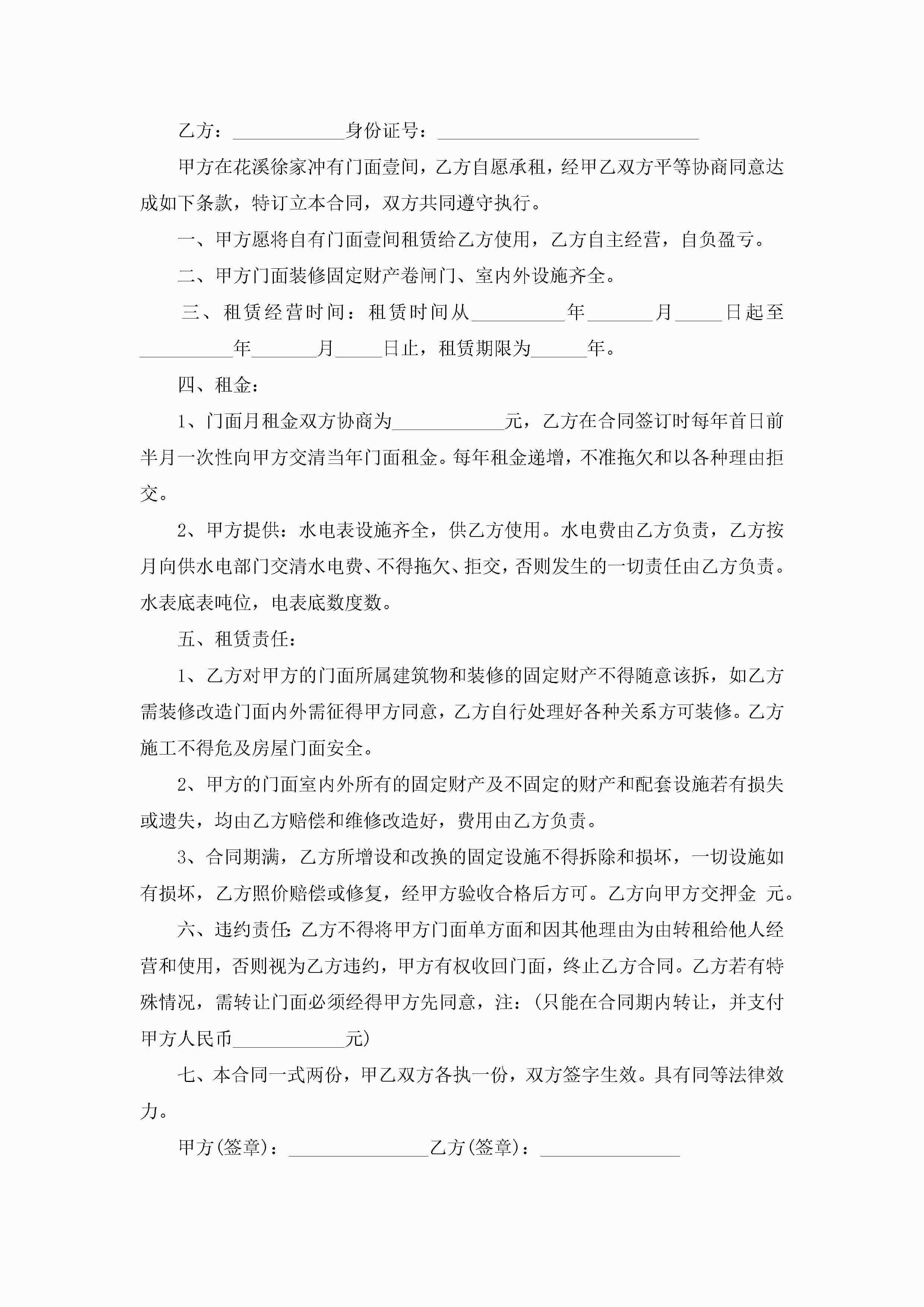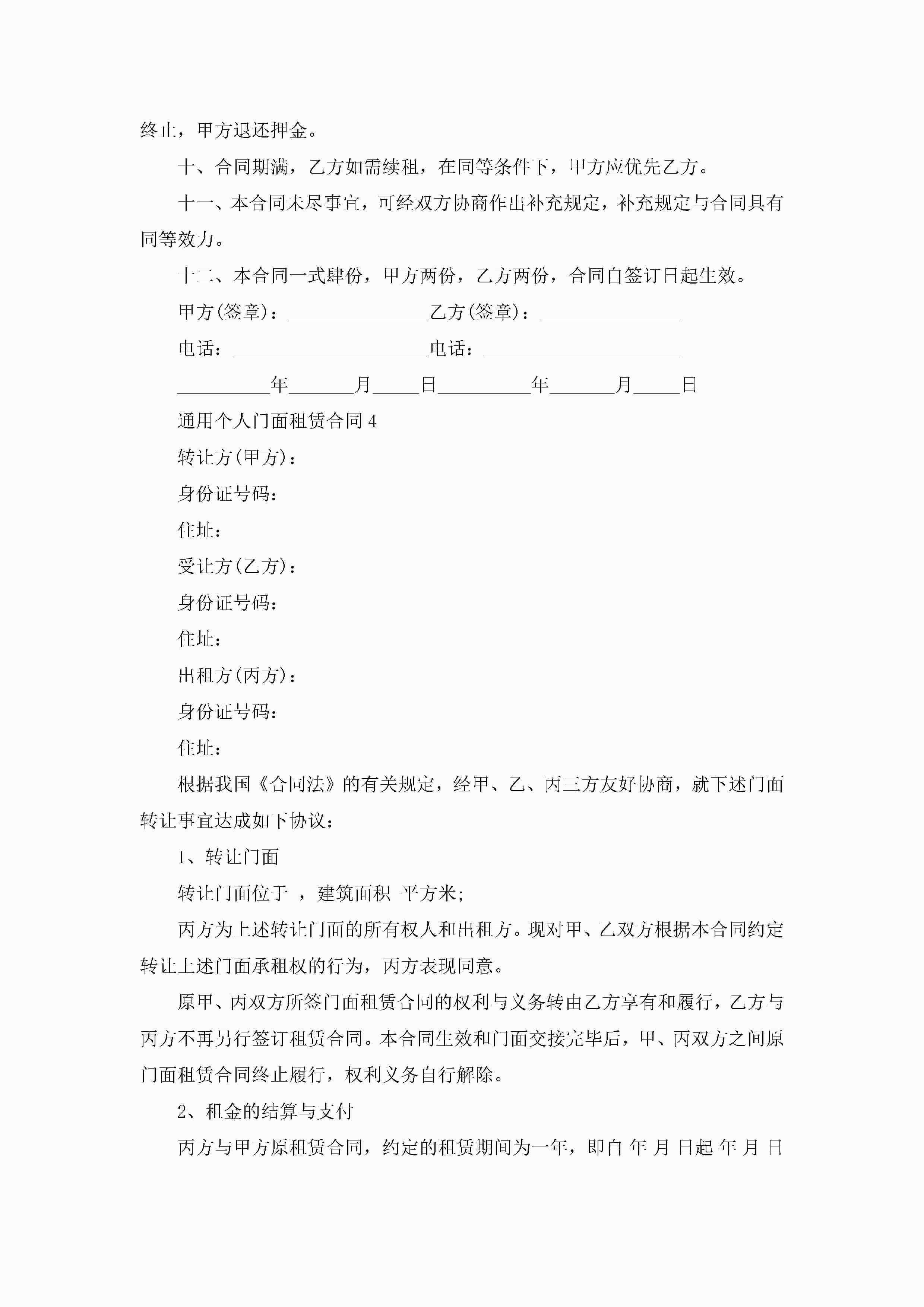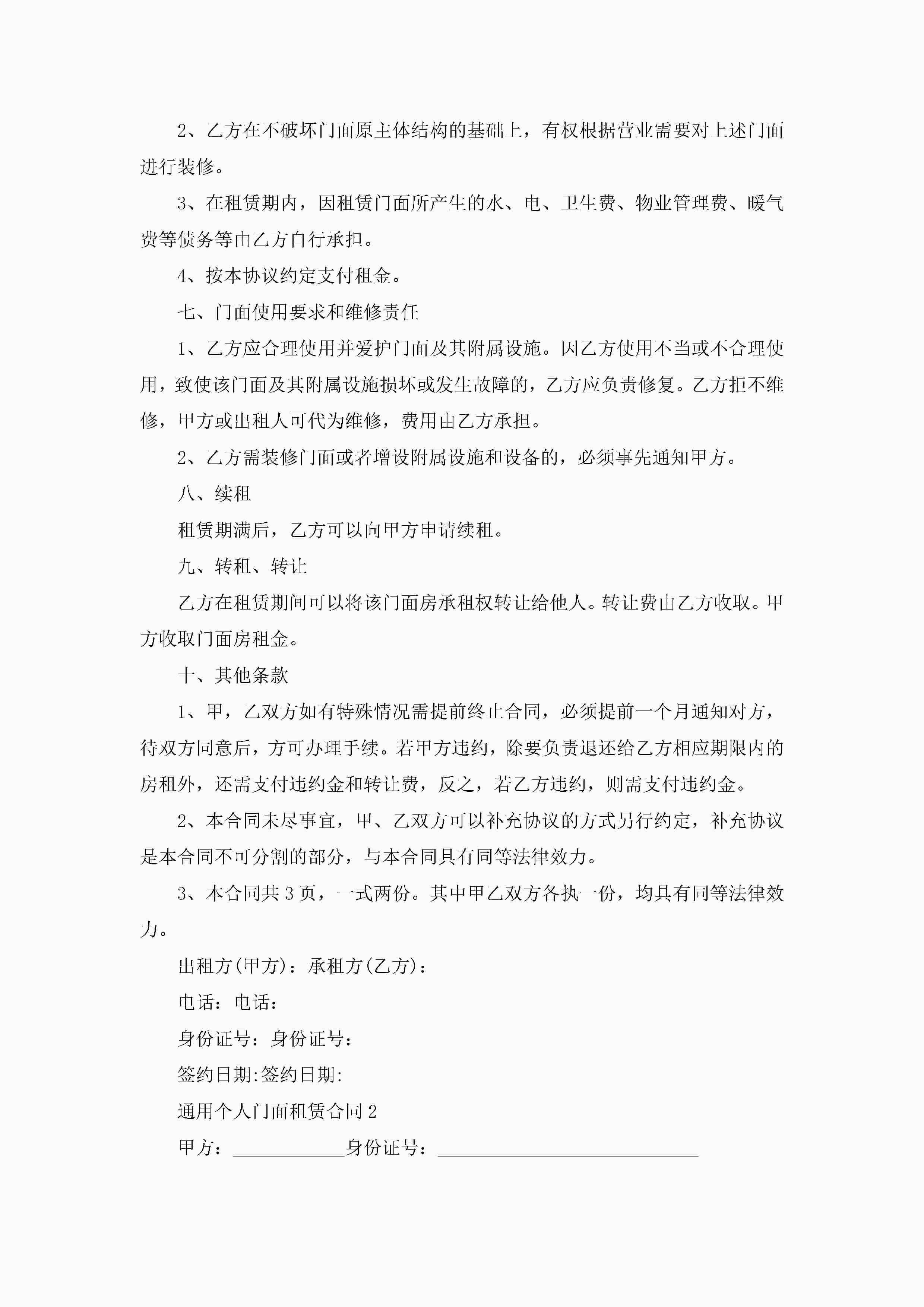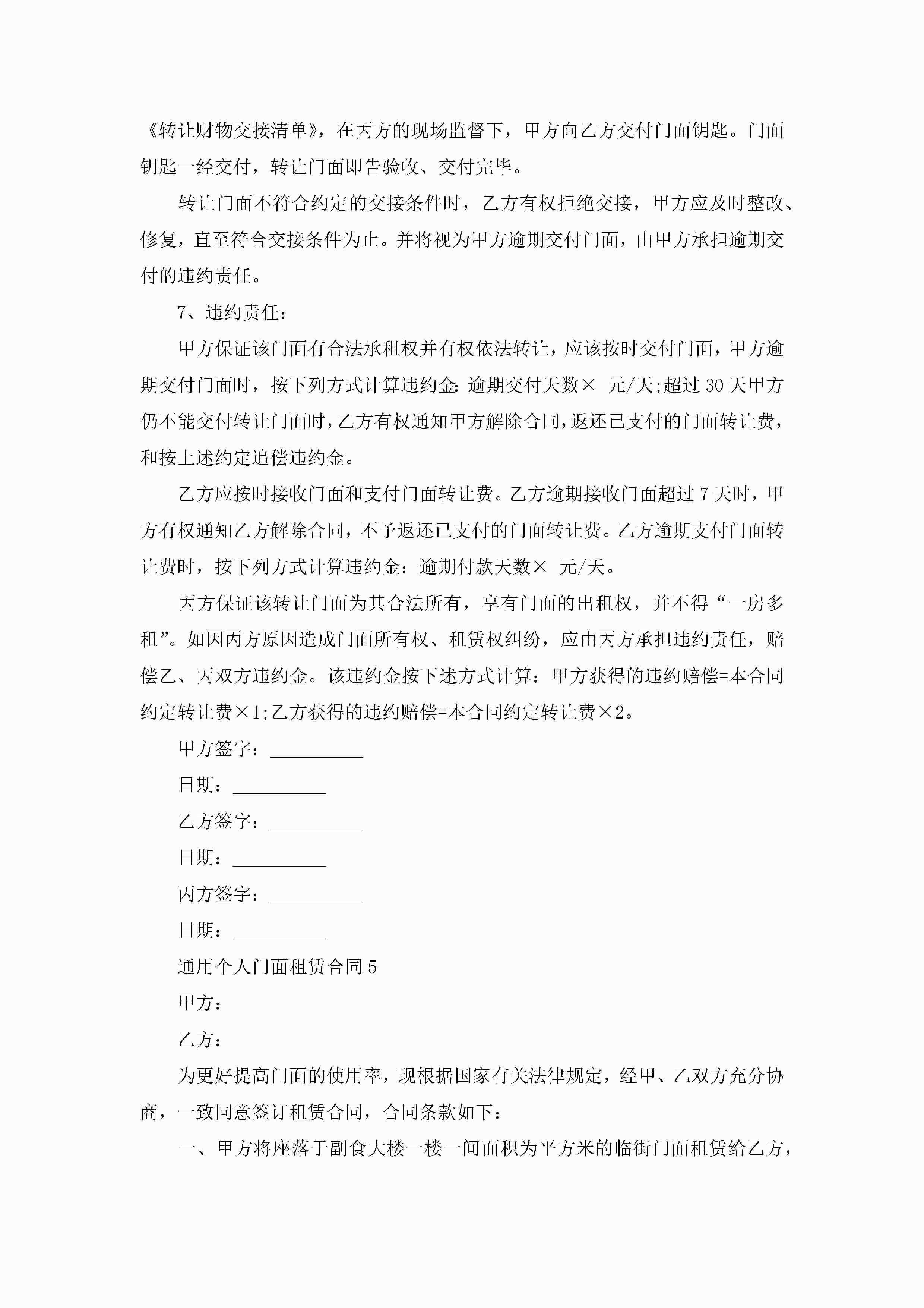 通用个人门面租赁合同范文5篇jugei3月23日 01:43发布关注199 通用个人门面租赁合同范文5篇此内容为付费资源,请付费后查看¥10.9 单篇文档限时特惠¥15个人会员开通企业会员开通立即下载无需登陆!可直接快捷下载单个模板付费资源© 版权声明THE ENDWord模板# 实用文档# 实用模板# 合同模板# 租赁合同 如有问题,可点击最底部“联系我们”联系客服 分享QQ空间微博QQ好友海报分享复制链接收藏
