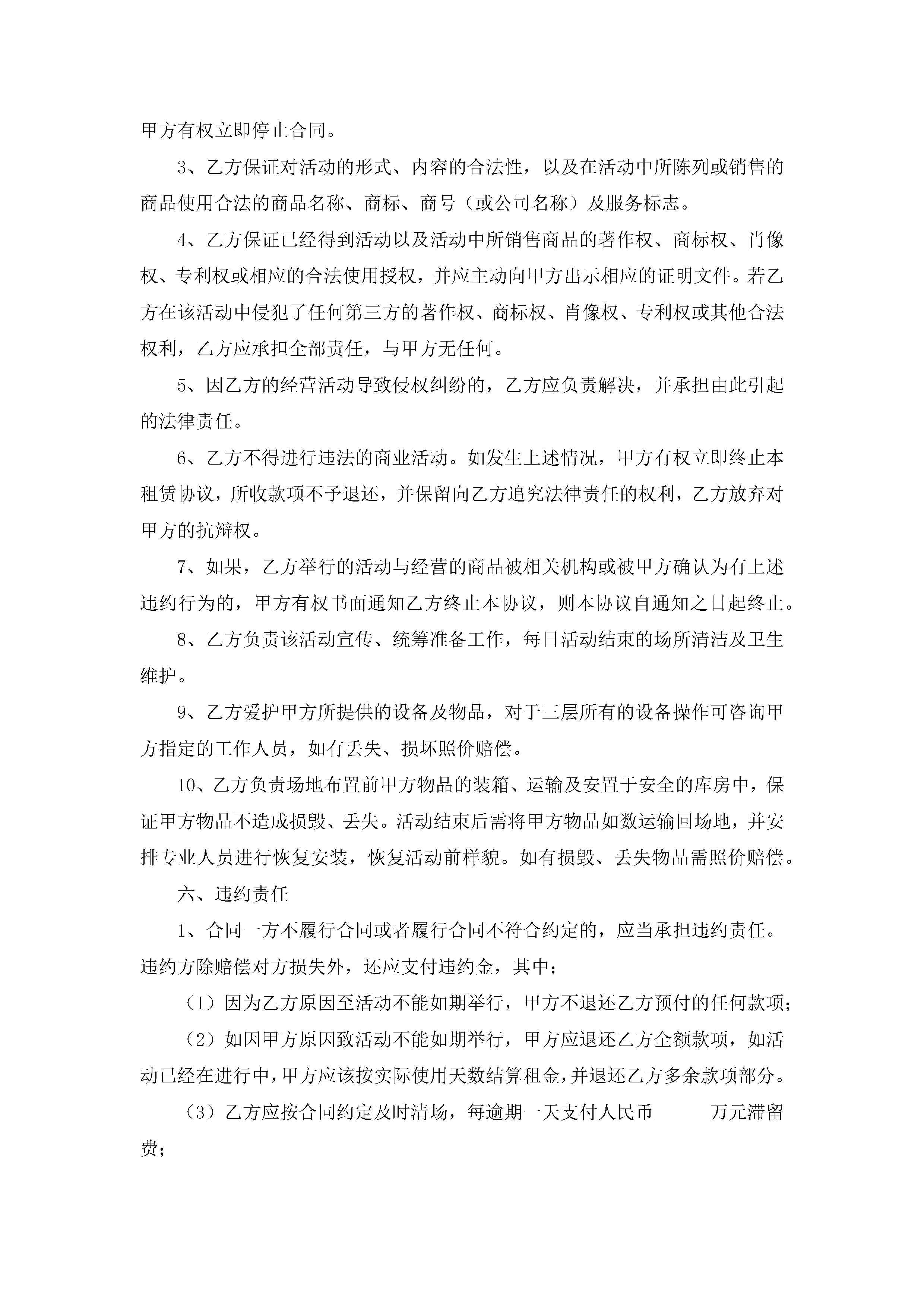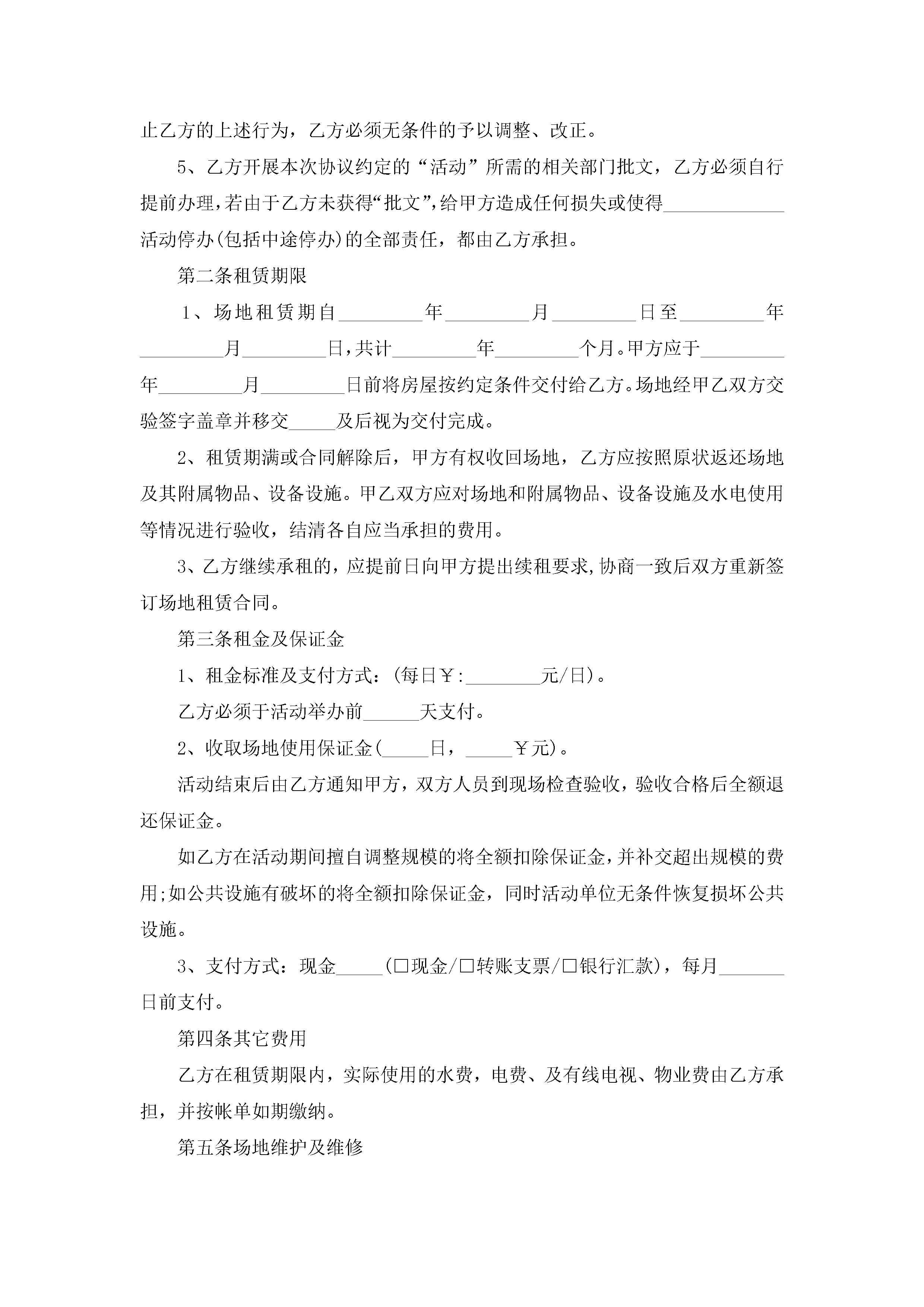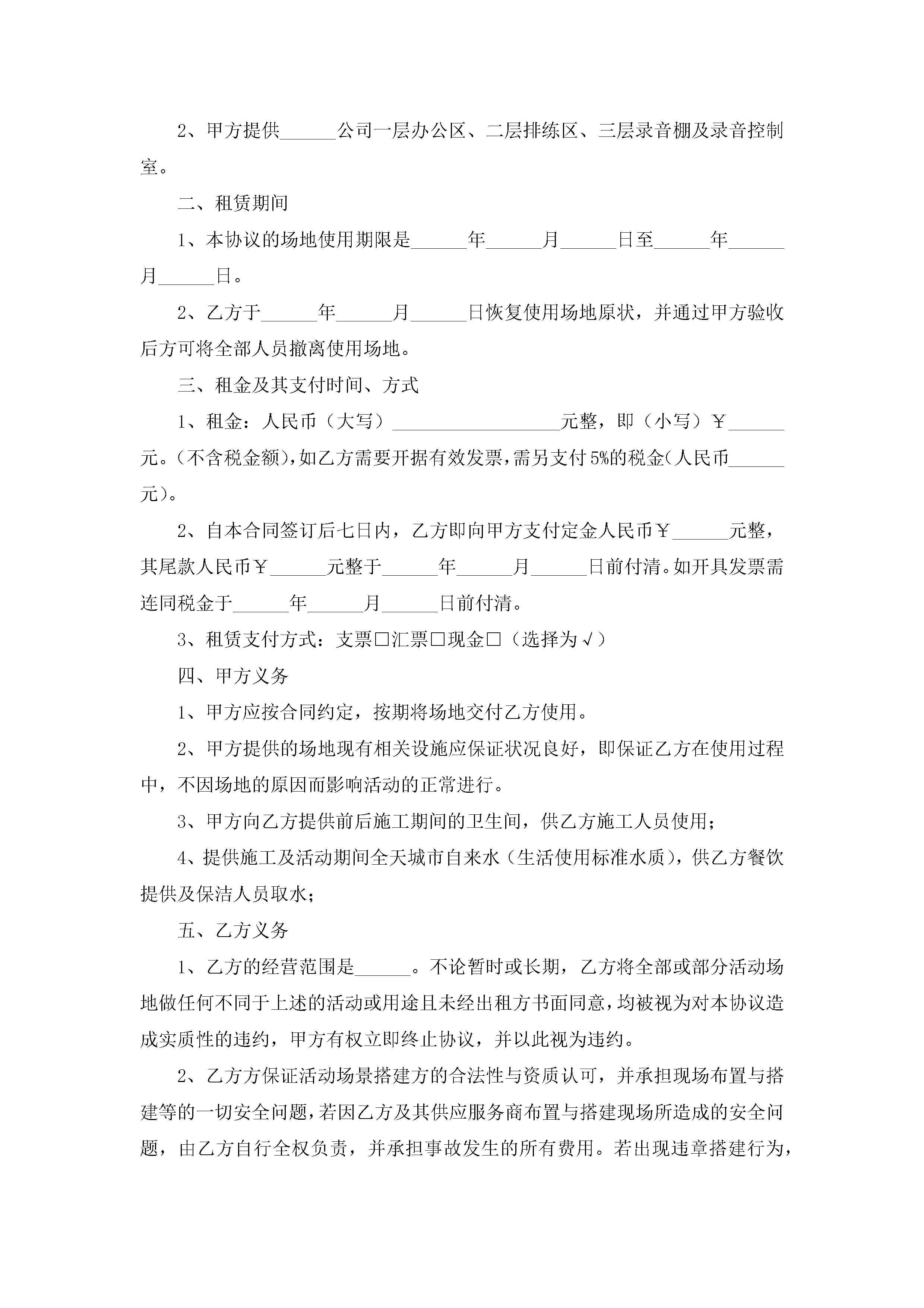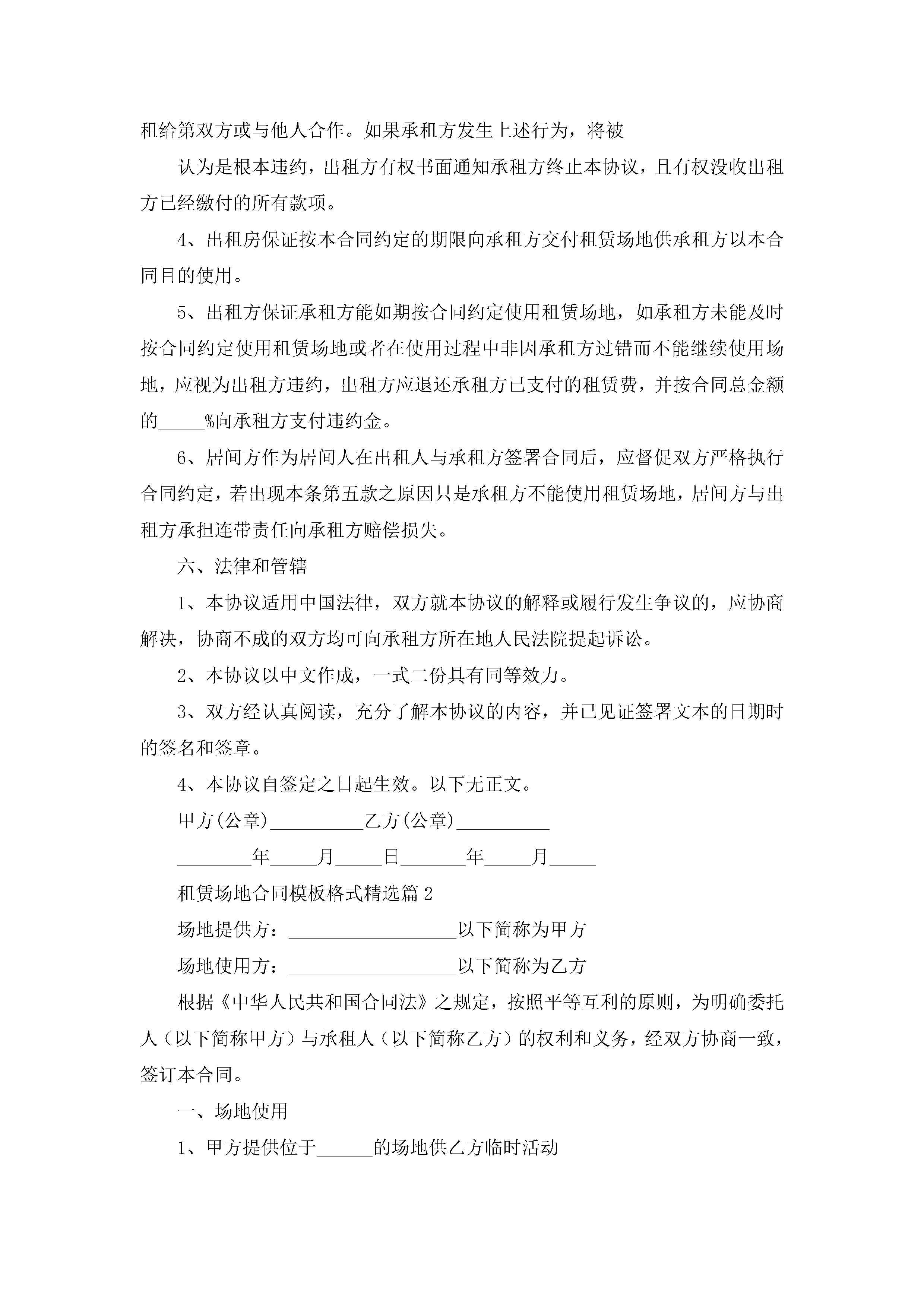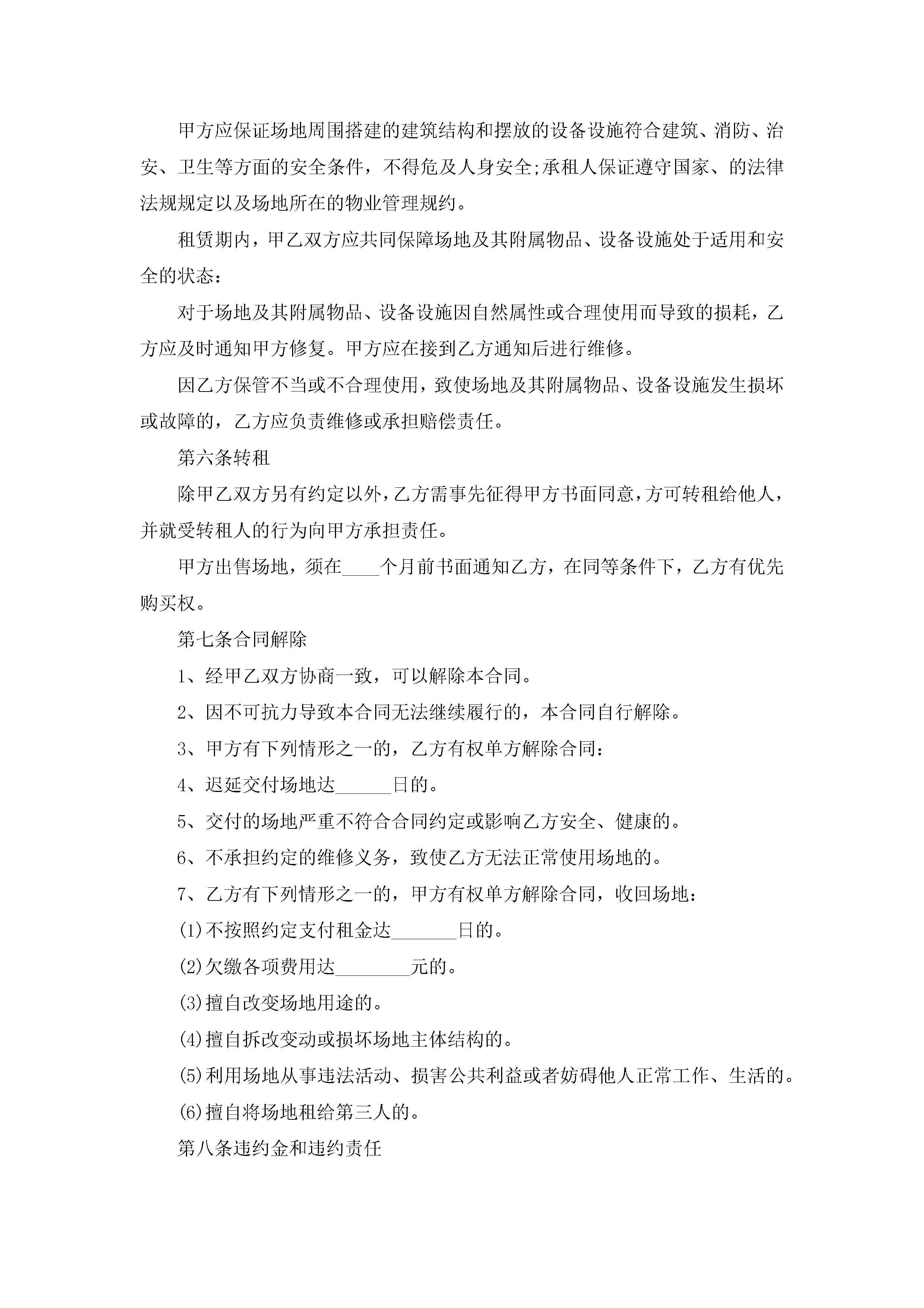 租赁场地合同模板格式【精选9篇】jugei3月23日 01:43发布关注193 租赁场地合同模板格式【精选9篇】此内容为付费资源,请付费后查看¥10.9 单篇文档限时特惠¥15个人会员开通企业会员开通立即下载无需登陆!可直接快捷下载单个模板付费资源© 版权声明THE ENDWord模板# 实用文档# 实用模板# 合同模板# 租赁合同# 租赁场地合同模板格式 如有问题,可点击最底部“联系我们”联系客服 分享QQ空间微博QQ好友海报分享复制链接收藏