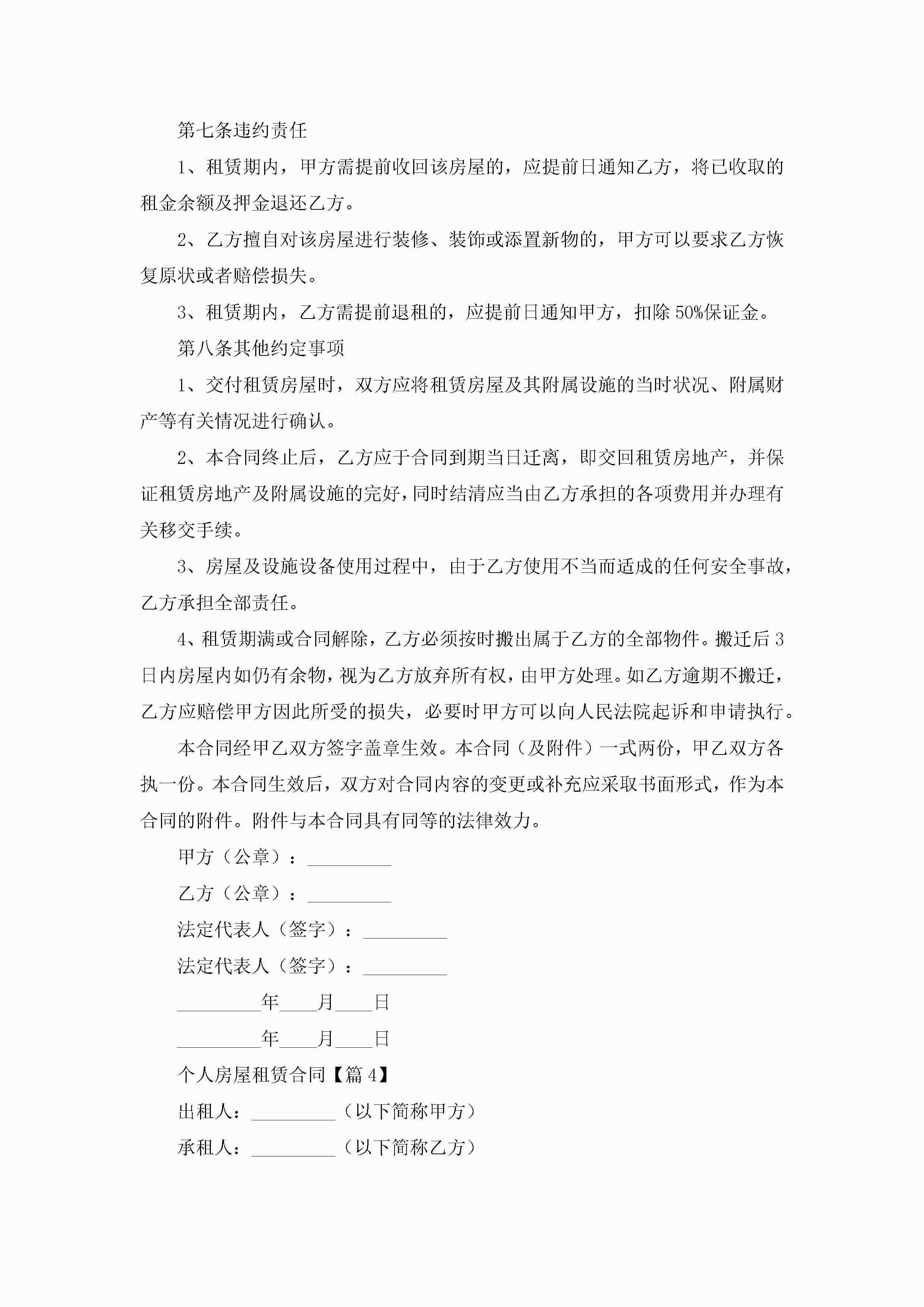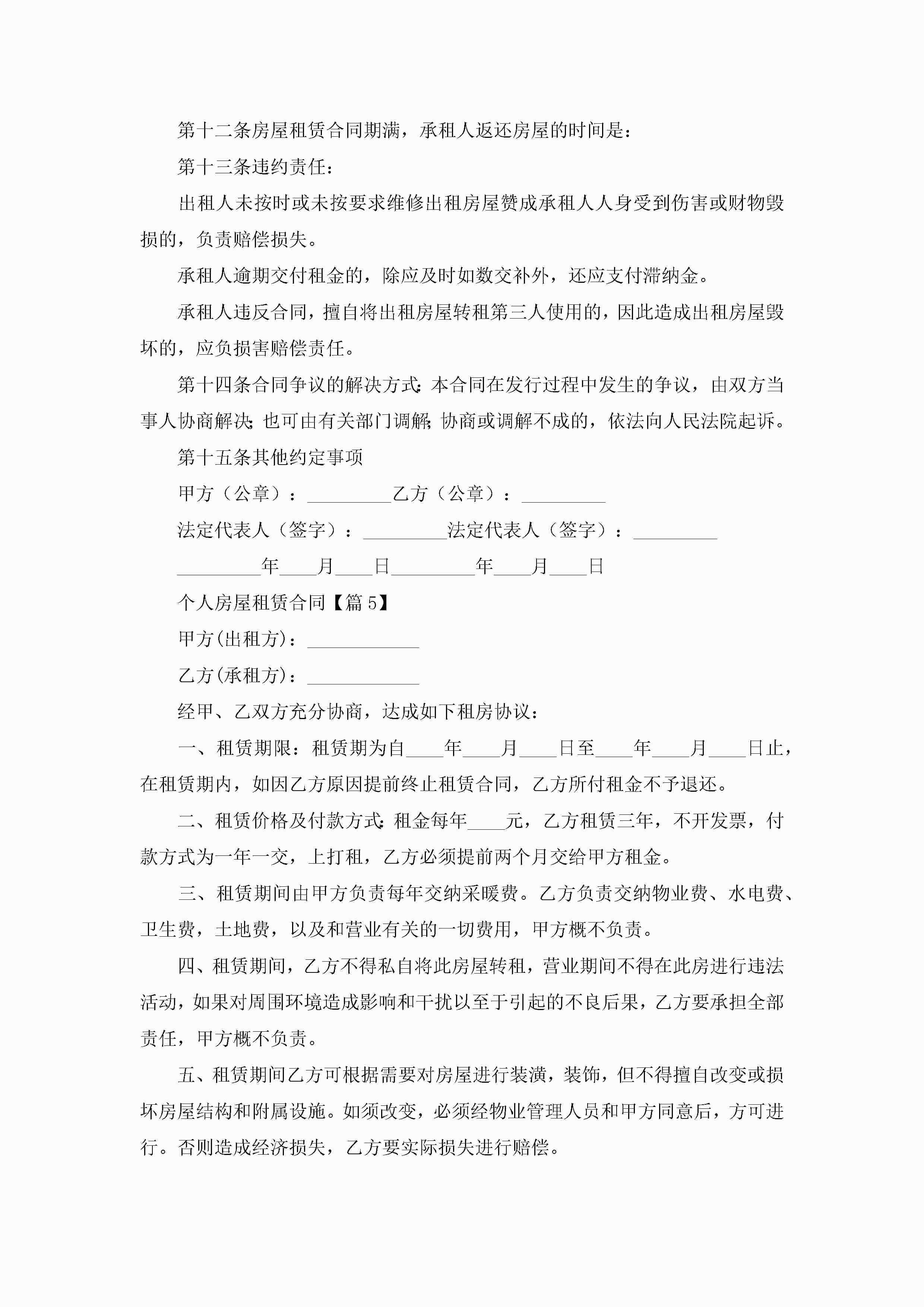 个人房屋租赁合同5篇jugei3月23日 01:43发布关注201 个人房屋租赁合同5篇此内容为付费资源,请付费后查看¥10.9 单篇文档限时特惠¥15个人会员开通企业会员开通立即下载无需登陆!可直接快捷下载单个模板付费资源© 版权声明THE ENDWord模板# 实用文档# 合同模板# 租赁合同# 个人房屋租赁合同 如有问题,可点击最底部“联系我们”联系客服 分享QQ空间微博QQ好友海报分享复制链接收藏
